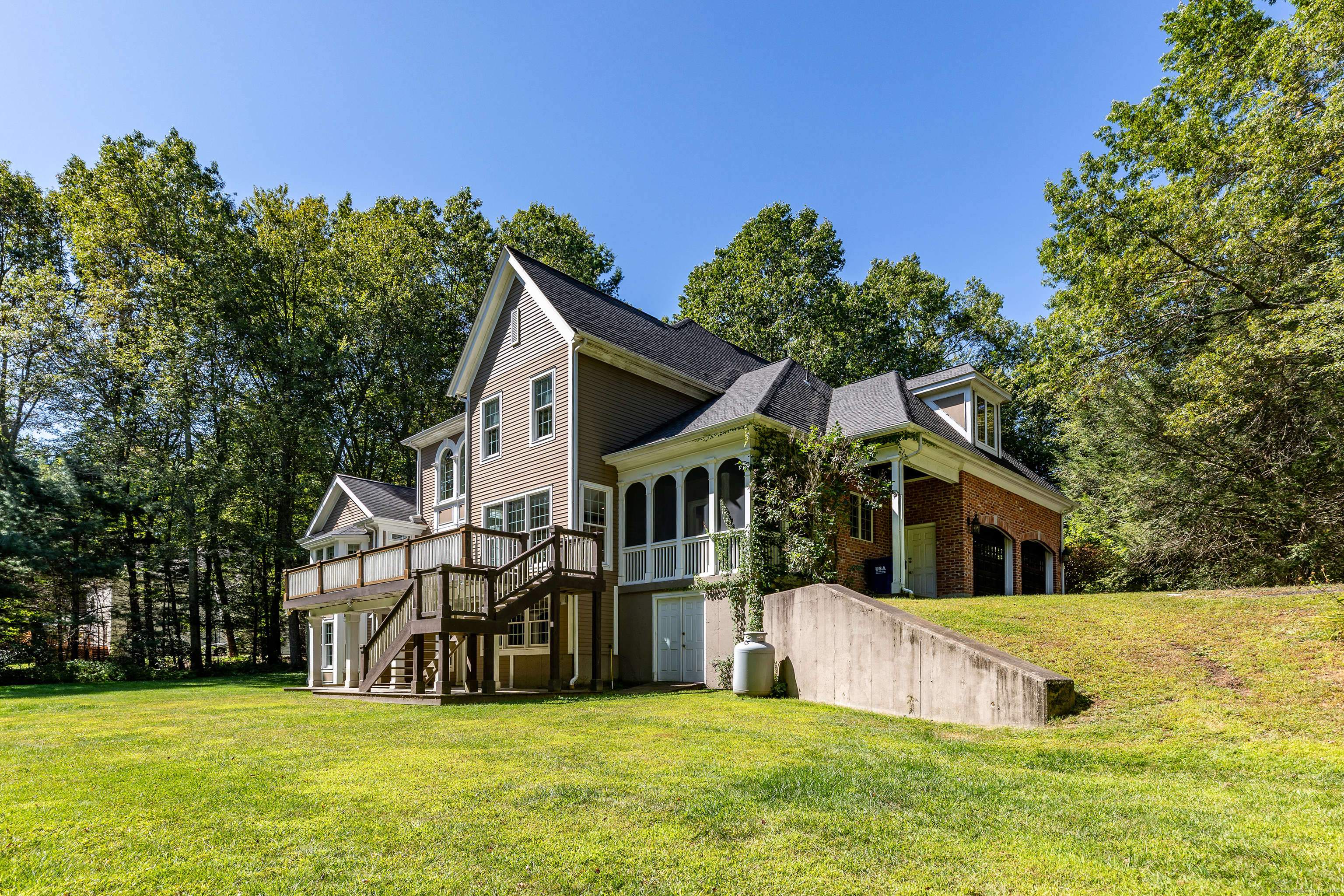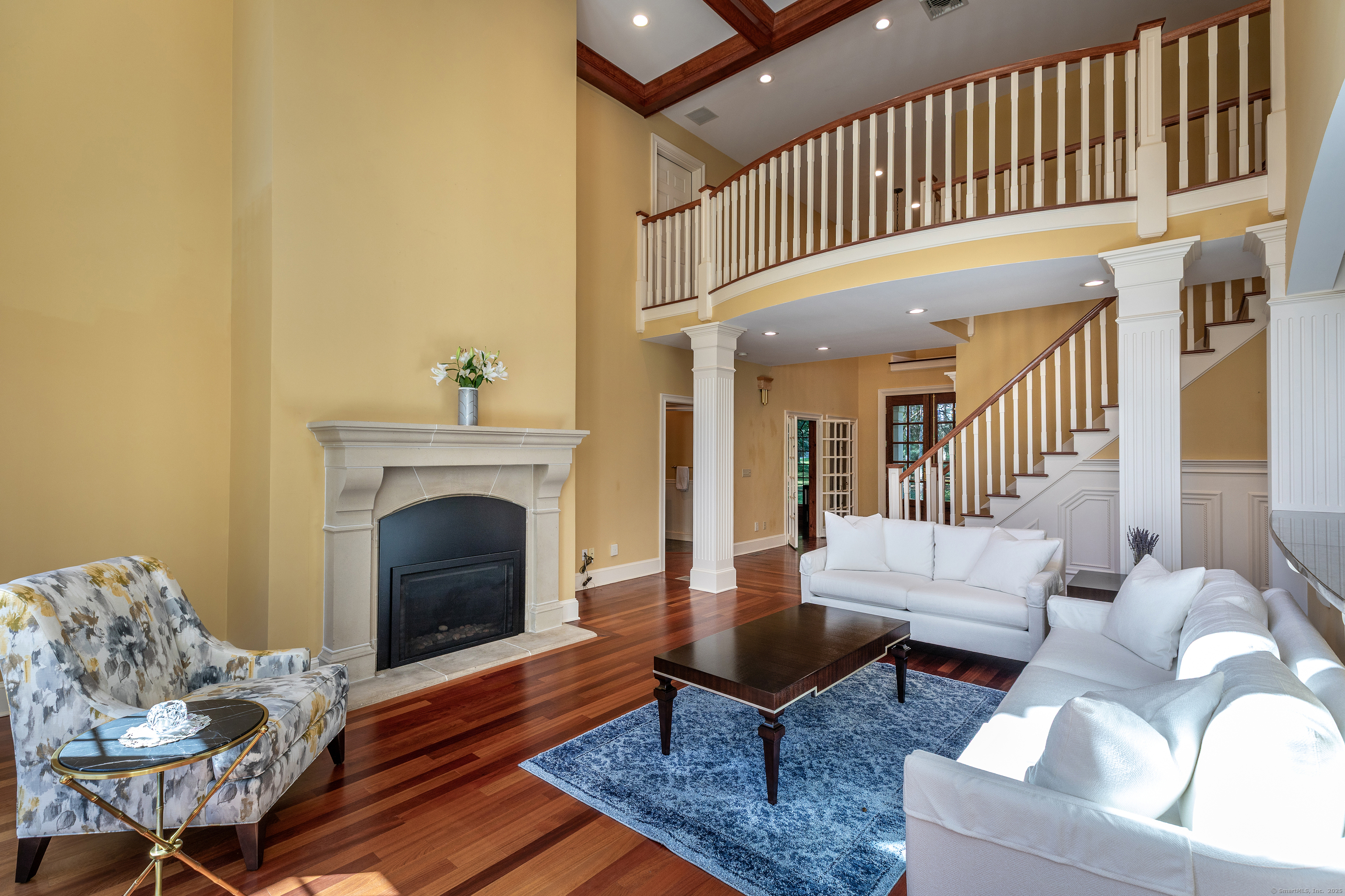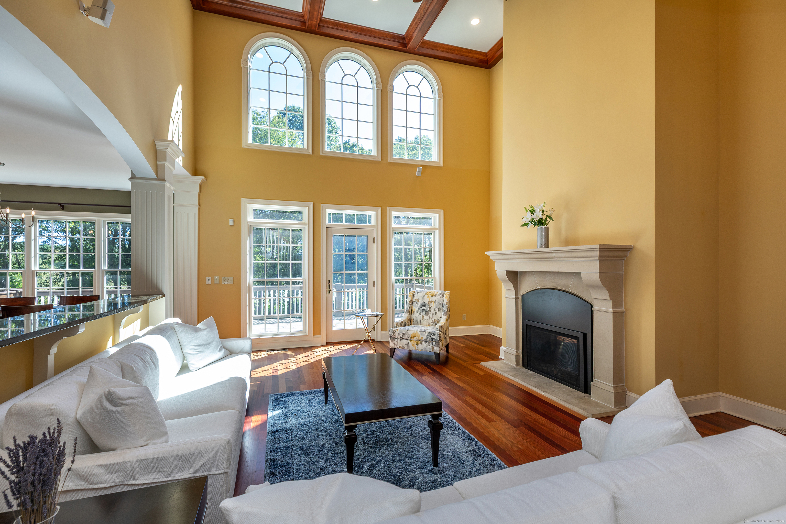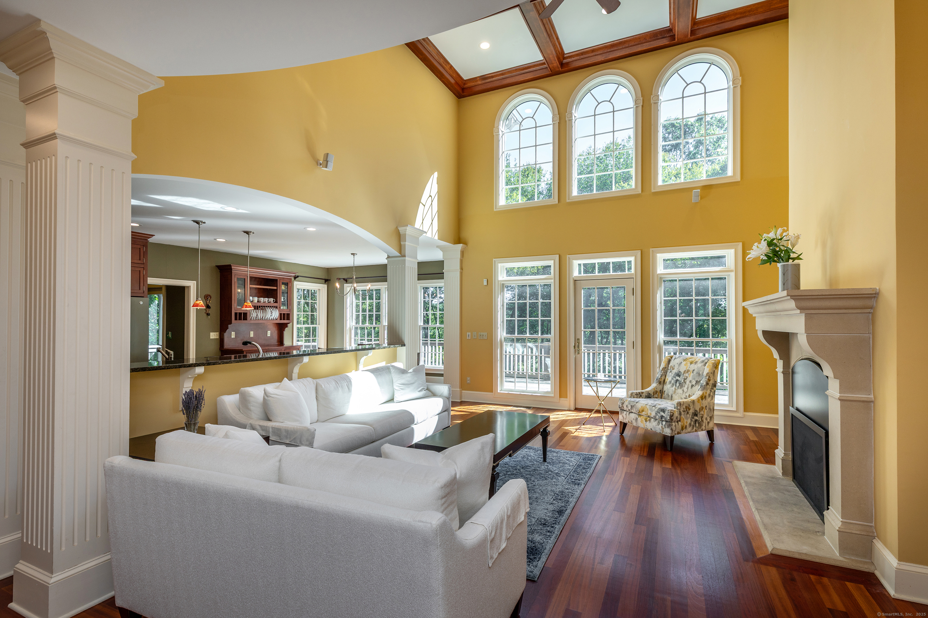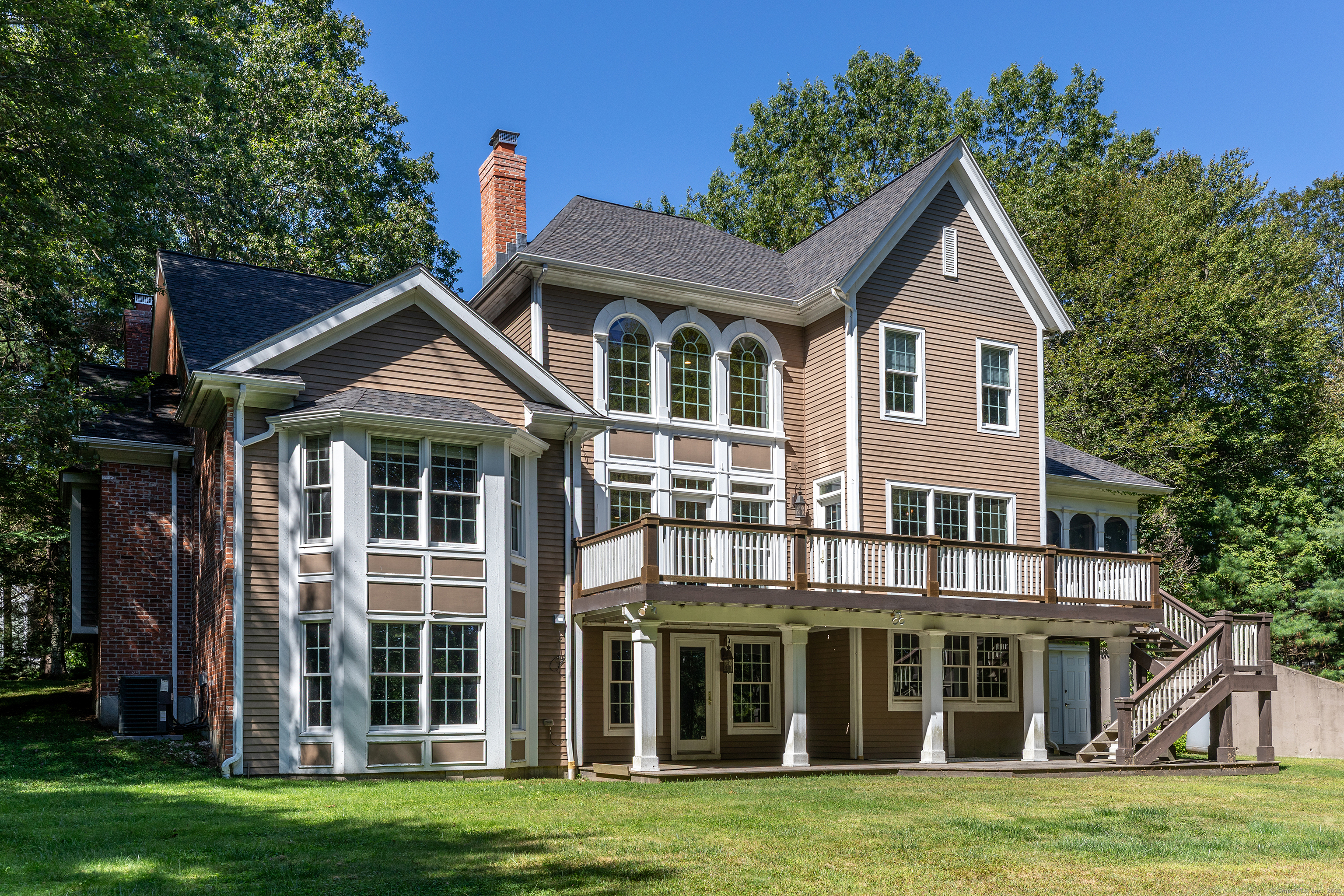 Tucked away in a beautifully maintained cul-de-sac, this stately brick French Provincial home enjoys a private, direct waterfront setting on Bull Pond, bordered by 70 acres of protected land trust. Soaring Palladian windows frame sweeping water views from nearly every room including the great room, first-floor primary suite, guest suite, kitchen, interior bridge, and expansive deck. Step inside to find an open, inviting layout enhanced by Brazilian hardwood floors. The great room impresses with 20-foot coffered ceilings, fluted columns, and a grand fireplace, while the formal dining room and cherry-paneled study with its own fireplace offer refined spaces for entertaining. The chef's kitchen features granite counters, cherry cabinetry, a center island, stainless steel appliances, and a convenient pantry/laundry room. The first-floor primary suite offers a luxurious bath and walk-in closet, while the second floor provides a guest suite with full bath, two additional bedrooms with a Jack-and-Jill bath, and a dramatic bridge overlooking the great room. The lower level is ready to be finished, already showcasing a fireplace, oversized windows with water views, and direct walk-out access to the patio. Perfectly located just minutes to Route 8 for an easy commute and close to Fairview Farms Golf Course, this home combines elegance, comfort, and an unmatched natural setting.
