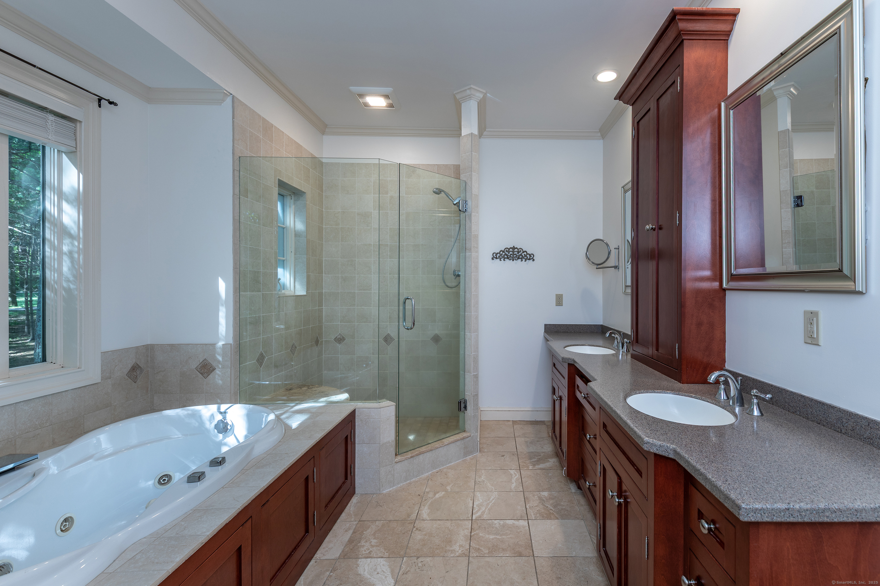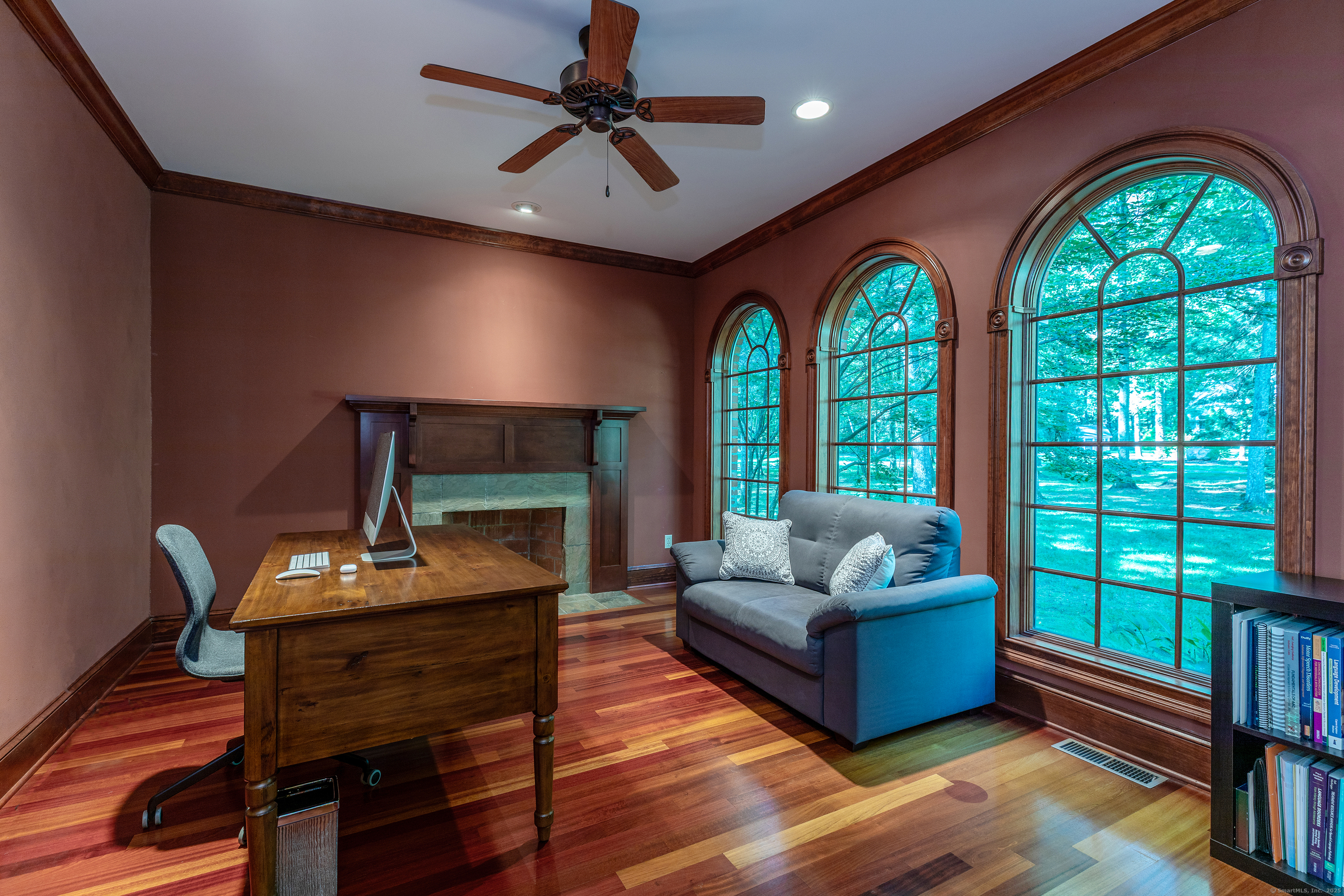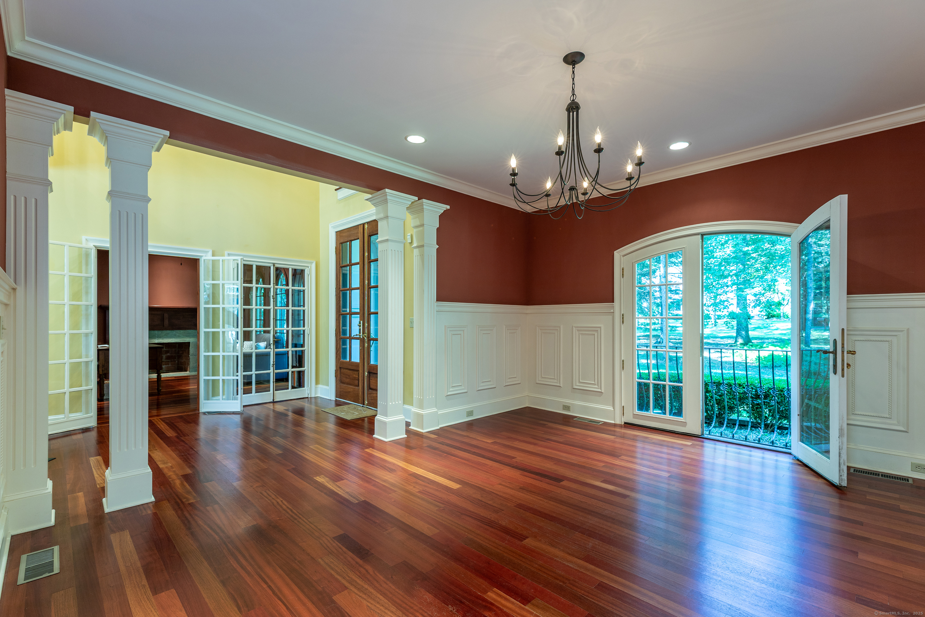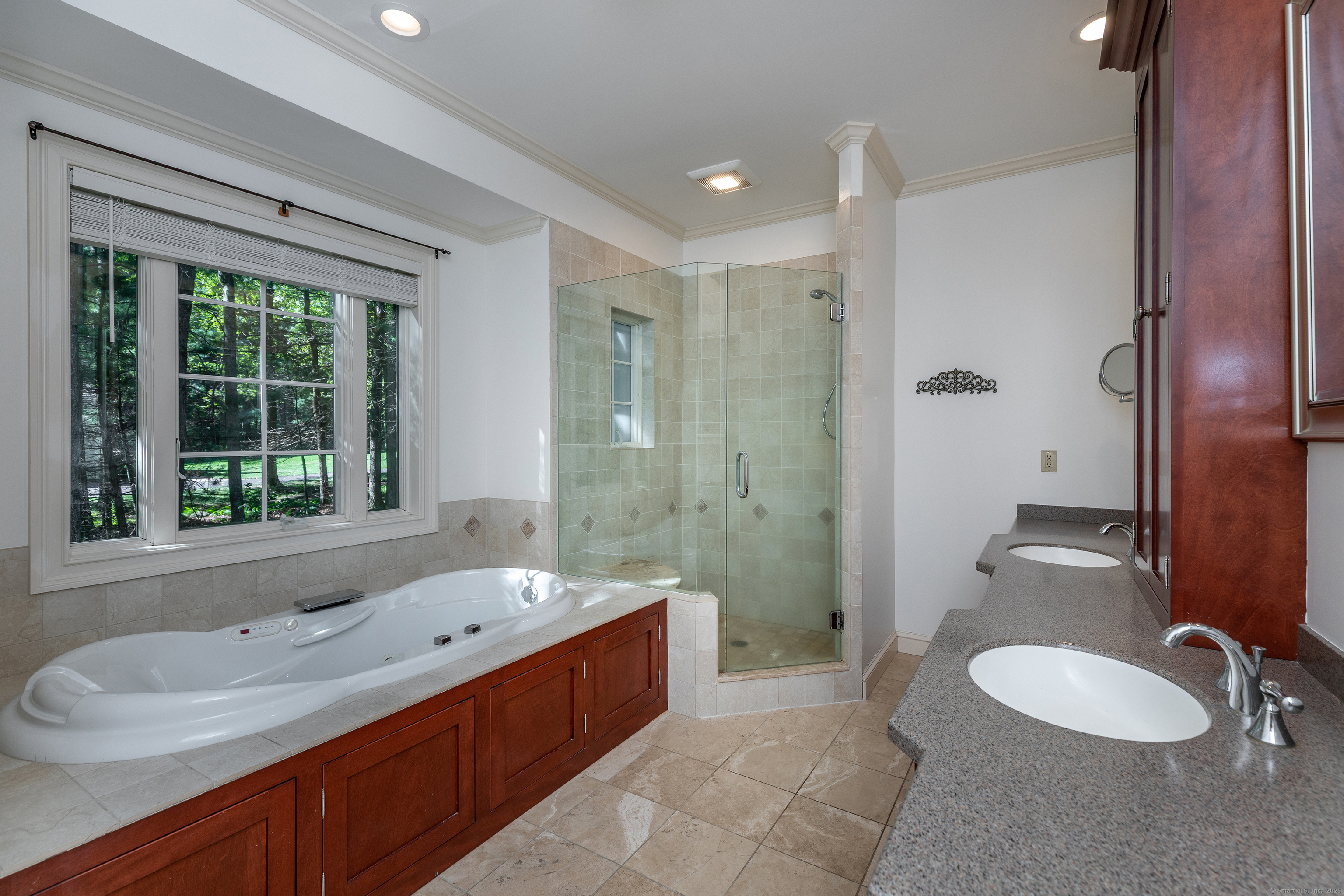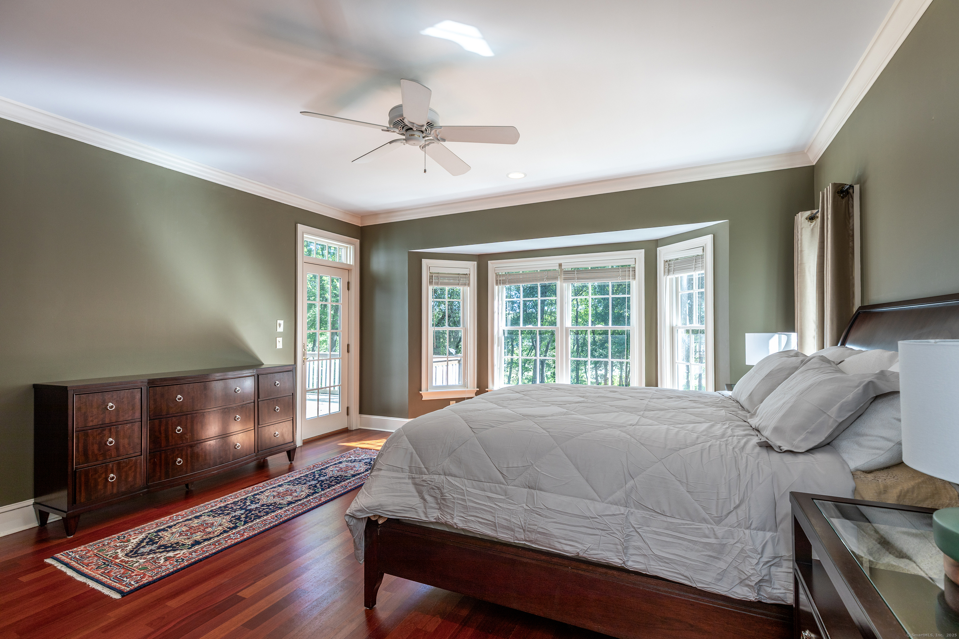 Tucked away in a beautifully maintained cul-de-sac, this stately brick French Provincial home enjoys a private, direct waterfront setting on Bull Pond, bordered by 70 acres of protected land trust. Soaring Palladian windows frame sweeping water views from nearly every room including the great room, first-floor primary suite, guest suite, kitchen, interior bridge, and expansive deck. Step inside to find an open, inviting layout enhanced by Brazilian hardwood floors. The great room impresses with 20-foot coffered ceilings, fluted columns, and a grand fireplace, while the formal dining room and cherry-paneled study with its own fireplace offer refined spaces for entertaining. The chef's kitchen features granite counters, cherry cabinetry, a center island, stainless steel appliances, and a convenient pantry/laundry room. The first-floor primary suite offers a luxurious bath and walk-in closet, while the second floor provides a guest suite with full bath, two additional bedrooms with a Jack-and-Jill bath, and a dramatic bridge overlooking the great room. The lower level is ready to be finished, already showcasing a fireplace, oversized windows with water views, and direct walk-out access to the patio. Perfectly located just minutes to Route 8 for an easy commute and close to Fairview Farms Golf Course, this home combines elegance, comfort, and an unmatched natural setting.