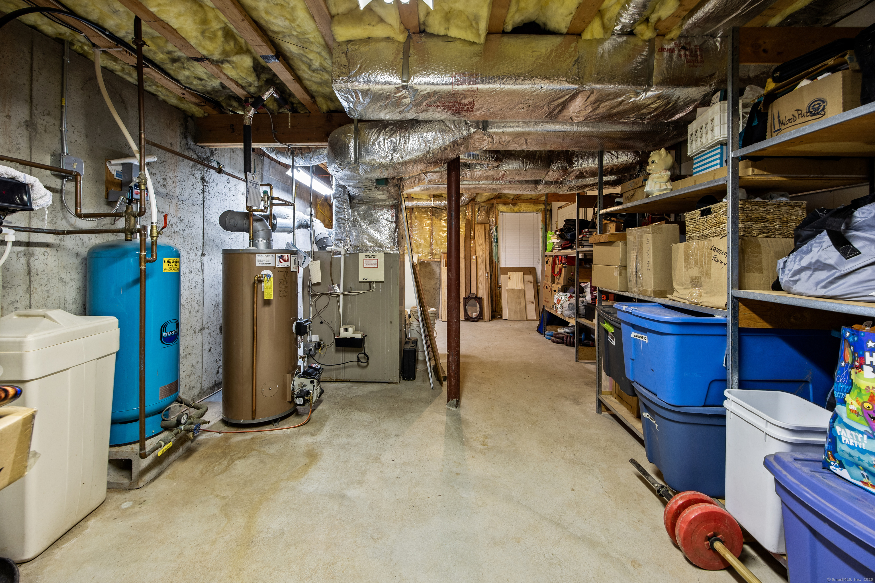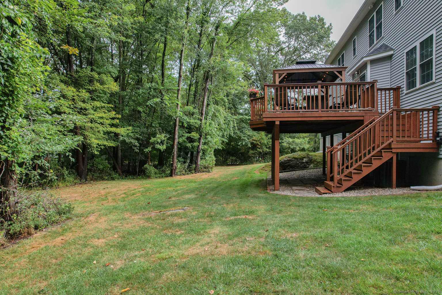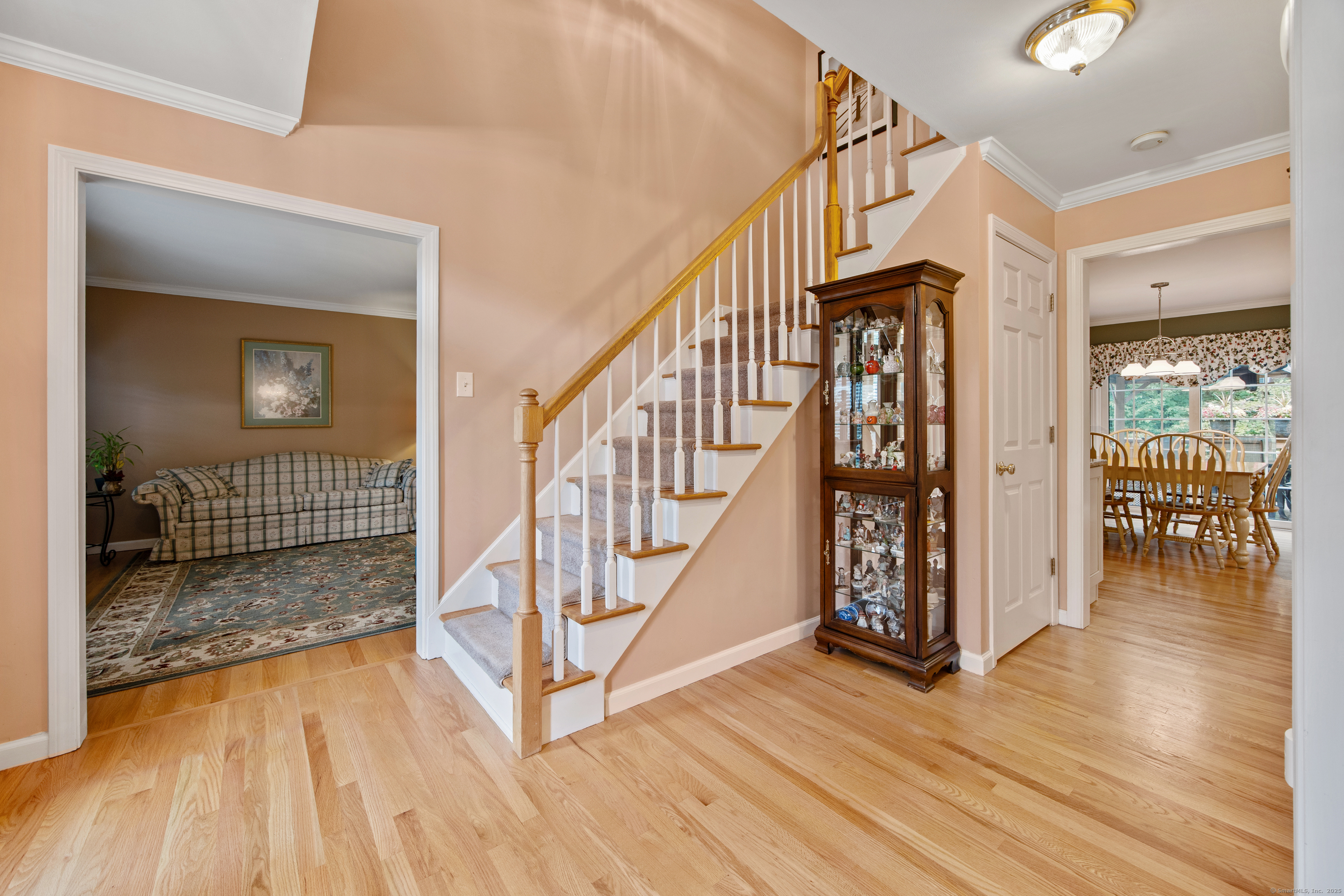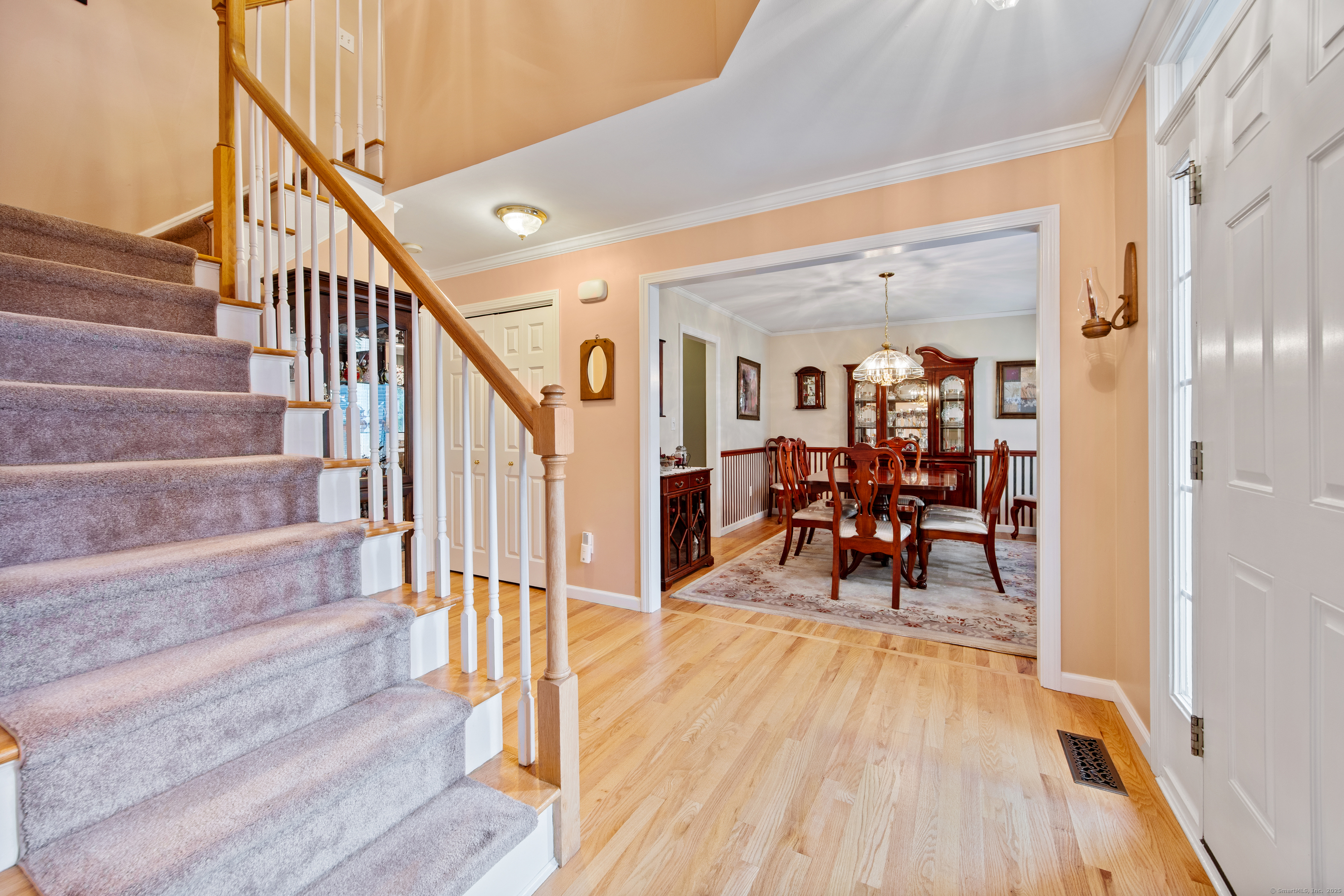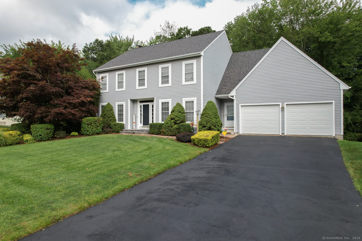 Welcome to this beautifully maintained Colonial, ideally situated on a quiet cul-de-sac within a six-home subdivision featuring underground utilities and sidewalks. Step inside through the foyer and into the bright kitchen, complete with white cabinetry, granite countertops, and stainless steel appliances, which opens seamlessly to the living room with a cozy wood-burning fireplace. Just off the kitchen, you'll find a mudroom, half bath, and a convenient laundry room. A formal dining room and additional living room complete the main level, offering plenty of space for both everyday living and entertaining. Upstairs, you'll find three generously sized bedrooms, a full bath, plus a spacious primary suite with its own full bathroom. The walkout basement adds an additional 610 s/f of heated and cooled finished space with a workshop, large storage area, and recreation area that's pre-plumbed for an additional bathroom. Outdoor living is a highlight with a large deck overlooking the private backyard- supported and designed with space for a hot tub. Updates include a new roof, newer central air conditioning system, newer oil tank, newer garage doors, gutters with leaf guards, and irrigation system ensuring peace of mind for years to come. Wallingford's electric grid for the best saving possible on energy as a resident! This move-in ready Colonial combines charm, comfort, and thoughtful updates in an attractive neighborhood setting. Don't miss this exceptional opportunity!