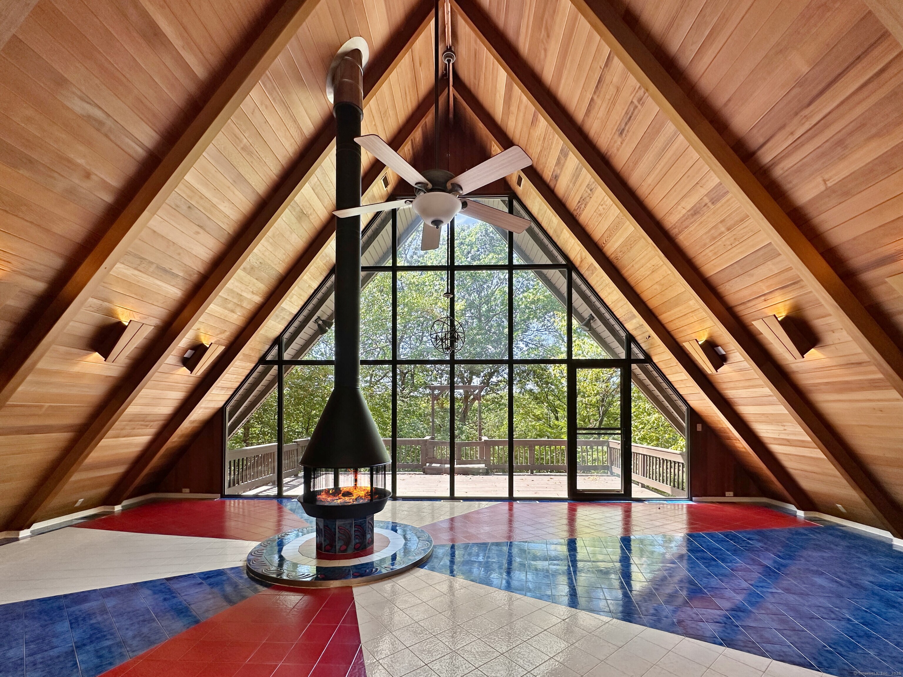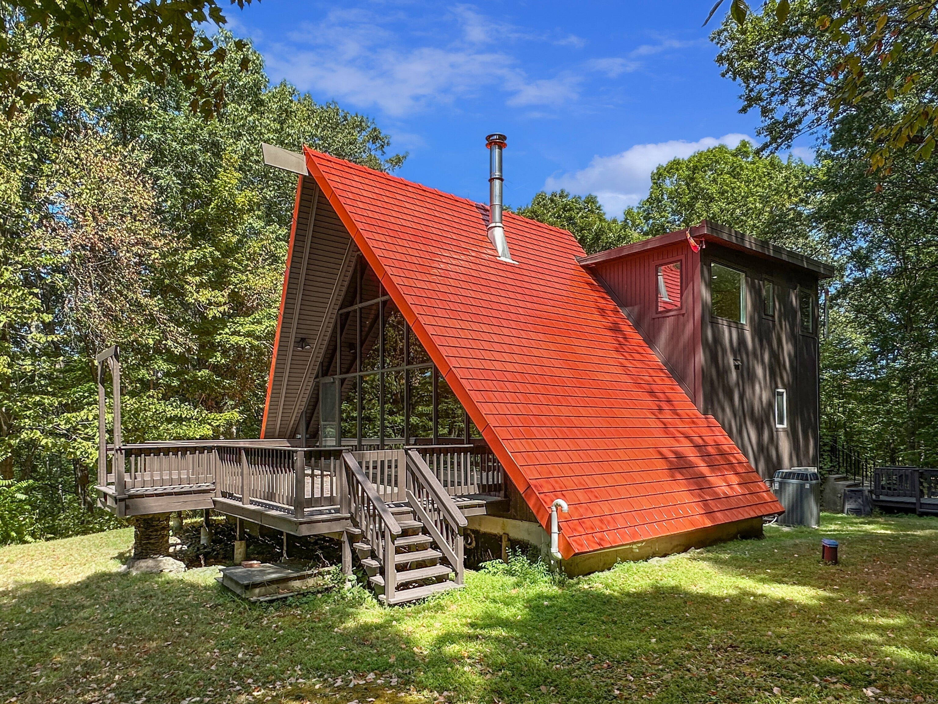 Take a 3D Tour or Enjoy a Video Walkthrough 24/7! This striking double A-Frame, with iconic Howard Johnson's orange steel roof shingles, is a one-of-a-kind architectural showplace and retreat set on 1.51 private acres surrounded by the 32-acre Highland Pond Preserve. The pond dam has been removed, returning it to its natural state of meadow and stream. Over $300,000 in thoughtful renovations have been completed by the Seller, including creating a stunning 2nd-floor Primary Suite 2 with spa bath, heated tile floor, towel warmer, luxury shower area with rain shower head & body sprays, and oversized 2-person tub. Marvin Integrity windows, custom built-ins, spray foam insulation, and a Mitsubishi ductless system. The 3,853 sq ft total living area layout offers 3 BRs (includes a 1st floor Primary Suite), 2 Offices (one a 4th BR), 4 Full Baths, and a 4-Car tandem Garage with plumbing for a 5th bath. Inside, soaring ceilings, dramatic tile floors, walls of glass, and a central wood-burning fireplace bring the outdoors in. Upgrades include a deepened well, a new Trane HVAC A/C condenser to maximize comfort and energy efficiency, a 22kW whole-house generator, siding/trim repairs, LED lighting, spray-foamed basement, and more. Steps to the Blue Trail, this home is perfect for Buyers seeking privacy, style, and modern upgrades near Middletown's amenities and 3 minutes from I-91. Schedule your private showing TODAY!