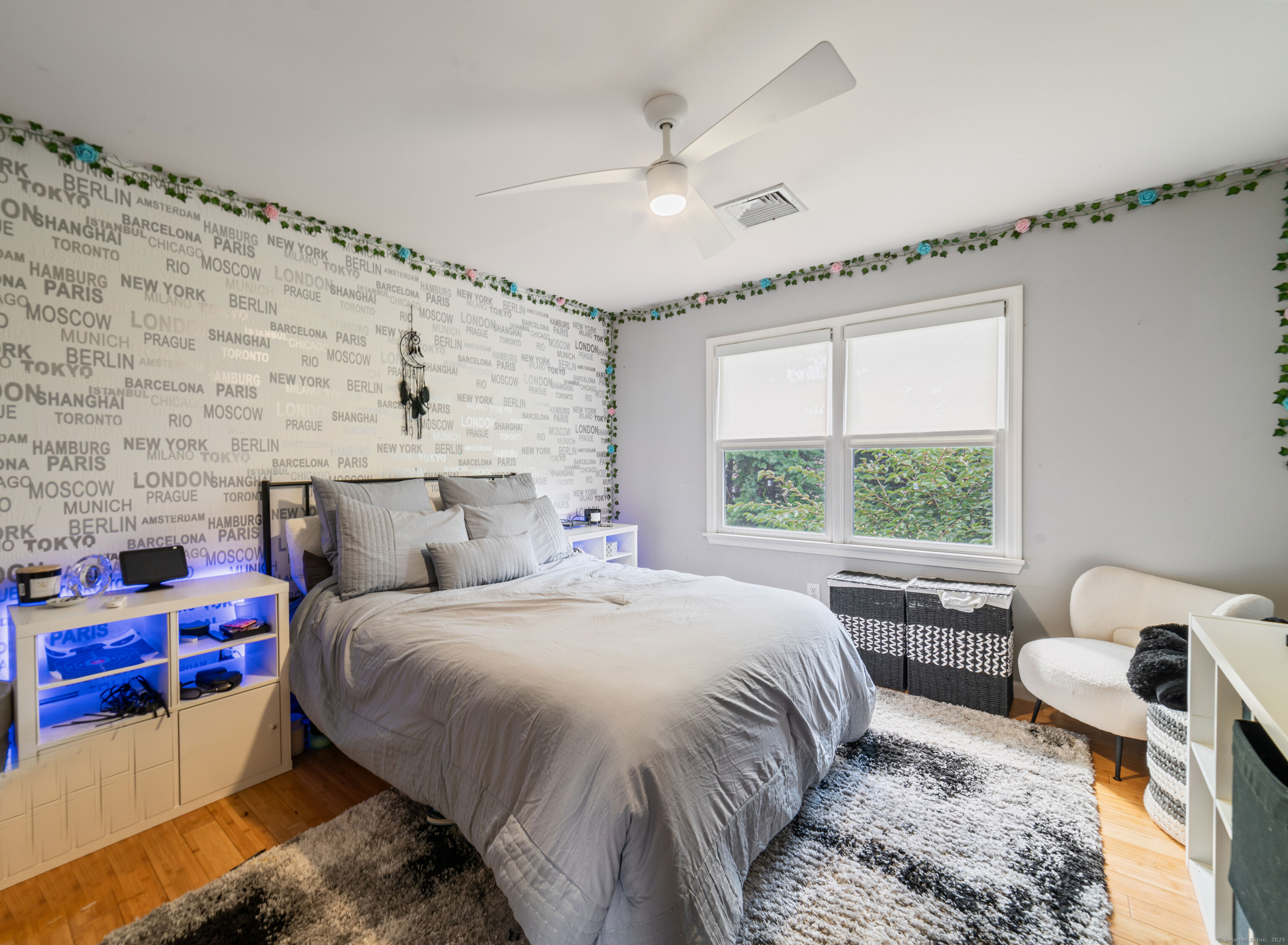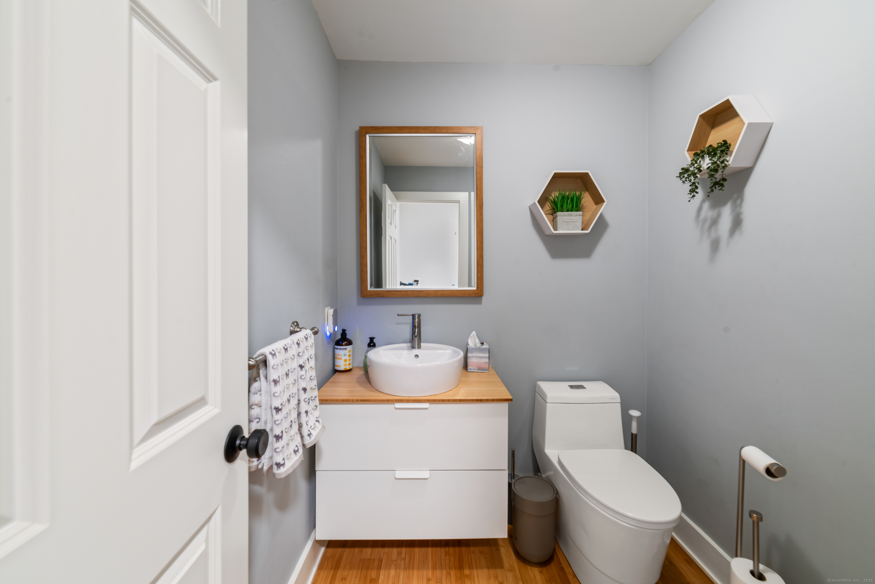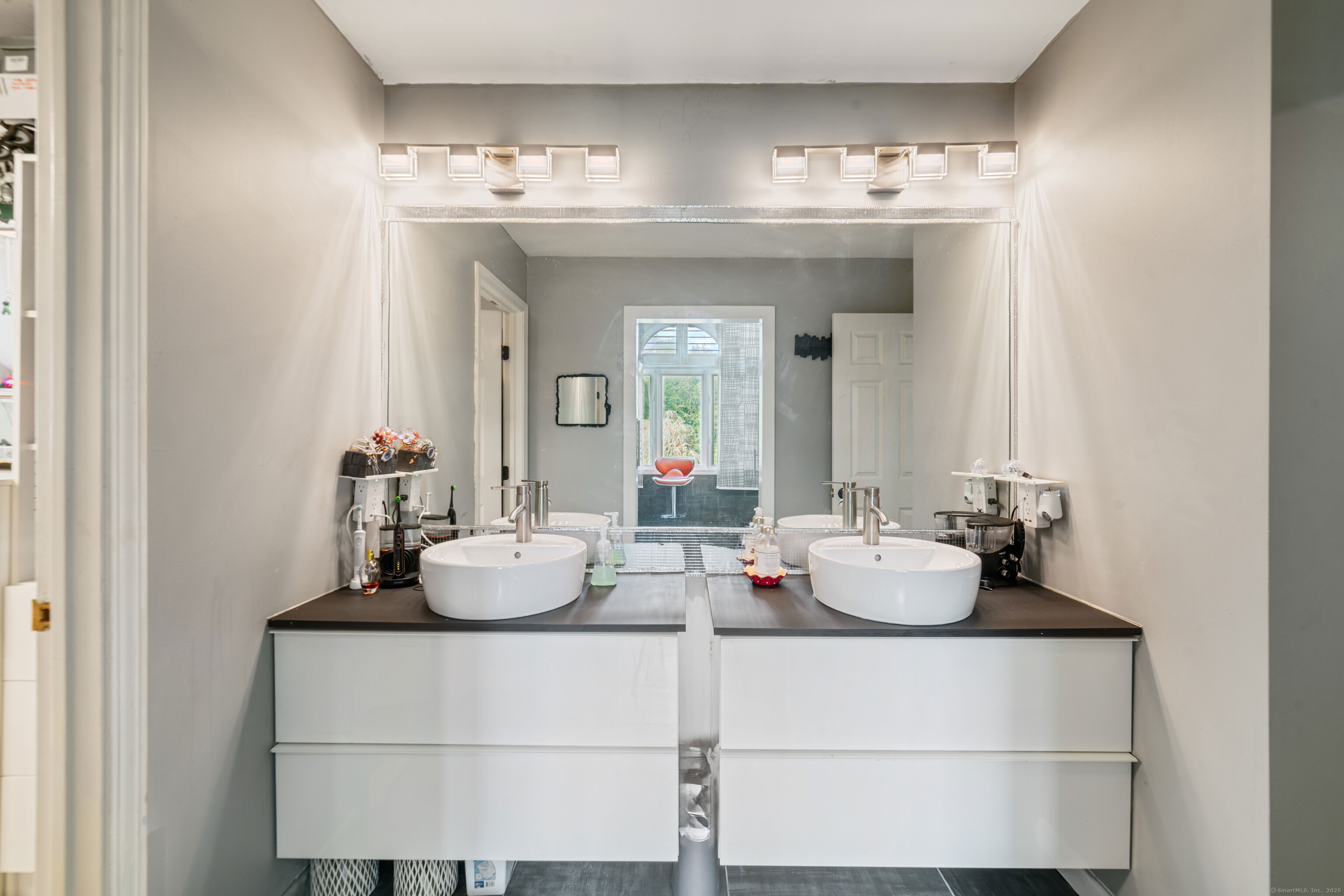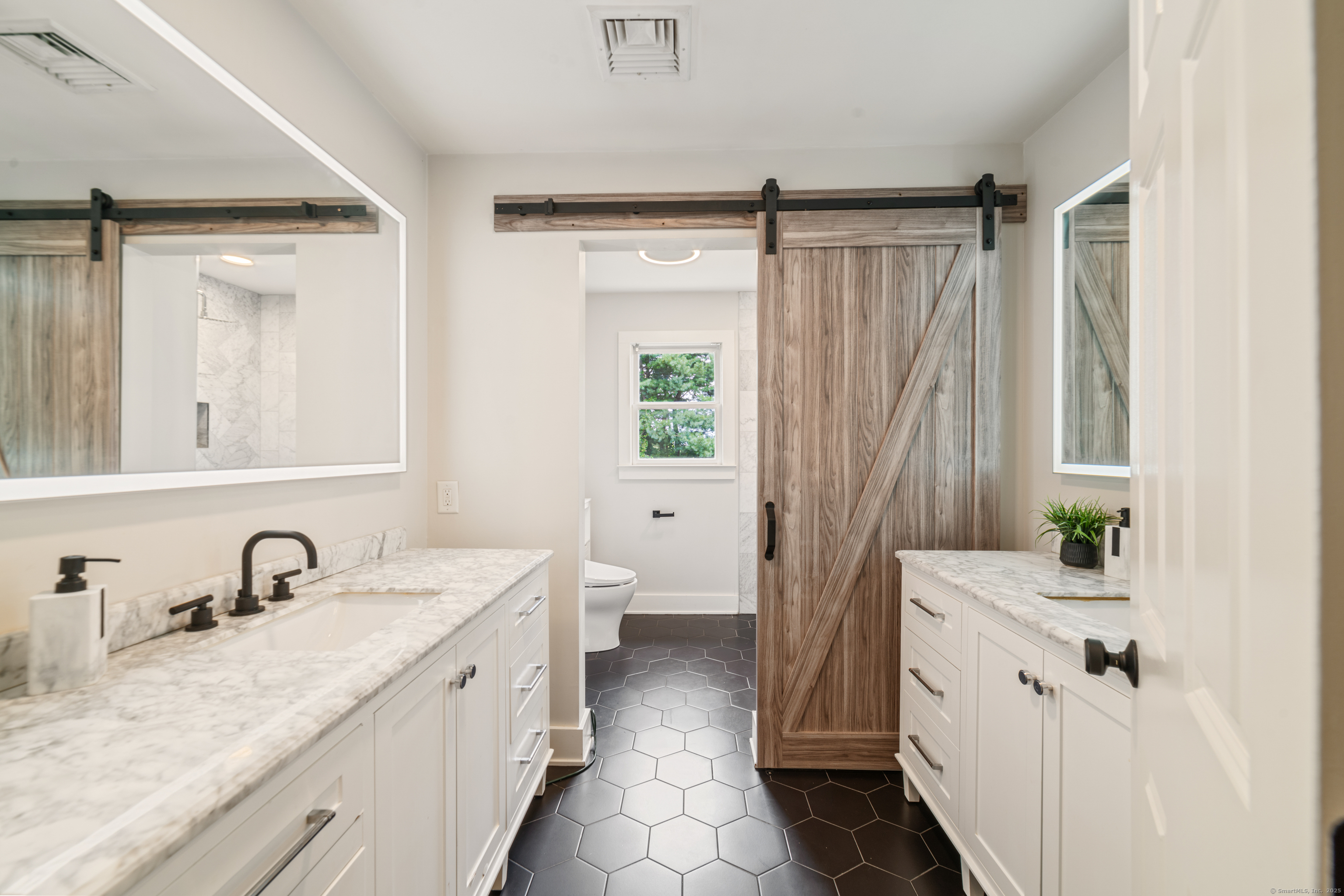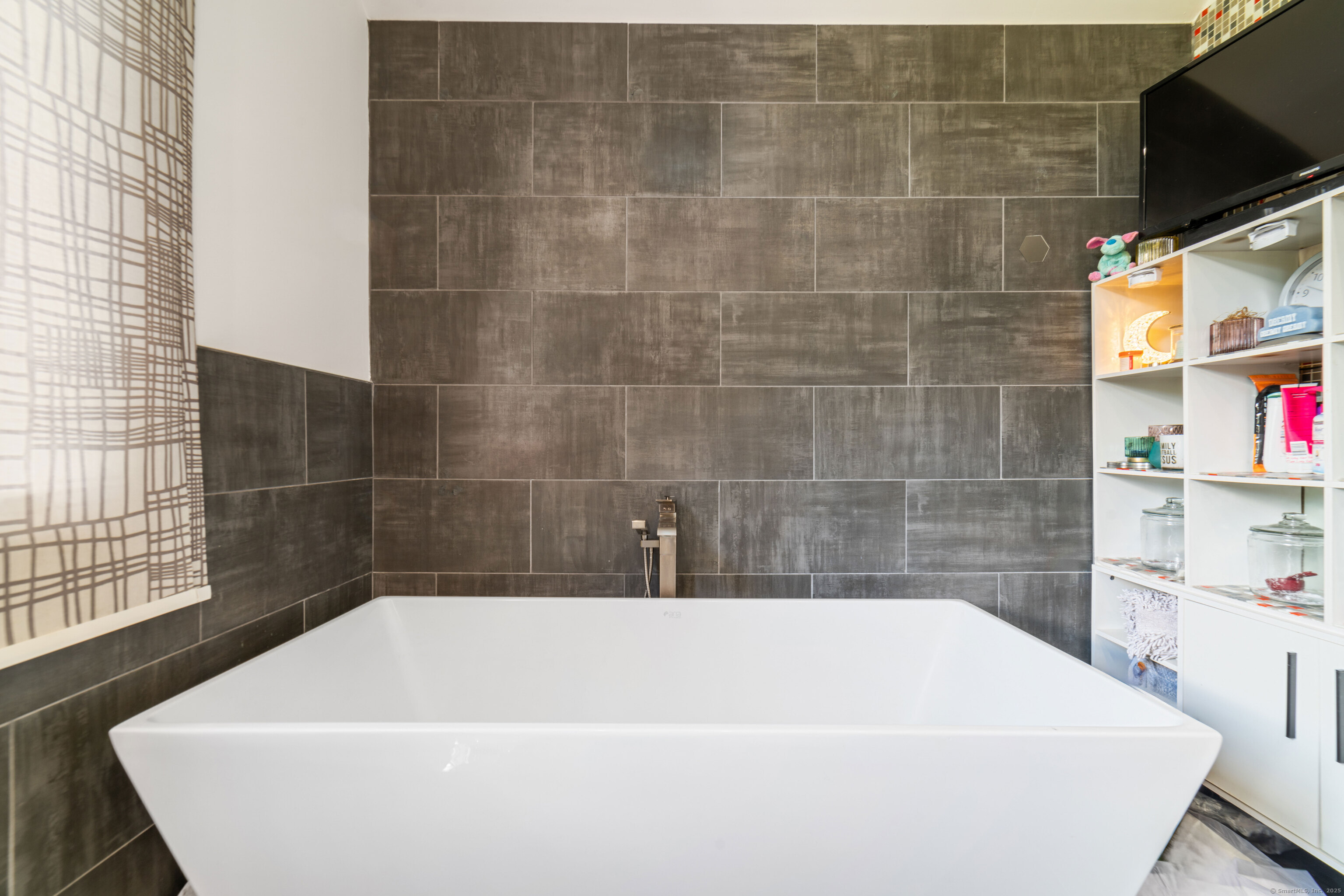 Located in a rural area within Newtown, Connecticut, this colonial home sits on a level, cleared corner lot. Constructed in 1996, the four-bedroom, 2.5-bath residence has been updated with modern aesthetics. The first floor features an open floor plan, with a kitchen equipped with an island, a dining area, a large picture window above the sink, and stainless Kitchen Aide appliances, including a wall oven and microwave. Quartz countertops and contemporary cabinetry are featured in the kitchen. The kitchen flows into the family room. A dining room, and study, are also located on the first floor.The kitchen opens onto a deck with an awning. Bamboo engineered flooring is installed throughout the home first and second floor. A cable-railed stairway with a chandelier lift leads to the second floor. The primary bedroom has ample natural light and includes a walk-in closet, a walk-in shower, and a soaking tub. Three additional bedrooms and a full bath with a walk-in shower are also located on the second floor. Additional features of the property include a dog fence, a generator, a water filtration system, and a propane-fueled continuous water heater. The home also offers a partially finished basement, an electric dog fence and a electric charger for your car in the garage.