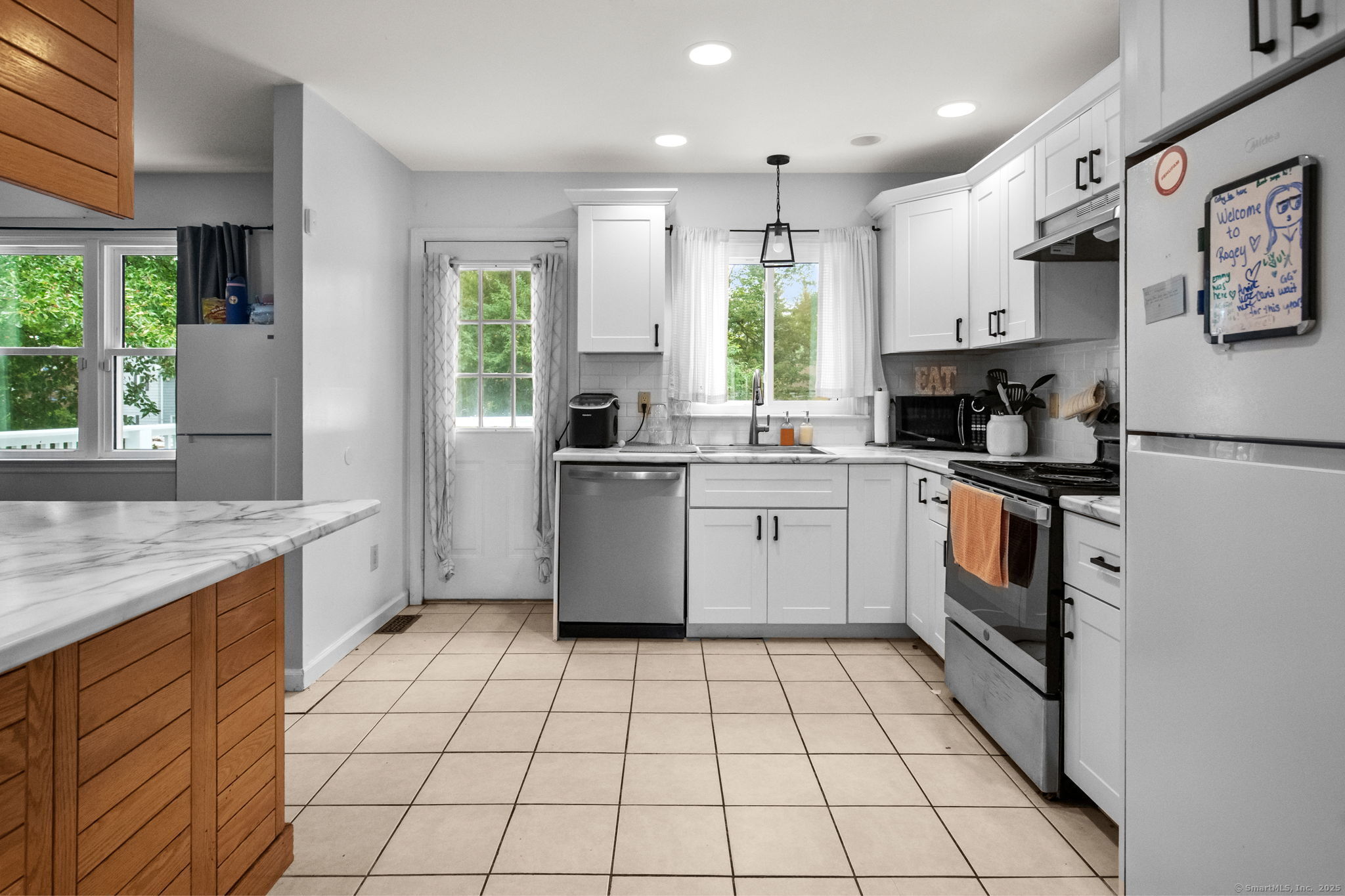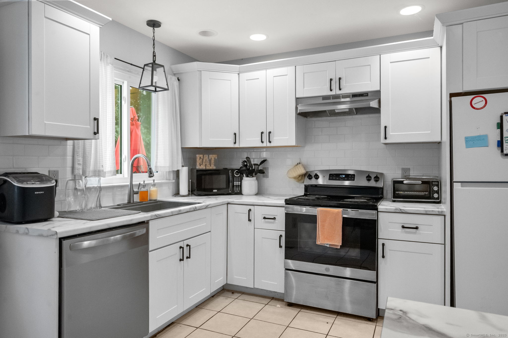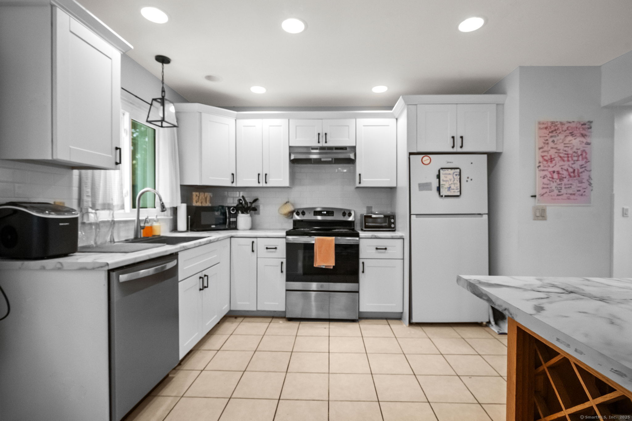 Welcome to this beautiful family home nestled on a quiet cul-de-sac in Bridgeport's desirable North End neighborhood, known for its peaceful atmosphere and friendly community. This spacious residence combines modern upgrades with timeless comfort, offering five bedrooms and three bathrooms across a thoughtfully designed open-concept layout. Step inside to a seamless flow between the living room, dining area, and remodeled kitchen-perfect for entertaining and everyday living. The kitchen boasts modern appliances, sleek countertops, new cabinets (2022), and a breakfast bar for quick meals. Throughout the main living areas, refinished hardwood floors (2022) add elegance, while tiled bathrooms provide a clean, contemporary touch. The lower level features a convenient laundry area with a new washer (2022) and dryer (2025), keeping chores simple and organized. Recent Upgrades Interior Improvements: Entire home freshly painted (2022), new dining room light fixture (2024) Kitchen & Appliances: Cabinets & countertops (2022), vent hood (2022), refrigerator (2024), dishwasher (2025), washer (2022), dryer (2025) Bathrooms: New master vanity (2022), new bathroom fans (2024) Systems & Security: New HVAC (2022), fire-rated garage entry door (2024), security system with doorbell cam & backyard camera (2022) Windows & Doors: All-new windows and slider door installed by Advanced Window Systems (2022) Exterior Enhancements: Deck properly flashed & posts set on concrete (2022), deck rep