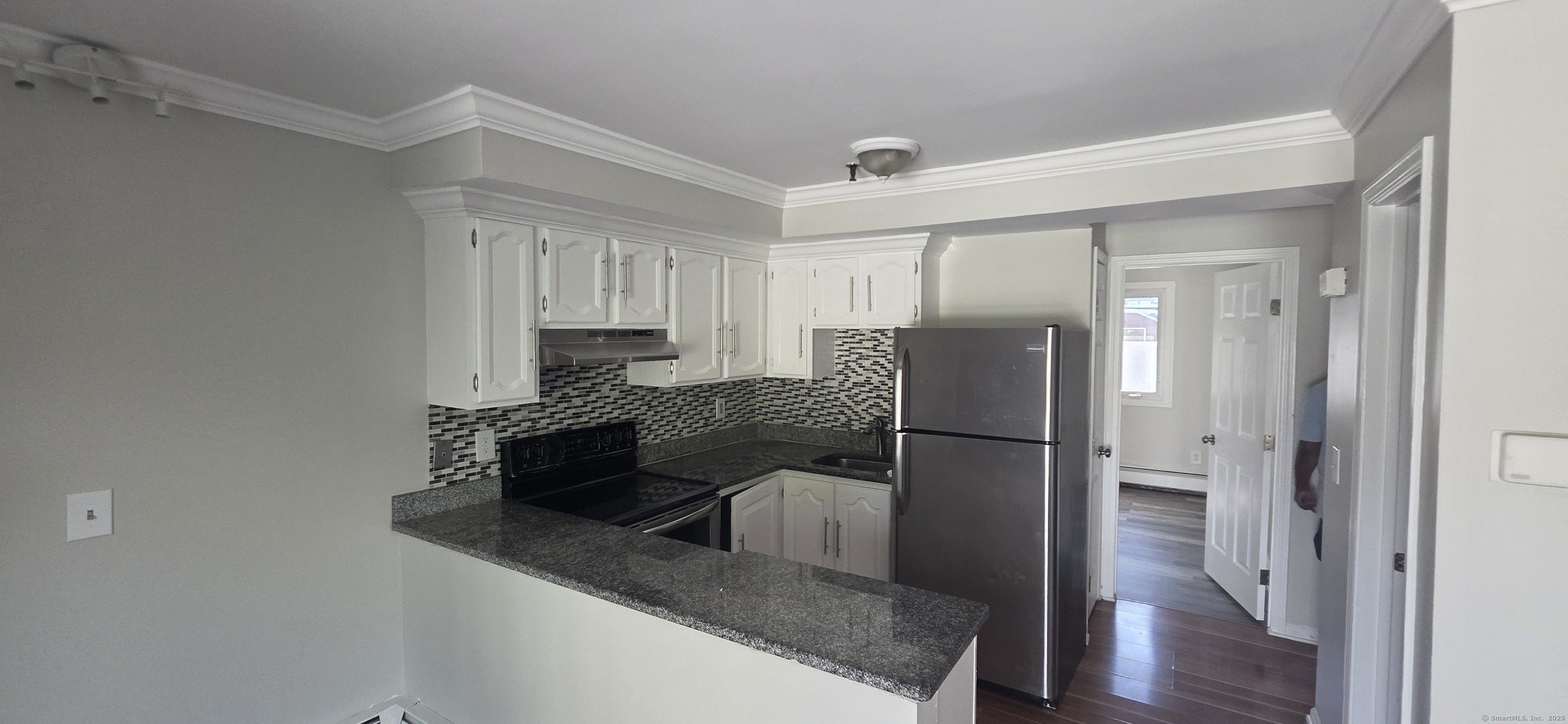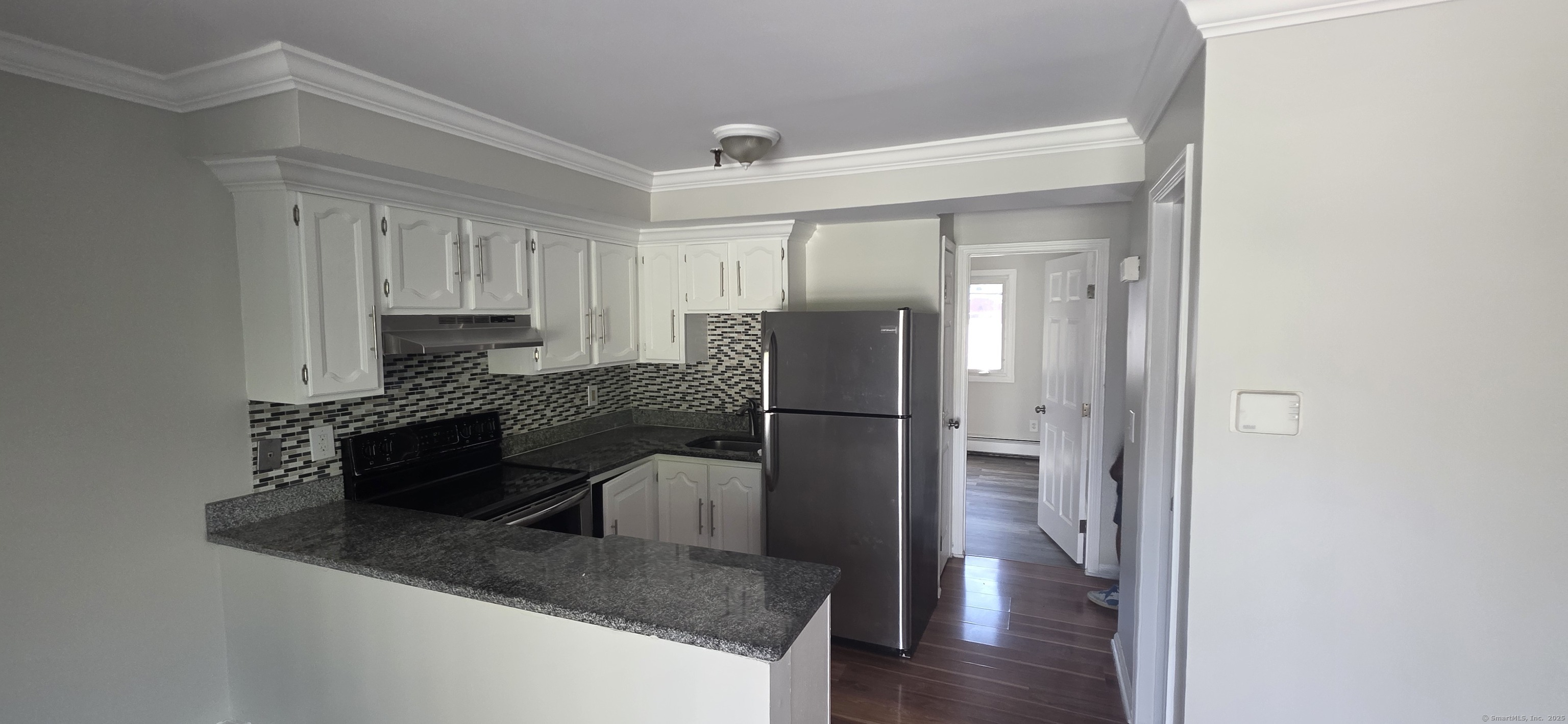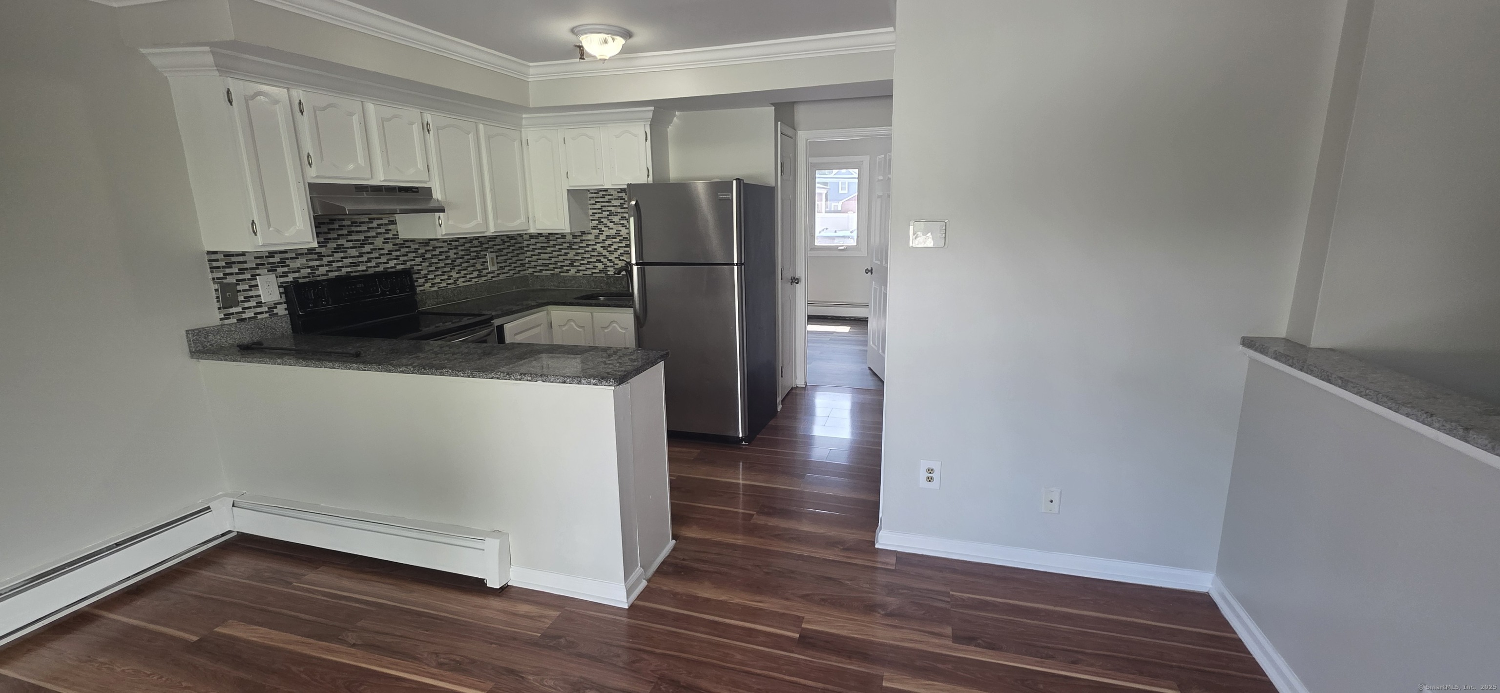 Newly updated and spacious one bedroom, one bathroom condo with beautiful brick fireplace, updated kitchenette, and fresh paint on two floors of living space featuring a finished basement area with washer and dryer that can be used as living room, office, den, or bedroom. This unit boasts laminate flooring throughout, custom backsplash, and private deck. Walk to the West Haven green, shopping, dining, and entertainment. Close to public transportation, UNH, and train station.