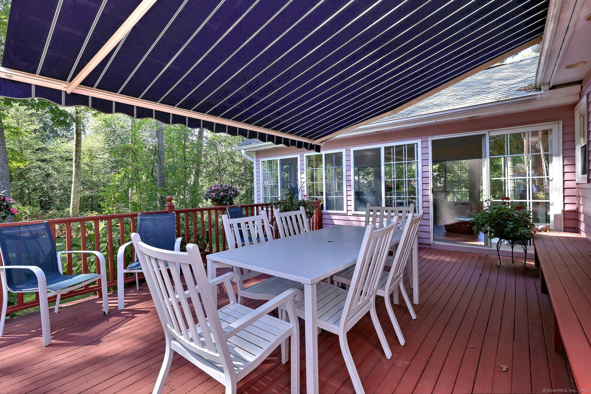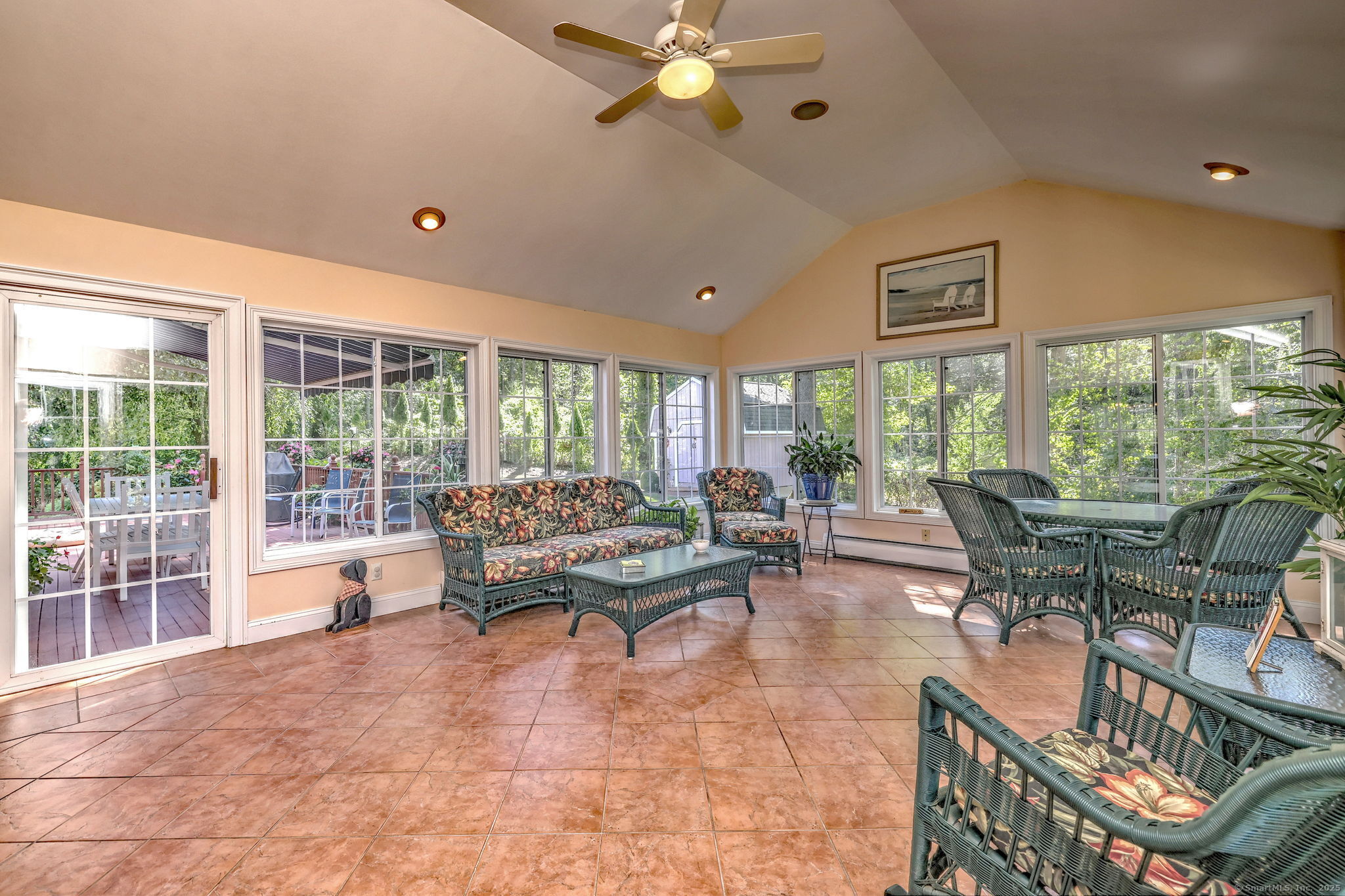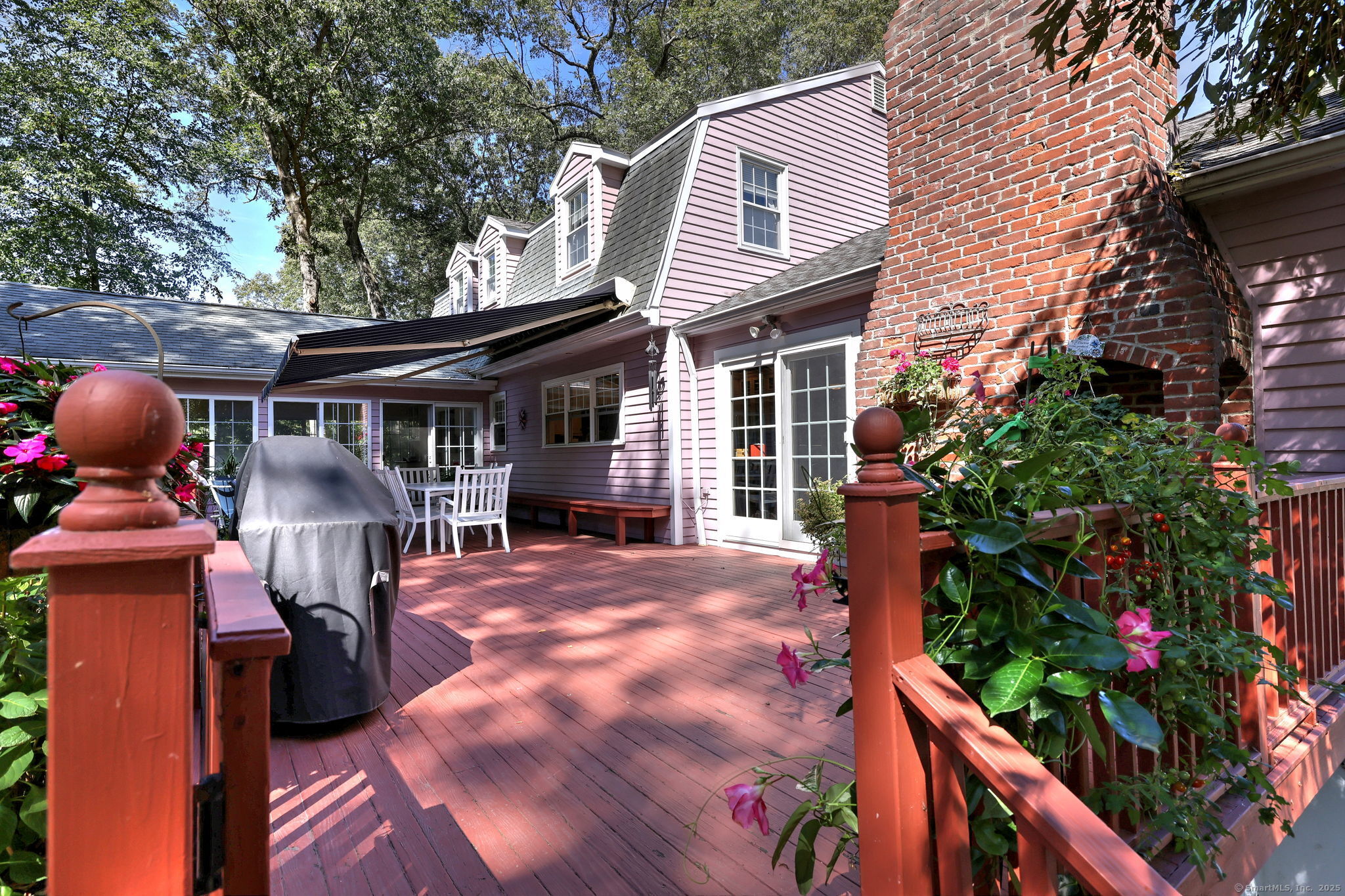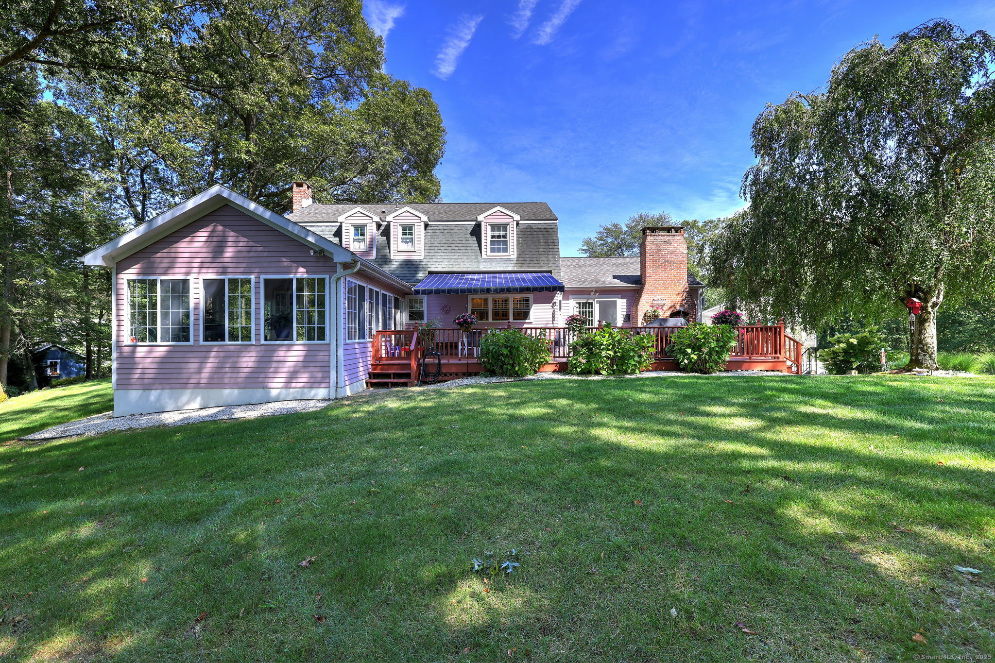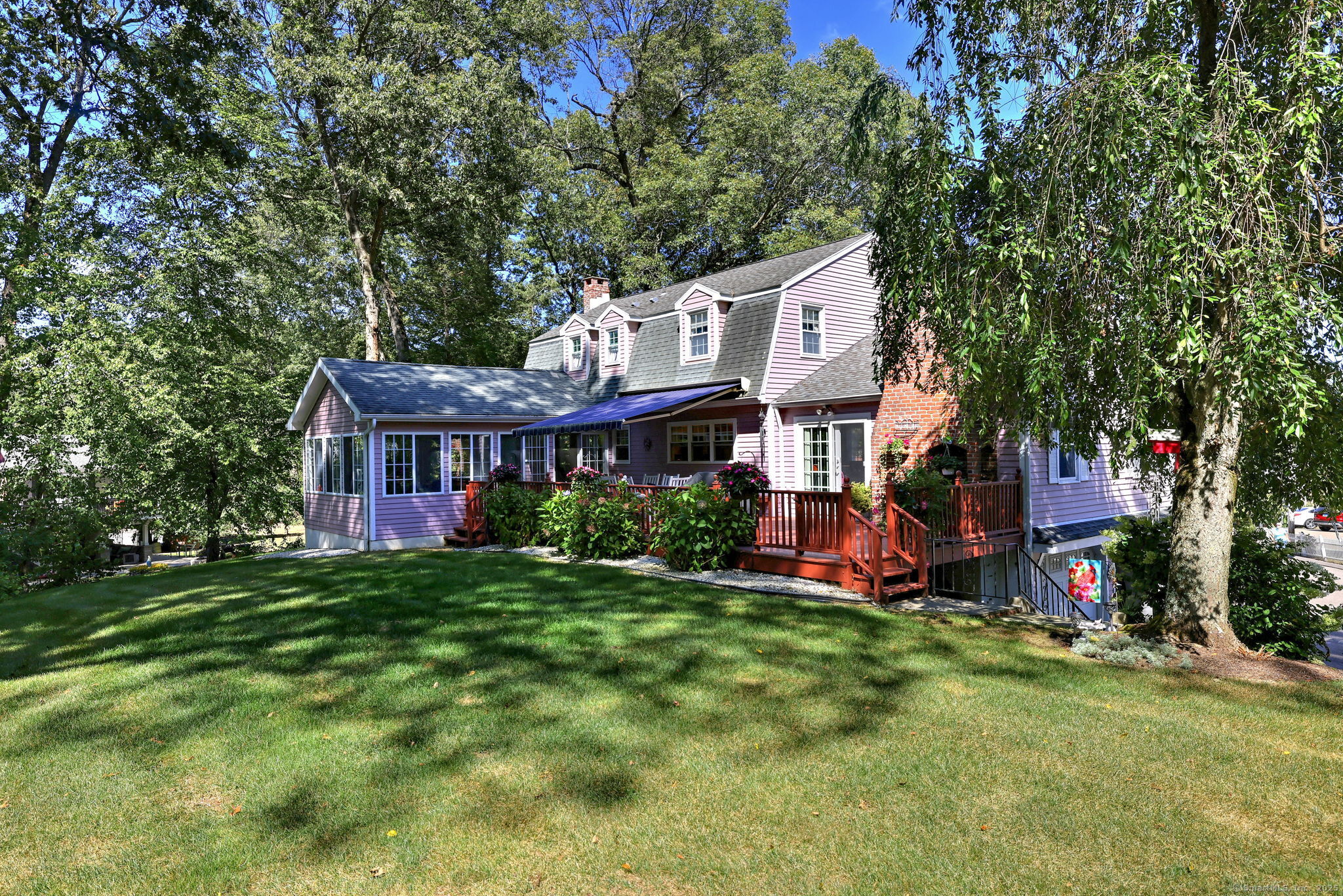 Discover timeless charm and modern comfort in this beautifully updated 3-bedroom, 2.1-bath Gambrel Colonial, ideally located north of Post Road on a quiet cul-de-sac. Set on a manicured 3/4+ acre lot with sprinkler system, this home offers privacy, space, and exceptional living both indoors and out. This beautifully appointed home offers three spacious bedrooms, including a luxurious primary suite with a private bath, and a total of 2.1 bathrooms, highlighted by a newly renovated main bath on the upper level. The updated kitchen flows seamlessly into the inviting family room, where a cozy gas fireplace and sliding doors lead to a deck-ideal for relaxing or entertaining. A formal living room and generous dining area open to a stunning four-season heated porch, complete with a wet bar and panoramic views of the picturesque yard. Outdoor gatherings are a breeze on the deck with its retractable awning, while the two-car garage and ample driveway space provide plenty of parking. With gas heat distributed across five zones, this home ensures efficient comfort throughout the year. This home blends classic colonial architecture with thoughtful updates and serene outdoor living. Whether you're hosting guests or enjoying a quiet evening on the porch, this property is a true retreat. Professional photos to come.