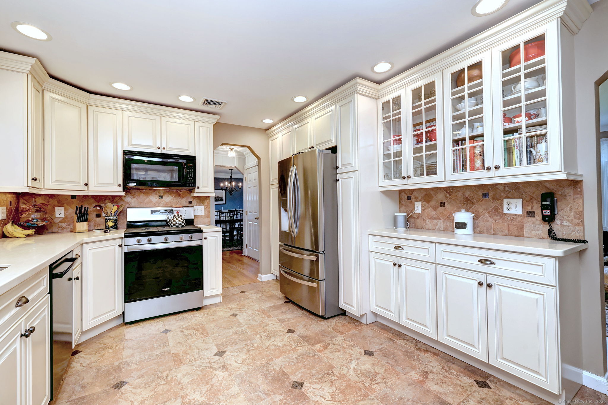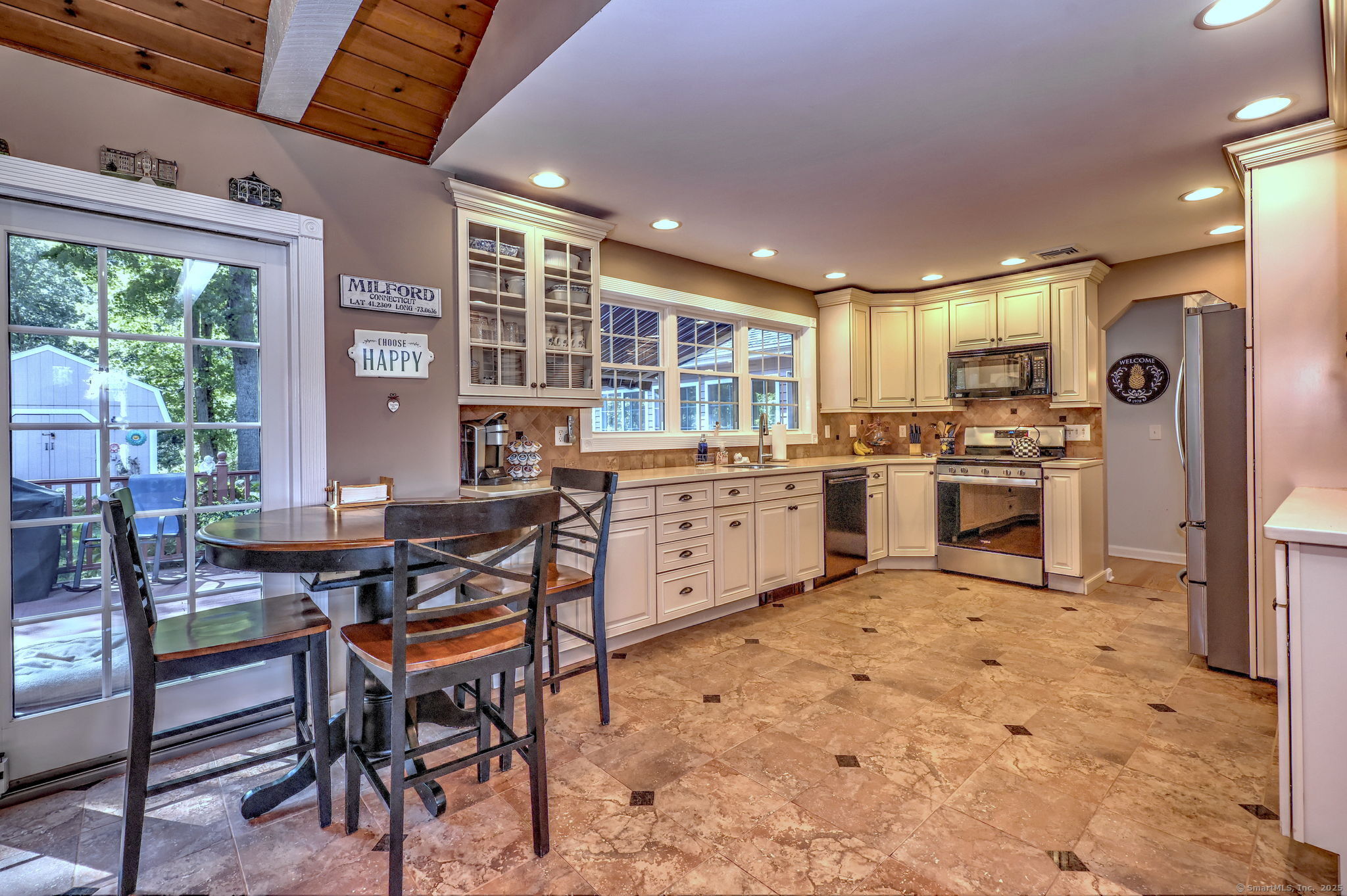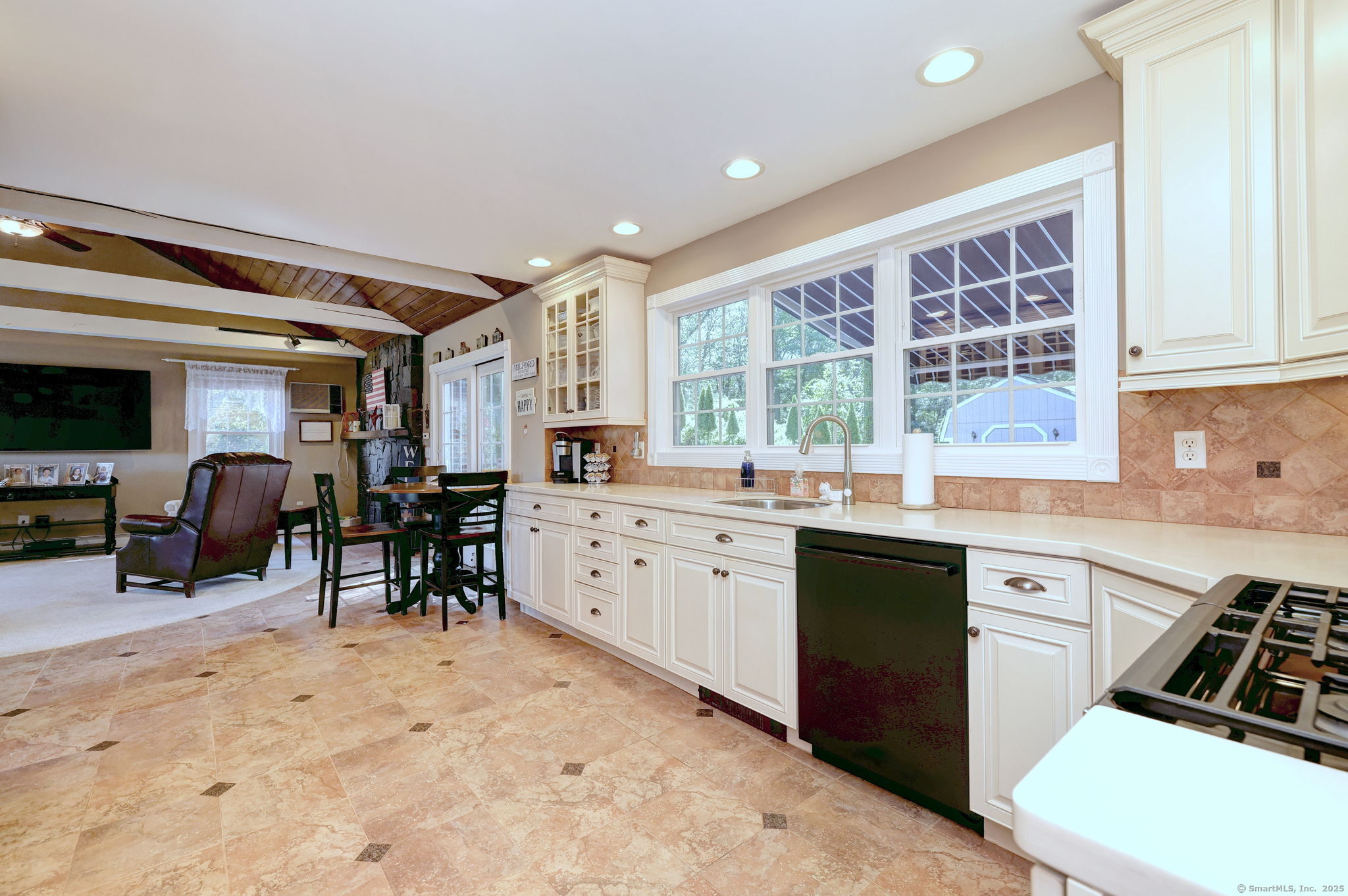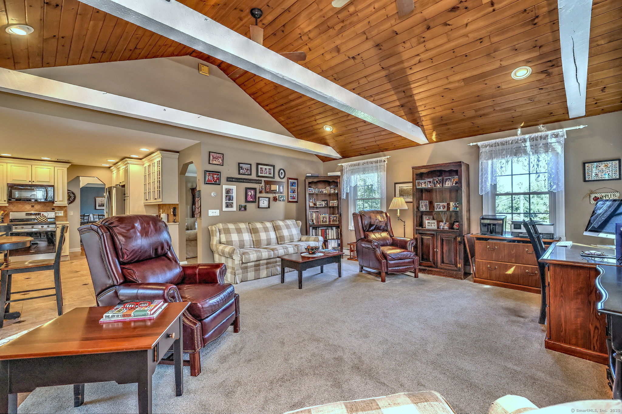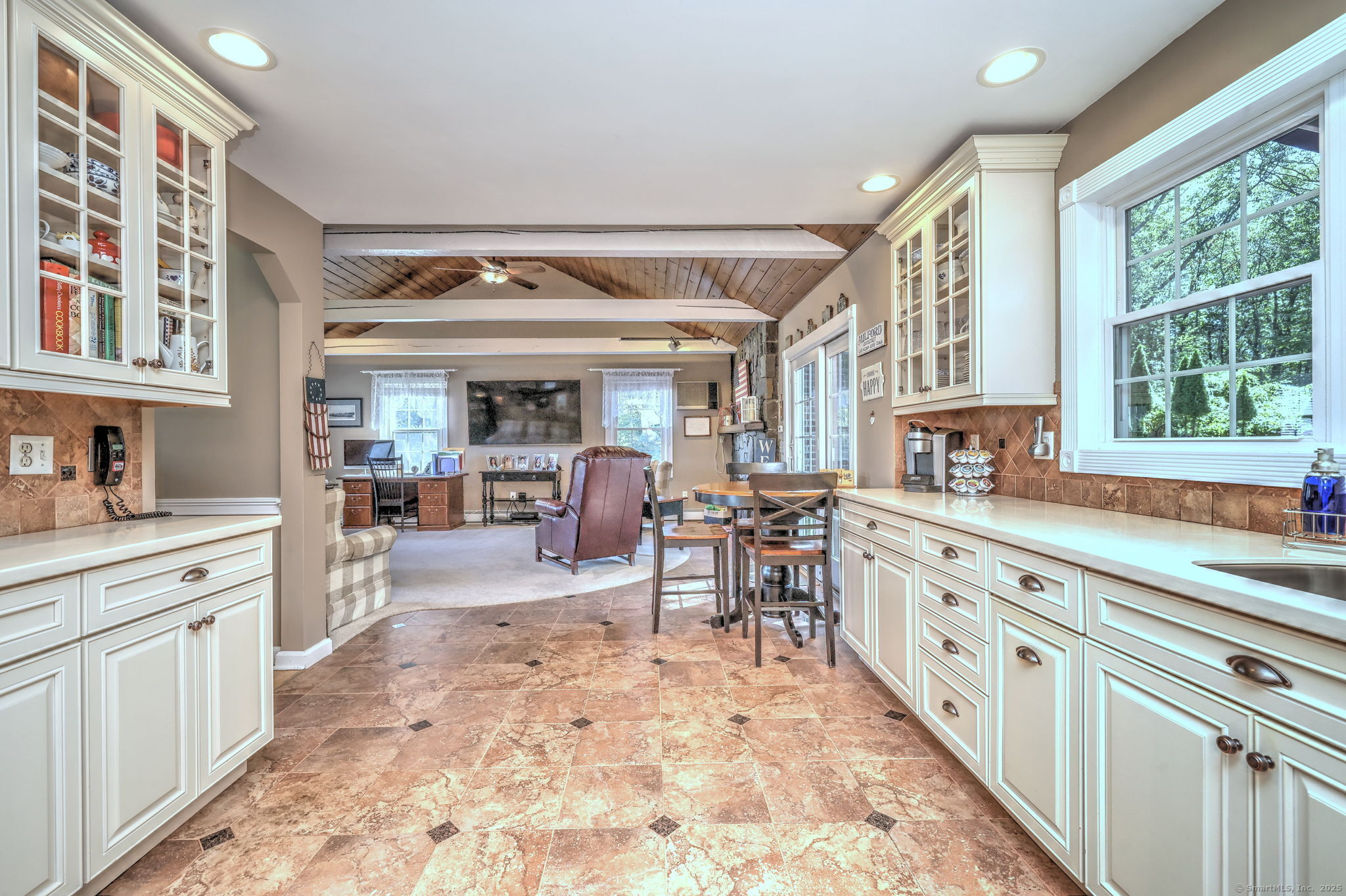 Discover timeless charm and modern comfort in this beautifully updated 3-bedroom, 2.1-bath Gambrel Colonial, ideally located north of Post Road on a quiet cul-de-sac. Set on a manicured 3/4+ acre lot with sprinkler system, this home offers privacy, space, and exceptional living both indoors and out. This beautifully appointed home offers three spacious bedrooms, including a luxurious primary suite with a private bath, and a total of 2.1 bathrooms, highlighted by a newly renovated main bath on the upper level. The updated kitchen flows seamlessly into the inviting family room, where a cozy gas fireplace and sliding doors lead to a deck-ideal for relaxing or entertaining. A formal living room and generous dining area open to a stunning four-season heated porch, complete with a wet bar and panoramic views of the picturesque yard. Outdoor gatherings are a breeze on the deck with its retractable awning, while the two-car garage and ample driveway space provide plenty of parking. With gas heat distributed across five zones, this home ensures efficient comfort throughout the year. This home blends classic colonial architecture with thoughtful updates and serene outdoor living. Whether you're hosting guests or enjoying a quiet evening on the porch, this property is a true retreat. Professional photos to come.