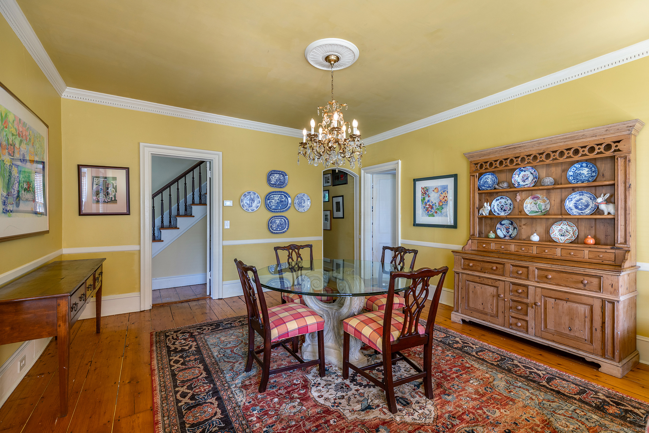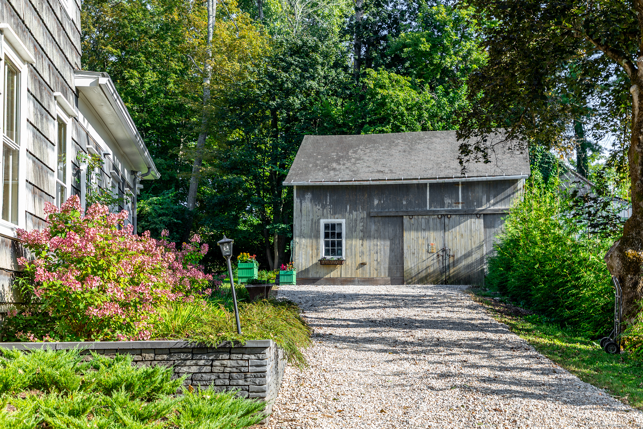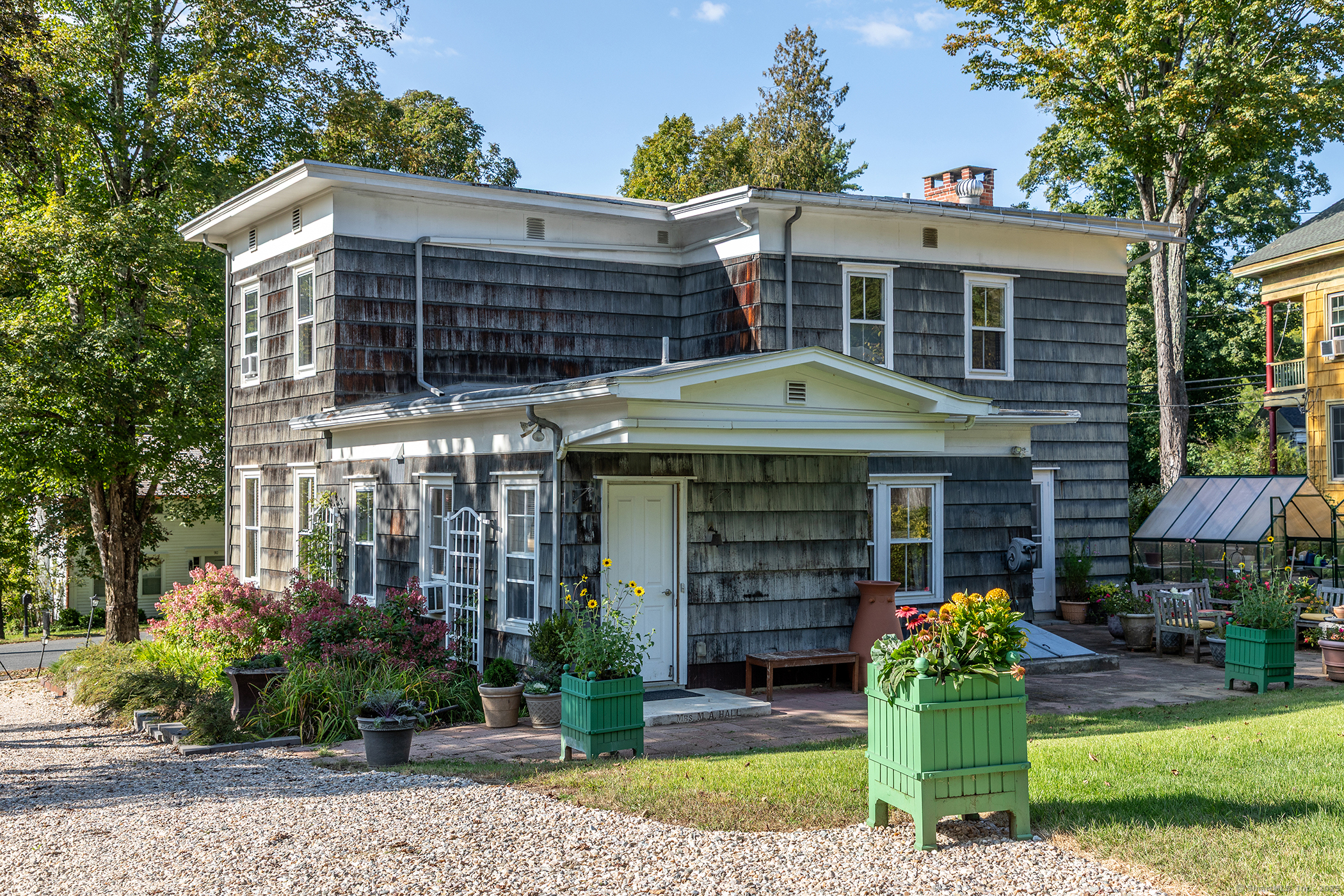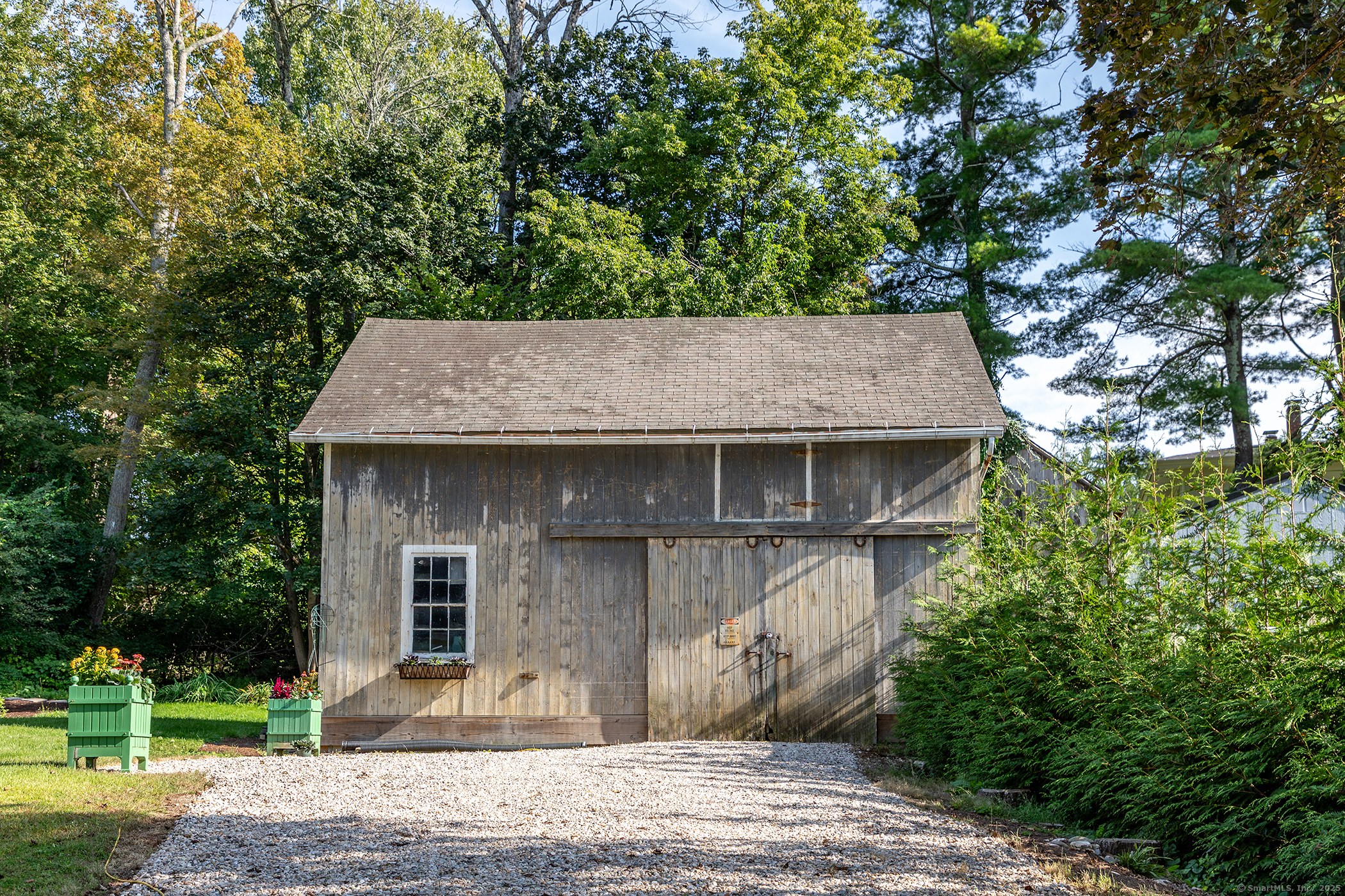 91 Main Street in Falls Village, CT is a gracious antique with stately front doors leading into a cozy foyer. To your left is a spacious Living Room with 9 ft ceiling height, dental molding, a fireplace, beautiful antique wide floor boards and French doors leading to a stone patio. The over-size windows invite in light while built in book cases and a seating area near the French doors offer a spot for reading. The large dining room, to the right of the foyer, mirrors the living room with 9 ft ceiling height, dental moldings and wide floorboards. The sunny eat in kitchen has a Zline gas stove, Bosch dishwasher and offers access to the back patio for entertaining. A renovated bathroom is conveniently located off the kitchen as well as a mudroom. Upstairs are four bedrooms. The primary is light filled and spacious. Current owners converted the smallest bedroom into a closet. The third bedroom easily can accommodate two twin beds or a queen depending on your needs. The fourth bedroom is cozy and has views of gardens and barn. A renovated full bath is centrally situated on this floor. Antique wide board floors continue throughout the second floor. Outside is equally charming. The front yard is peppered with Boxwood and Juniper a Dogwood and Crab Apple tree.Lining the driveway are Hydrangea and Iris. There is also a stone patio and greenhouse. The two story barn flanks the back of the property offering a parking spot for one car and ample space for a workshop or storage.
