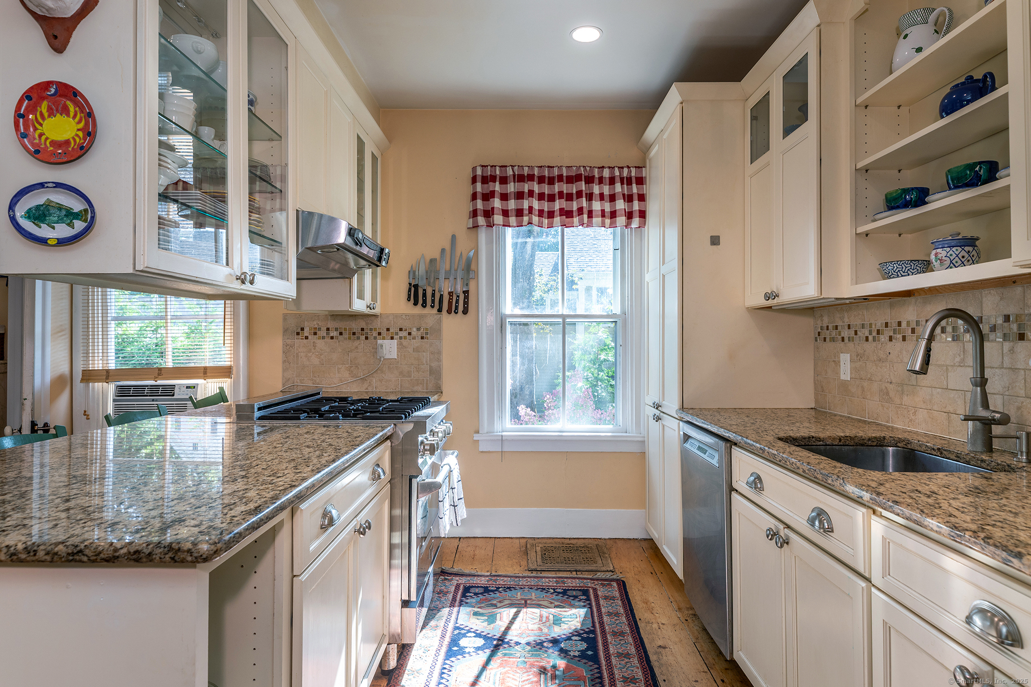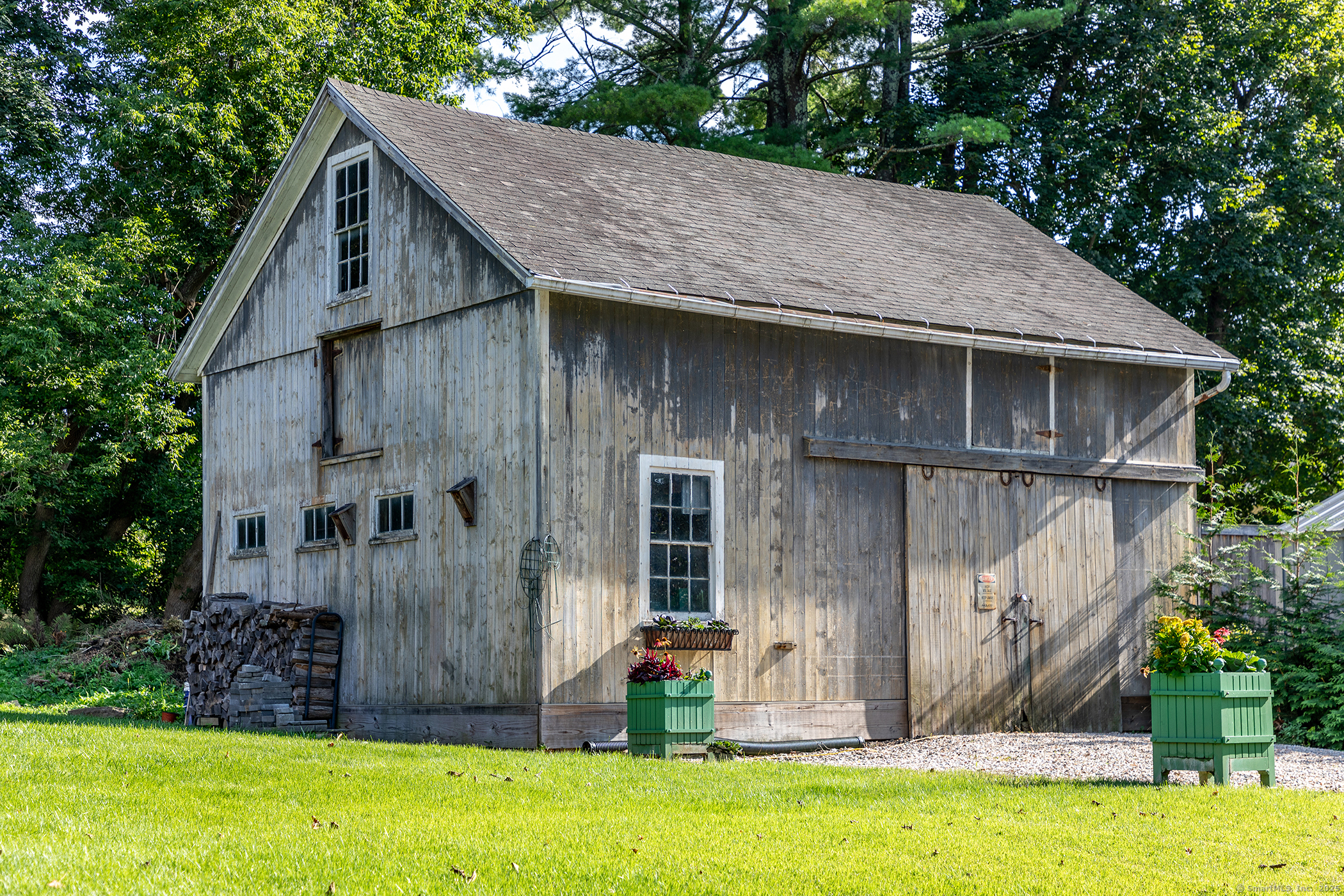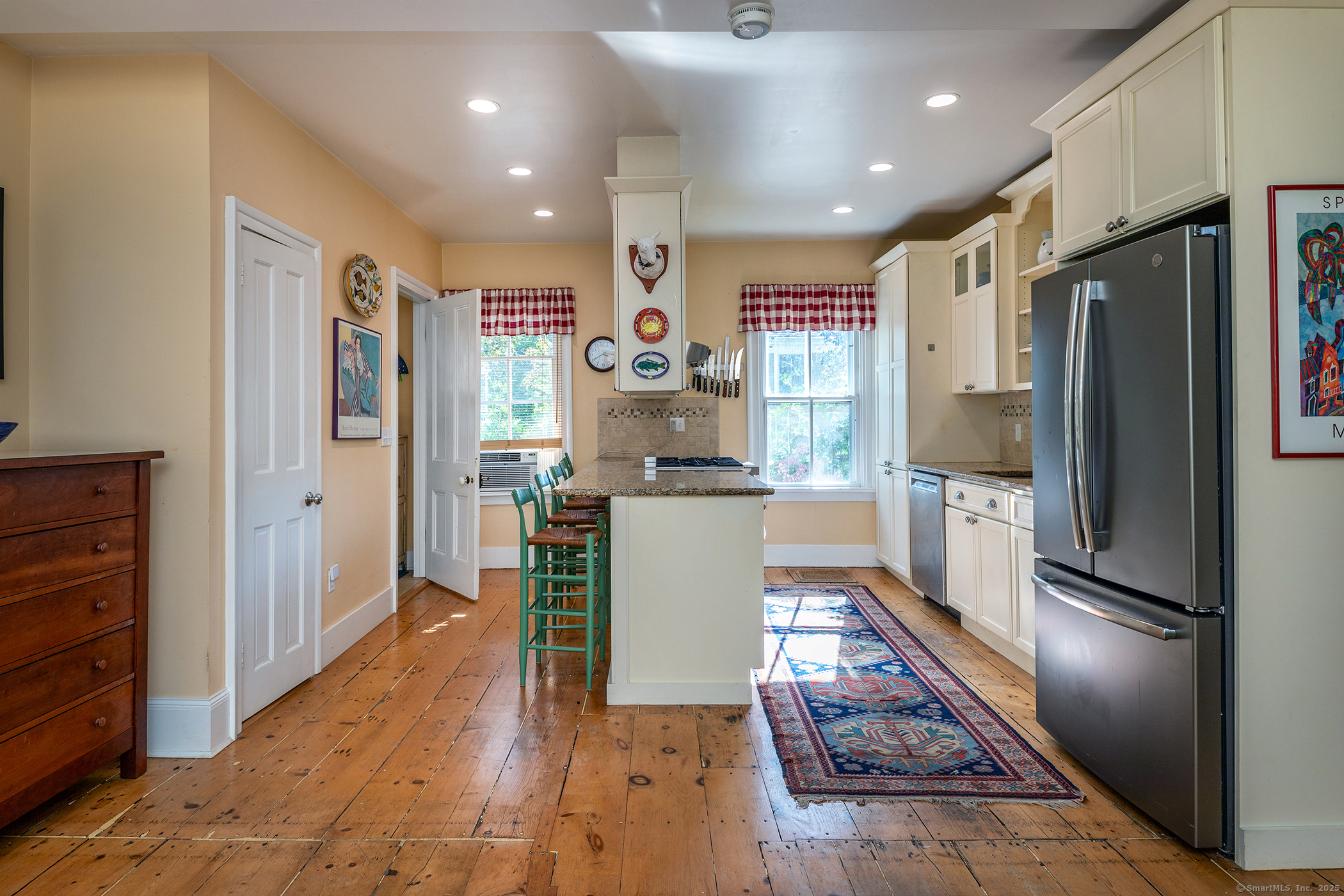 91 Main Street in Falls Village, CT is a gracious antique with stately front doors leading into a cozy foyer. To your left is a spacious Living Room with 9 ft ceiling height, dental molding, a fireplace, beautiful antique wide floor boards and French doors leading to a stone patio. The over-size windows invite in light while built in book cases and a seating area near the French doors offer a spot for reading. The large dining room, to the right of the foyer, mirrors the living room with 9 ft ceiling height, dental moldings and wide floorboards. The sunny eat in kitchen has a Zline gas stove, Bosch dishwasher and offers access to the back patio for entertaining. A renovated bathroom is conveniently located off the kitchen as well as a mudroom. Upstairs are four bedrooms. The primary is light filled and spacious. Current owners converted the smallest bedroom into a closet. The third bedroom easily can accommodate two twin beds or a queen depending on your needs. The fourth bedroom is cozy and has views of gardens and barn. A renovated full bath is centrally situated on this floor. Antique wide board floors continue throughout the second floor. Outside is equally charming. The front yard is peppered with Boxwood and Juniper a Dogwood and Crab Apple tree.Lining the driveway are Hydrangea and Iris. There is also a stone patio and greenhouse. The two story barn flanks the back of the property offering a parking spot for one car and ample space for a workshop or storage.