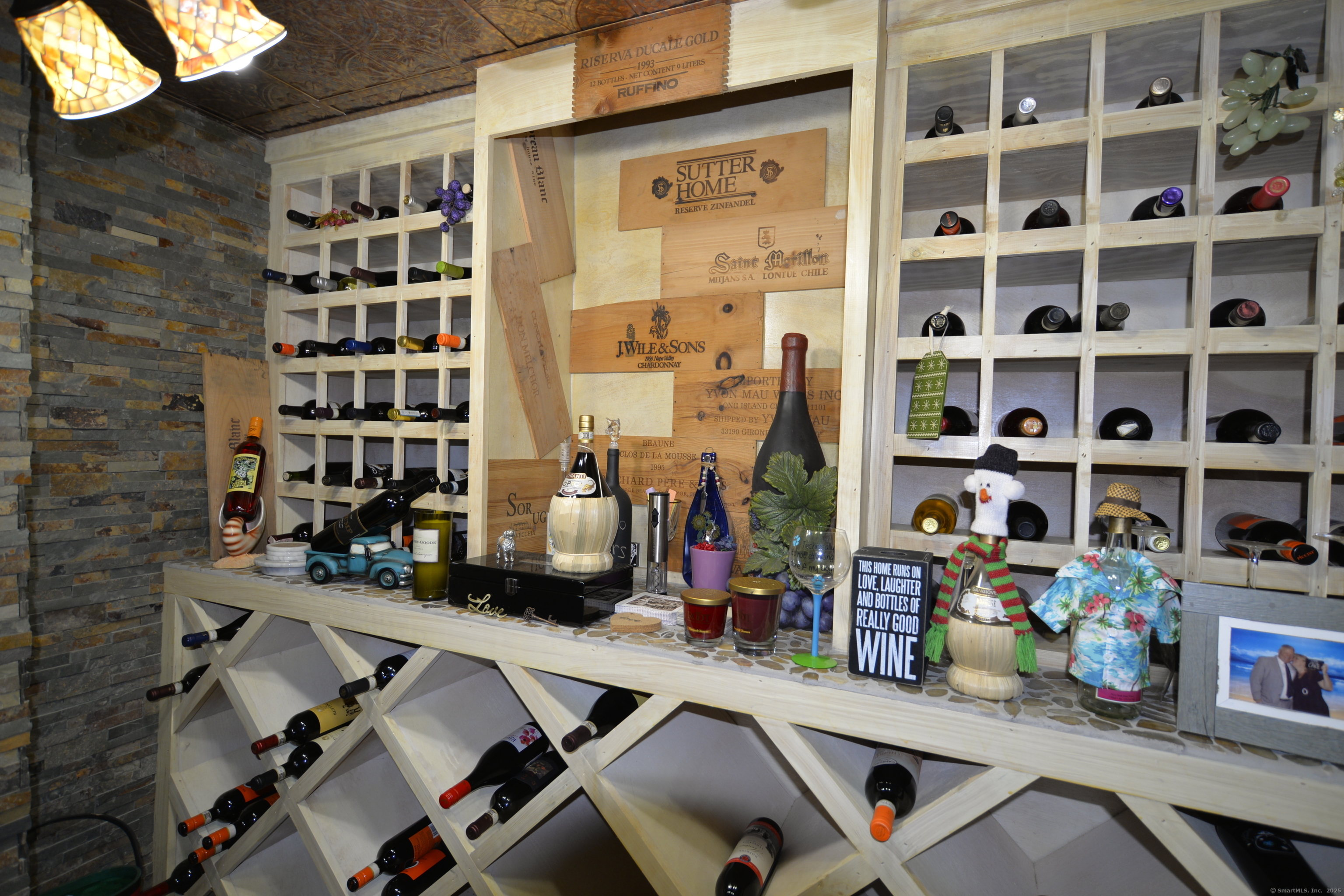Welcome to a home that truly blends comfort, style, and space. This contemporary colonial offers 3,416 square feet of thoughtfully designed living space set on 1.3 acres of beautifully landscaped privacy. The modern roof lines and curated stone walls offer standout curb appeal, while the in-ground pool brings a resort-like vibe to your own backyard. Inside, the heart of the home is the chef's kitchen, outfitted with rich cherry cabinets, granite countertops, and stainless steel appliances-a great space for culinary adventures or weekend gatherings. The first-floor primary bedroom includes French doors leading to the deck, with picturesque views of the pool and surrounding grounds. Upstairs, two additional bedrooms offer space and comfort, with a hallway balcony overlooking the dramatic two-story living room-a layout that adds both elegance and connection between floors. The walk-out basement is built for entertaining or relaxing in style. Enjoy a cozy night in by the wood stove, mix up your favorite drinks at the wet bar, or store your favorite vintages in the dedicated wine cellar.