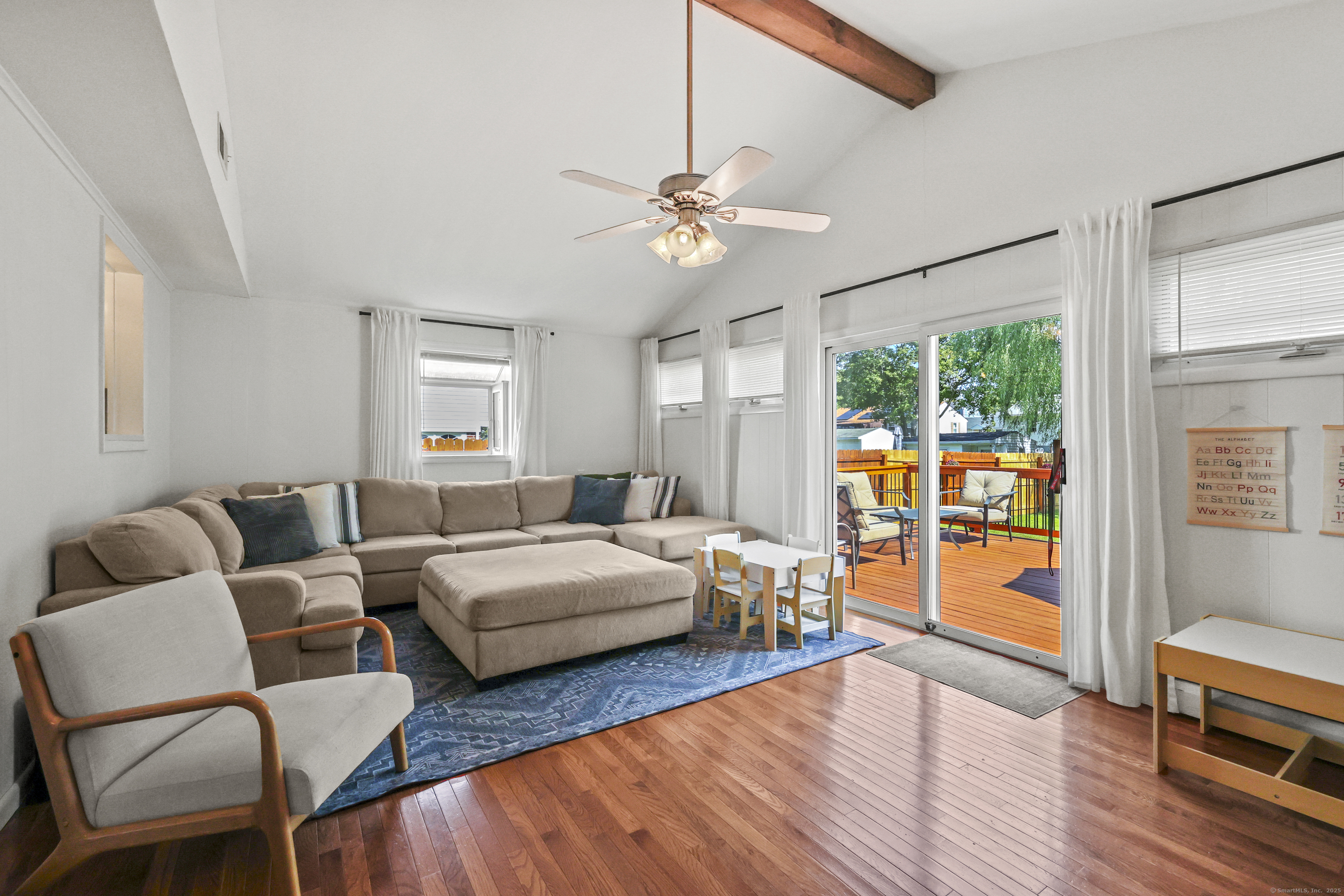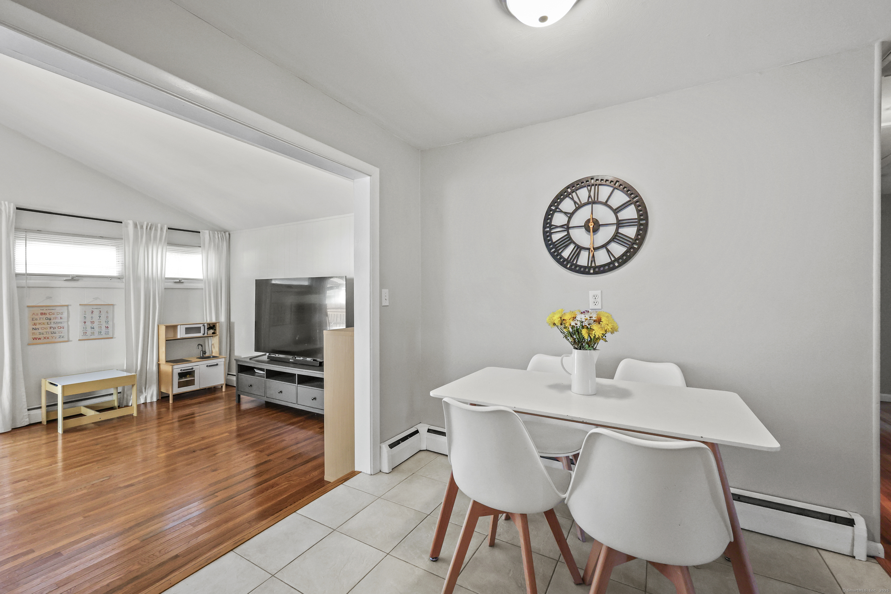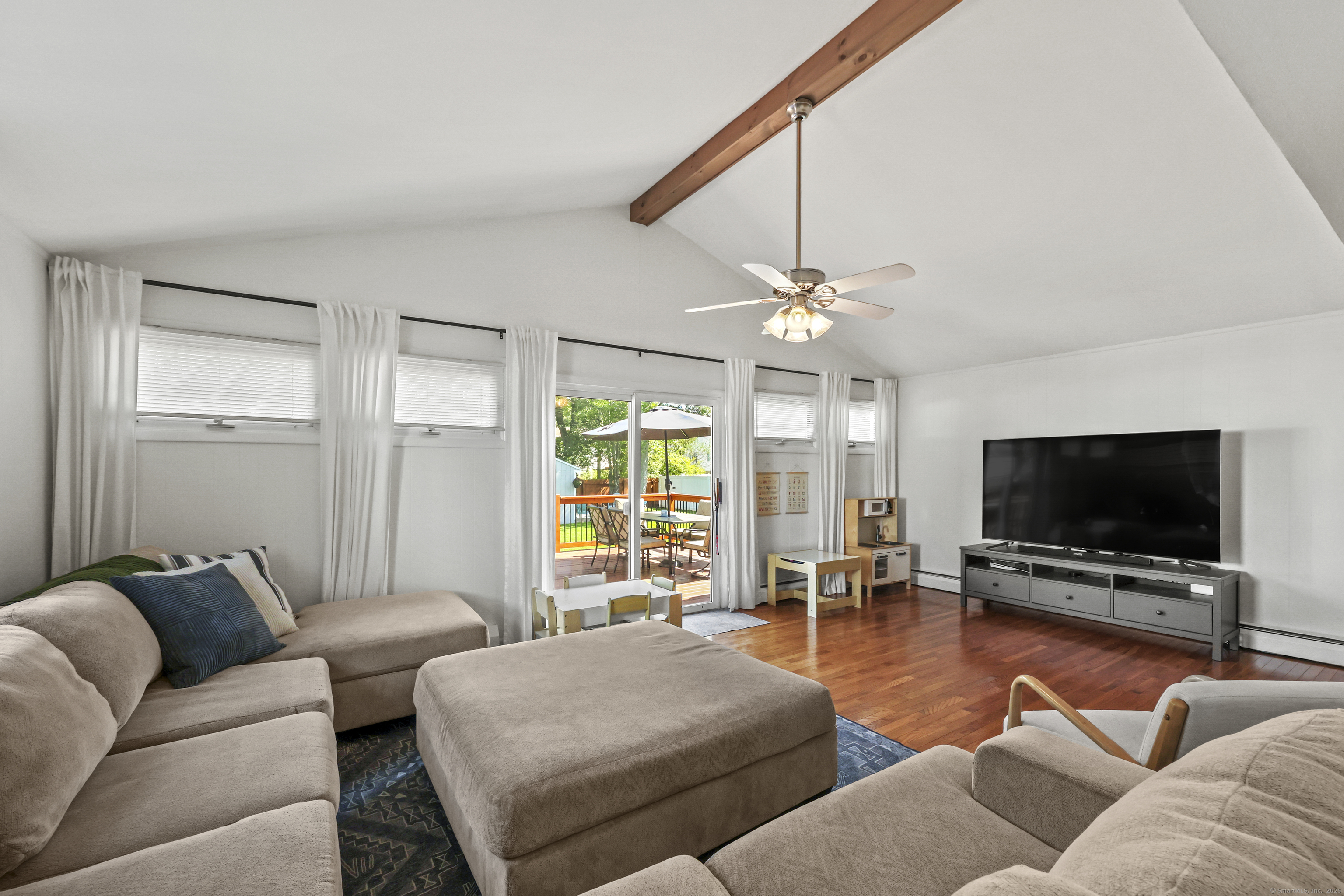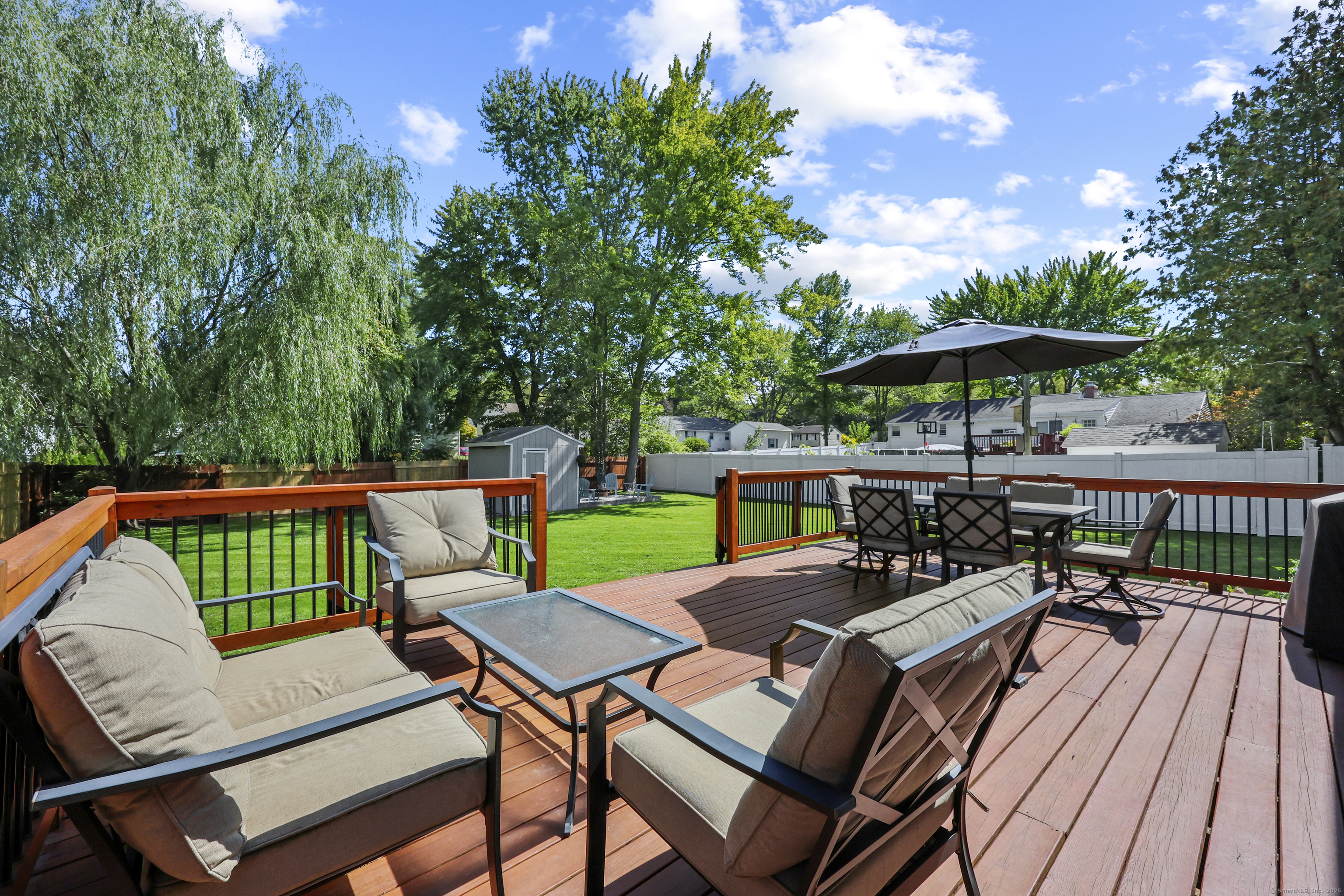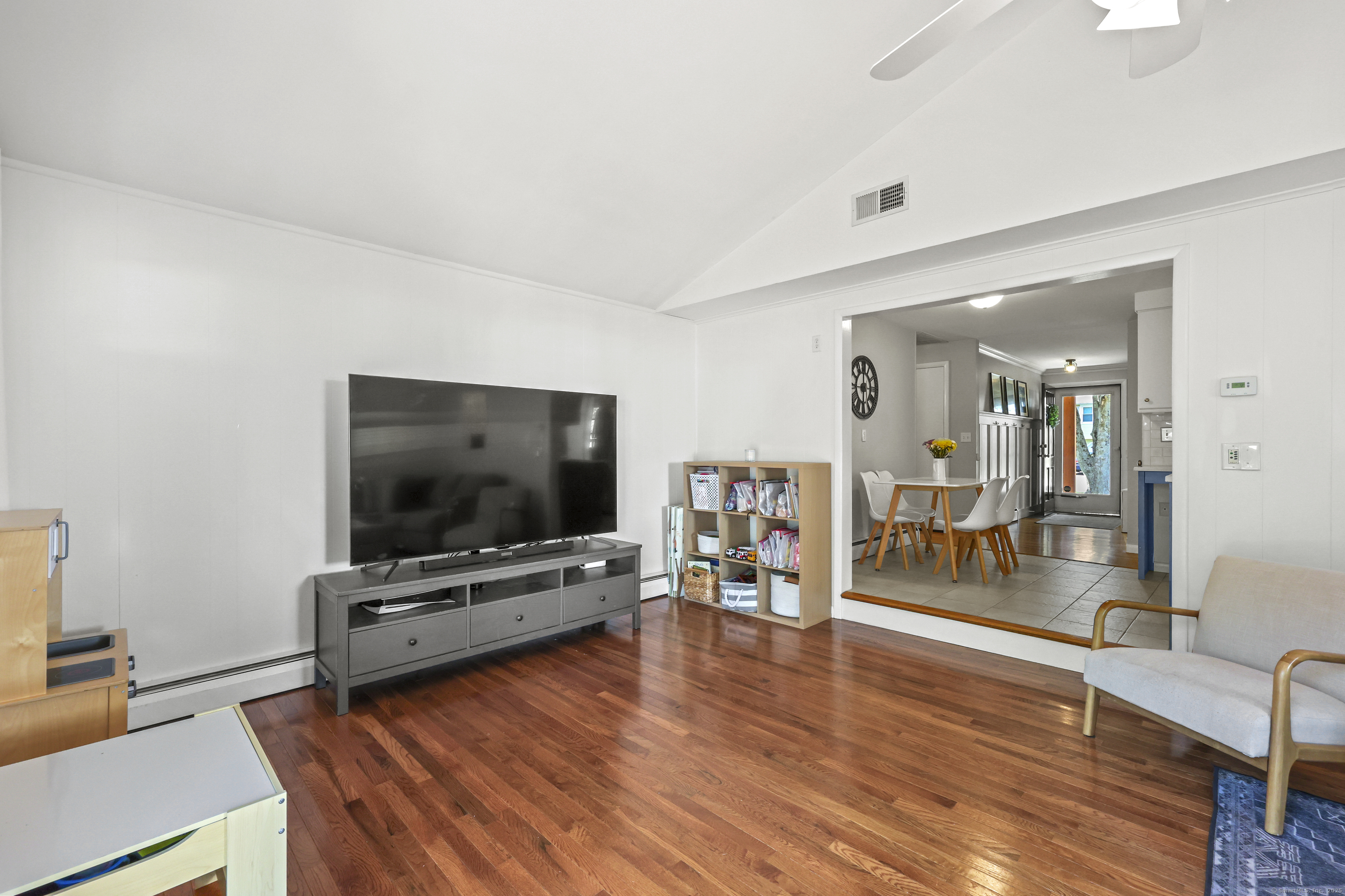 Welcome to this meticulously maintained and move in ready 3 bedroom Ranch style home in a very desirable location. Upon entering you are lead to the thoroughly remodeled kitchen with quality features, including quartz counters and stainless steel appliances. It is open to the spacious, bright and inviting living room with vaulted ceiling and sliders that open to a large deck overlooking the lush green lawn. The fenced in yard adds to privacy for grilling or even just being a fun place to sit. Both the third bedroom and the dining room with fireplace are good locations for an office if needed. Gleaming hardwood floors reveal that this home has been well loved and cared for. Roof replaced in 2021. Basement has ample storage. Come preview this home and make it yours!