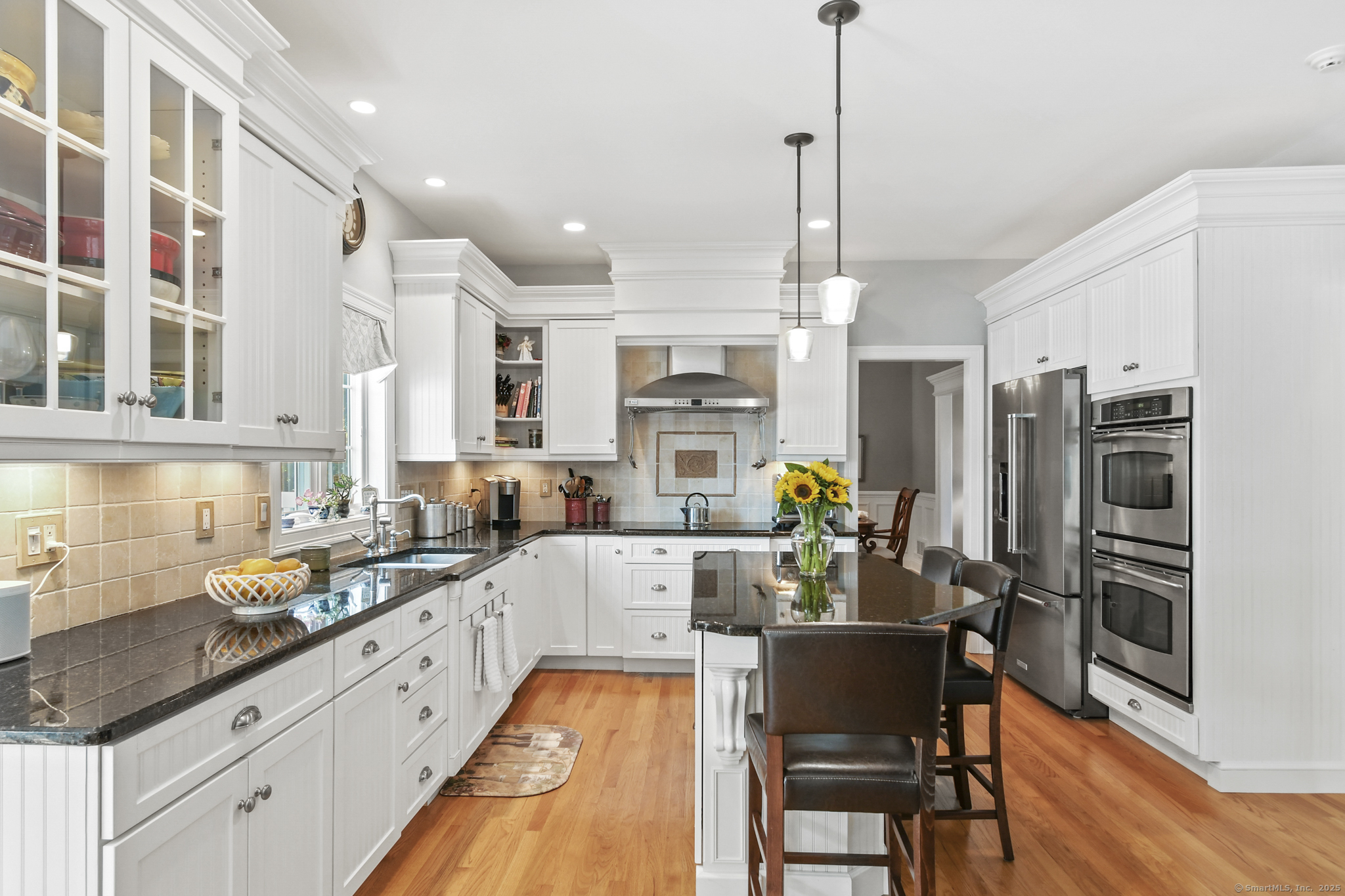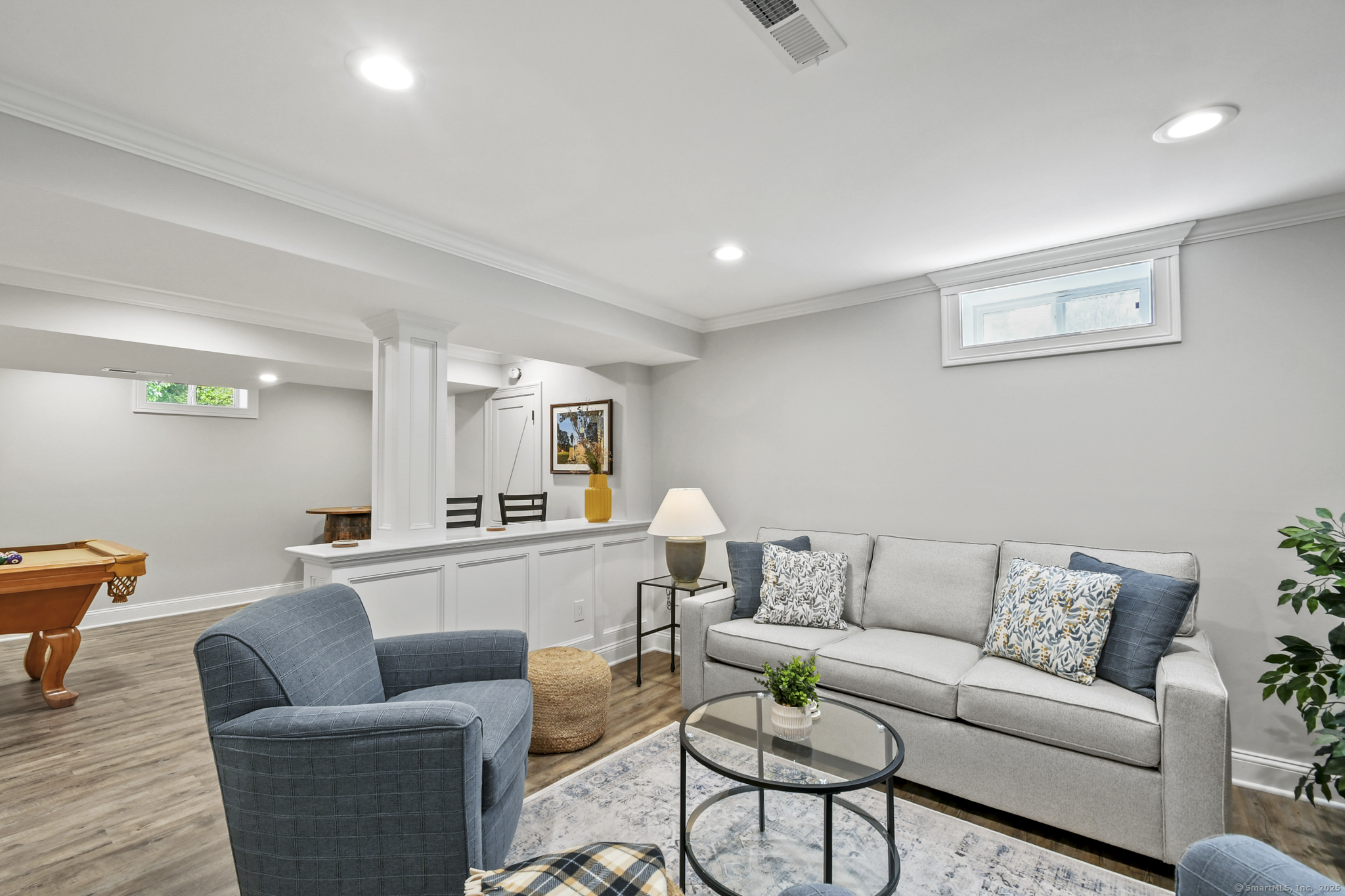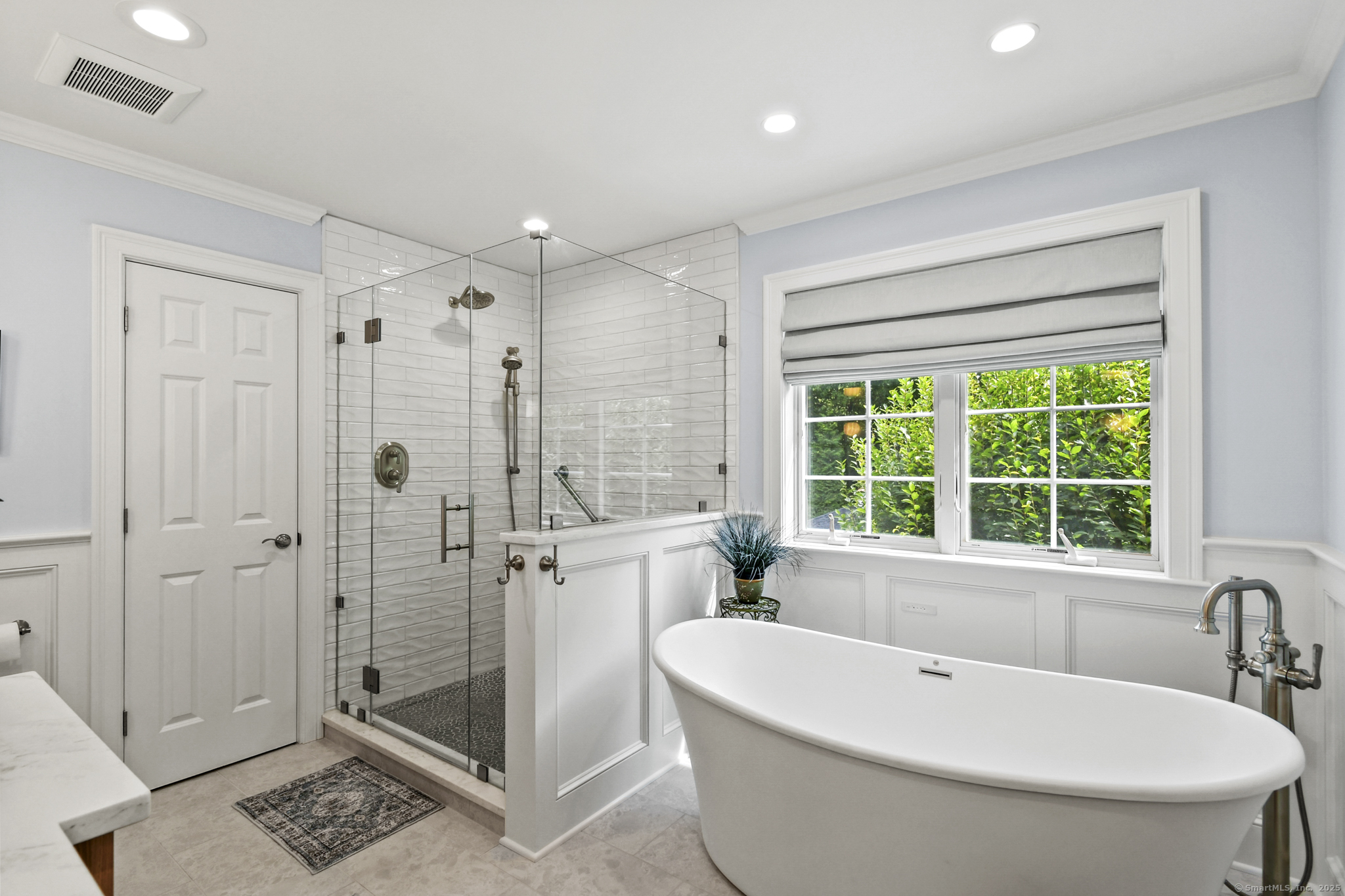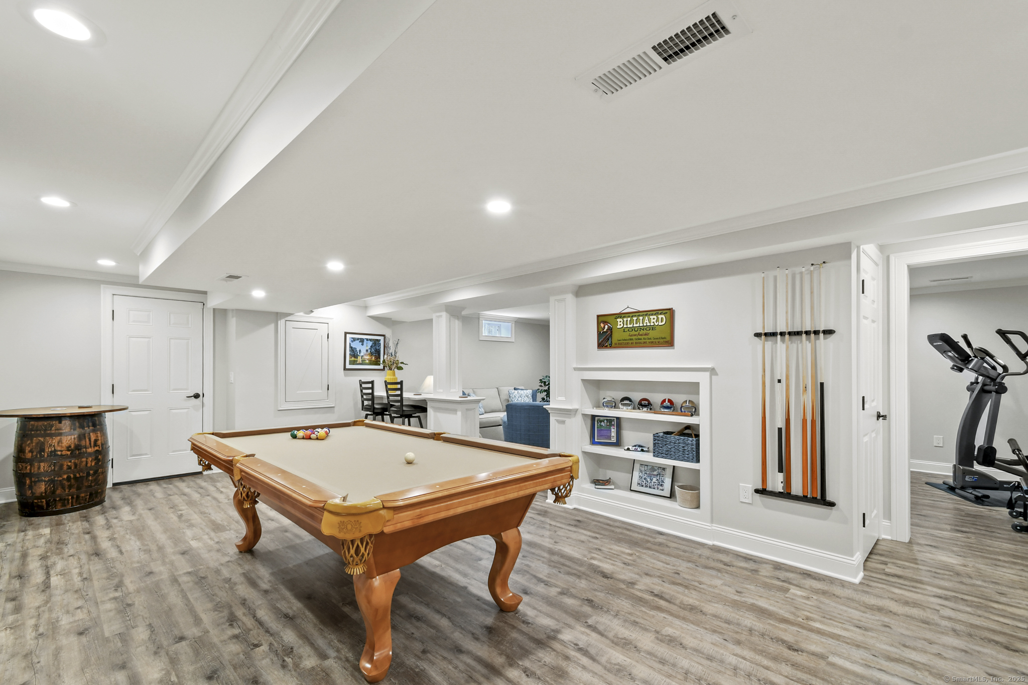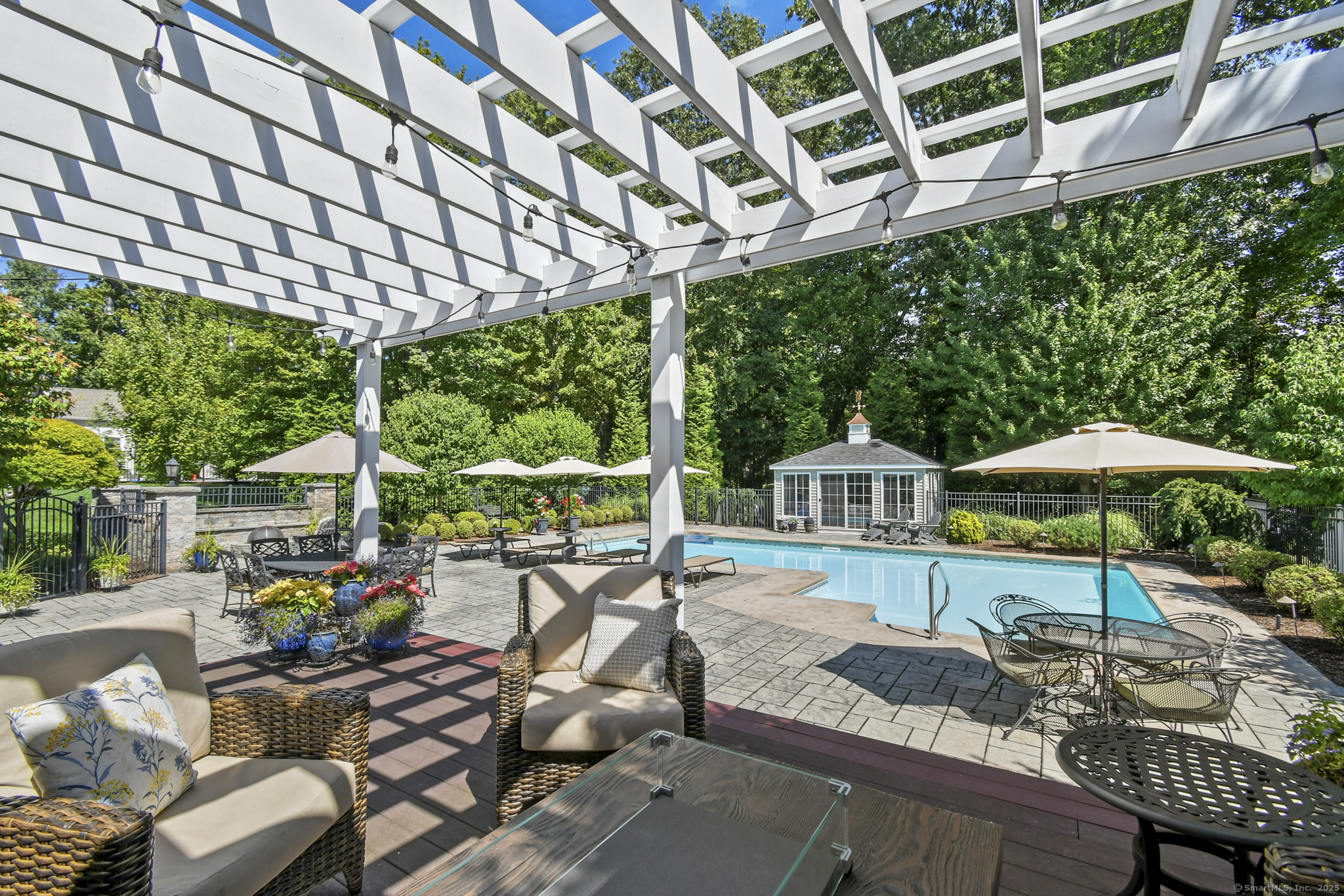 Exquisite Colonial with Pool, Finished Basement & Elegant Finishes. Welcome to this beautifully maintained 4-bedroom, 3.5-bath colonial, perfectly situated on 1.4 private acres at the end of a quiet cul-de-sac. From the moment you step inside, you'll be greeted by gleaming hardwood floors, crown molding, and wainscoting that flow seamlessly throughout the home, creating an atmosphere of timeless elegance. The spacious floor plan offers a perfect blend of formal and casual living spaces. The updated primary suite is a true retreat, featuring a newly renovated spa-like bathroom with a luxurious soaking tub and heated flooring for year-round comfort. The beautifully finished lower level expands your living space with a large living room, a full bar/kitchen, a full bathroom with shower, a dedicated exercise room, and a pantry for extra storage-all designed with the same attention to detail and beautiful finishes found throughout the home. Step outside to your own backyard oasis. The in-ground pool, pool house, built-in fire pit and expansive patios are ideal for summer entertaining or relaxing in total privacy. Meticulously maintained inside and out, this home offers the perfect combination of classic style and modern upgrades.