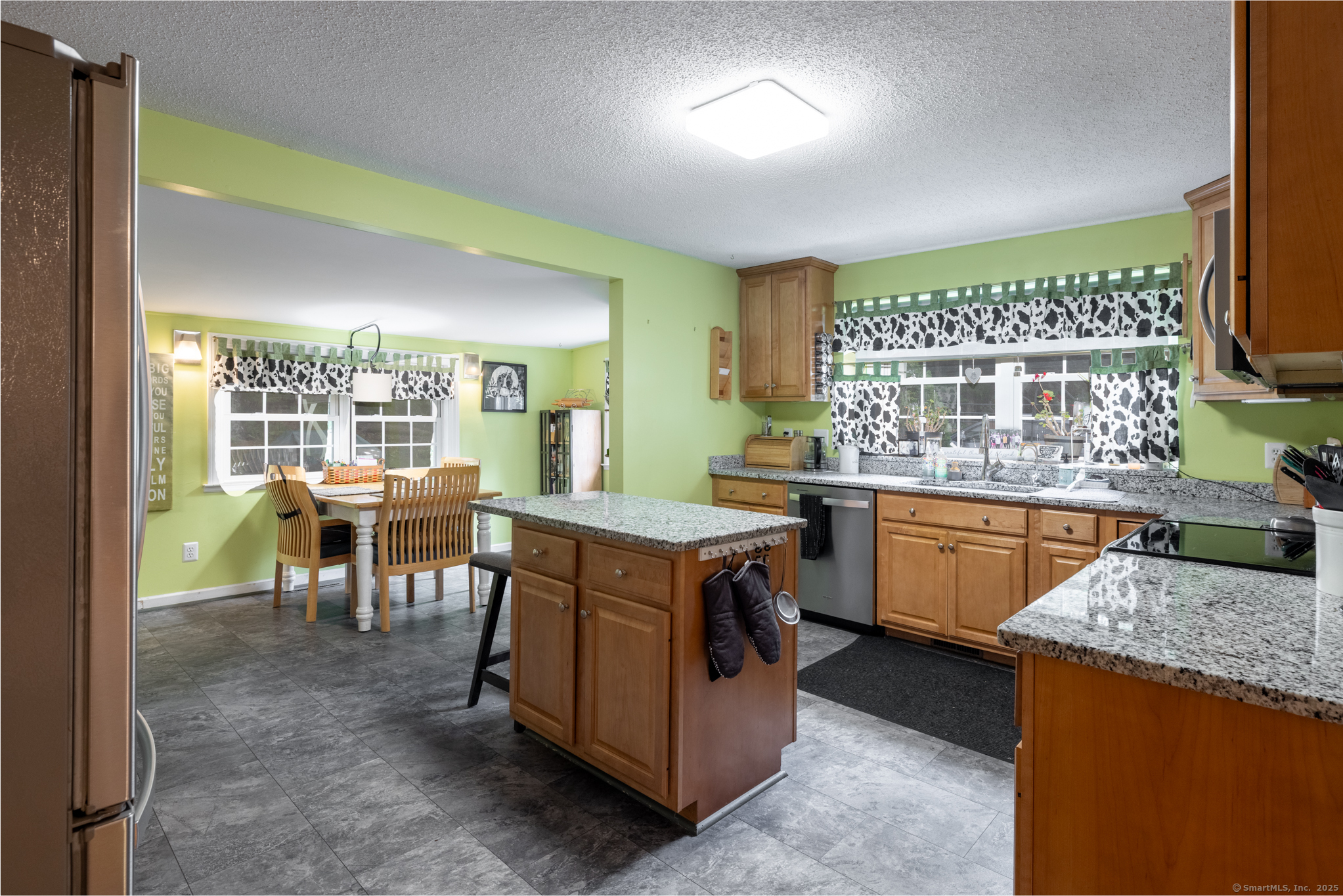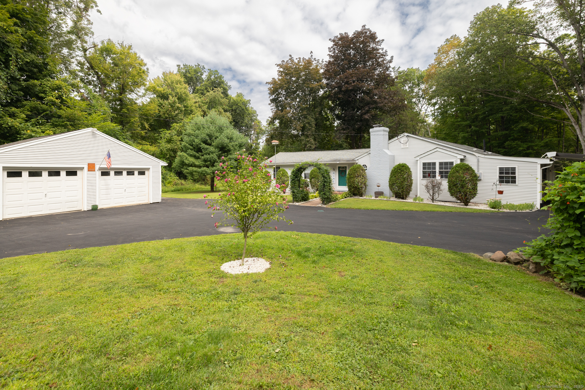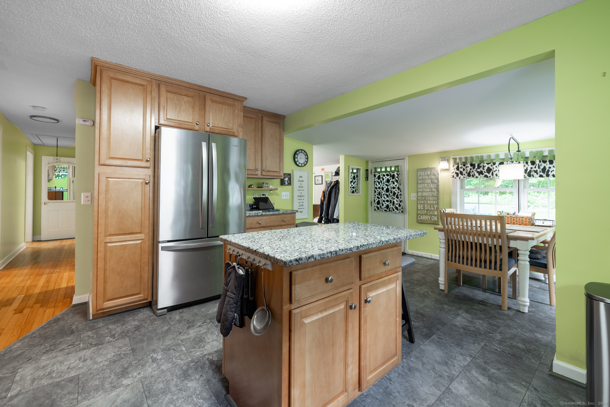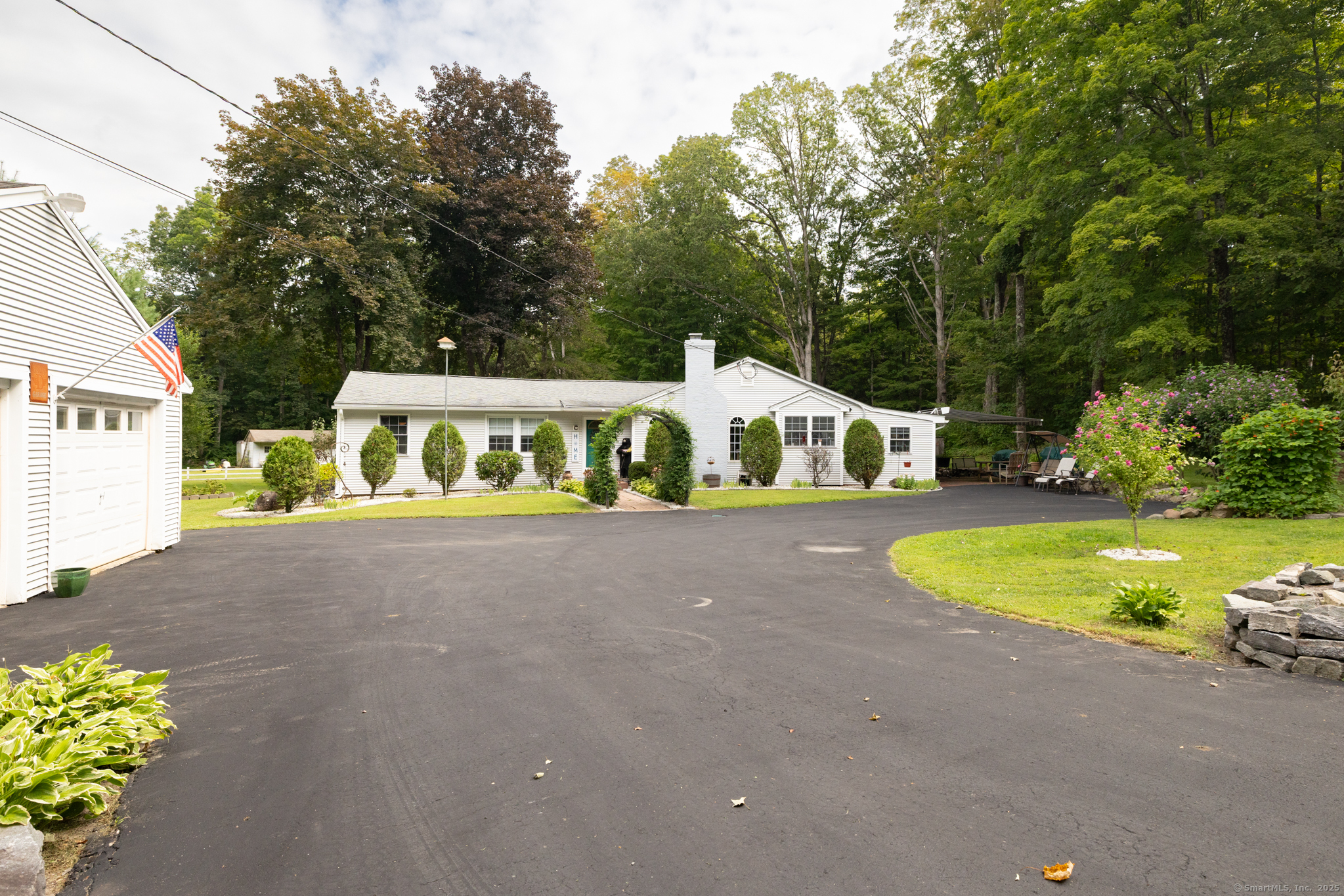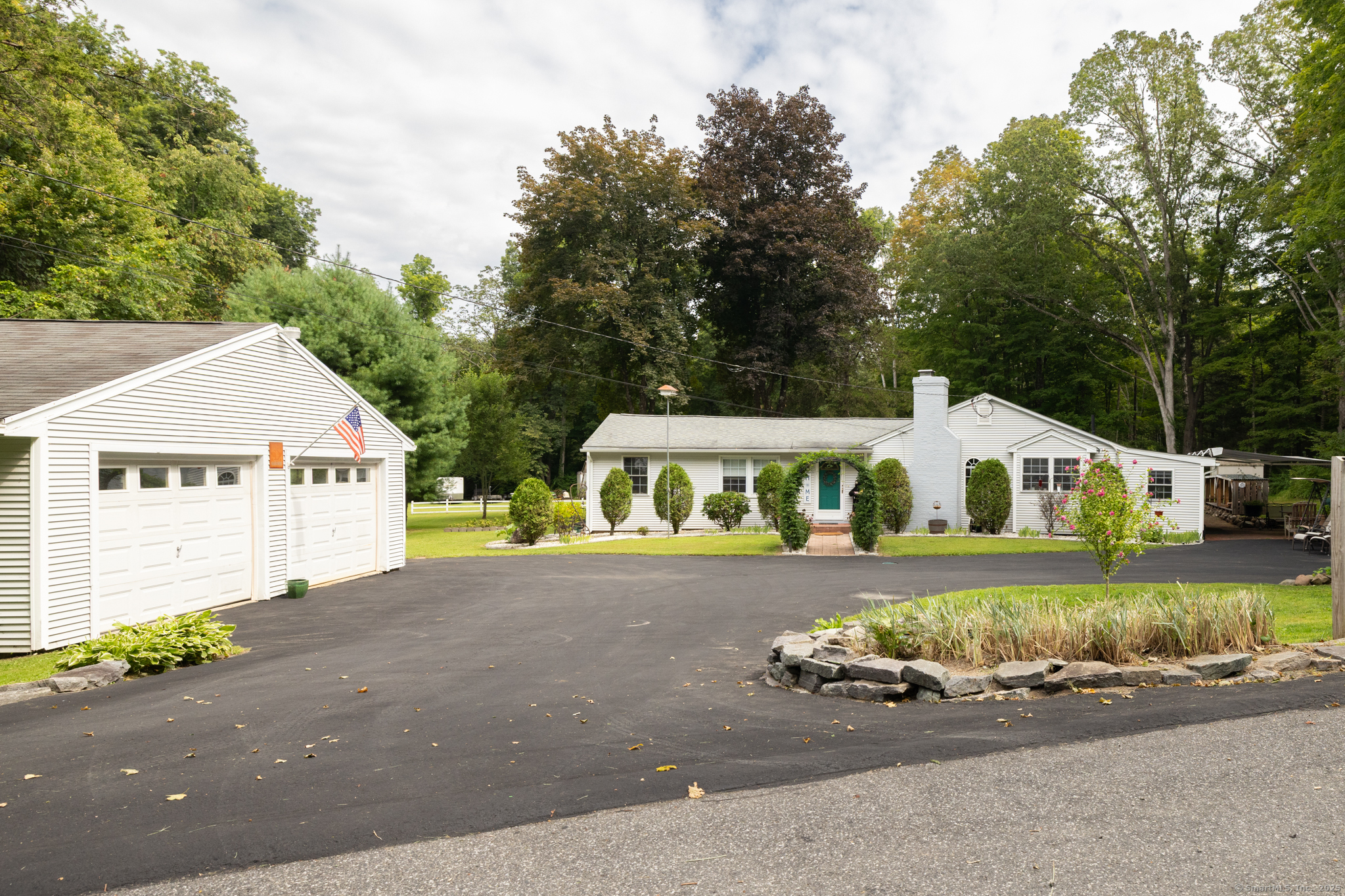 Discover this beautifully updated ranch-style home ideally situated on over an acre of level, private land, backing onto a tranquil nature preserve in the heart of Woodbury. Offering 2292 square feet of comfortable living space, this 3-bedroom, 1.5 bath home combines timeless character with modern upgrades-perfect for those seeking space, tranquility, and convenience. Inside, you'll find a bright and expansive Great Room with cathedral ceilings, original hardwood floors, LED lighting, bow windows, and ceiling fan-connected through French doors to a versatile all-season porch overlooking the lush backyard. The formal dining room features stunning Palladian windows, a cozy brick fireplace with a woodstove, and additional French doors leading back to the Great Room with a walk-in closet. The updated kitchen features modern cabinetry and countertops, a center island, engineered flooring, under-cabinet lighting, and brand- new appliances. A conveniently located laundry room is situated just steps away. All three bedrooms showcase beautiful hardwood flooring, including the Primary Bedroom offering a walk-in closet, an additional closet and private half bath. The home has seen numerous updates, including a newly renovated full bathroom with modern finishes.