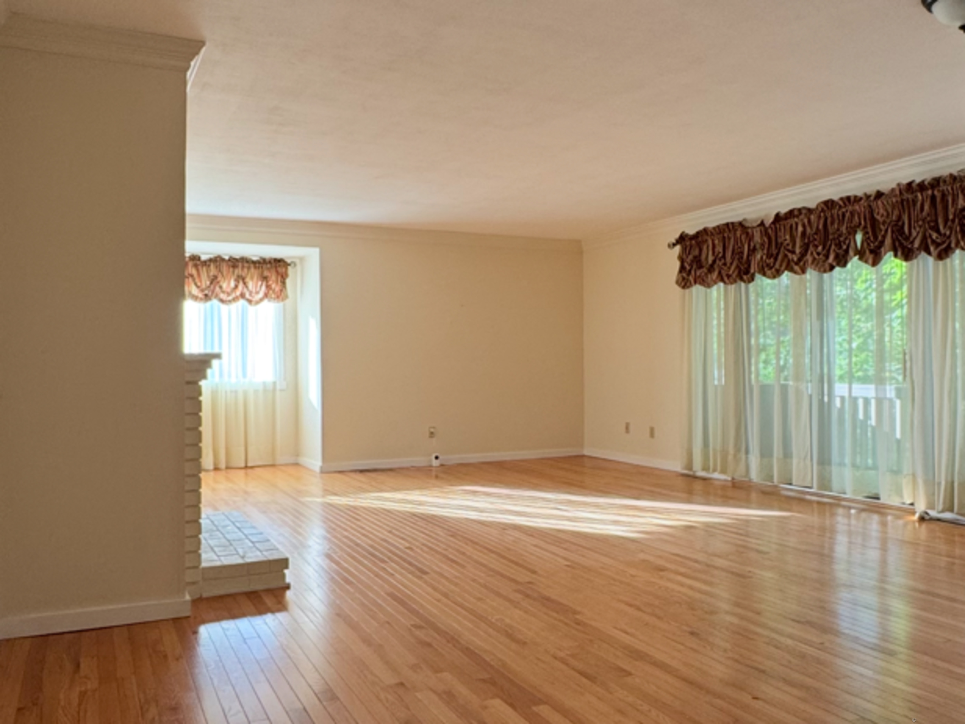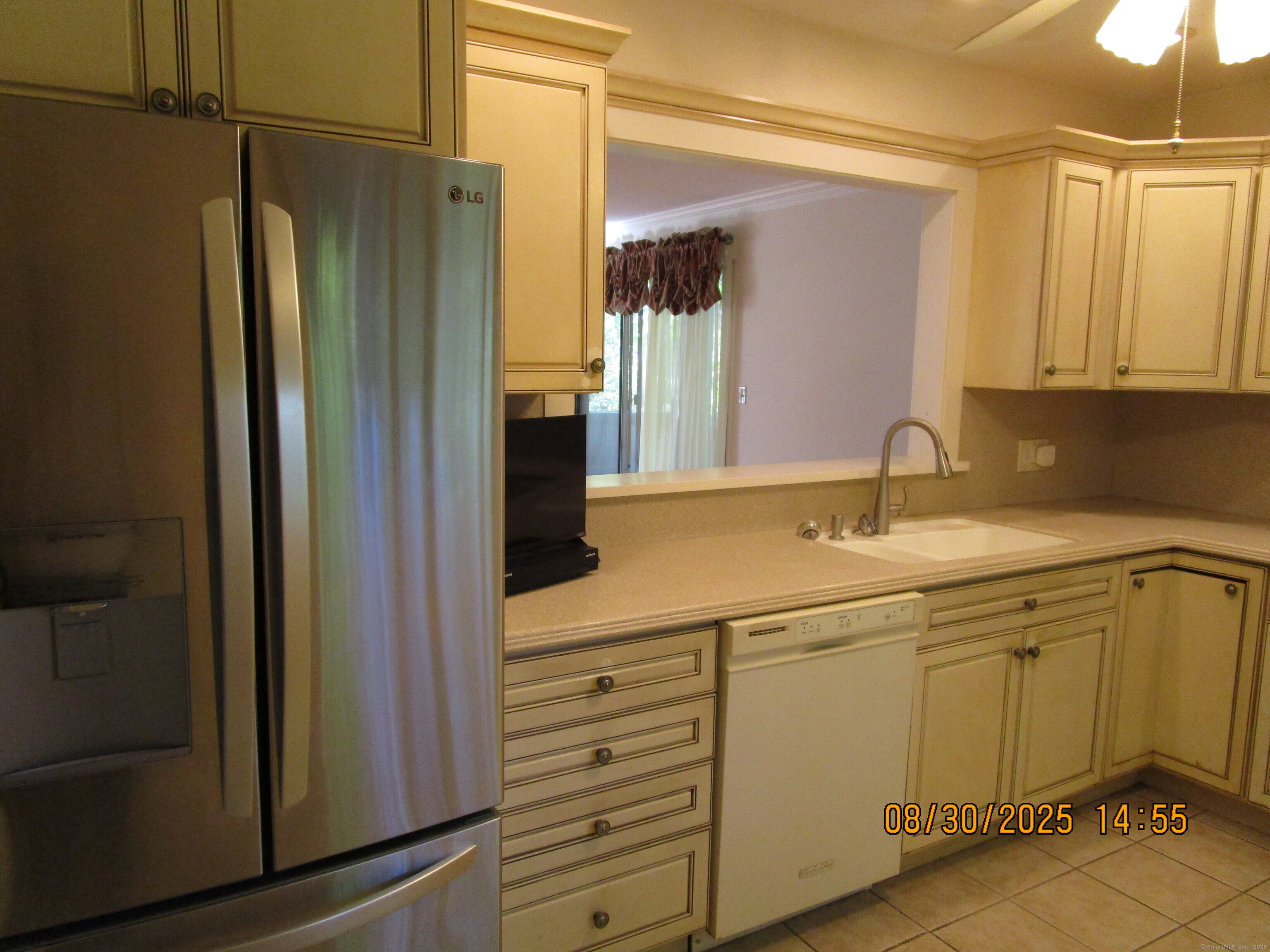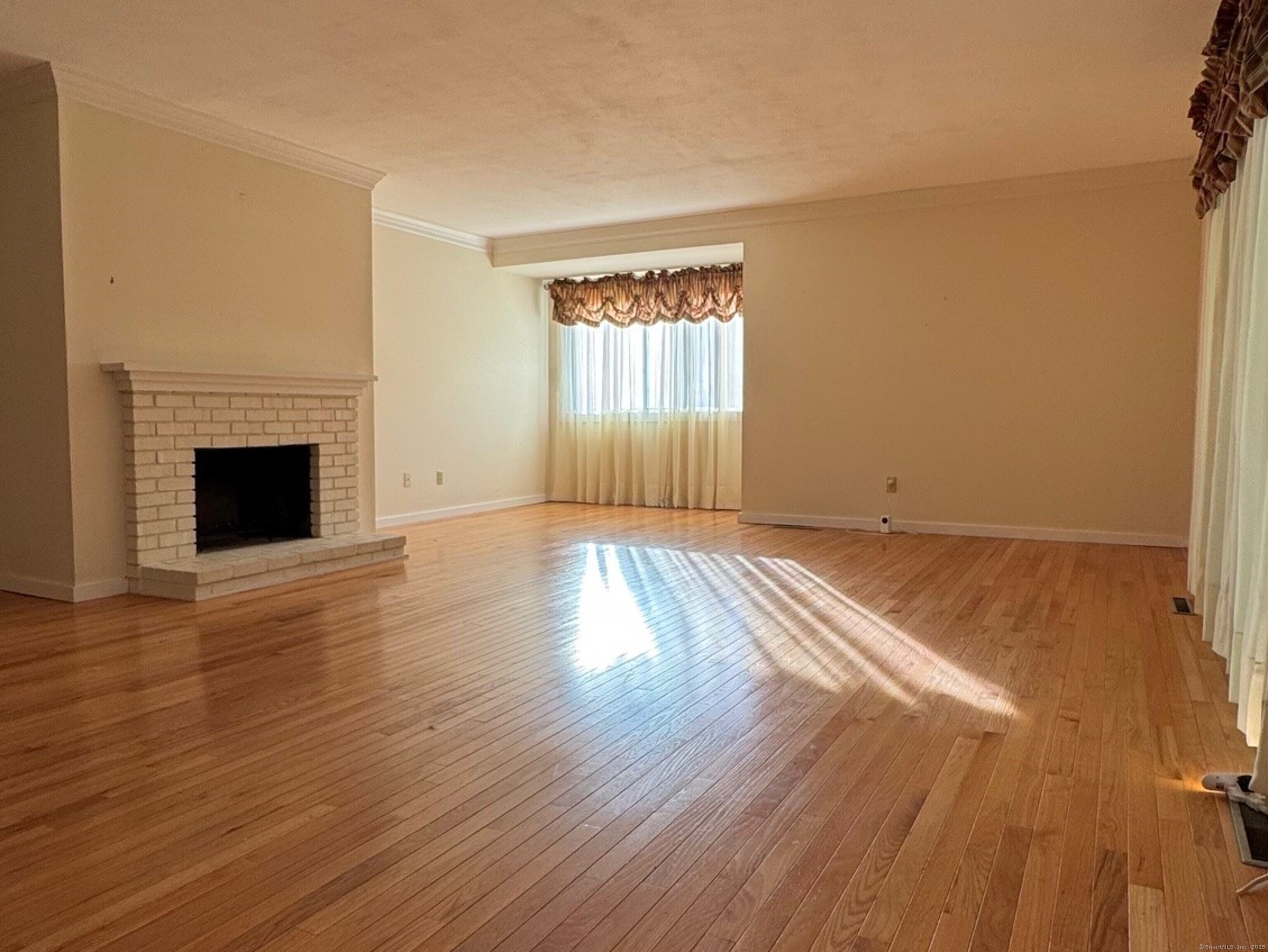 This sought-after Oronoque Village Emerson model is ideally located within walking distance of the clubhouse, pool, and tennis courts. The kitchen features a courtyard view framed by mature trees, an eat-in area with tiled flooring, Corian countertops, a double sink, recessed lighting, ceiling fan, ample cabinetry, and a microwave hood. The dining room and living room showcases gleaming hardwood floors and a convenient pass-through to the kitchen-perfect for buffet-style entertaining. The living room offers hardwood flooring, a fireplace, crown molding, and a sliding door leading to the deck, which enjoys abundant afternoon sunlight. The primary bedroom includes crown molding, a walk-in closet, ceiling fan, and a spacious en-suite bathroom. The lower level features a large family room with tiled flooring and direct access to the garage. An additional bedroom with its own full bath provides excellent accommodations for guests. The washer and dryer are located in the mechanical room.