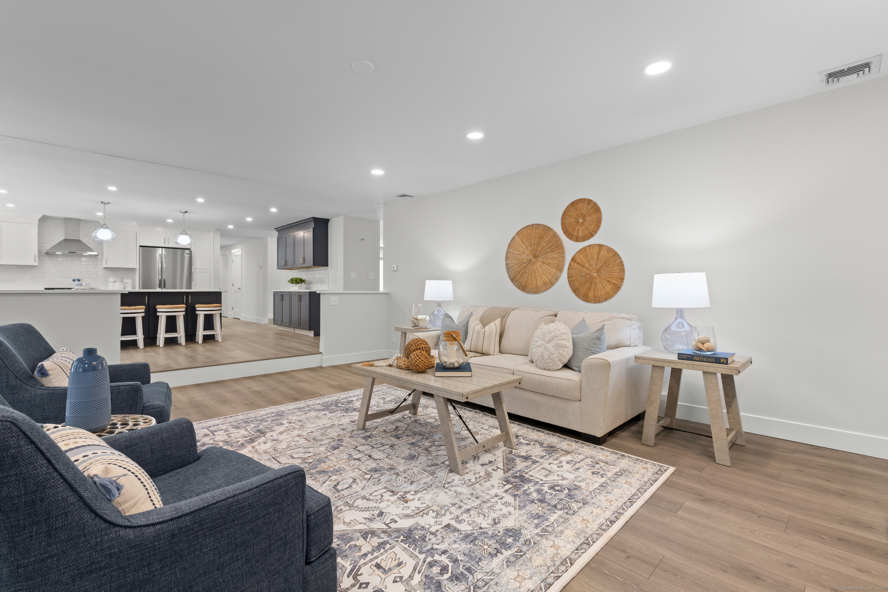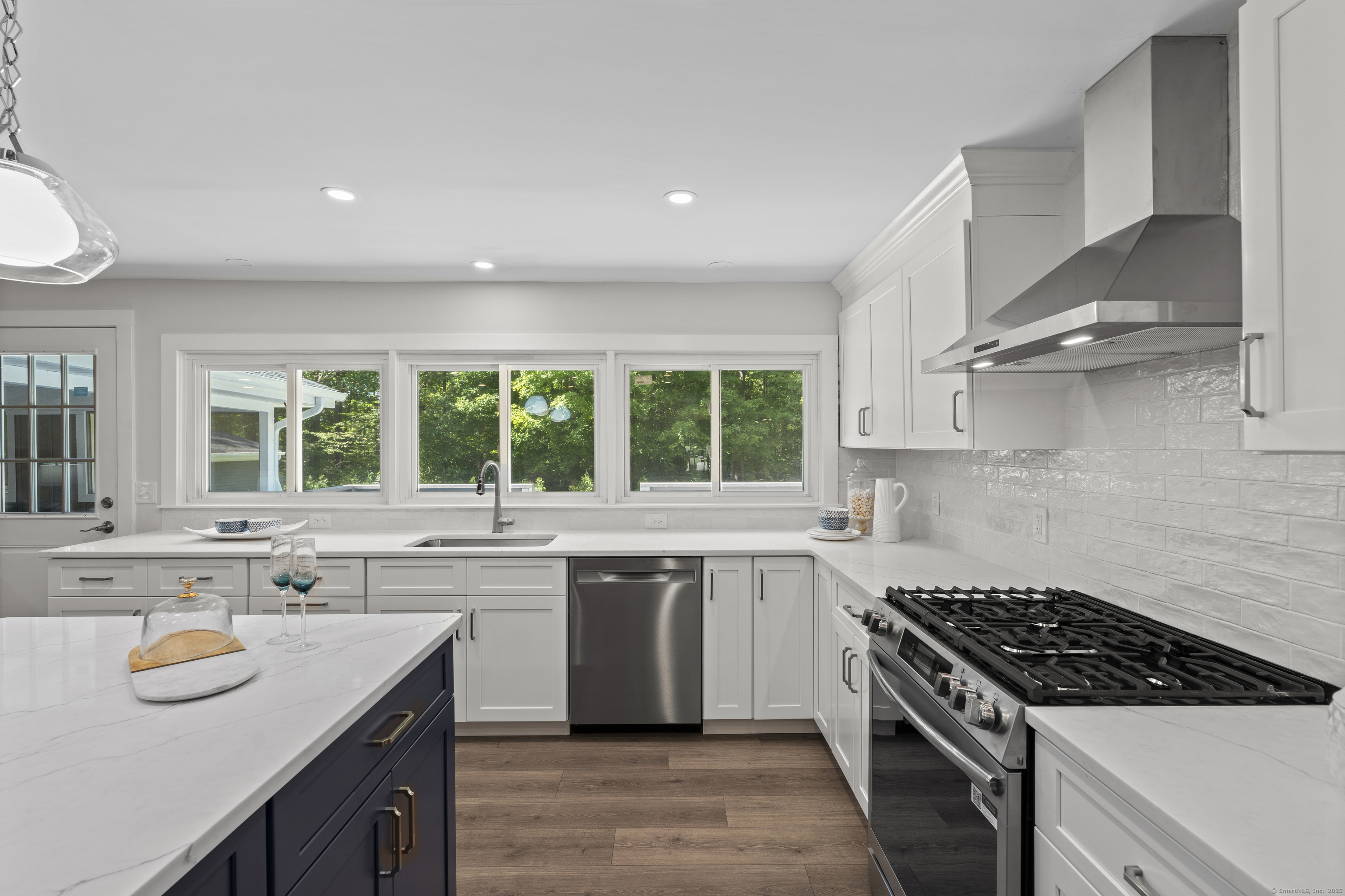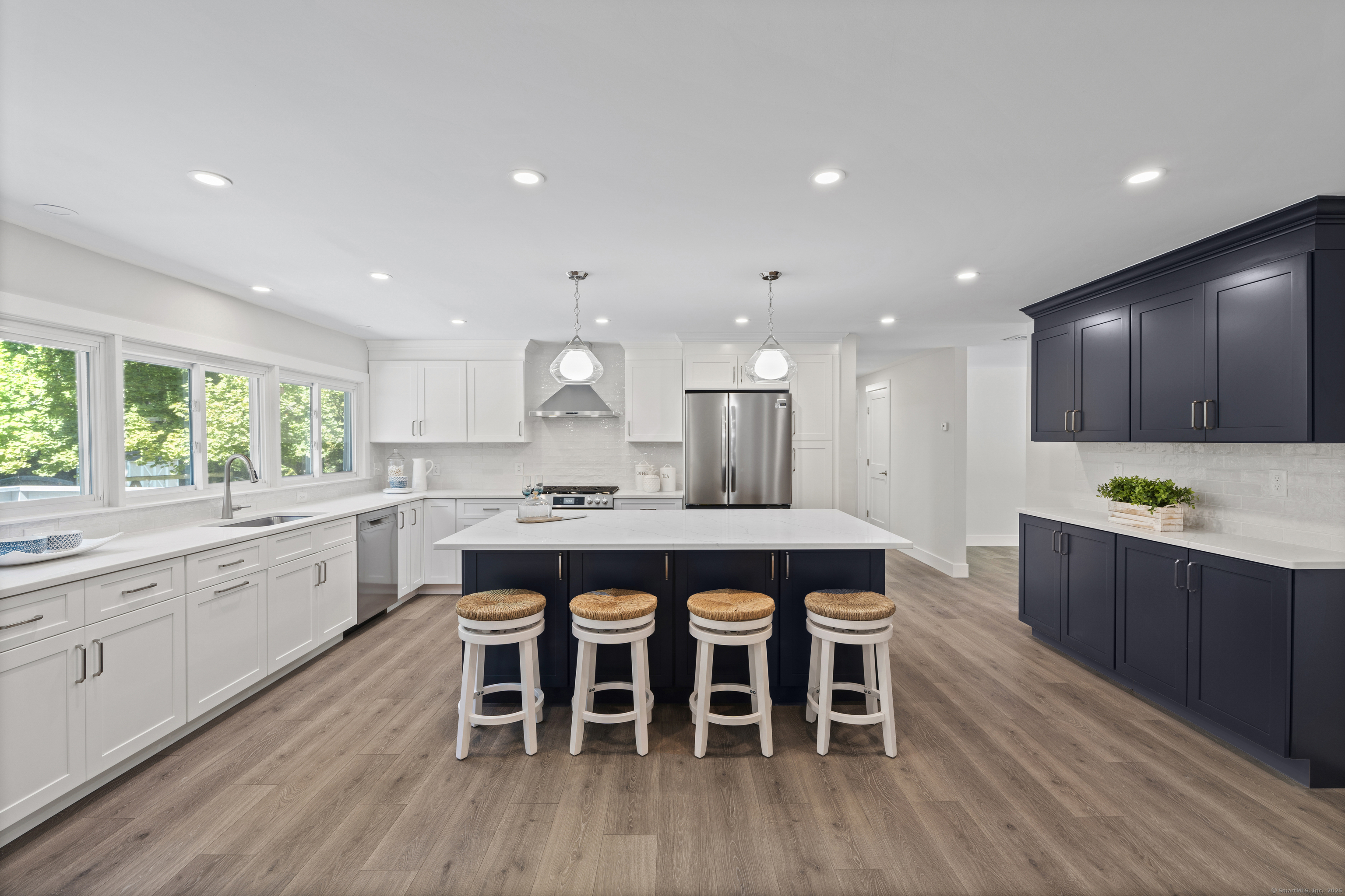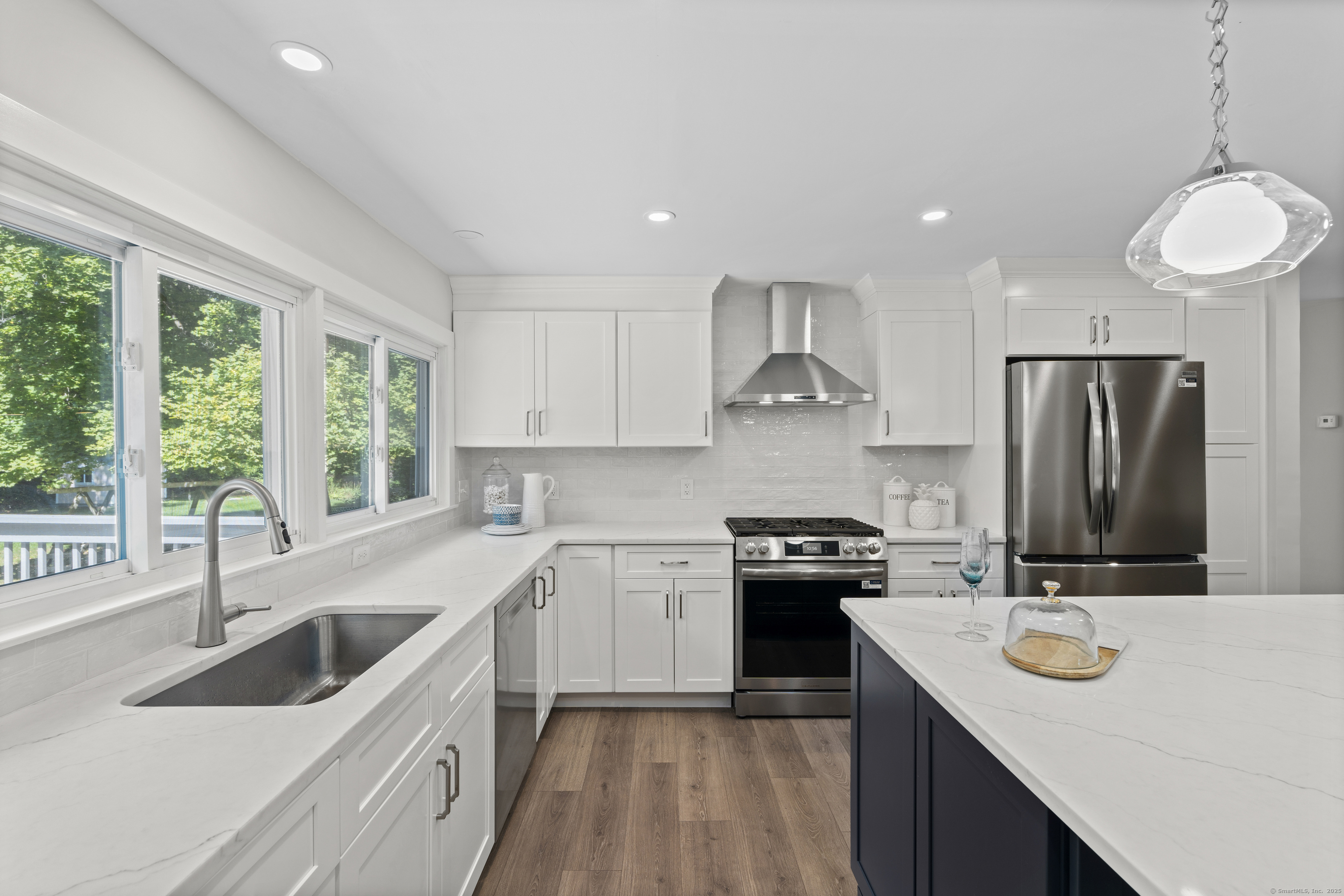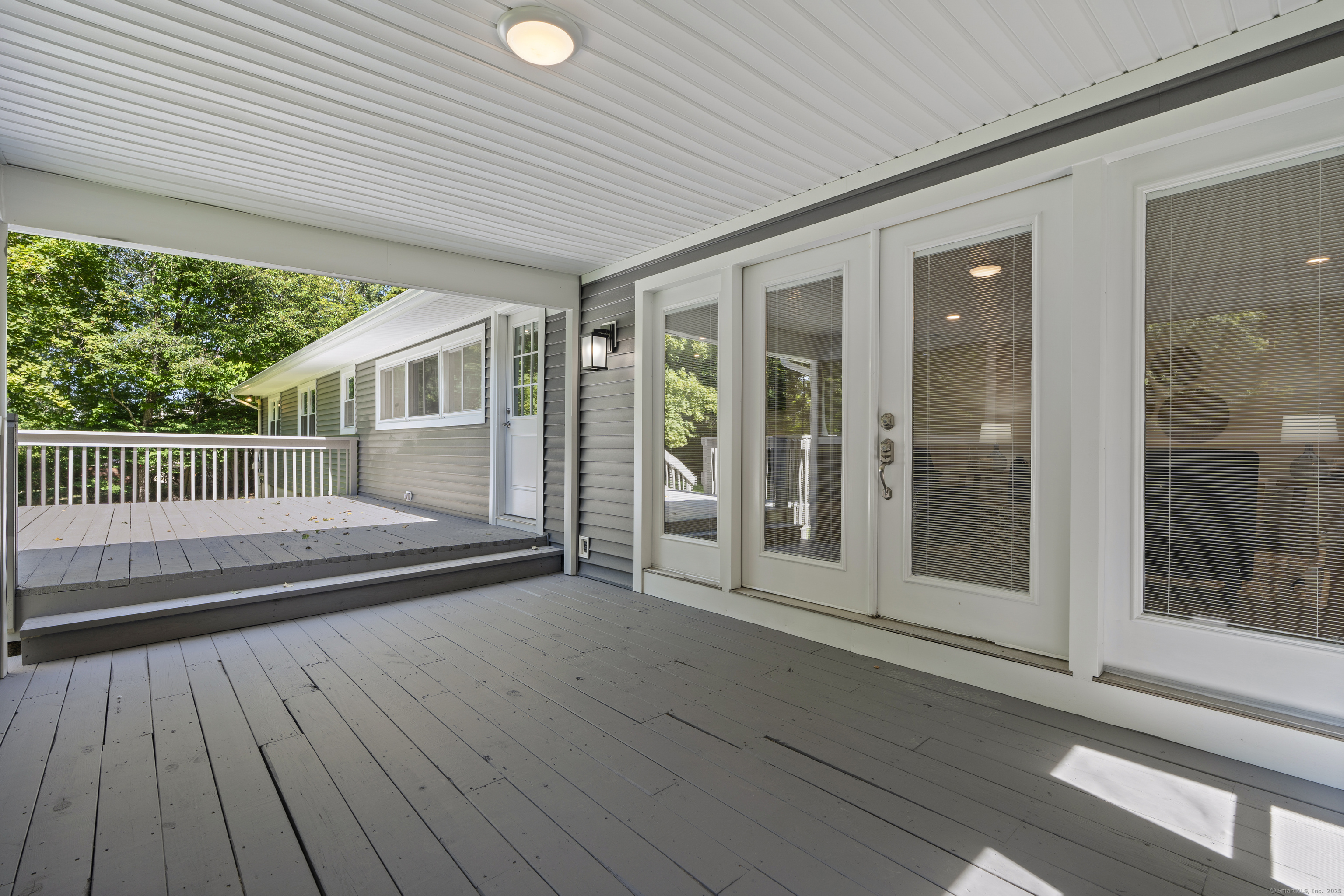 Welcome to 21 Featherbed Lane -a beautifully renovated 5 BR, 4 bath ranch south of route 1 in Branford. Thoughtfully remodeled from top to bottom, this move-in ready home combines modern style with practical comfort. Situated on a generous lot, the home's striking white brick, gray vinyl siding, and wide circular driveway create standout curb appeal. Inside, a spacious foyer leads to a formal living room and dining room, perfect for entertaining. The fully renovated kitchen features an oversized island, brand-new stainless-steel appliances, and a wall of windows that fills the space with natural light. The kitchen is open to the family room with a stone fireplace and French doors leading to covered porch and a large deck overlooking the private backyard. At the opposite end of the home are four large bedrooms, two with ensuite baths. Other updates include new flooring, doors and trim, generous recessed lighting, and fresh paint throughout. A separate apartment with its own bedroom and bath offers flexible living options-perfect for multigenerational living, a live-in caregiver, a home office or studio, or rental income. This apartment can be converted back into an attached garage if desired. Enjoy one-level living with an open layout, low-threshold entry, and a curbless shower-designed for comfort, mobility, and aging in place. City water, sewer, and natural gas offer low-maintenance, efficient, and worry-free living.