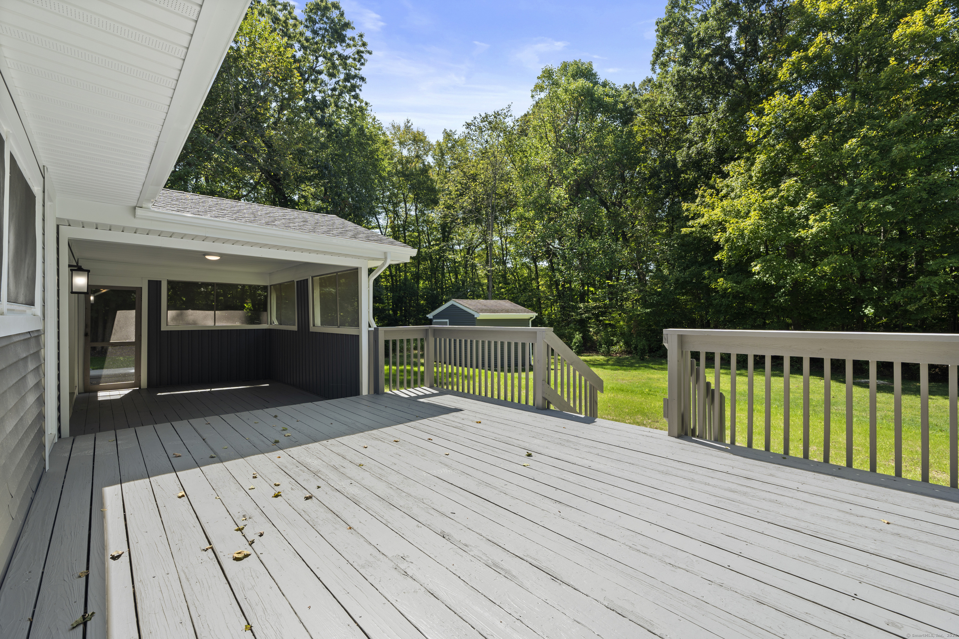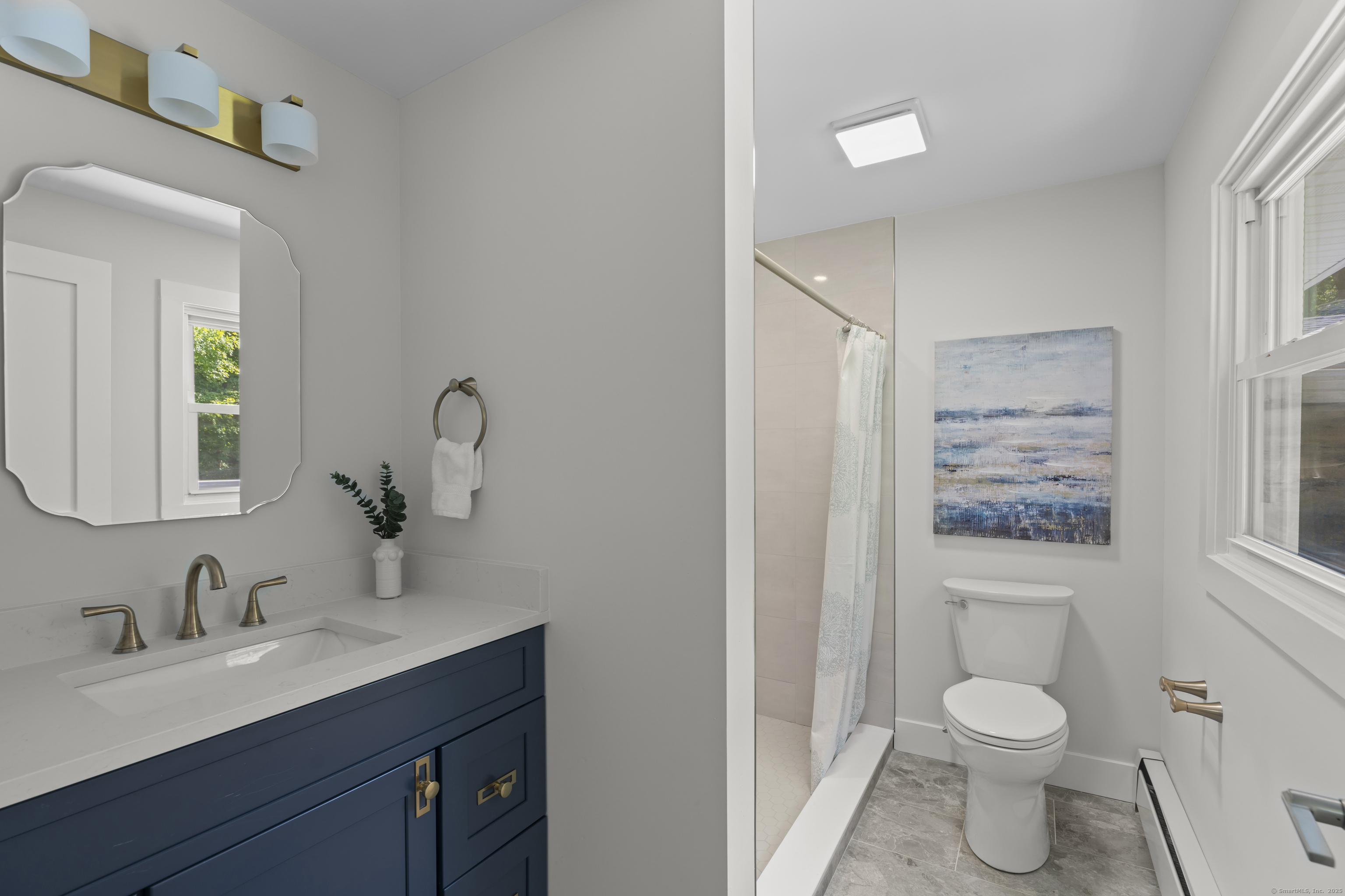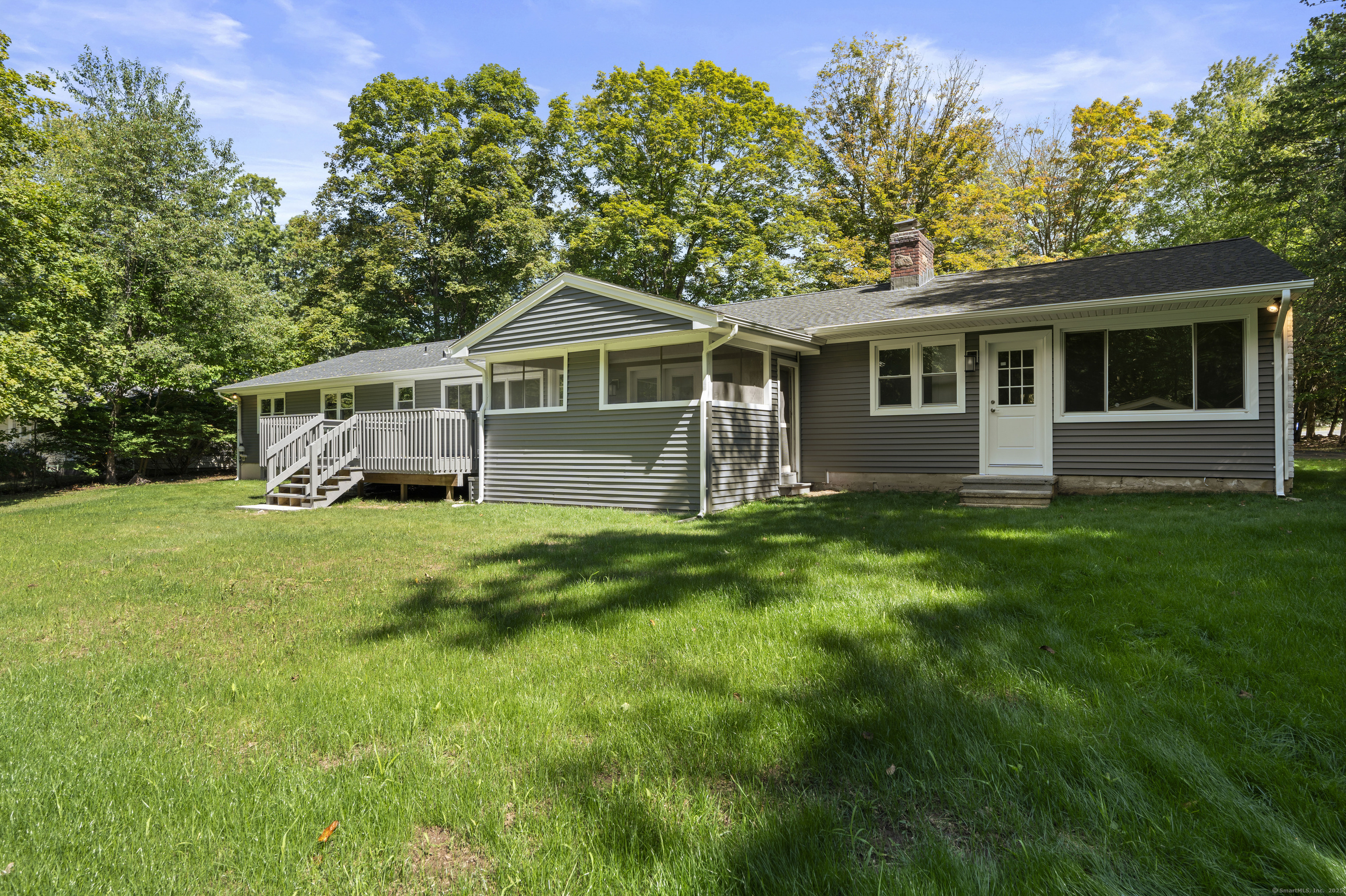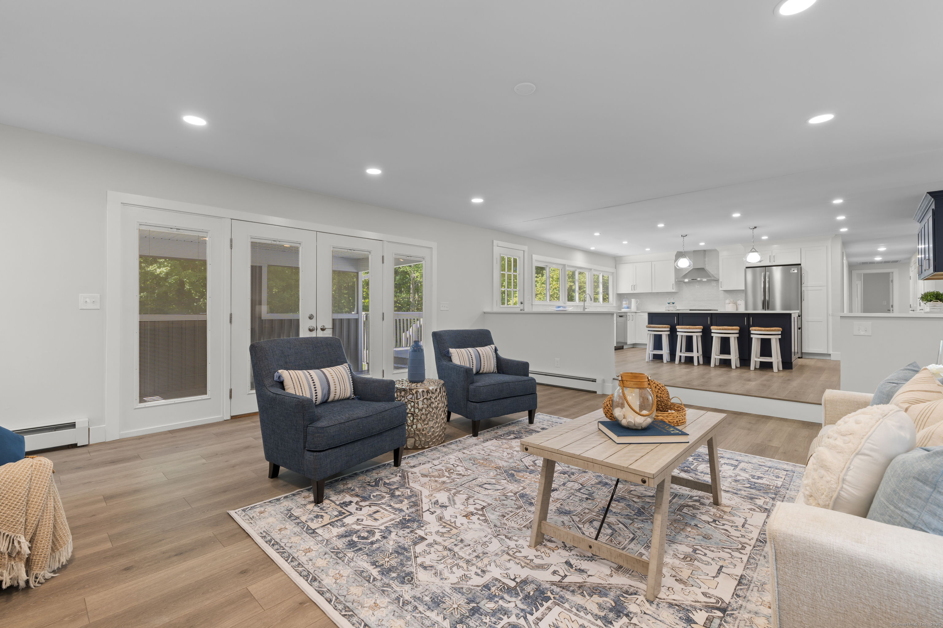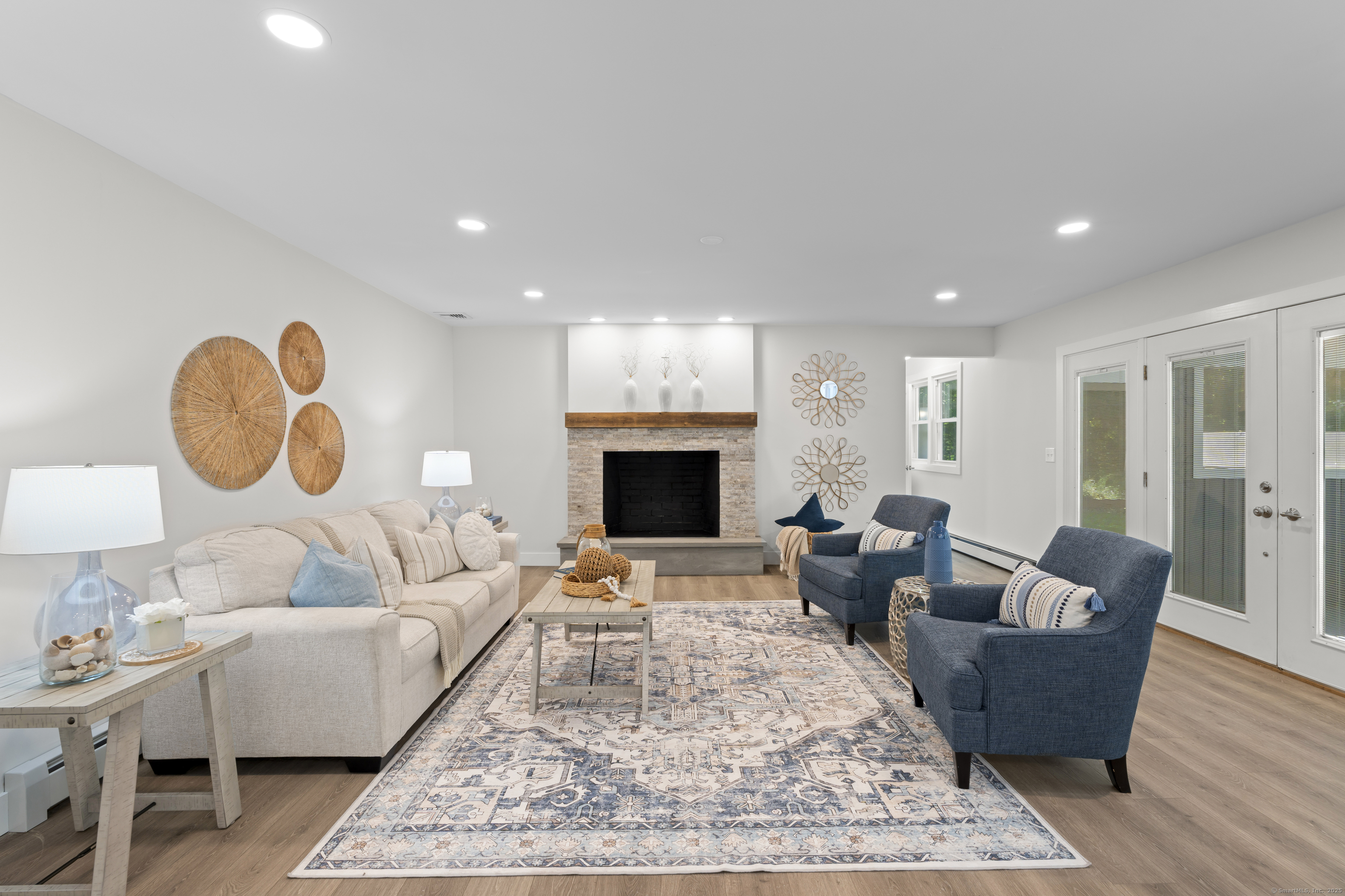 Welcome to 21 Featherbed Lane -a beautifully renovated 5 BR, 4 bath ranch south of route 1 in Branford. Thoughtfully remodeled from top to bottom, this move-in ready home combines modern style with practical comfort. Situated on a generous lot, the home's striking white brick, gray vinyl siding, and wide circular driveway create standout curb appeal. Inside, a spacious foyer leads to a formal living room and dining room, perfect for entertaining. The fully renovated kitchen features an oversized island, brand-new stainless-steel appliances, and a wall of windows that fills the space with natural light. The kitchen is open to the family room with a stone fireplace and French doors leading to covered porch and a large deck overlooking the private backyard. At the opposite end of the home are four large bedrooms, two with ensuite baths. Other updates include new flooring, doors and trim, generous recessed lighting, and fresh paint throughout. A separate apartment with its own bedroom and bath offers flexible living options-perfect for multigenerational living, a live-in caregiver, a home office or studio, or rental income. This apartment can be converted back into an attached garage if desired. Enjoy one-level living with an open layout, low-threshold entry, and a curbless shower-designed for comfort, mobility, and aging in place. City water, sewer, and natural gas offer low-maintenance, efficient, and worry-free living.
