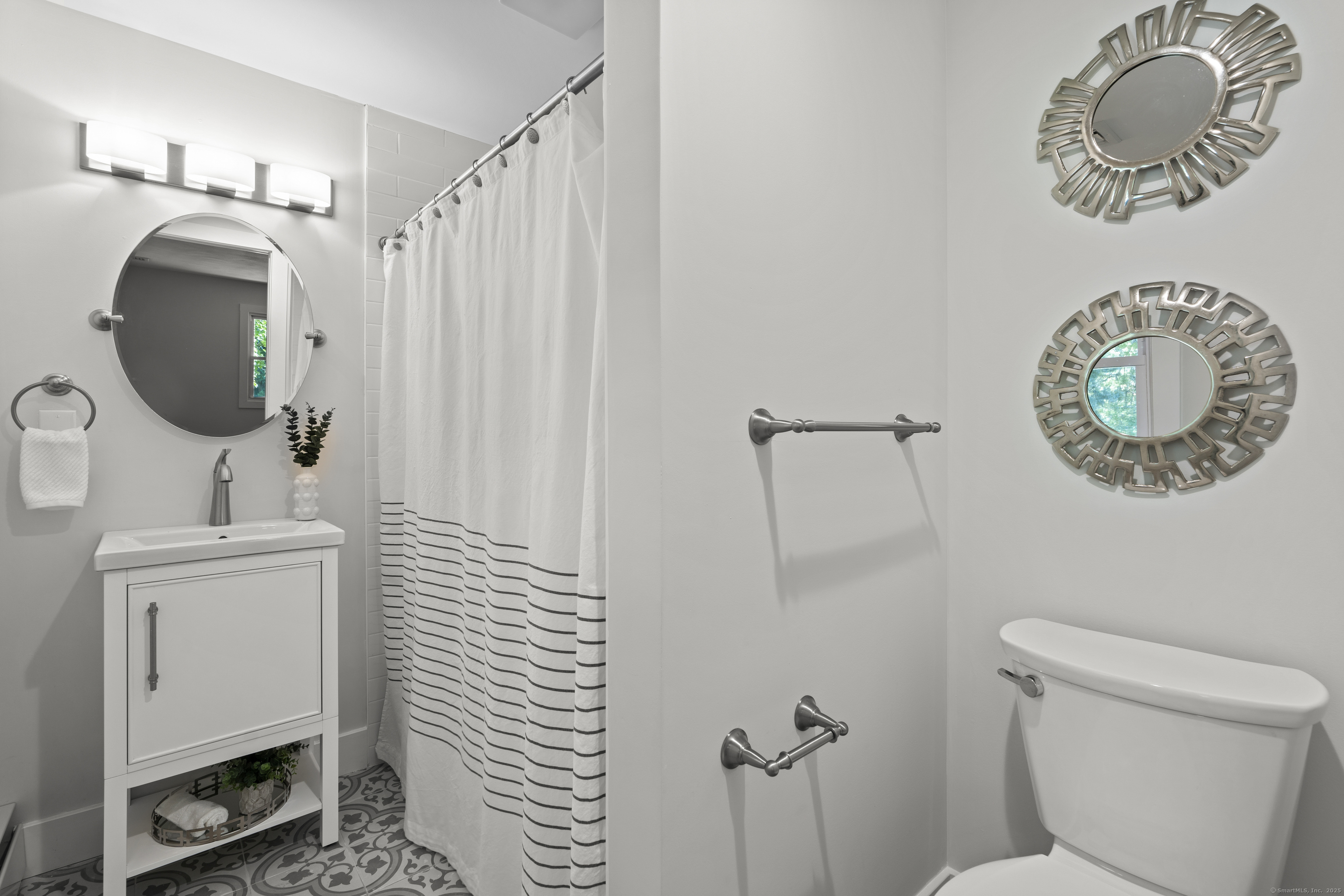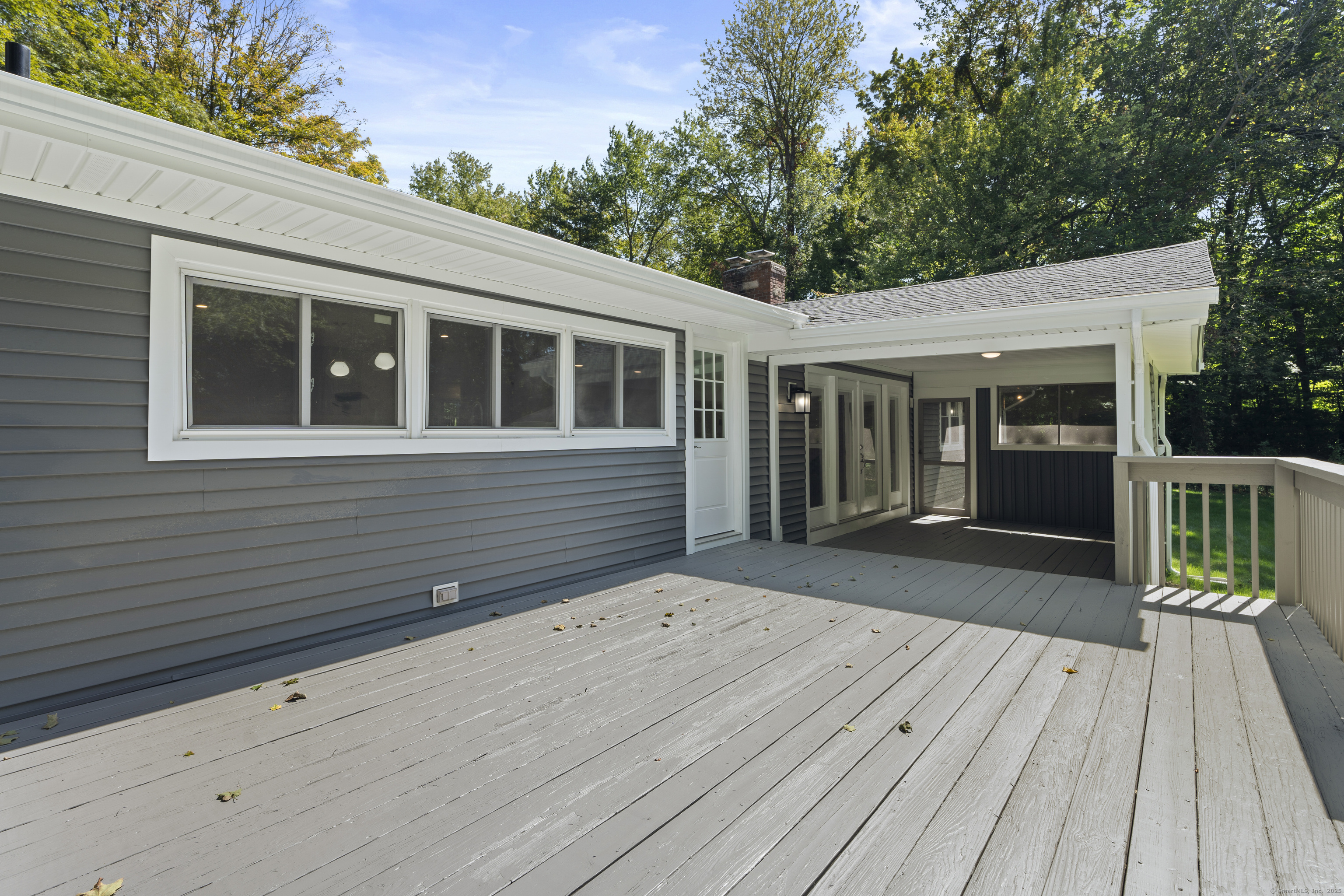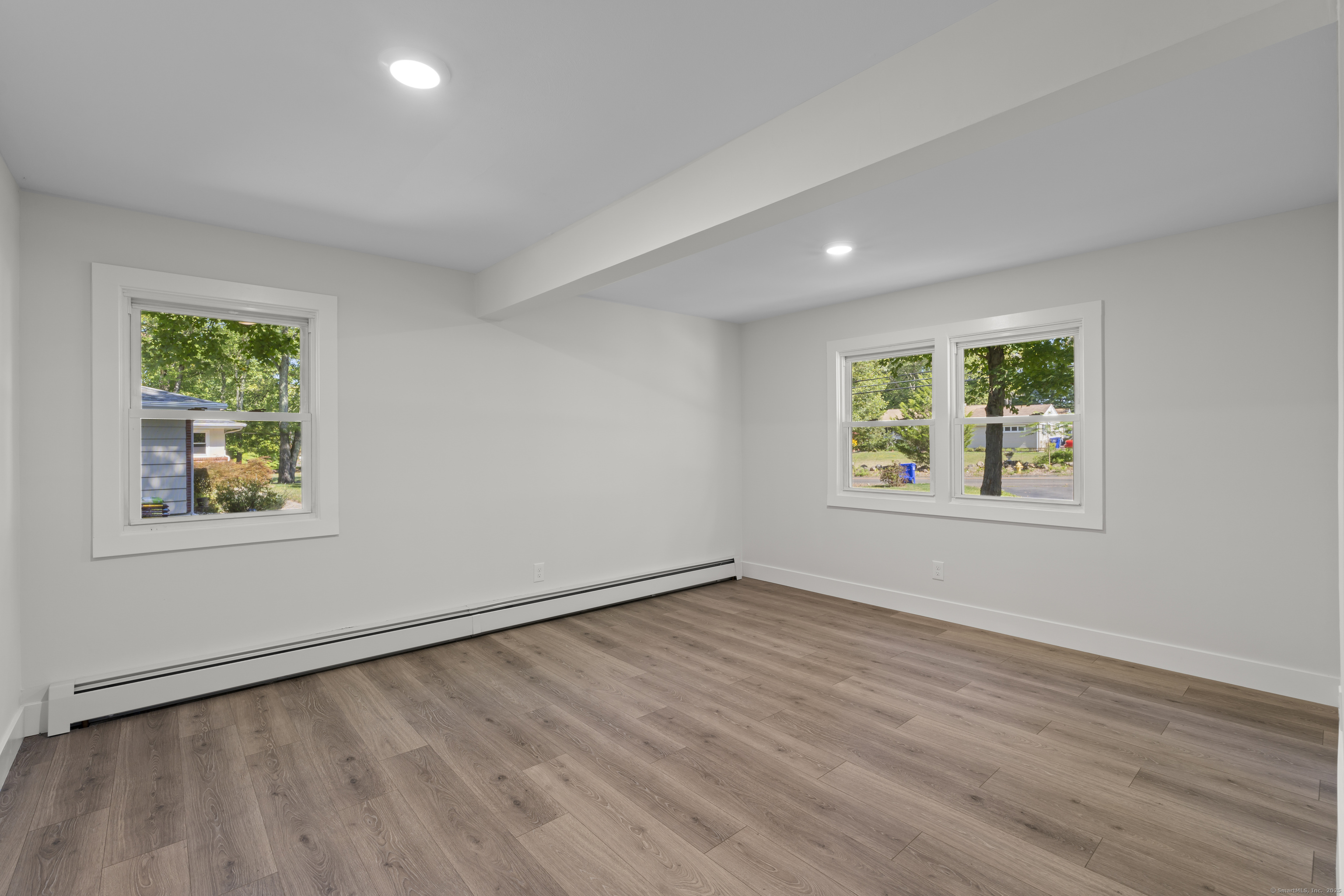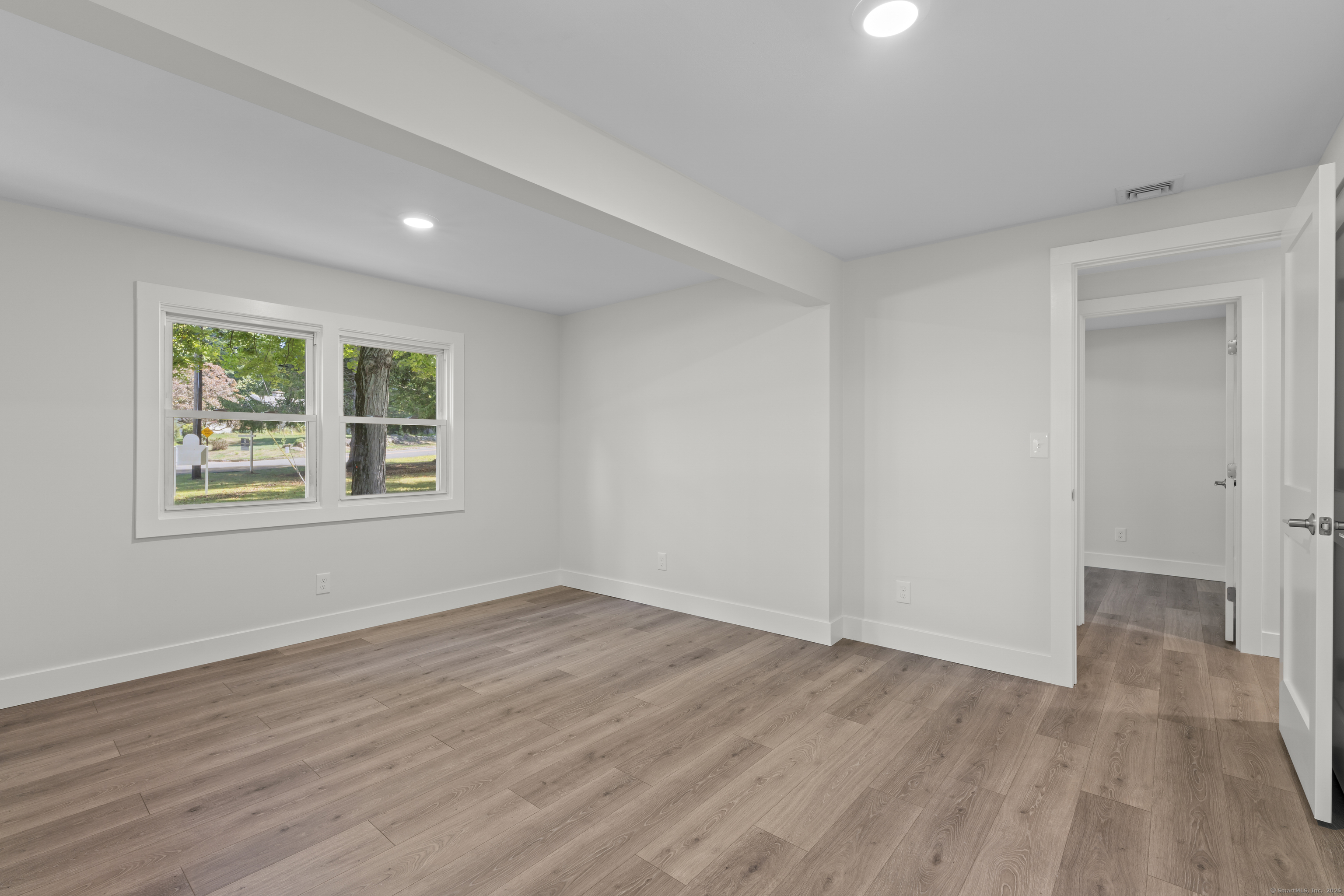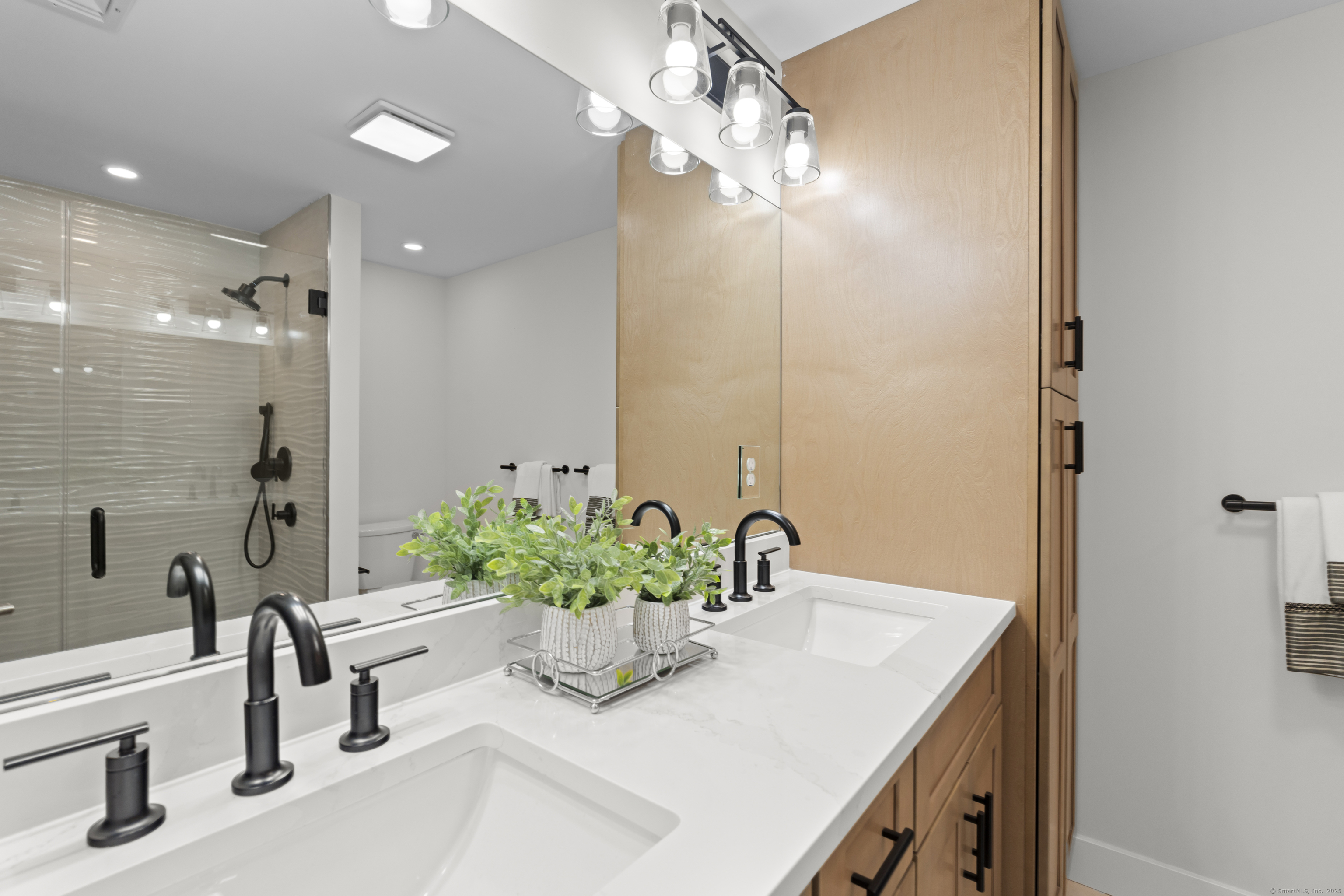 Welcome to 21 Featherbed Lane -a beautifully renovated 5 BR, 4 bath ranch south of route 1 in Branford. Thoughtfully remodeled from top to bottom, this move-in ready home combines modern style with practical comfort. Situated on a generous lot, the home's striking white brick, gray vinyl siding, and wide circular driveway create standout curb appeal. Inside, a spacious foyer leads to a formal living room and dining room, perfect for entertaining. The fully renovated kitchen features an oversized island, brand-new stainless-steel appliances, and a wall of windows that fills the space with natural light. The kitchen is open to the family room with a stone fireplace and French doors leading to covered porch and a large deck overlooking the private backyard. At the opposite end of the home are four large bedrooms, two with ensuite baths. Other updates include new flooring, doors and trim, generous recessed lighting, and fresh paint throughout. A separate apartment with its own bedroom and bath offers flexible living options-perfect for multigenerational living, a live-in caregiver, a home office or studio, or rental income. This apartment can be converted back into an attached garage if desired. Enjoy one-level living with an open layout, low-threshold entry, and a curbless shower-designed for comfort, mobility, and aging in place. City water, sewer, and natural gas offer low-maintenance, efficient, and worry-free living.