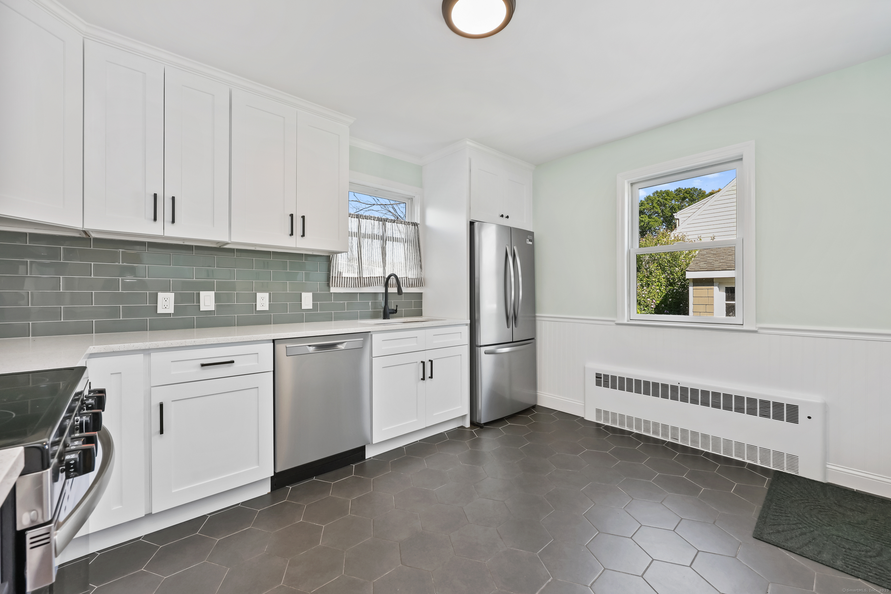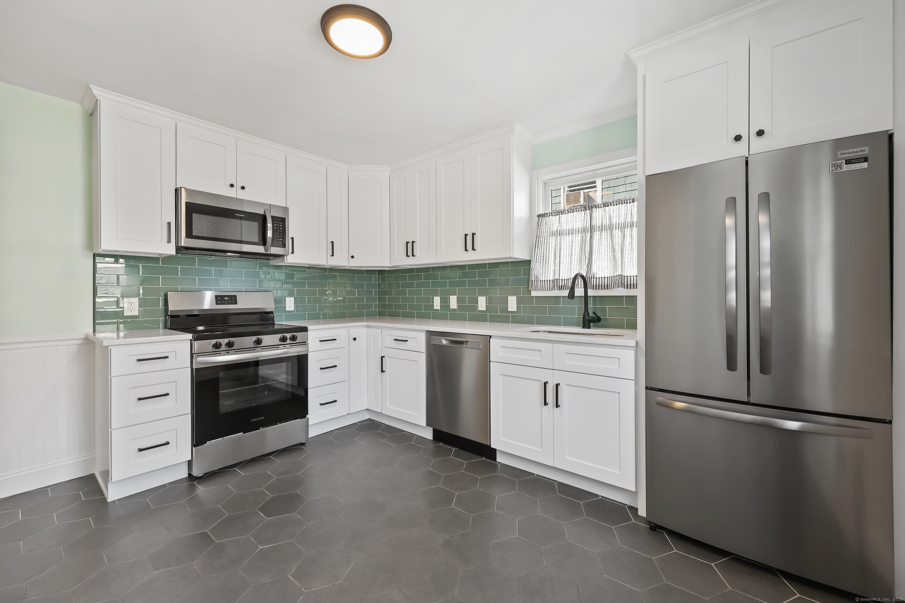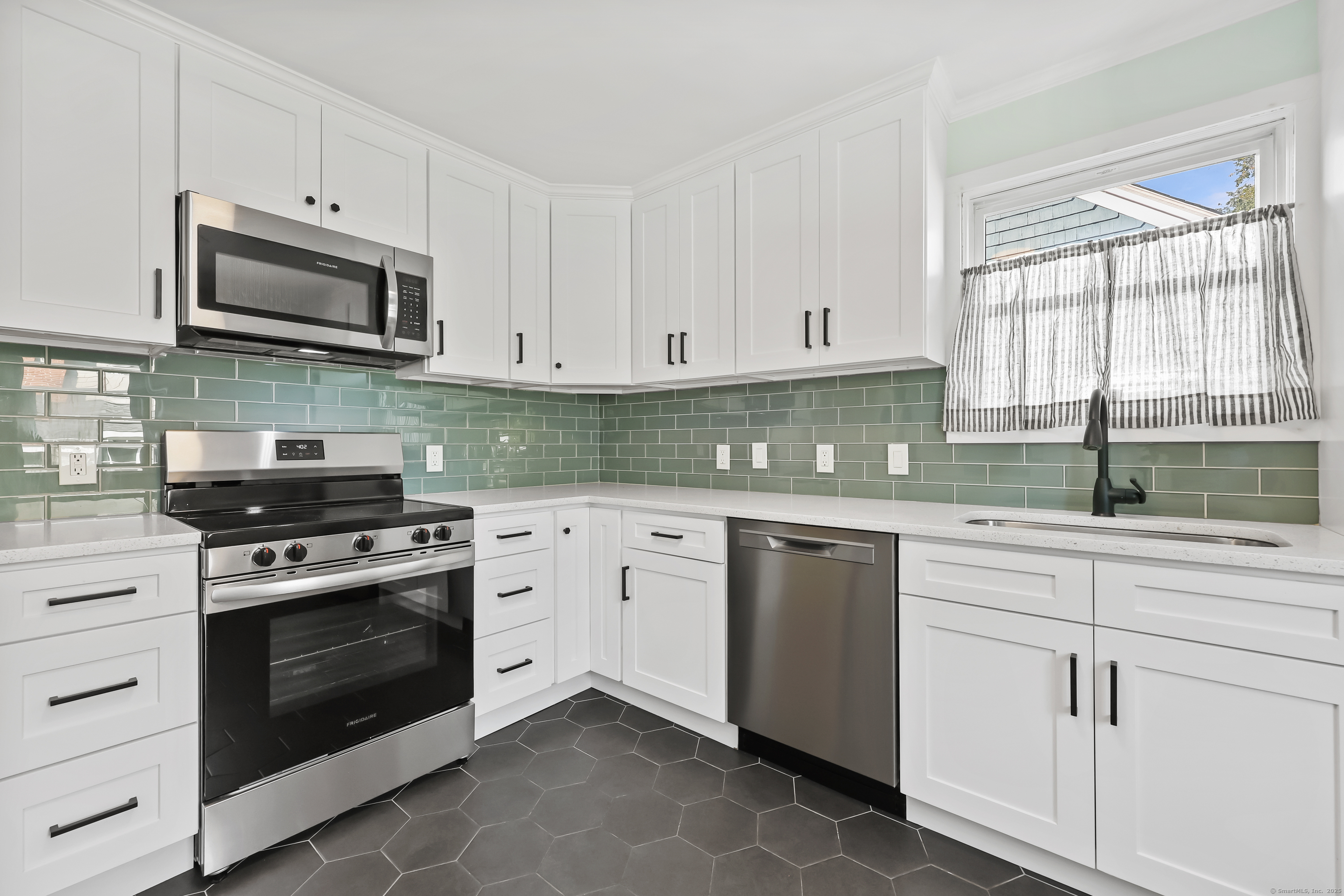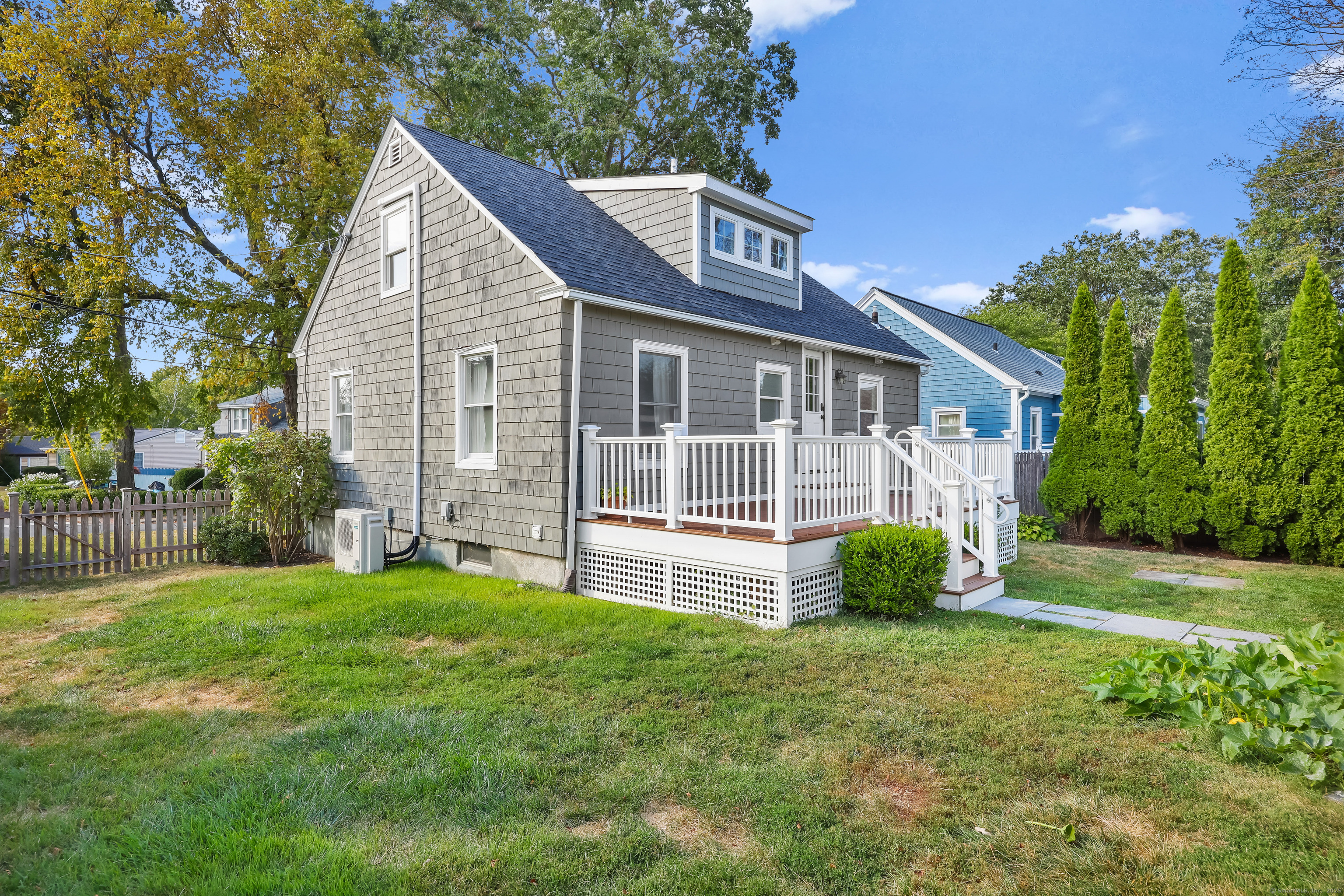 Welcome to this adorable 4 bedroom Cape Cod home in the heart of Norwalk. The living room features decorative ceiling molding, hardwood floors and wood burning brick fireplace! Kitchen was completely renovated in 2024 with quartz counters, glass tile backsplash, NEW stainless steel appliances and storage galore. Featuring 2 bedrooms and full bath on the main level (one bedroom could be used as a dining room) Upper level has 2 large bedrooms and a full bath. The finished lower level is a great place to relax and watch TV or play games. Wall to wall carpet and built-in shelving offers storage for book, games, videos and more. An actual laundry room features tons of storage cabinets and shelving. Large, unfinished storage area offers ample space for all your seasonal belongings and has direct access to backyard via bilco door. Large composite deck (new in 2022) over looks the large fenced in backyard with access to the garage and parking. New roof 2022 and new mini split systems installed in 2025. Immaculately maintained and ready for a new owner!