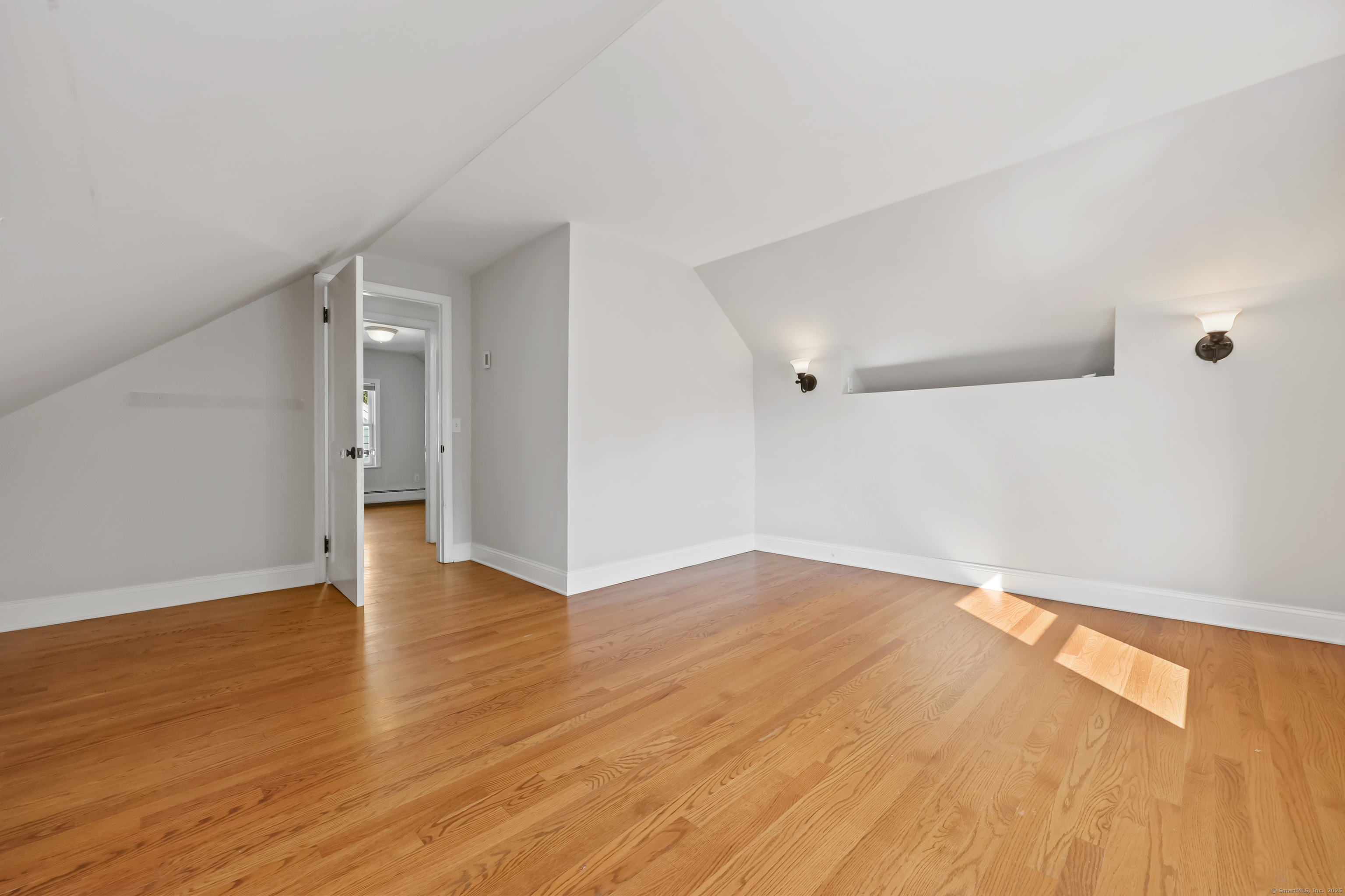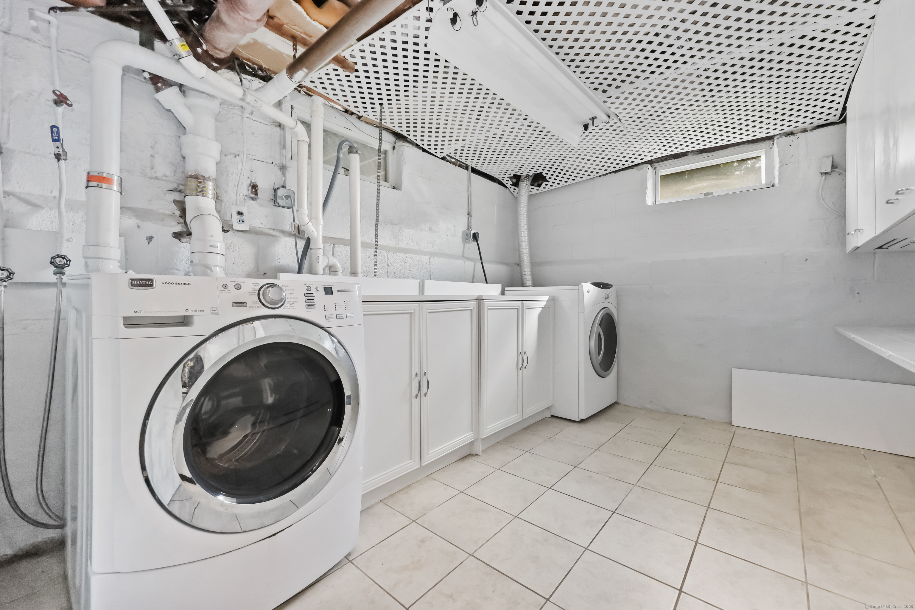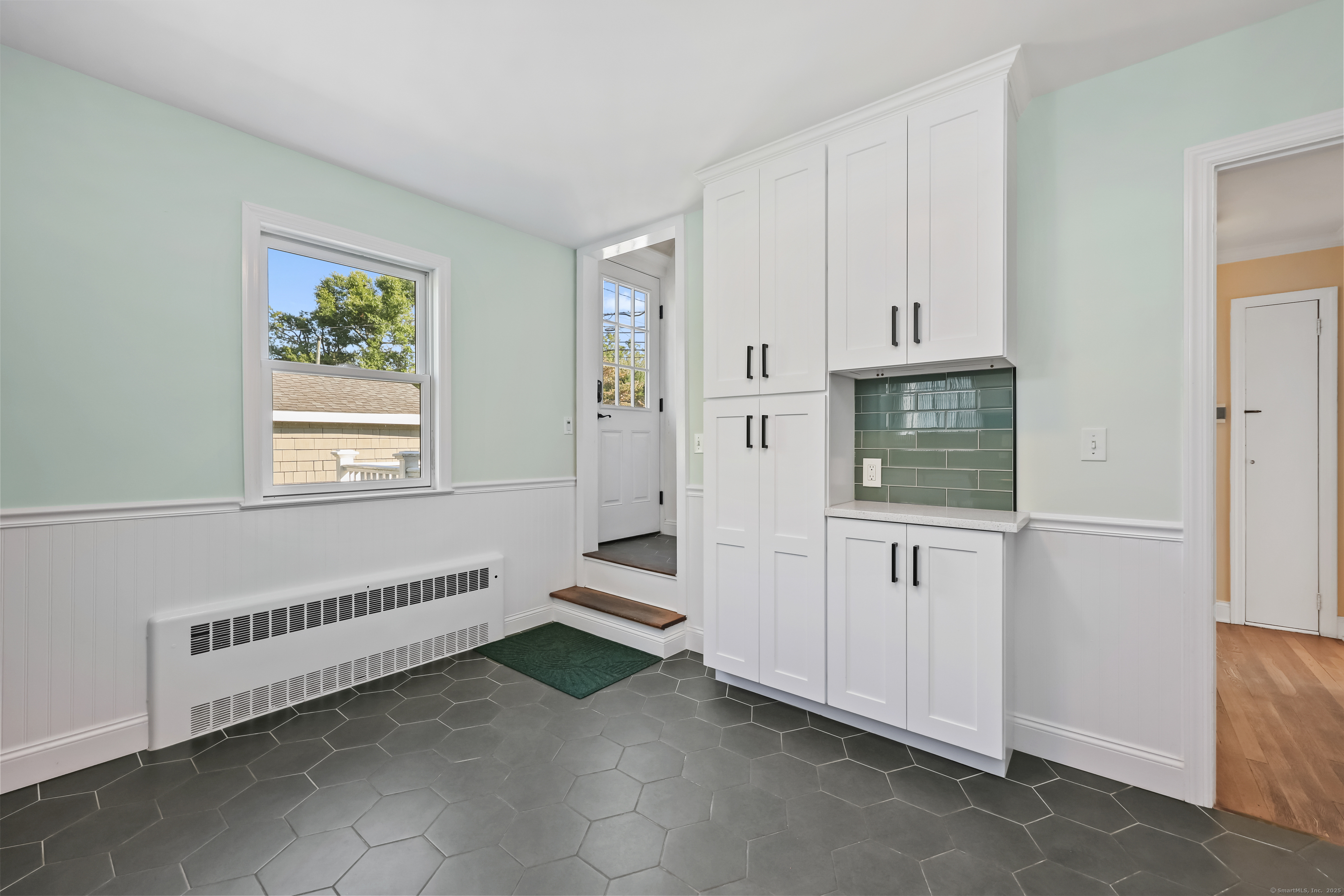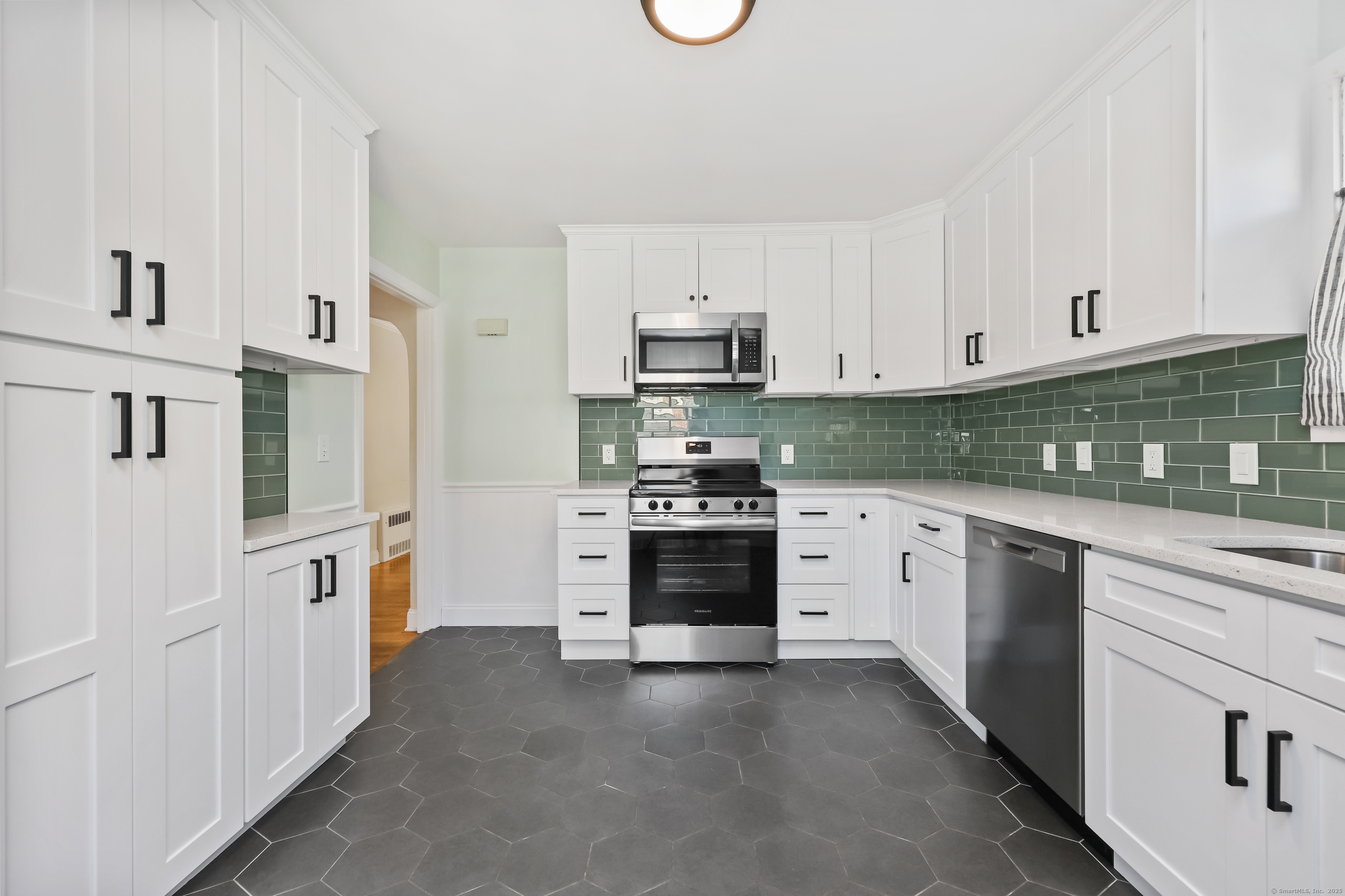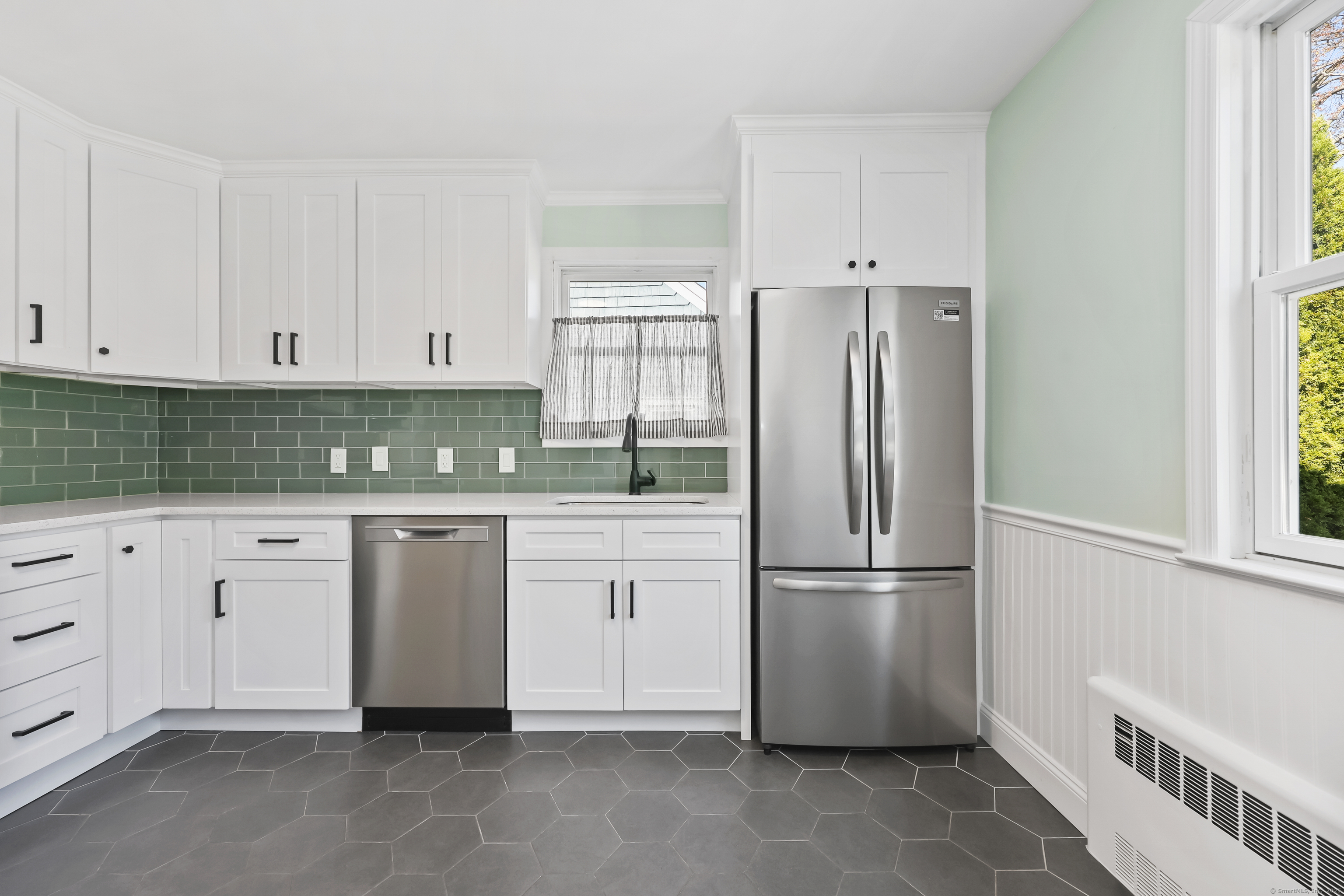 Welcome to this adorable 4 bedroom Cape Cod home in the heart of Norwalk. The living room features decorative ceiling molding, hardwood floors and wood burning brick fireplace! Kitchen was completely renovated in 2024 with quartz counters, glass tile backsplash, NEW stainless steel appliances and storage galore. Featuring 2 bedrooms and full bath on the main level (one bedroom could be used as a dining room) Upper level has 2 large bedrooms and a full bath. The finished lower level is a great place to relax and watch TV or play games. Wall to wall carpet and built-in shelving offers storage for book, games, videos and more. An actual laundry room features tons of storage cabinets and shelving. Large, unfinished storage area offers ample space for all your seasonal belongings and has direct access to backyard via bilco door. Large composite deck (new in 2022) over looks the large fenced in backyard with access to the garage and parking. New roof 2022 and new mini split systems installed in 2025. Immaculately maintained and ready for a new owner!