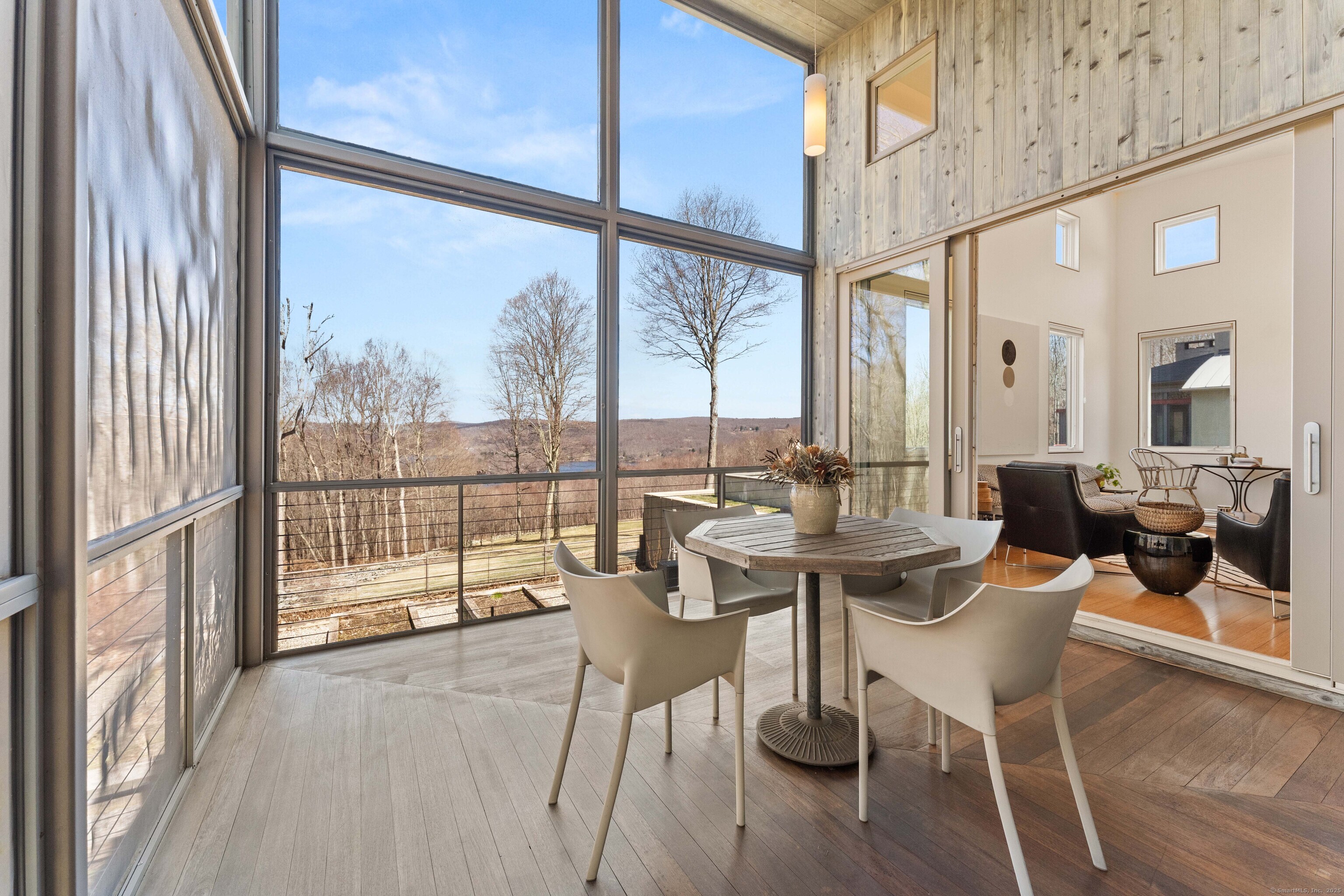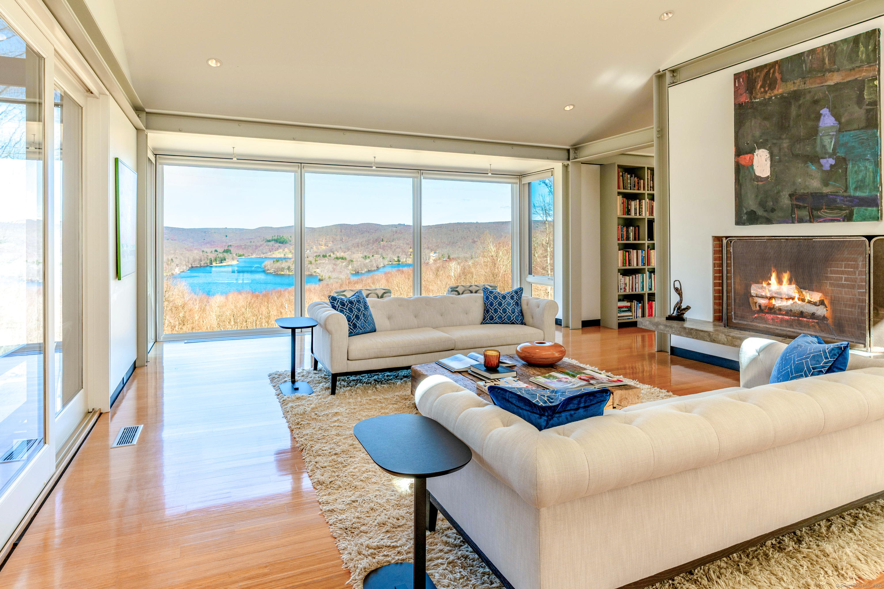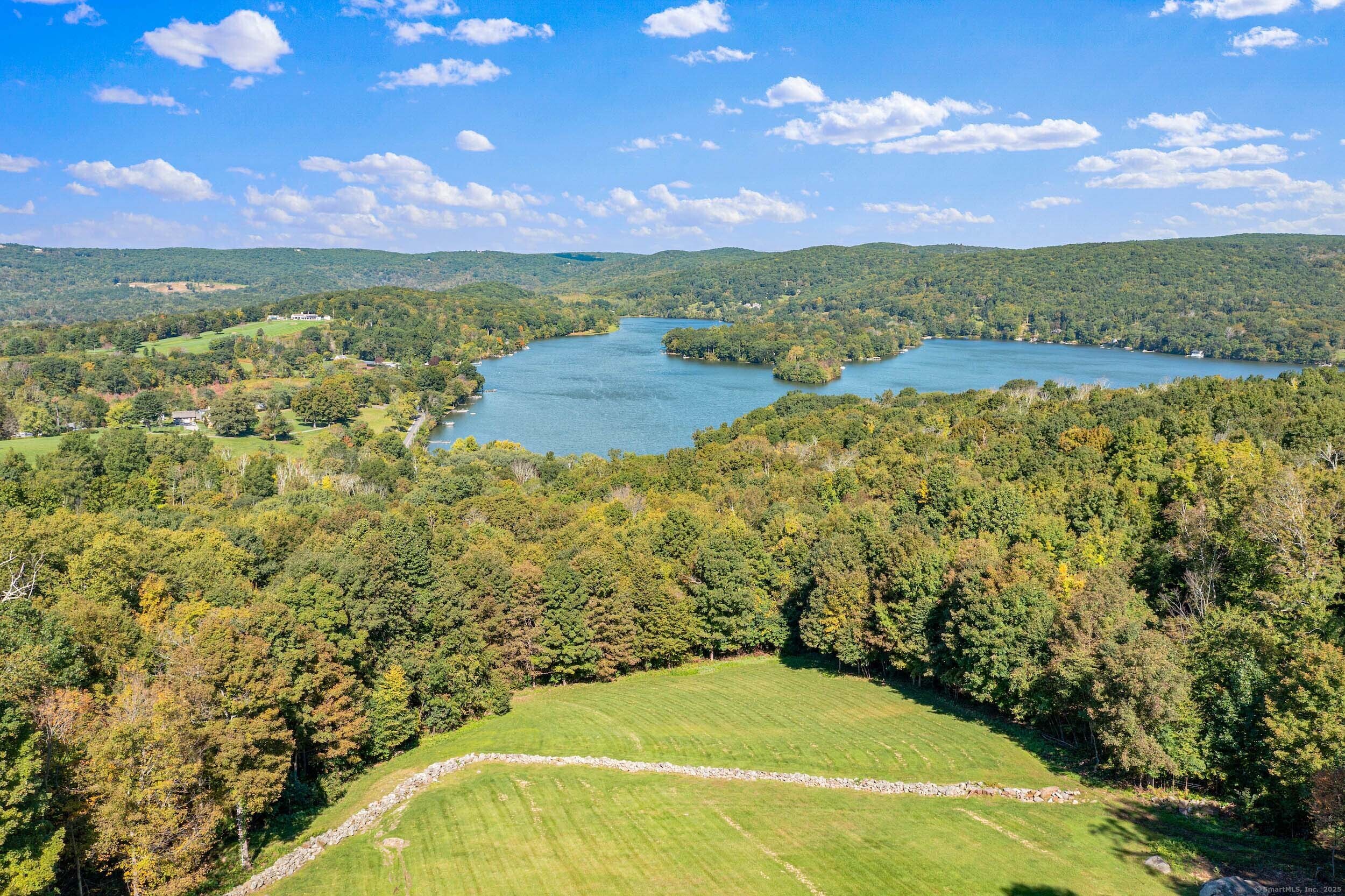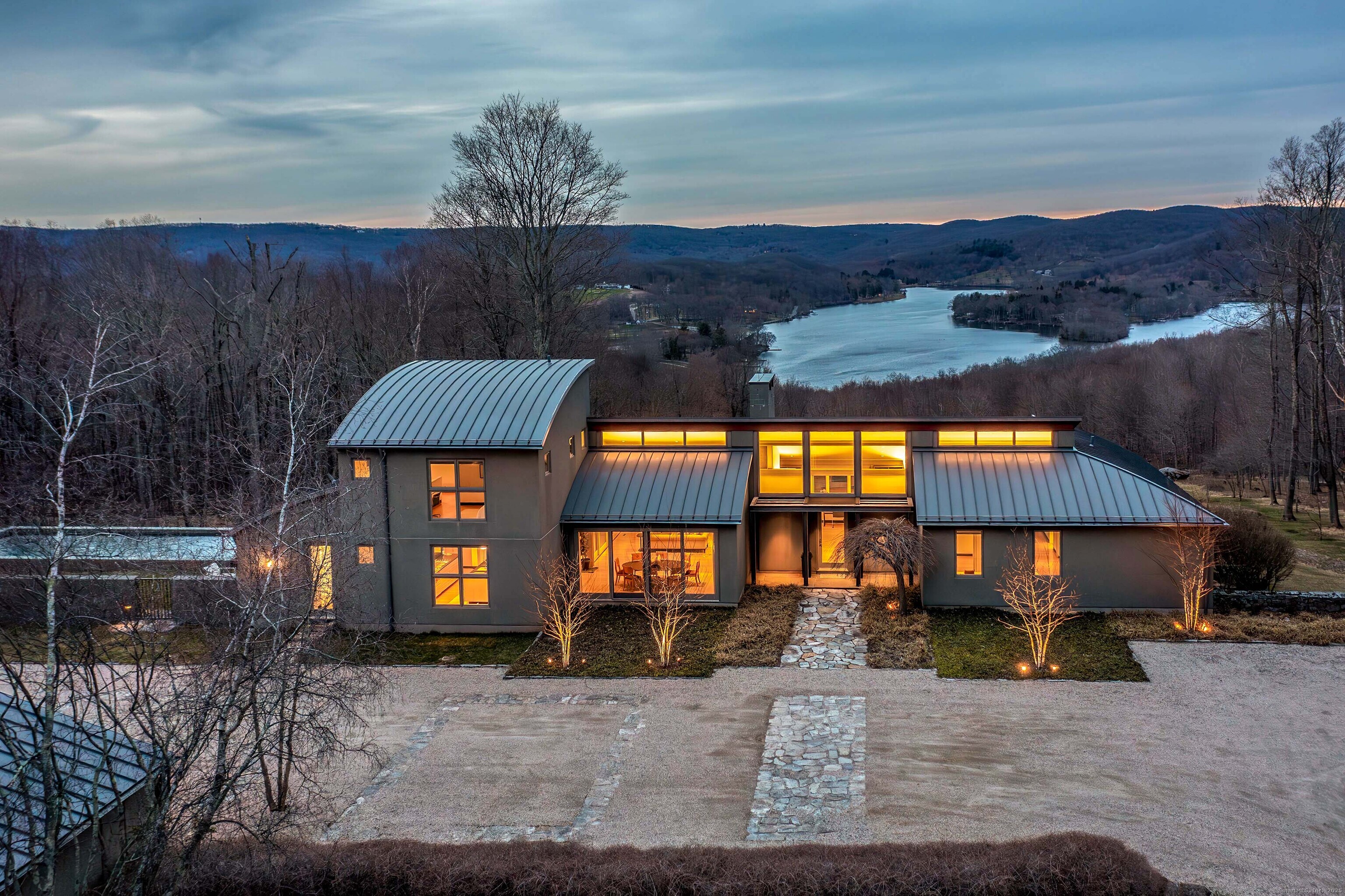 The Crown Jewel of Lake Waramaug, AKA 263 West Shore Rd. Set on 69 acres with direct lakefront, this stylish and sophisticated modern home is one of the largest estates on Lake Waramaug, offering a rare combination of waterfront access, privacy, and uninterrupted views. Unlike most lakefront properties, this estate provides both a move-in-ready modern retreat and exceptional expansion opportunities, featuring a separate West Shore Road address with over 250 feet of shoreline on the lake's quietest stretch. The waterfront includes a beach with large teak dock, dedicated picnic area, and ample guest parking. The 4,125 sqft modern home built in 2002 features concrete, stucco, and expansive glass construction. The interior showcases vaulted ceilings reaching 23 feet, bamboo flooring, and open-plan living spaces with continuous lake vistas through wall-to-wall windows. The gourmet kitchen boasts honed soapstone counters, Sub-Zero refrigeration, Thermador, and Miele appliances, and butler's pantry with pool/patio access. Living room features a wood-burning fireplace and access to screened porch. The private primary suite wing offers lake views, a walk-in closet with built-ins, en-suite bath with dual vanities, glass-enclosed shower, air-jet tub, and 2 private water closets. Adjacent is a separate office/nursery.