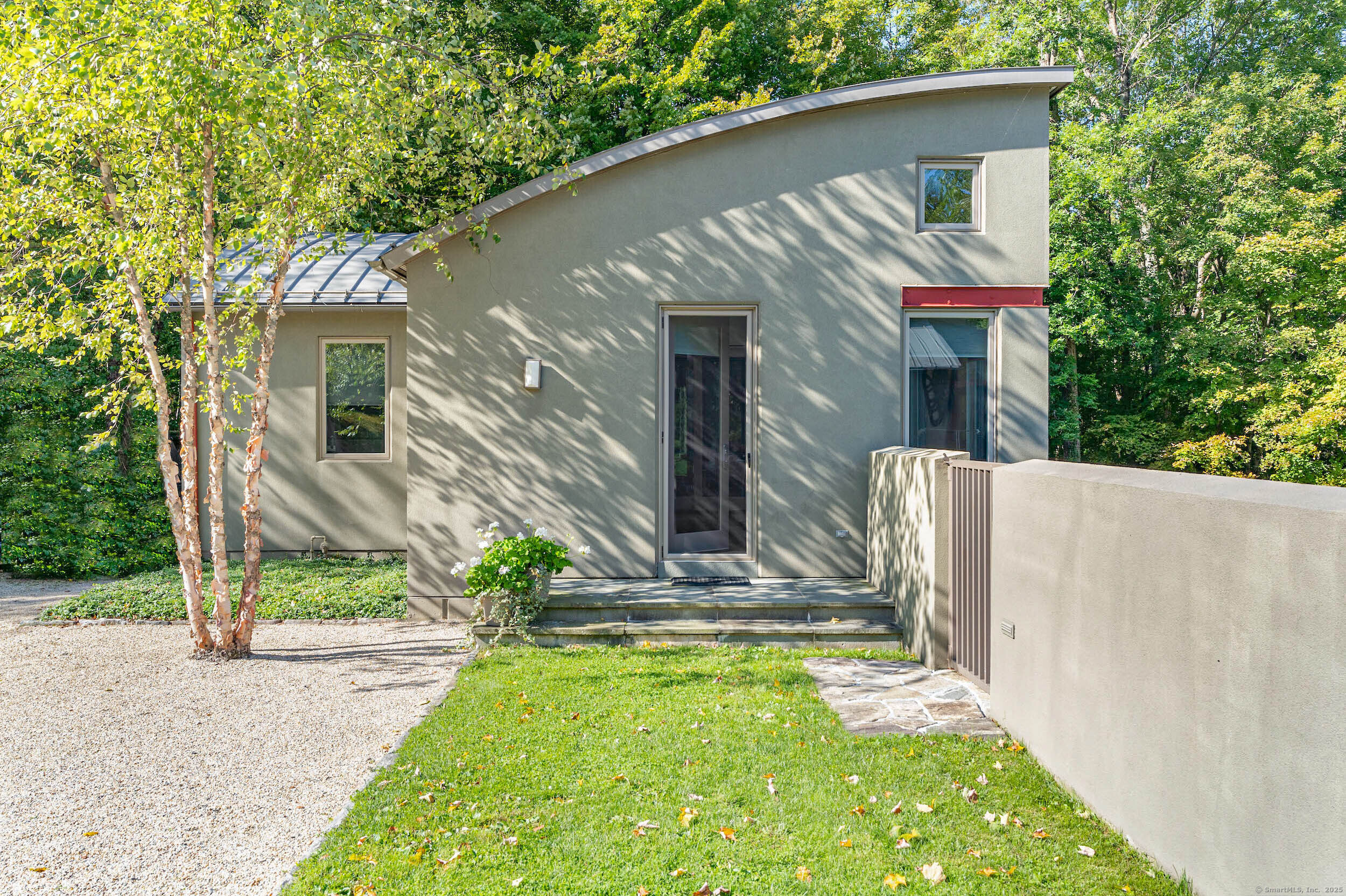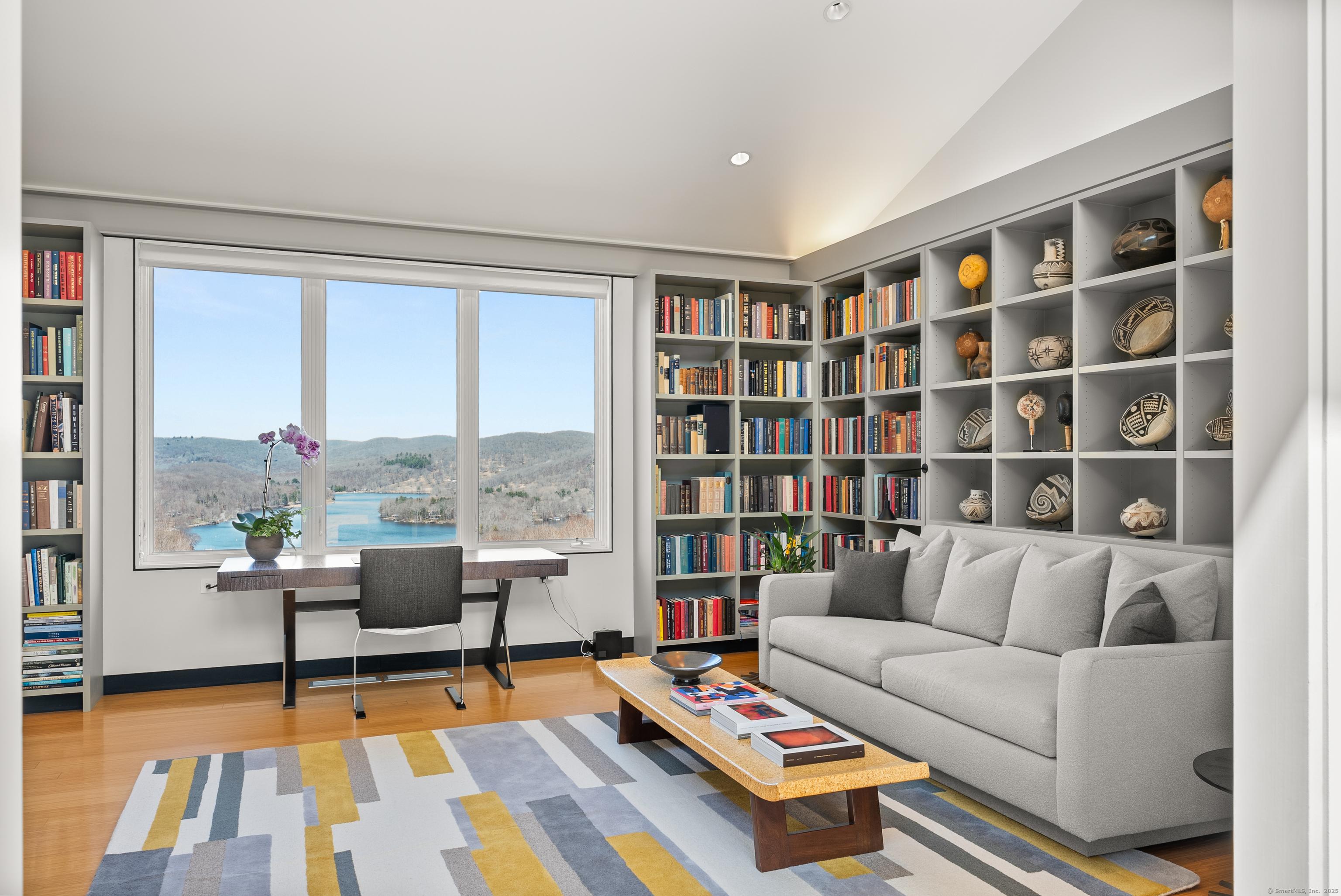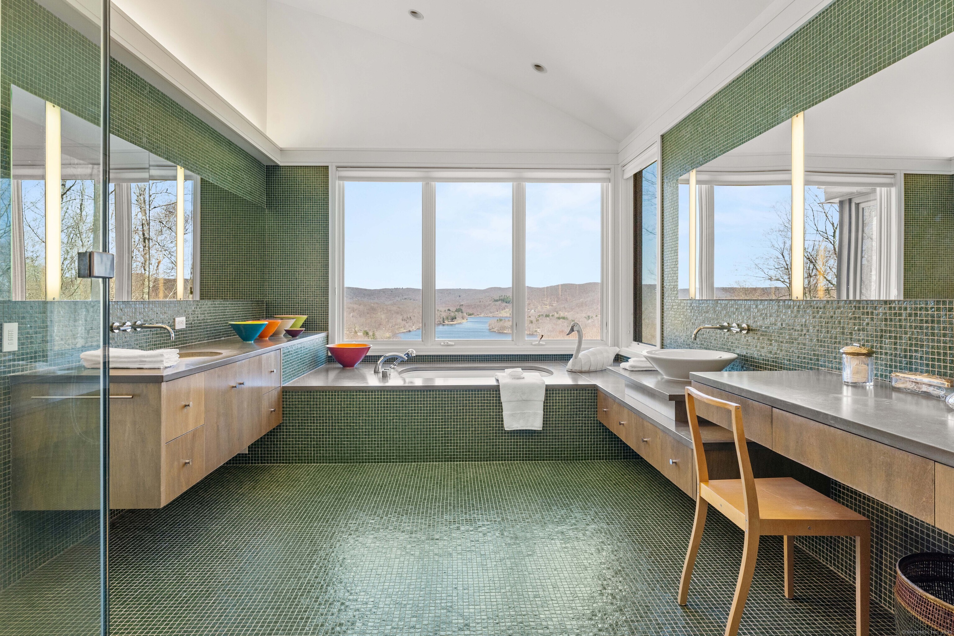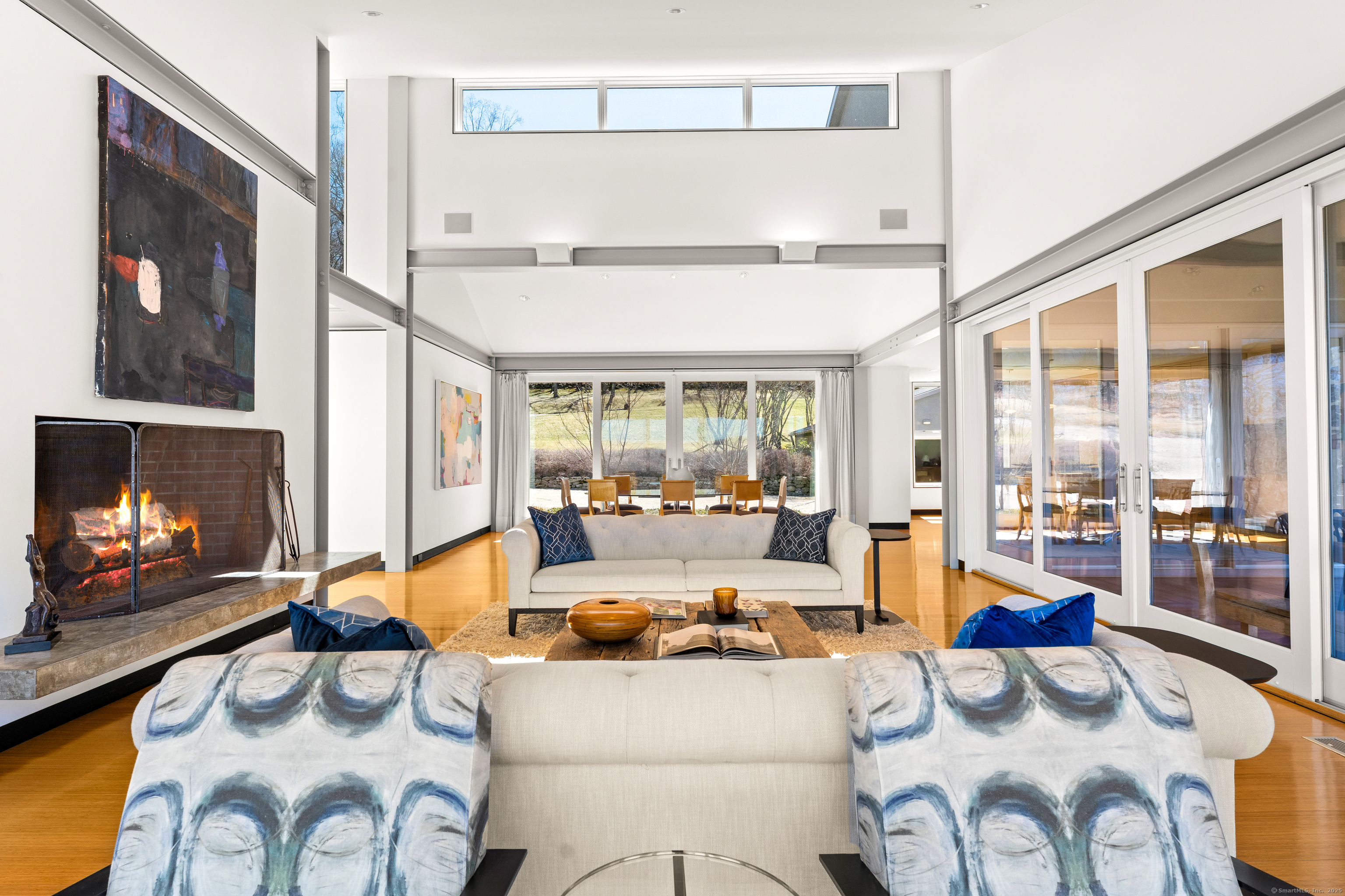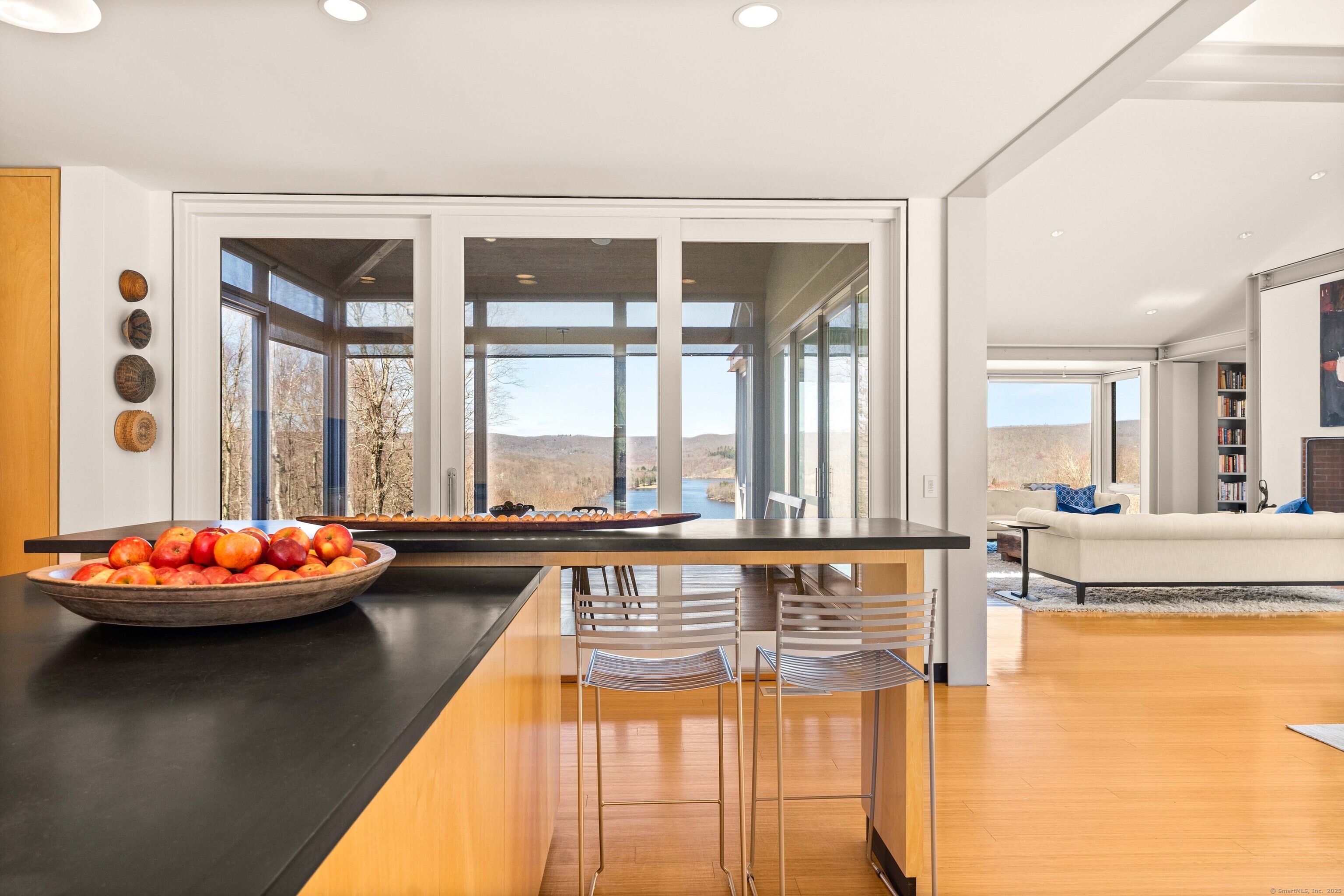 The Crown Jewel of Lake Waramaug, AKA 263 West Shore Rd. Set on 69 acres with direct lakefront, this stylish and sophisticated modern home is one of the largest estates on Lake Waramaug, offering a rare combination of waterfront access, privacy, and uninterrupted views. Unlike most lakefront properties, this estate provides both a move-in-ready modern retreat and exceptional expansion opportunities, featuring a separate West Shore Road address with over 250 feet of shoreline on the lake's quietest stretch. The waterfront includes a beach with large teak dock, dedicated picnic area, and ample guest parking. The 4,125 sqft modern home built in 2002 features concrete, stucco, and expansive glass construction. The interior showcases vaulted ceilings reaching 23 feet, bamboo flooring, and open-plan living spaces with continuous lake vistas through wall-to-wall windows. The gourmet kitchen boasts honed soapstone counters, Sub-Zero refrigeration, Thermador, and Miele appliances, and butler's pantry with pool/patio access. Living room features a wood-burning fireplace and access to screened porch. The private primary suite wing offers lake views, a walk-in closet with built-ins, en-suite bath with dual vanities, glass-enclosed shower, air-jet tub, and 2 private water closets. Adjacent is a separate office/nursery.