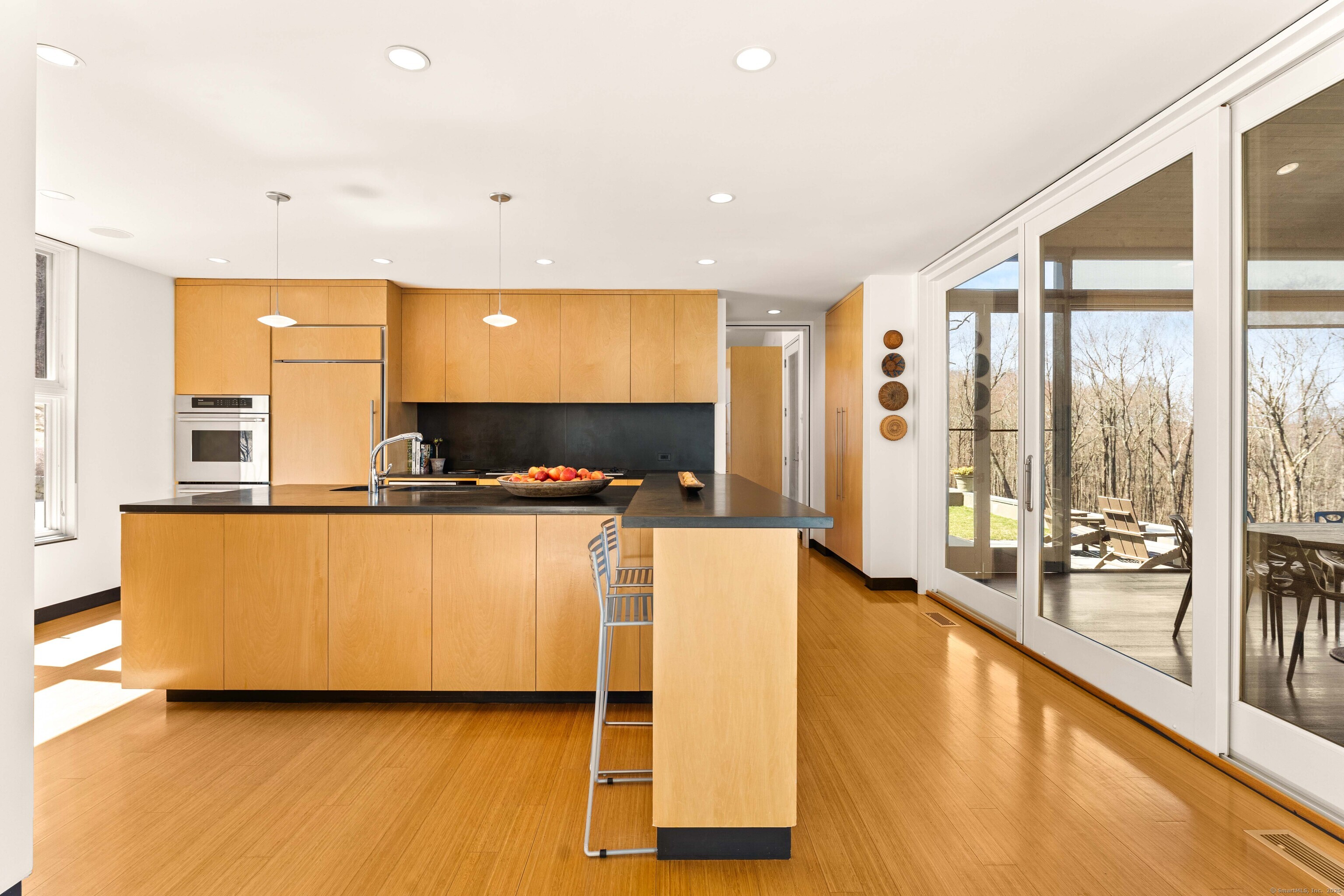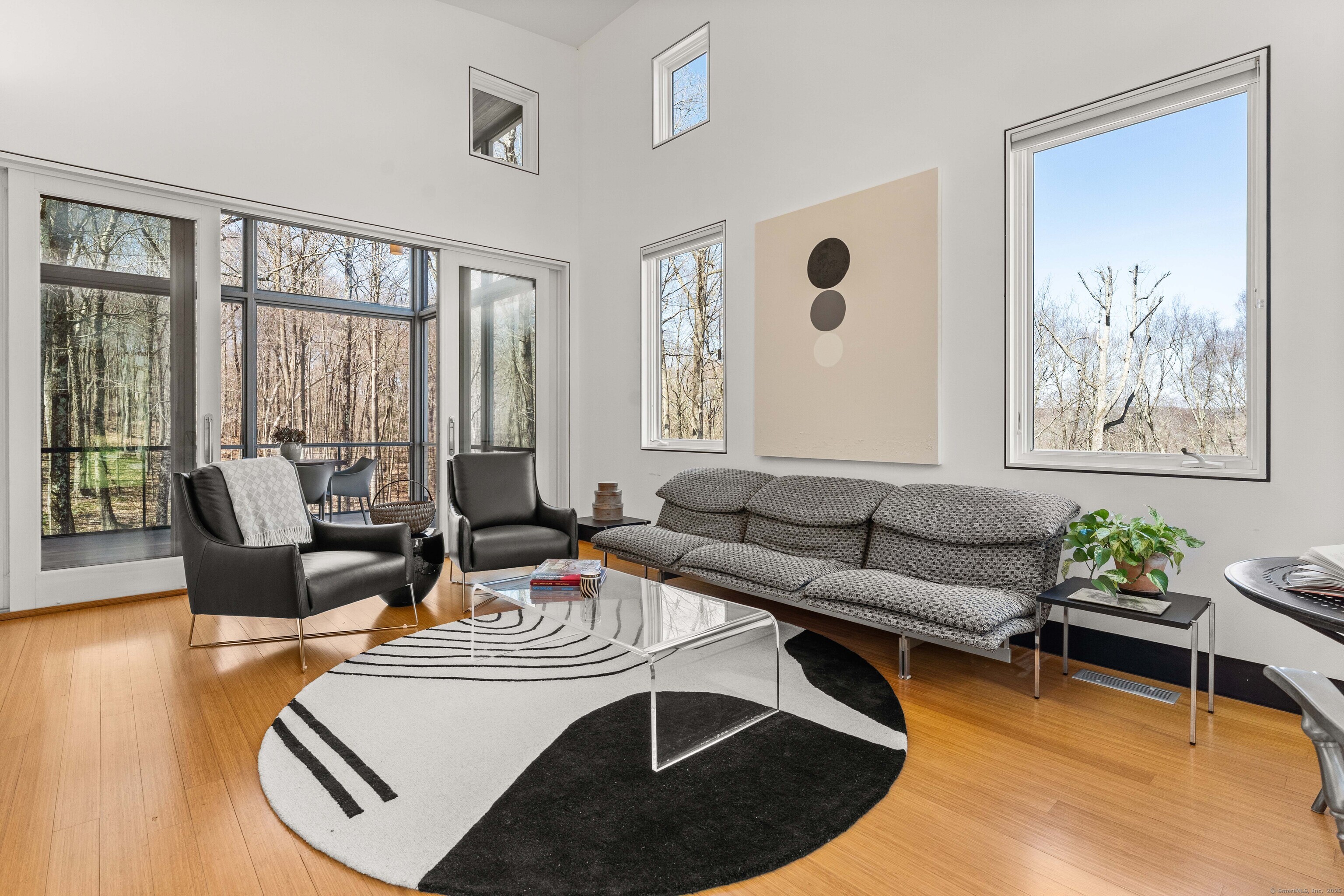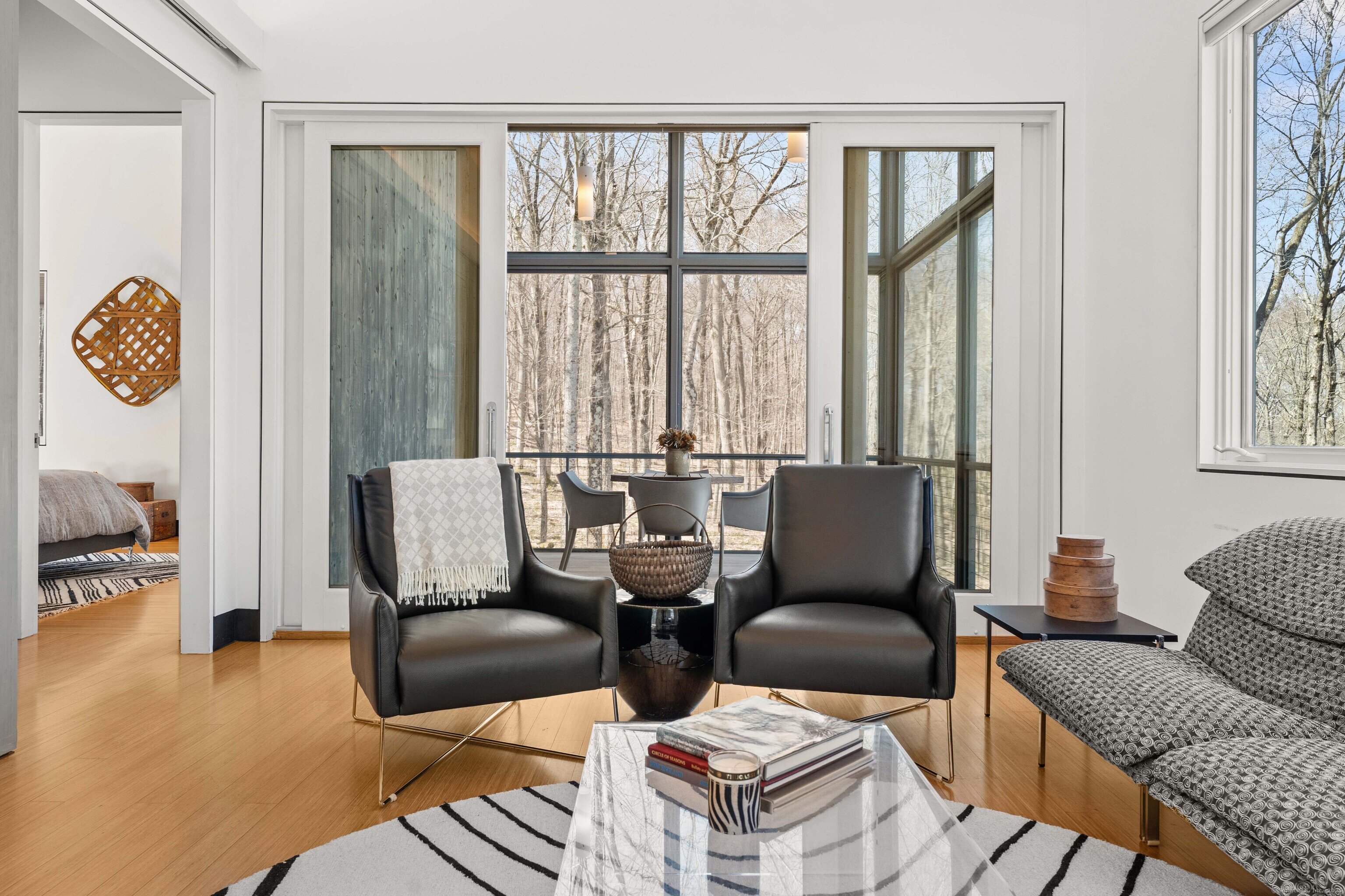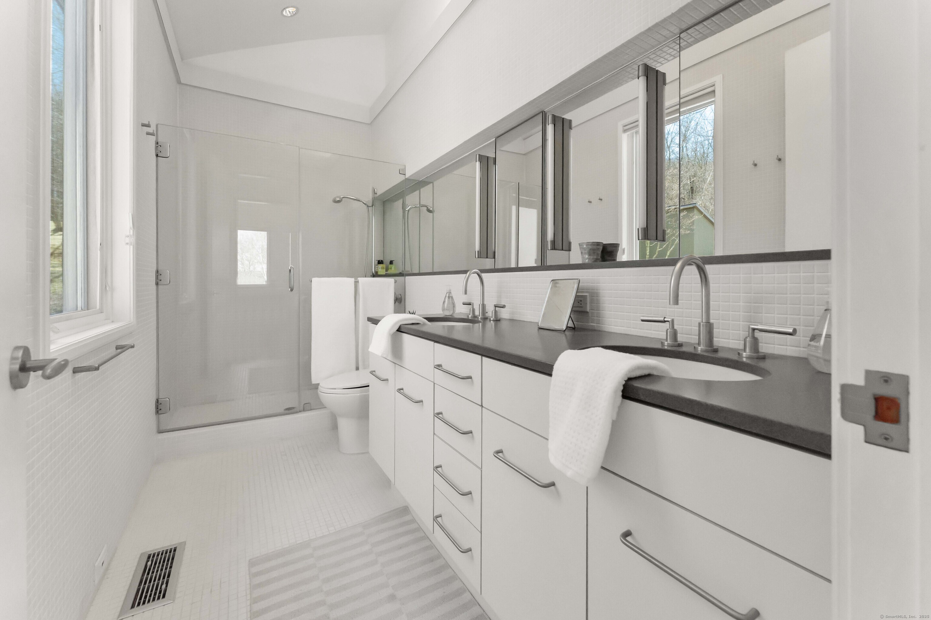 The Crown Jewel of Lake Waramaug, AKA 263 West Shore Rd. Set on 69 acres with direct lakefront, this stylish and sophisticated modern home is one of the largest estates on Lake Waramaug, offering a rare combination of waterfront access, privacy, and uninterrupted views. Unlike most lakefront properties, this estate provides both a move-in-ready modern retreat and exceptional expansion opportunities, featuring a separate West Shore Road address with over 250 feet of shoreline on the lake's quietest stretch. The waterfront includes a beach with large teak dock, dedicated picnic area, and ample guest parking. The 4,125 sqft modern home built in 2002 features concrete, stucco, and expansive glass construction. The interior showcases vaulted ceilings reaching 23 feet, bamboo flooring, and open-plan living spaces with continuous lake vistas through wall-to-wall windows. The gourmet kitchen boasts honed soapstone counters, Sub-Zero refrigeration, Thermador, and Miele appliances, and butler's pantry with pool/patio access. Living room features a wood-burning fireplace and access to screened porch. The private primary suite wing offers lake views, a walk-in closet with built-ins, en-suite bath with dual vanities, glass-enclosed shower, air-jet tub, and 2 private water closets. Adjacent is a separate office/nursery.