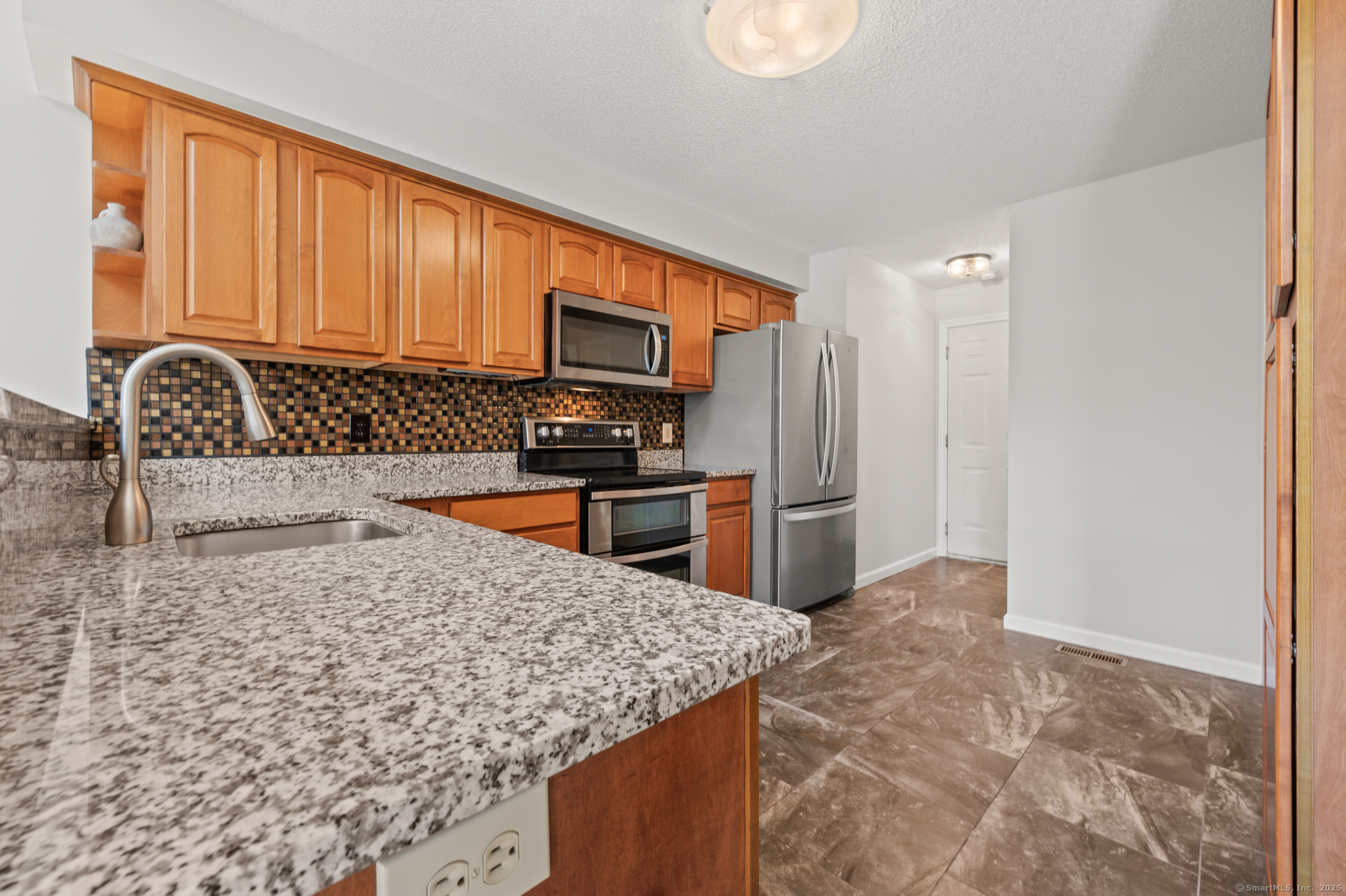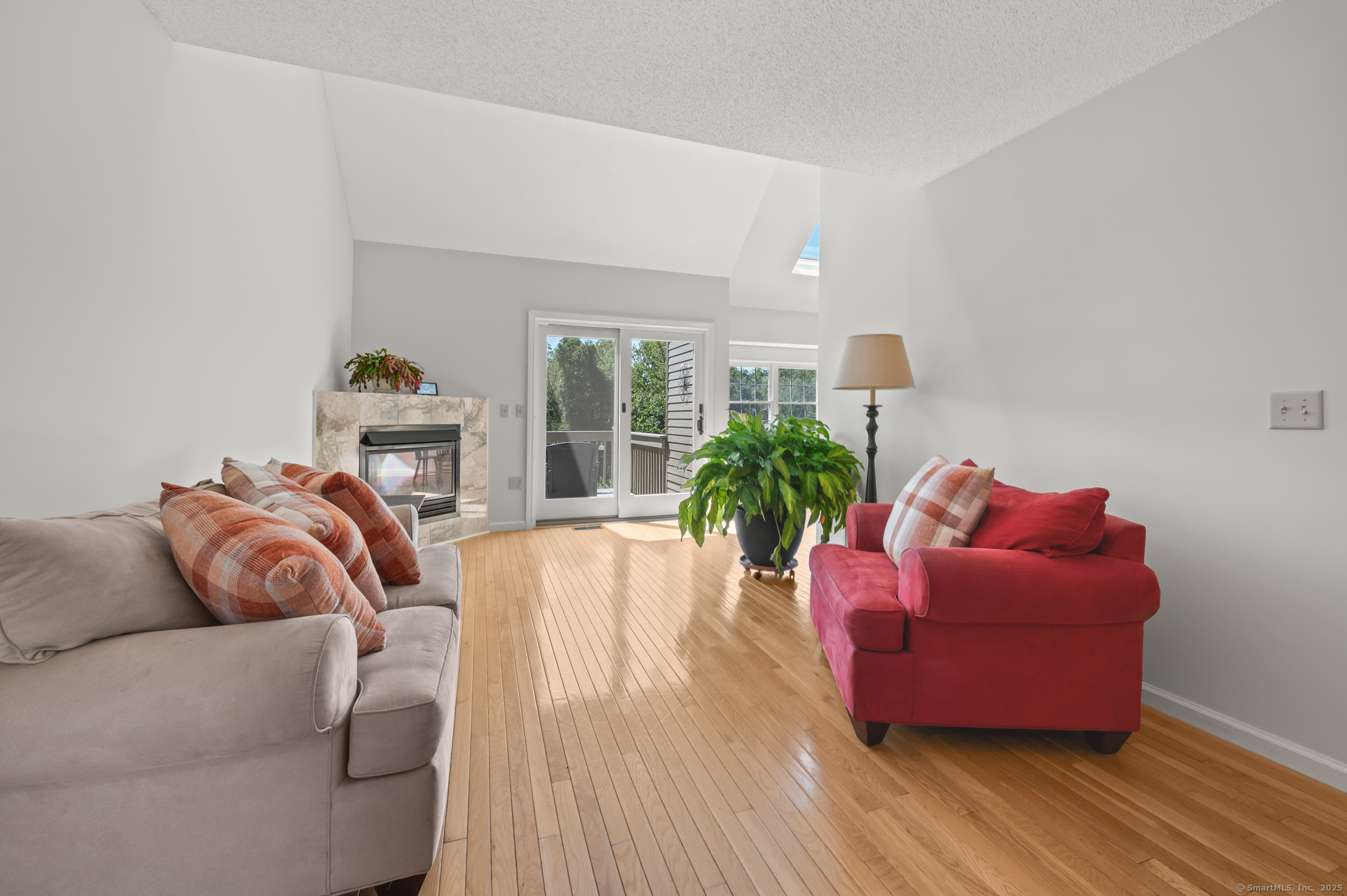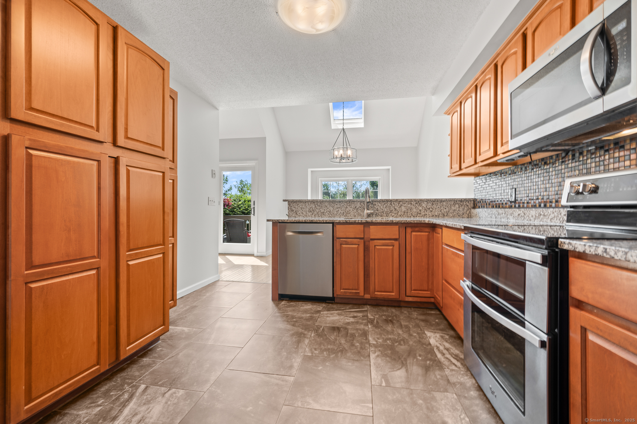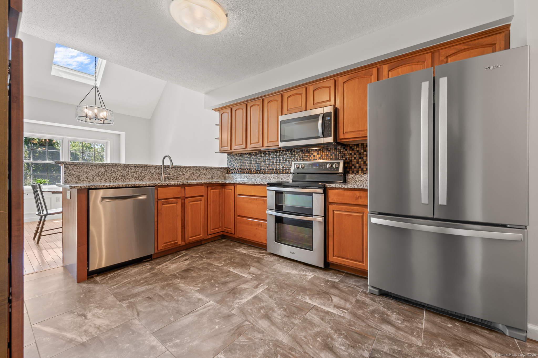 Fantastic Townhouse in a Sought-After Community! This bright and inviting townhouse features fresh interior paint and a kitchen with granite countertops and stainless-steel appliances. The open-concept living room showcases vaulted ceilings, skylights, hardwood floors, and a cozy fireplace. Step outside to a private deck that backs to the woods-perfect for relaxing or entertaining. The walkout finished lower level provides flexible space for a family room, exercise area, or home office. With 2 full bathrooms, a half bath, central air, and an attached garage, this home offers both comfort and convenience. A loft area and finished walk-up attic add even more versatile living space. Fantastic location close to UConn, shopping, and dining!