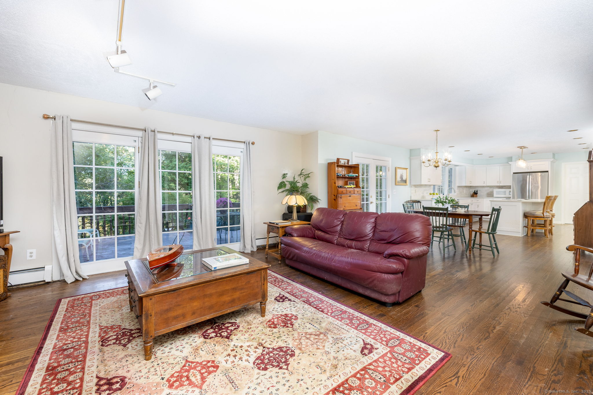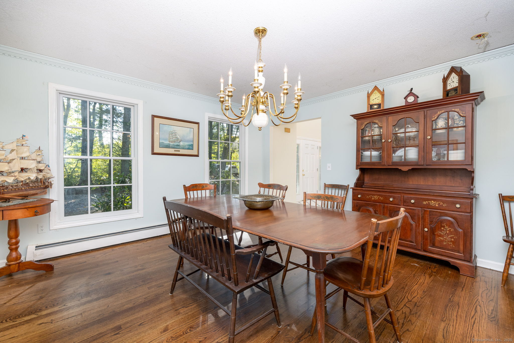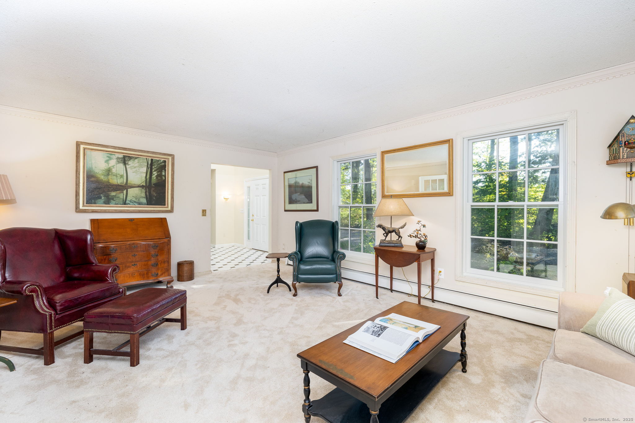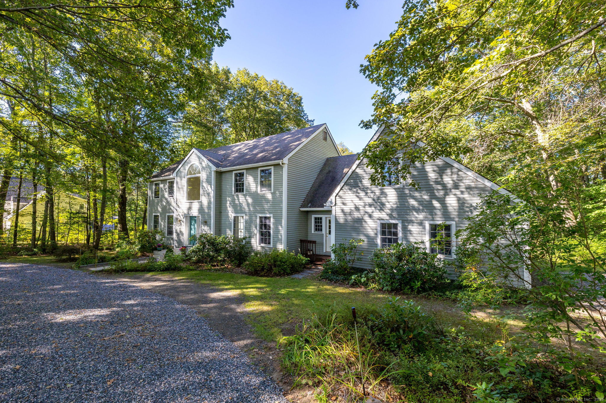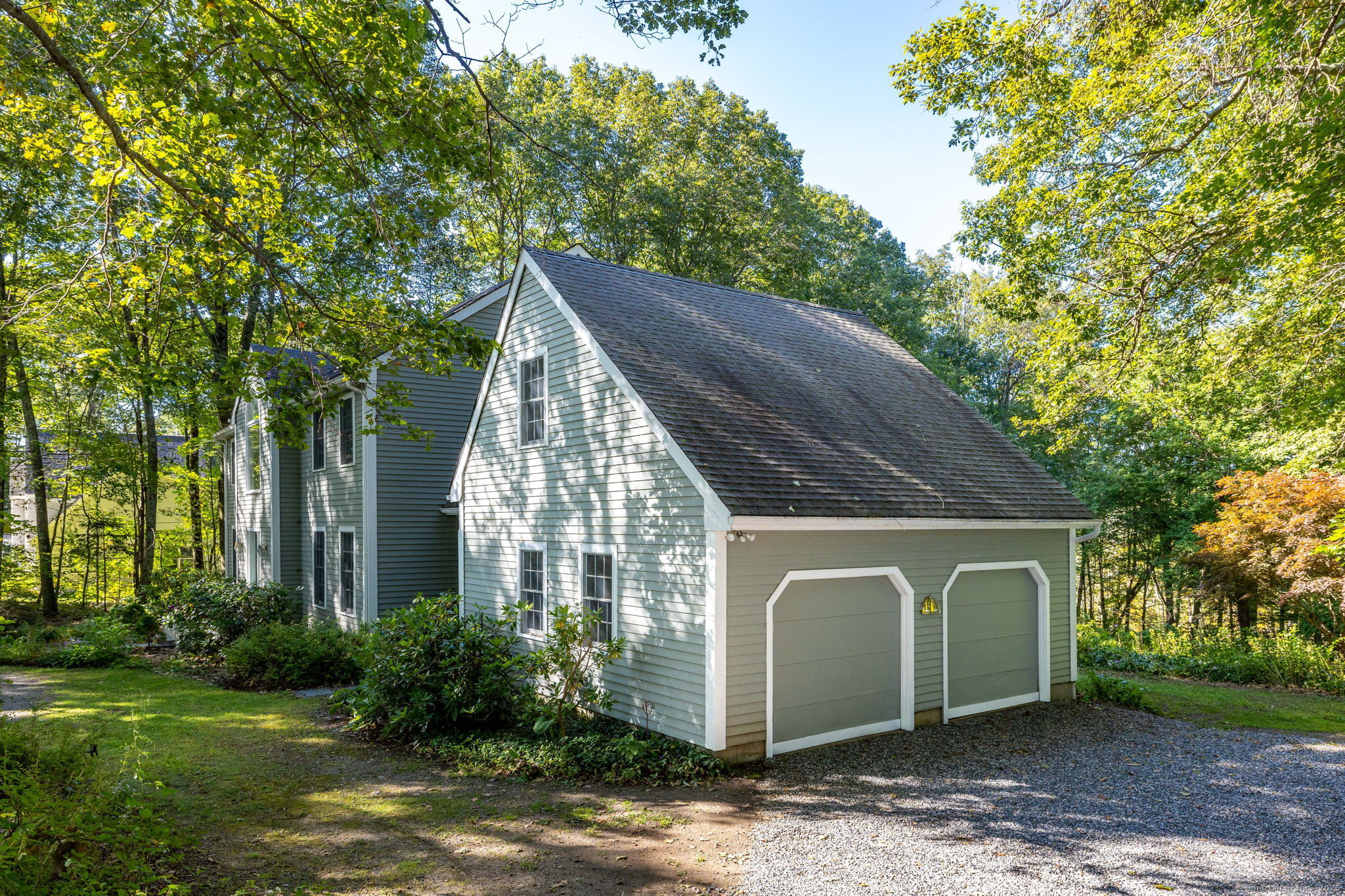 Discover your own private sanctuary on this stunning 7.33 acre wooded residence where tranquility meets elegance on a peaceful country road. This beautifully updated four-bedroom Colonial seamlessly blends classic charm with modern conveniences throughout. The heart of the home features an expertly updated kitchen showcasing elegant quartz countertops, a functional center island and an inviting dining area that flows effortlessly to the expansive wood deck-perfect for entertaining against the backdrop of mature trees and natural beauty. The welcoming family room boasts rich hardwood flooring and a cozy wood-burning fireplace, while the formal living room impresses with refined dental molding and plush wall to wall carpeting. Entertaining is effortless in the sun-filled formal dining room, enhanced by gleaming hardwood floors and elegant dental molding. Practicality continues with a spacious mudroom offering abundant storage and seamless access to the oversized two-car garage, plus a convenient main-level powder room. The upper level reveals an expansive primary bedroom suite featuring two generous closets plus a charming cedar closet, comfortable wall to wall carpeting and a versatile bonus room ideal for a home office, exercise space or personal retreat. Three additional spacious guest rooms and a full bathroom complete this level.
