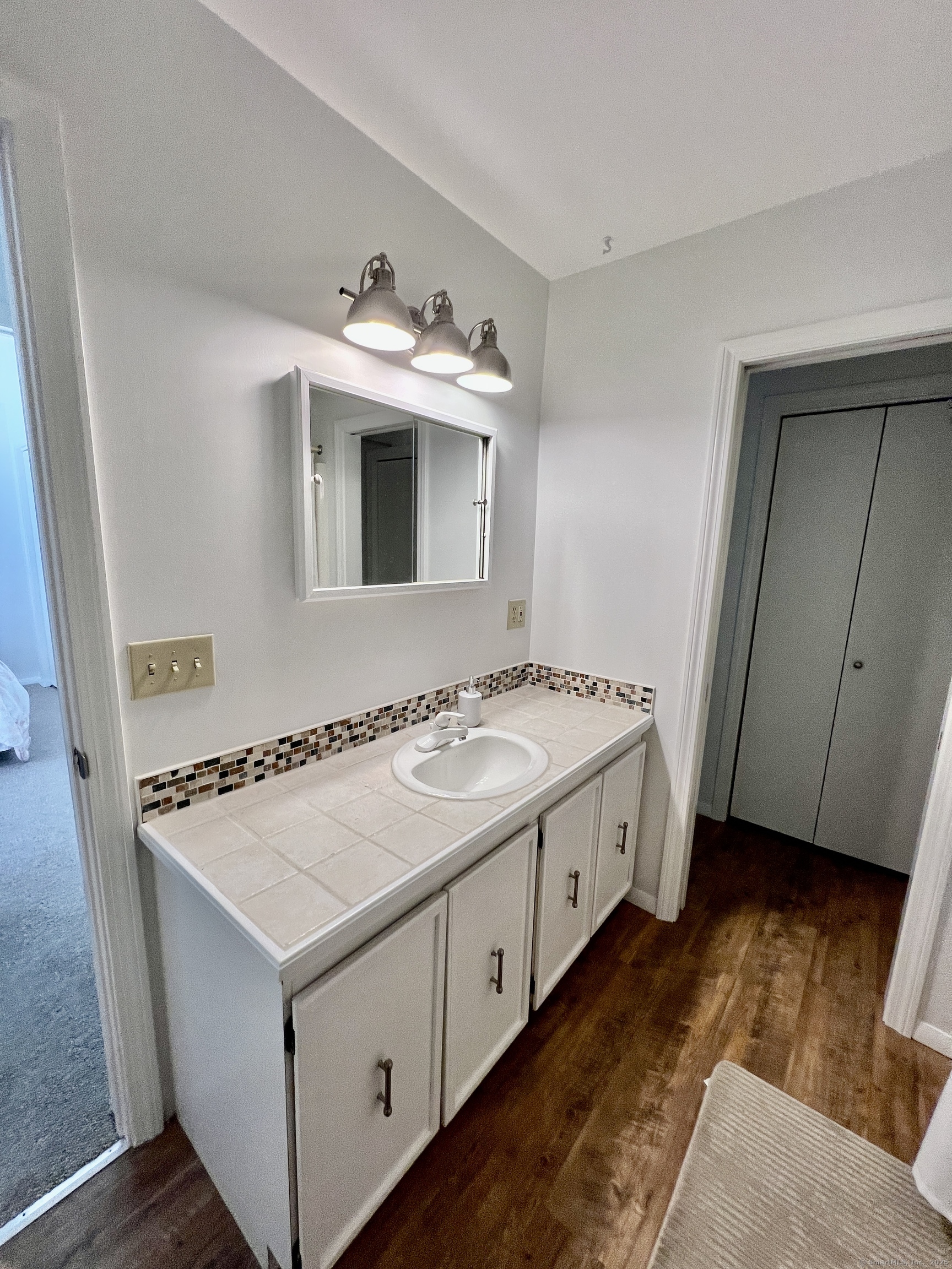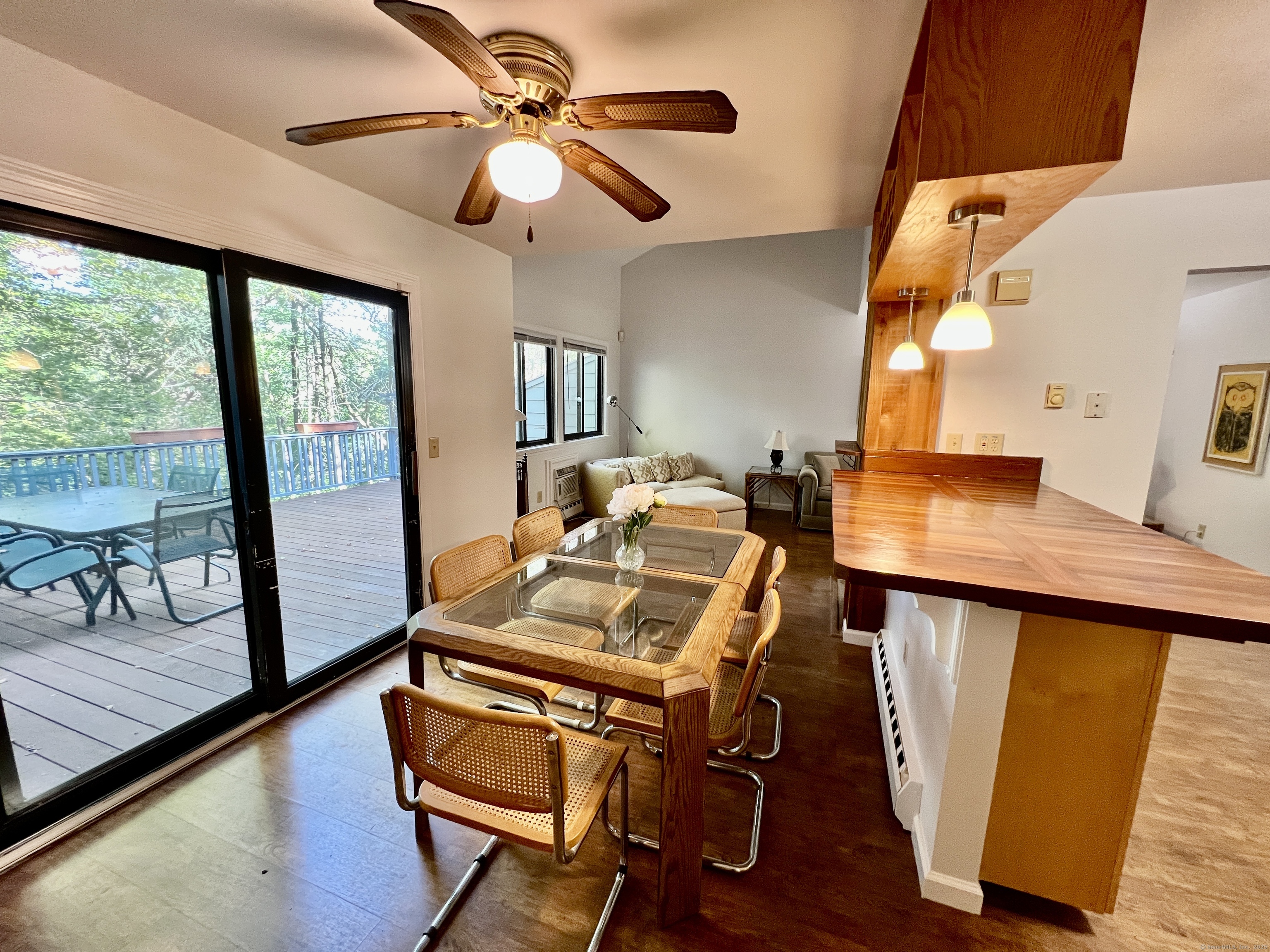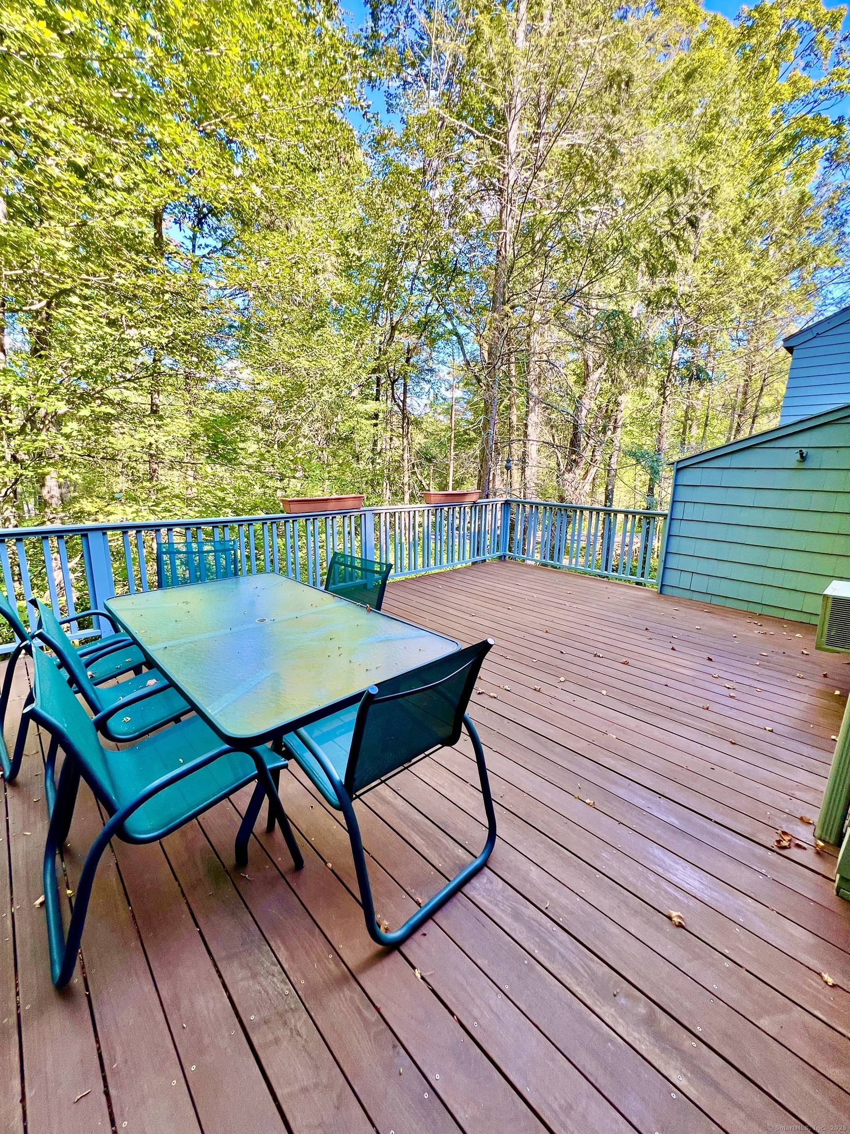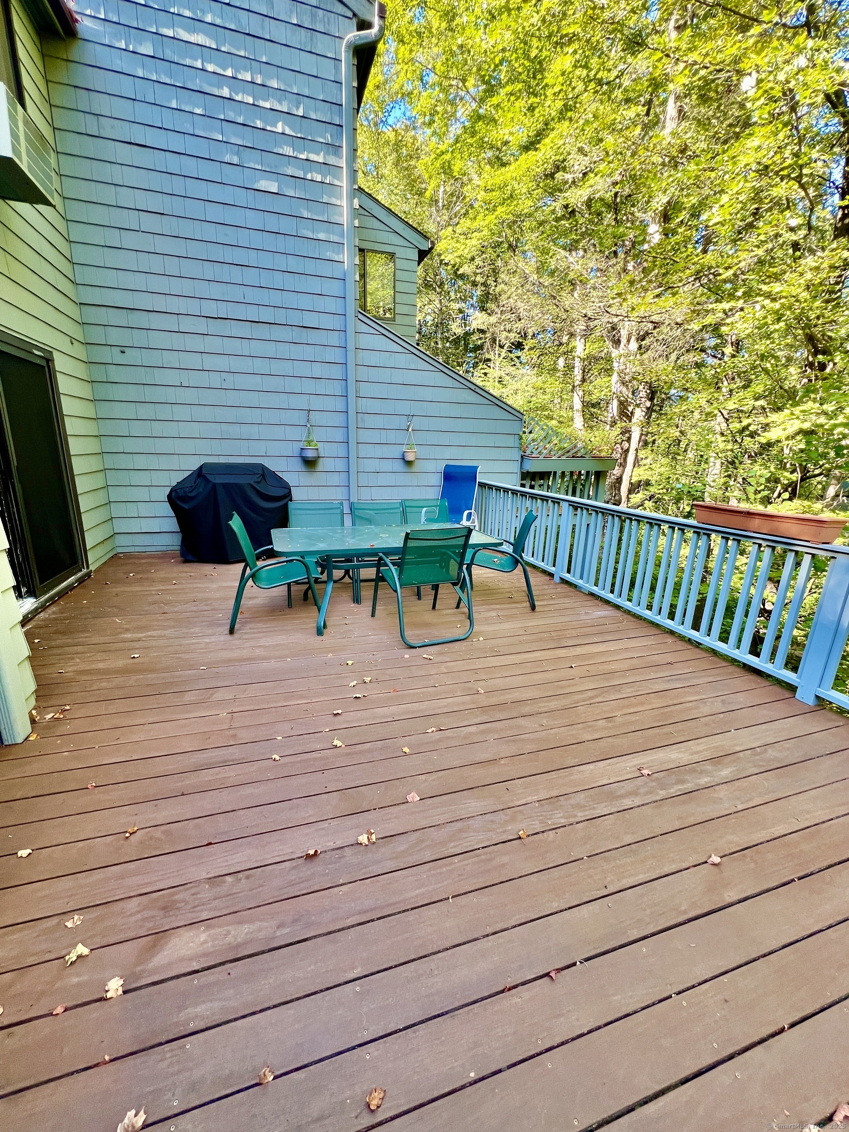 Woodhaven model with short path and easy access. The star of this home is the huge expanded deck composed of brazillian cherry wood lumber. Perfect for sun bathing & outdoor dining. The living room has a wood burning fireplace and easy access to the remodelled kitchen and dining room. A bedroom and full bath is on the main level. Upstairs is the primary bedroom with a vaulted ceiling, a third bedroom and a full bath. The laundry is also on this level. Most of the windows have been replaced and the entire home has been recently painted. It is in move-in condition. The home is equipped with a security system for fire, low temperature and burglar, all monitored by Lakeridge. It is close to both the East and West lodge, the sports field and the post office. It is being sold in AS IS condition, inspections for informational purposes only.