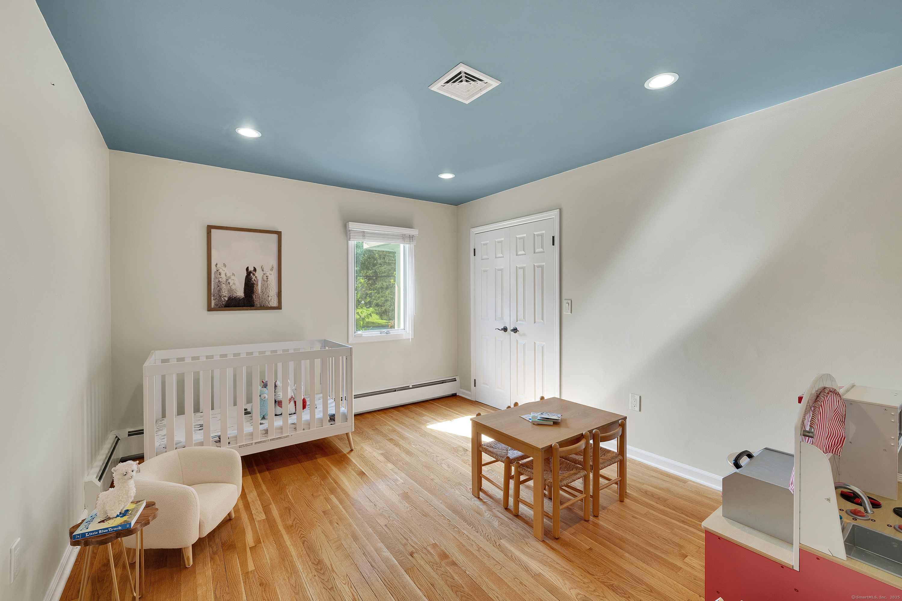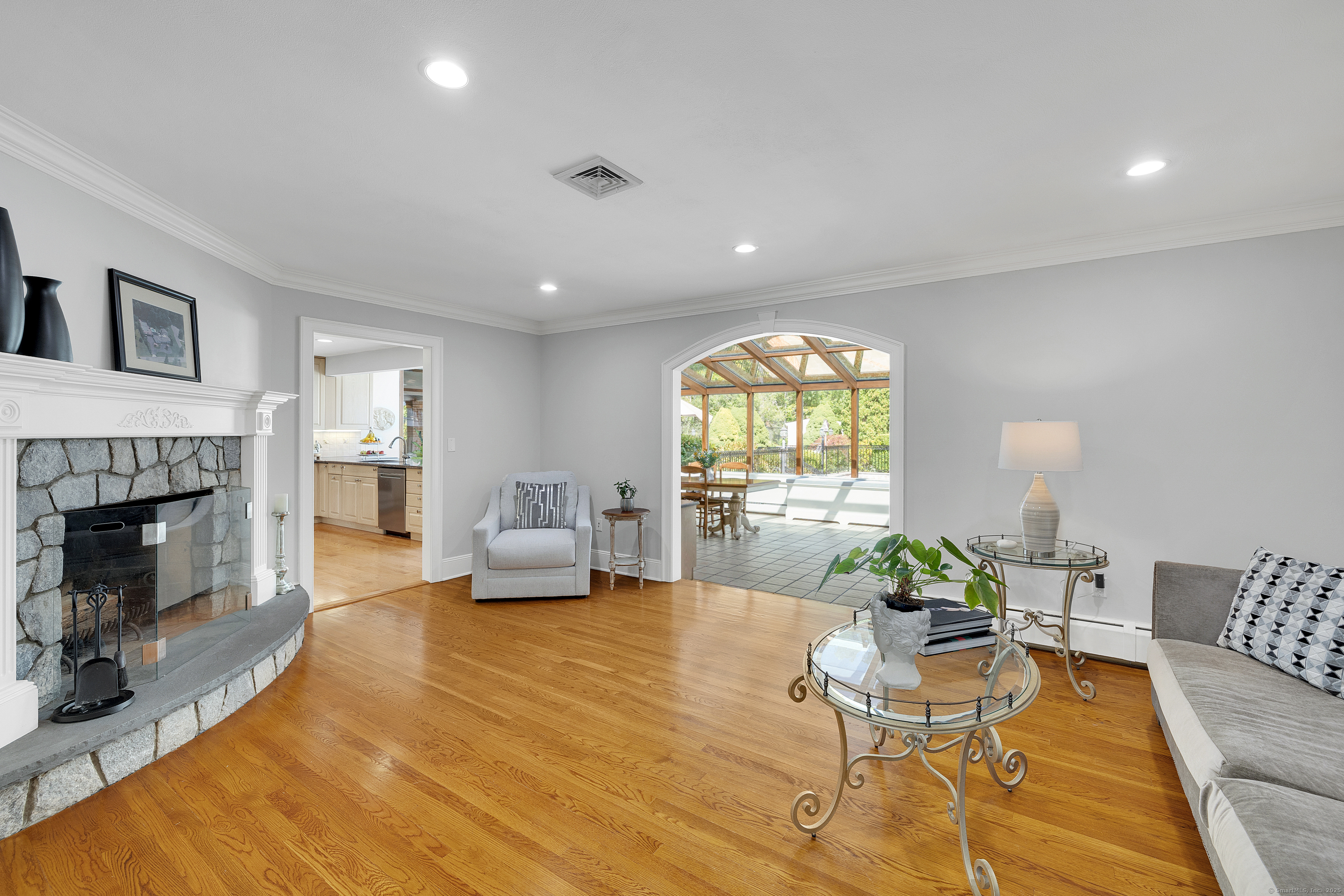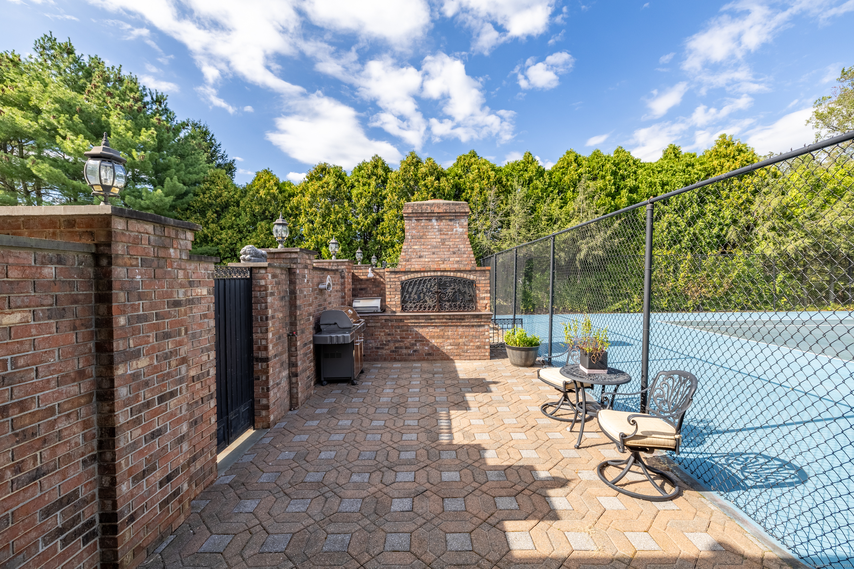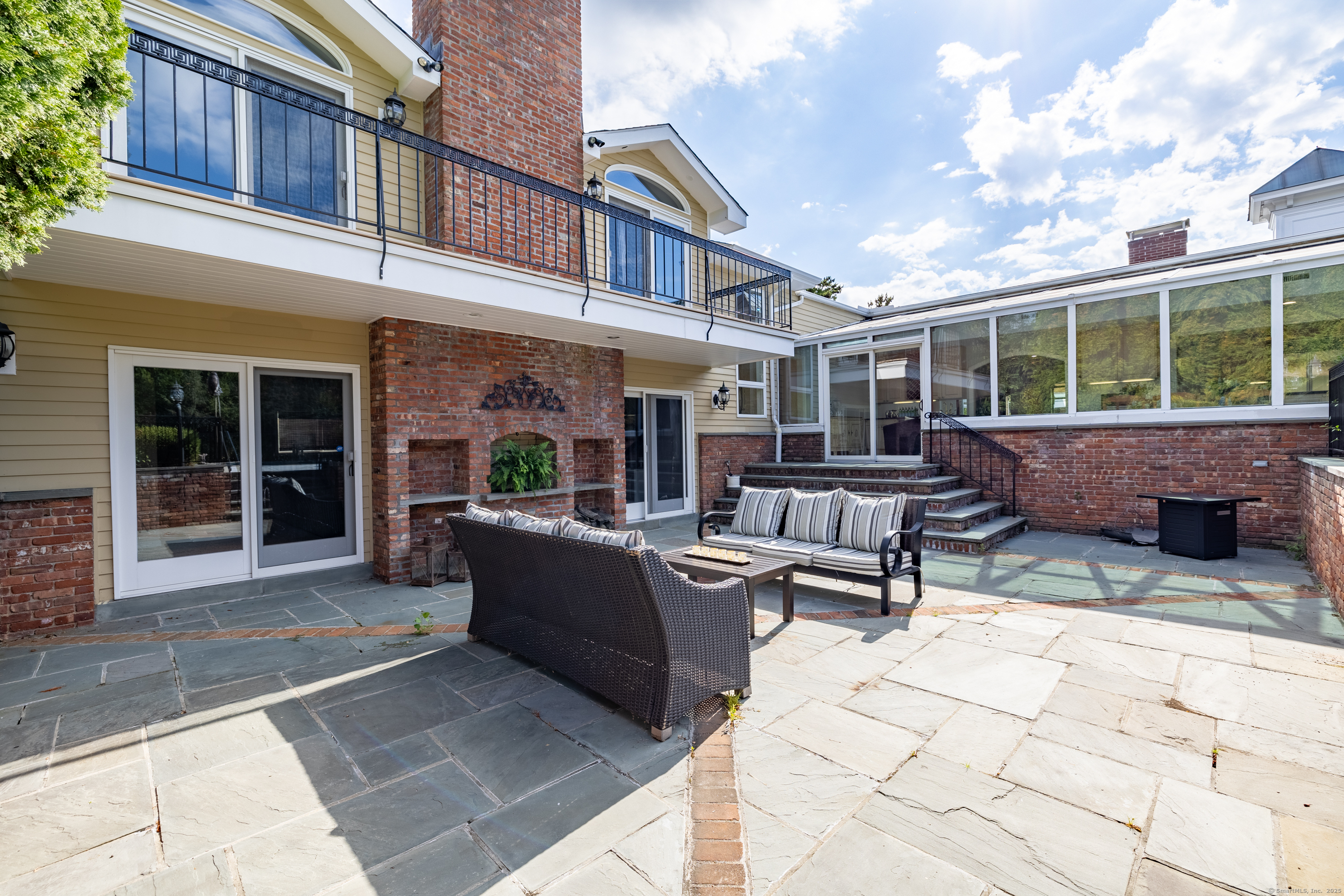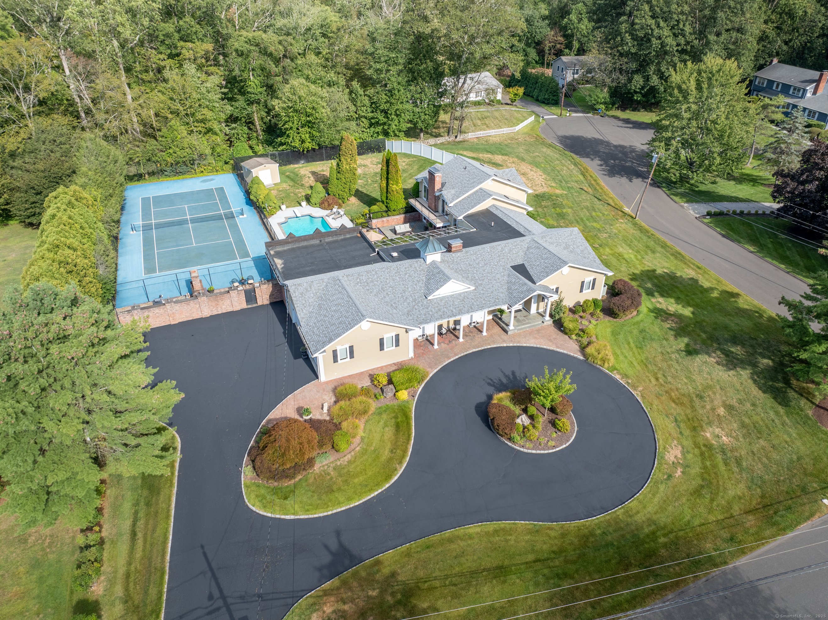 Welcome to 5 New England Drive-a spacious and thoughtfully designed ranch set on a level one-acre corner lot in North Stamford, offering the rare advantage of natural gas and public water. The beautifully maintained grounds provide a true retreat with a tennis court, in-ground pool, courtyard, covered outdoor dining area with pizza oven, and a fully fenced backyard. Inside, you'll find 5,474 sq ft of living space with 5 bedrooms and 4.5 bathrooms. Four bedrooms are located on the main level, including a junior primary suite with en-suite bath. At the heart of the home, the chef's kitchen opens to a glass atrium-style dining and living area, filled with natural light and views of the property. The expansive primary suite features cathedral ceilings, two walk-in closets, spa-like bath, fireplace, and two private balconies. A walk-out lower level offers a bar, half bath, and a third fireplace-perfect for entertaining or extended living. Additional highlights include a large three-car heated garage, oversized driveway, new roof including plywood (2024), and a fully replaced septic system (2012). Ideally located, 5 New England Drive is just minutes to downtown New Canaan, Talmadge Hill train station, and the Merritt Parkway. You do not want to miss out on this property that truly offers it all!