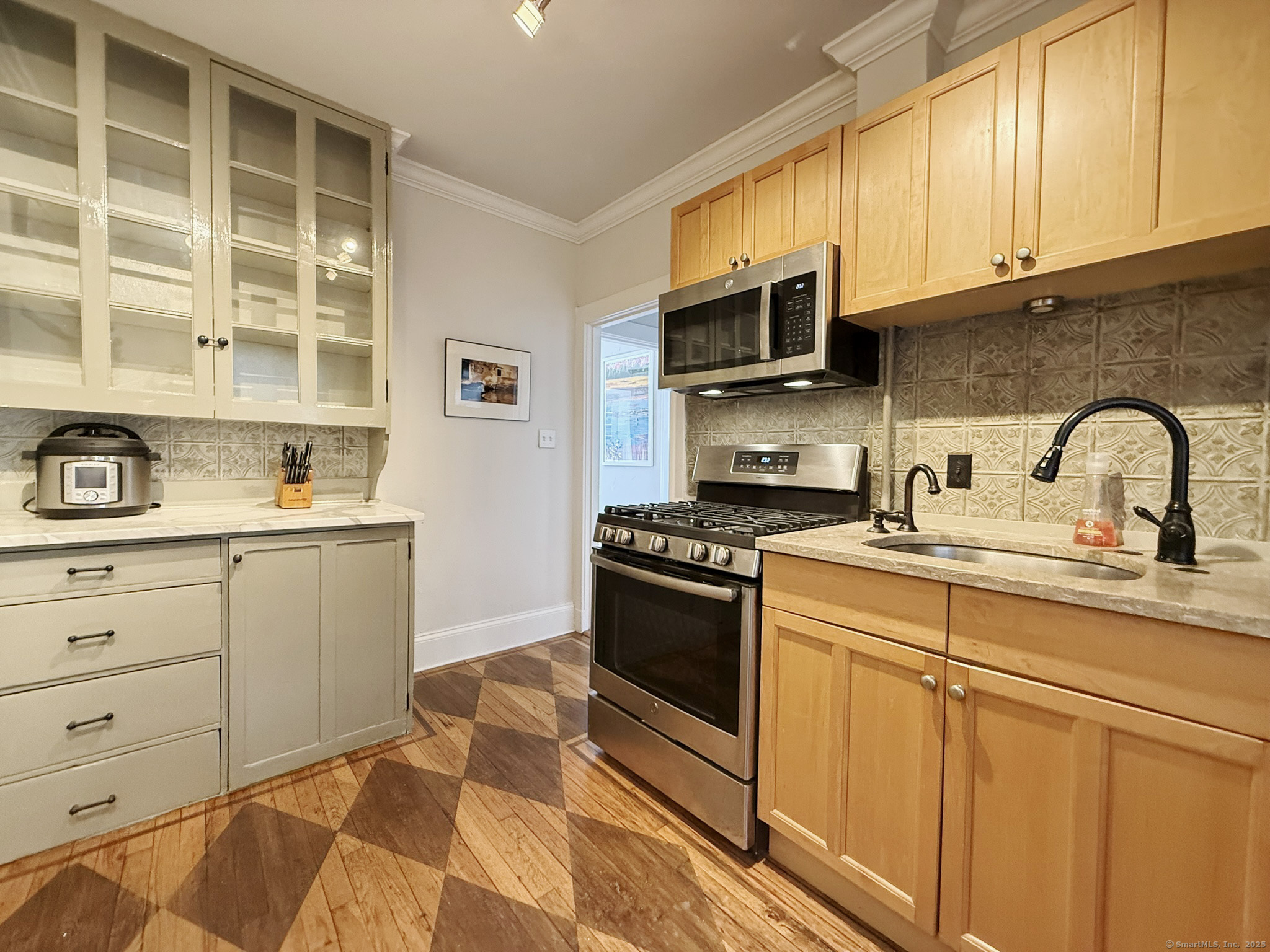 Enjoy coastal living in this charming brick one bedroom co-op on the National Historic Register located in the heart of Black Rock! It's like stepping into your own sunny oasis with windows on three sides (end unit), and original hardwood floors in the living room, dining room and bedroom. Kitchen with marble and limestone counters, newer cabinets, stainless steel appliances. Deep soaking tub with shower, marble-tiled floor with radiant heat, creates a spa-like setting. Need a spot to kick back and relax? The screened-in porch overlooking a garden oasis is calling your name - whether you want to enjoy a quiet moment with a cup of coffee or a calm moment. And when hunger strikes or you need to do a little shopping, you're in luck - there are restaurants and shops just a block away! Walk to the Black Rock train station with express trains to Manhattan. For fun, enjoy tennis courts, public boat ramp, a small sandy beach, and a yacht club just 3 blocks away. Basement includes a large private storage unit. Store your kayak or bike in the back lot or plant a vegetable garden in the community garden area. Two paved parking lots. Taxes, hot water, water, and sewer are included in the common charges. Contingent upon board approval. Owner-occupied only, no rentals. Come check it out before it's gone!