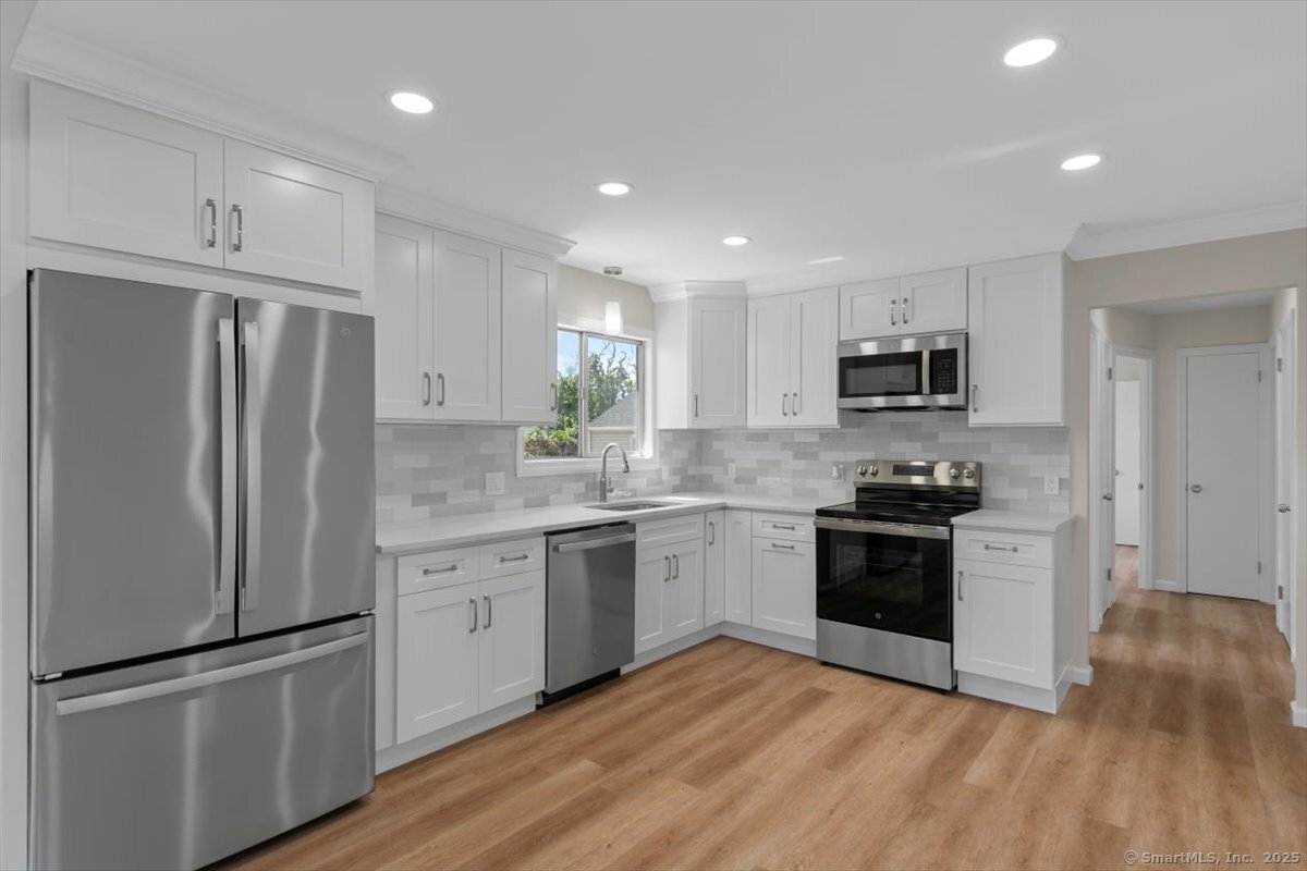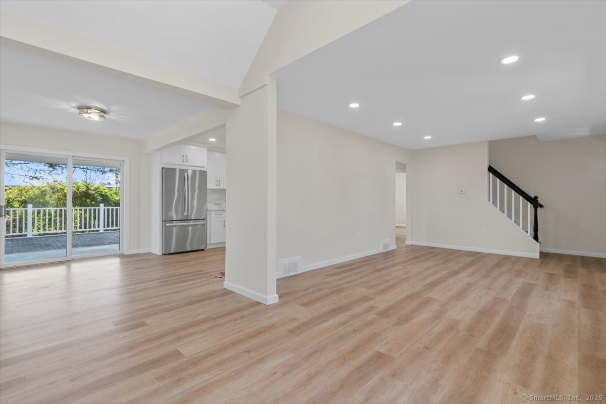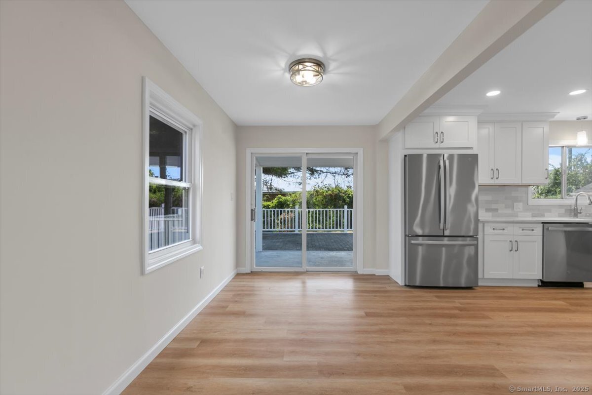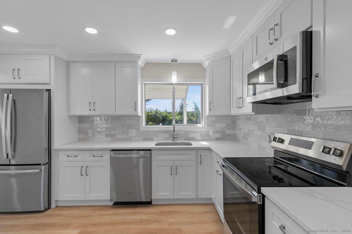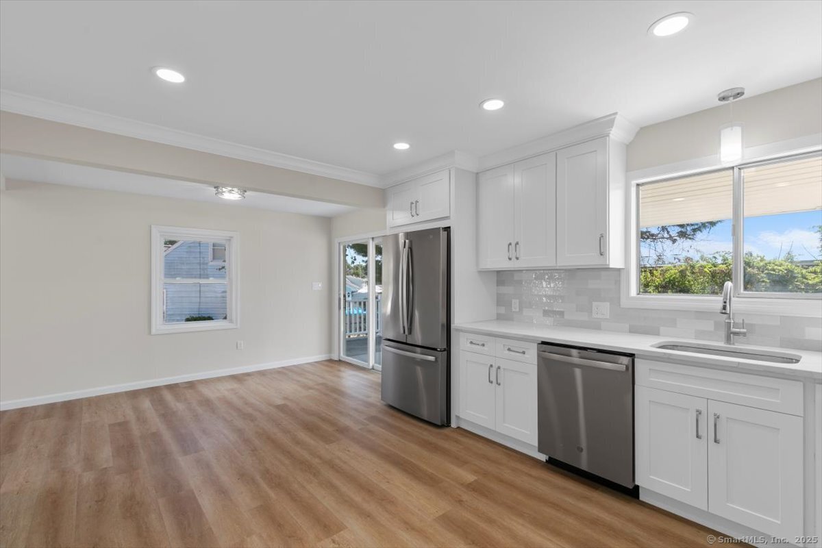 Welcome to this beautifully updated Cape Cod in the heart of Milford, offering both comfort and convenience just minutes from downtown, the beaches, I-95, and Route 1. Inside, you'll find 4 bedrooms and 2 full baths, along with a thoughtfully updated kitchen featuring quartz counters, stainless steel appliances, and modern fixtures. The living area stands out with vaulted 9+ foot ceilings, recessed lighting, and sliding doors that open to a private rear patio-perfect for gatherings or quiet evenings at home. A detached garage and full basement provide plenty of storage, while the newly paved driveway ensures ample parking.