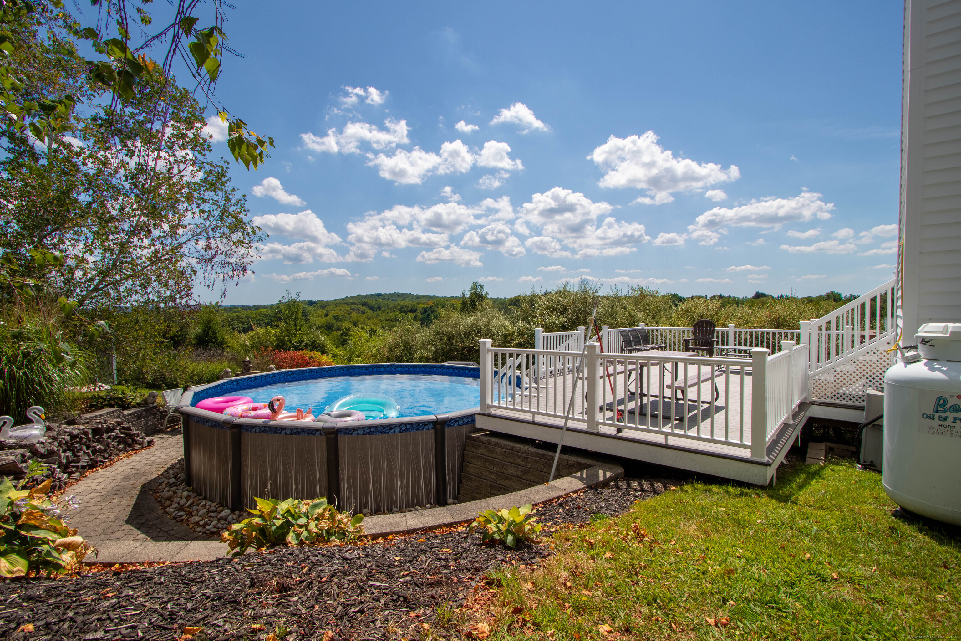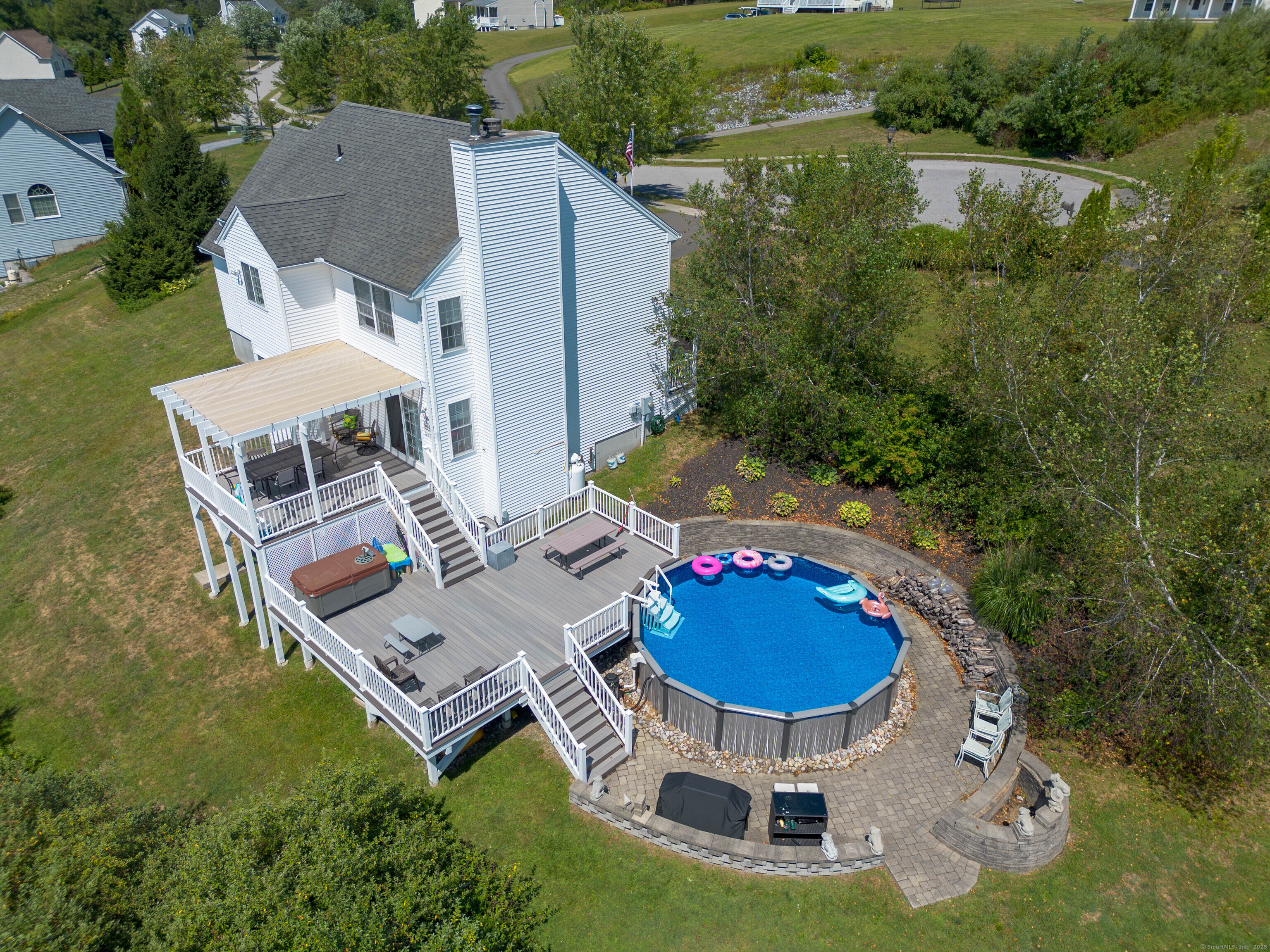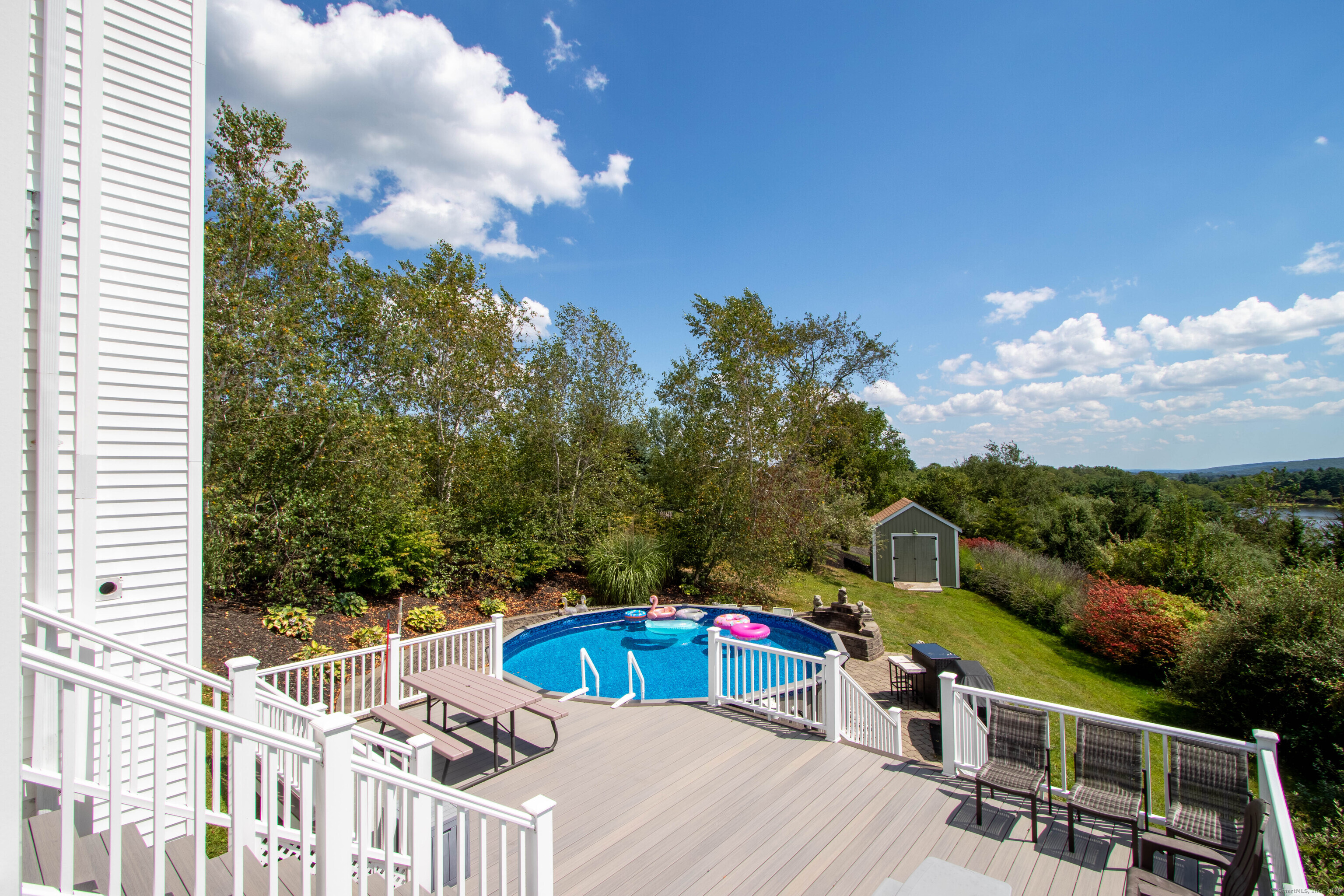 Don't miss your chance to own this spacious 3/4 bedroom open floor plan colonial, set at the heart of a quiet cul-de-sac on Maggie Court in one of Terryville's most sought-after areas. With city water & sewer, this home offers the perfect blend of comfort, style & convenience. The welcoming entryway with its sweeping staircase sets the stage for a sun-filled, open-concept design made for entertaining & everyday living. The living room features a cozy propane fireplace, while the updated kitchen offers quartz countertops, stainless steel under-mount sink, & newer stainless-steel appliances (approx. 4 years old). The kitchen, living room & office have all been freshly painted, along with doors & trim. Relax on the freshly painted front porch or step onto the back deck to enjoy breathtaking views of Lake Winfield. Outdoor living shines with all-new Trex decking, composite railings, pergola, hot tub, new pool (2024), custom paver patio with fire pit, & two custom-built sheds-one in front & one in back-for storage or hobbies. Upstairs, the primary suite offers a walk-in closet, Jacuzzi tub, & walk-in shower, while the second-floor hallway bathroom includes the laundry area for added ease. The walkout basement includes a finished room (not included total sq. ft.) plus space to expand-ideal for a gym, media room, or possible in-law setup. With a two-car garage, ample storage, & its cul-de-sac setting, this home combines modern updates, resort-style amenities, & stunning lake views.