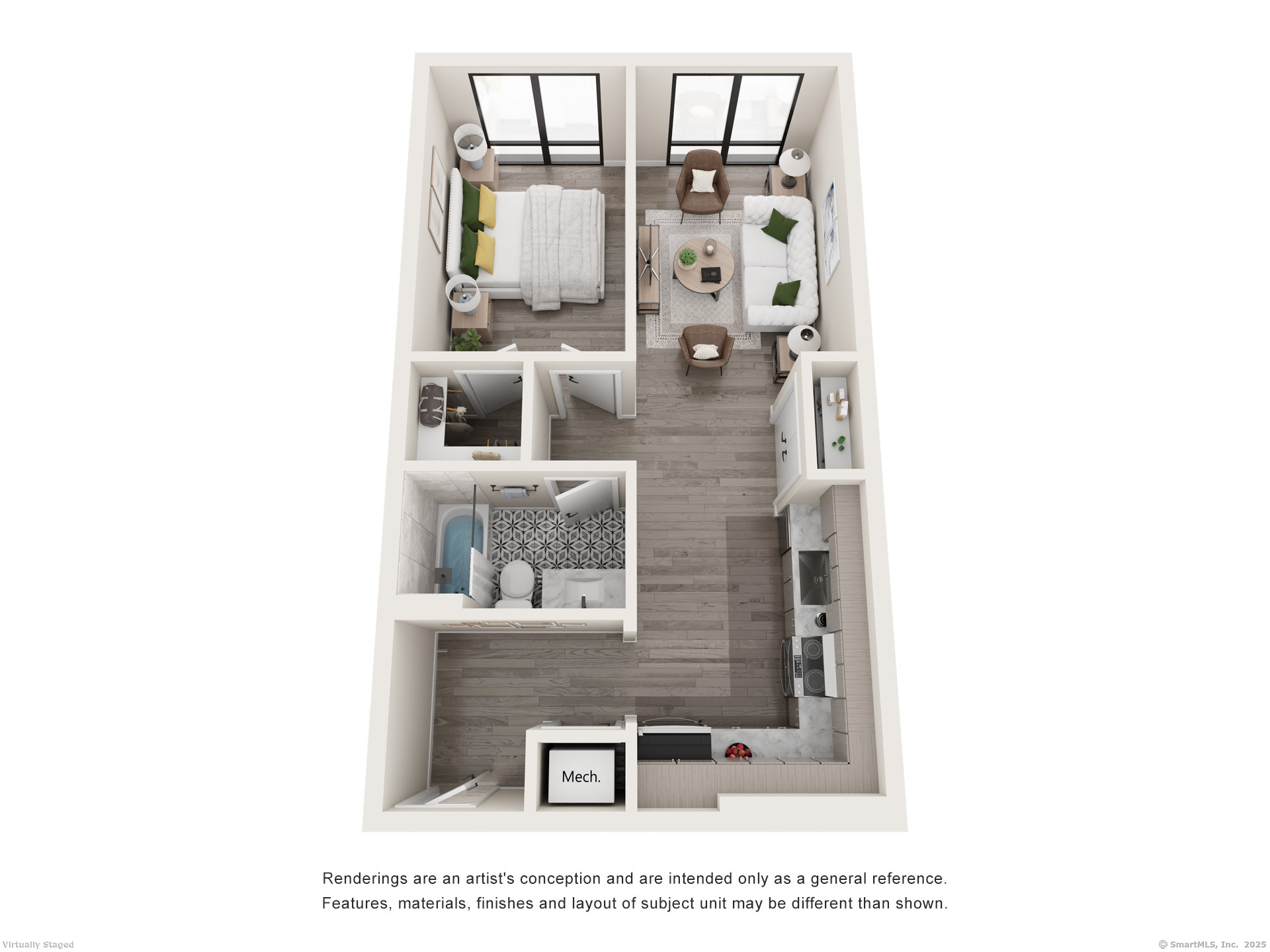 Welcome to The Platform at The Highrailer - a sleek 1-bedroom, 1-bath home offering 625 sq. ft. of thoughtfully designed living space. Modern finishes include quartz countertops, stainless steel appliances, and durable vinyl plank flooring. Large closets provide excellent storage, while the efficient layout maximizes every square foot. The Platform combines contemporary style with everyday convenience, making it the ideal choice for modern city living.