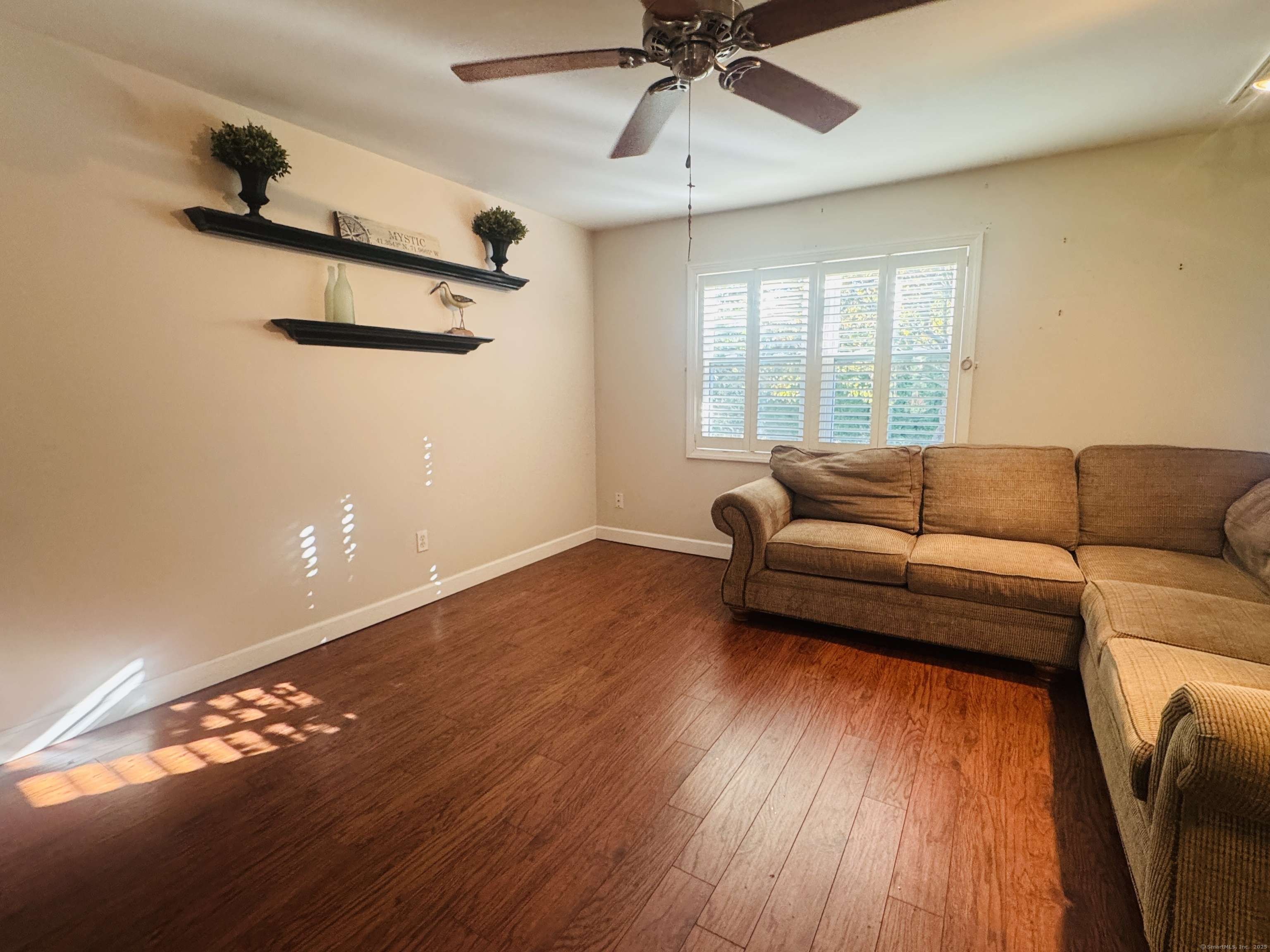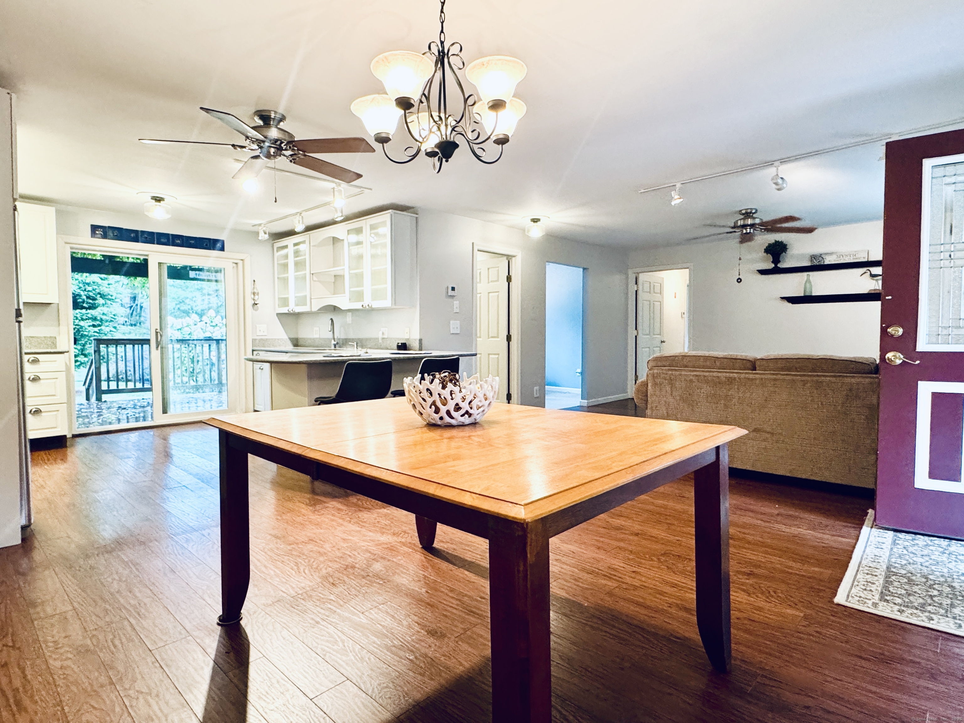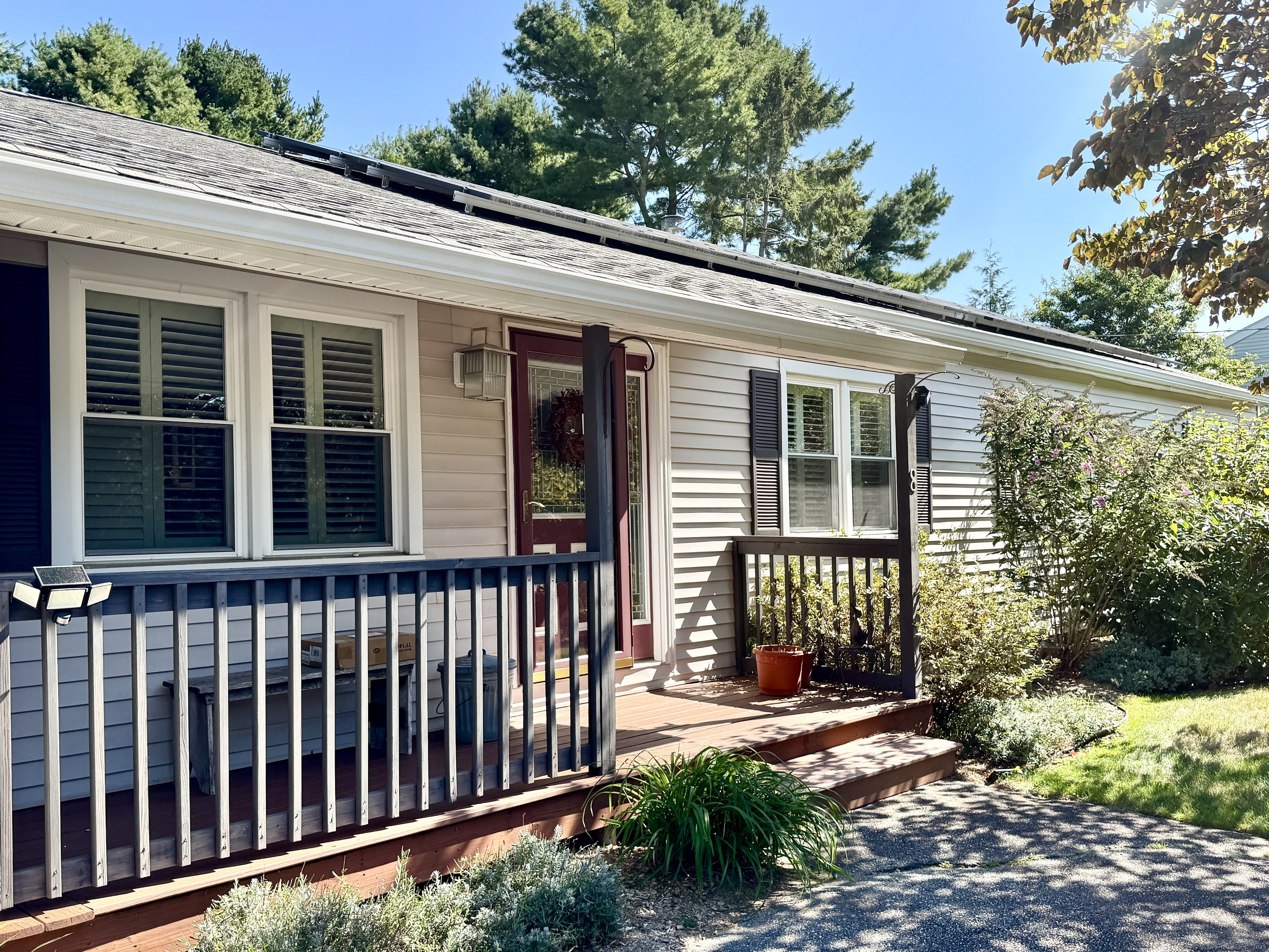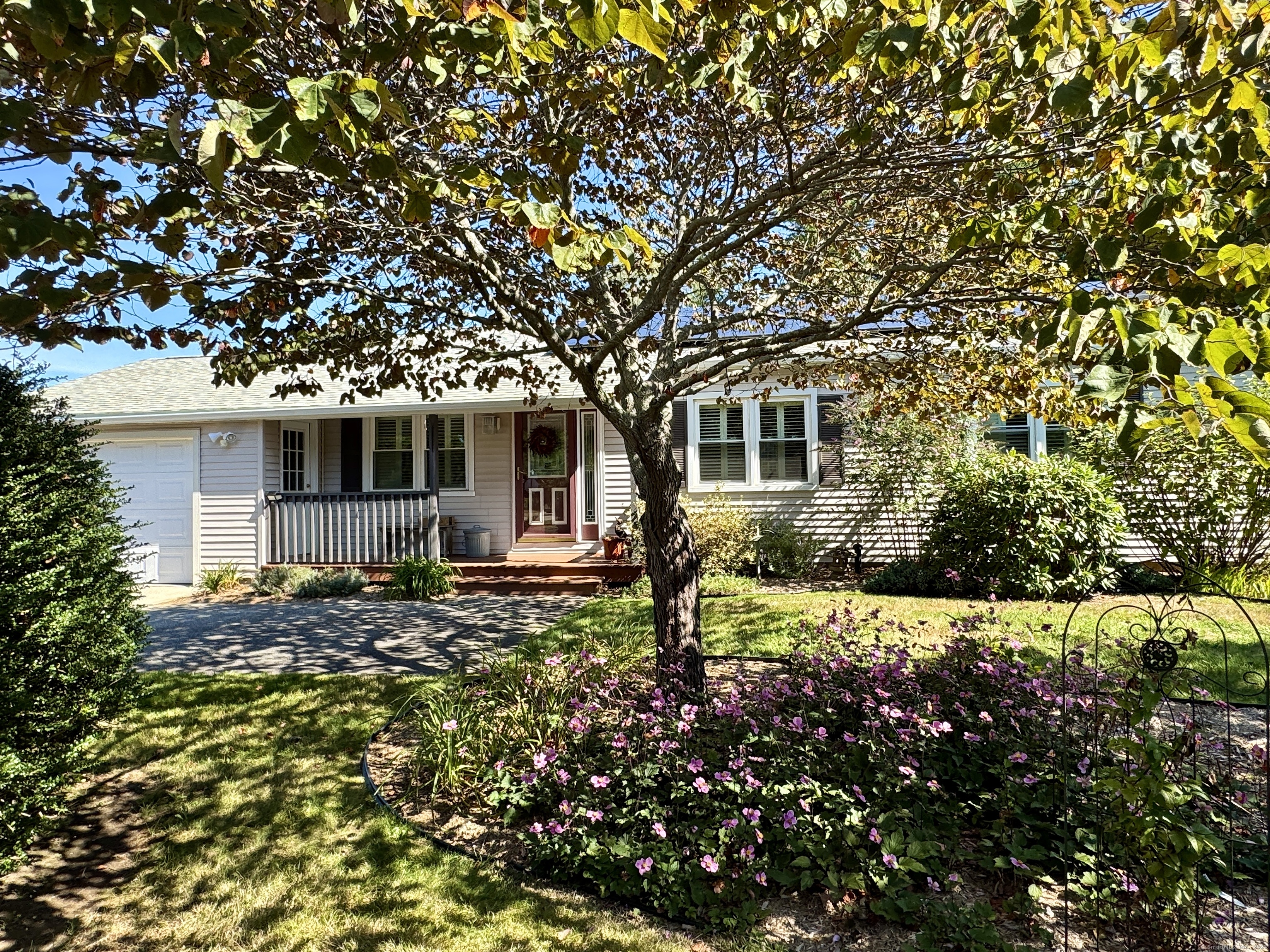 Looking for easy, one-level living in Mystic? This well-loved home on a quiet dead-end road offers the perfect blend of privacy and convenience on a beautiful half-acre lot. The updates and improvements have been plentiful since the owner purchased the property in 2010. Inside, the open and inviting floor plan includes a comfortable living area, a full bath with shower, and a study - ideal for a home office. The updated kitchen features newer cabinets, a gas range, Corian countertops, and a breakfast bar. From here, step out to a spacious deck shaded by a pergola wrapped in Trumpet Vine and Climbing Hydrangea. It's the perfect spot for relaxing, entertaining, or enjoying the fenced yard below - great for pets or play. Three bedrooms, each with ceiling fans, are set apart on the opposite end of the home, along with a second full bath. A convenient laundry room with a utility sink, backyard access, and brand-new furnace and boiler (installed in 2023) adds extra ease and efficiency. Here's the best part: with owned solar panels, you'll enjoy little to no electric bill - even during the summer months when the central A/C is keeping you cool! Additional highlights include public sewer and water connections plus a private well for outdoor watering. The landscaped yard is filled with colorful perennials, making this home just as inviting outside as it is inside. Schedule your showing today - this one won't last! Offer deadline is Sunday, Oct. 5th, by 5pm.