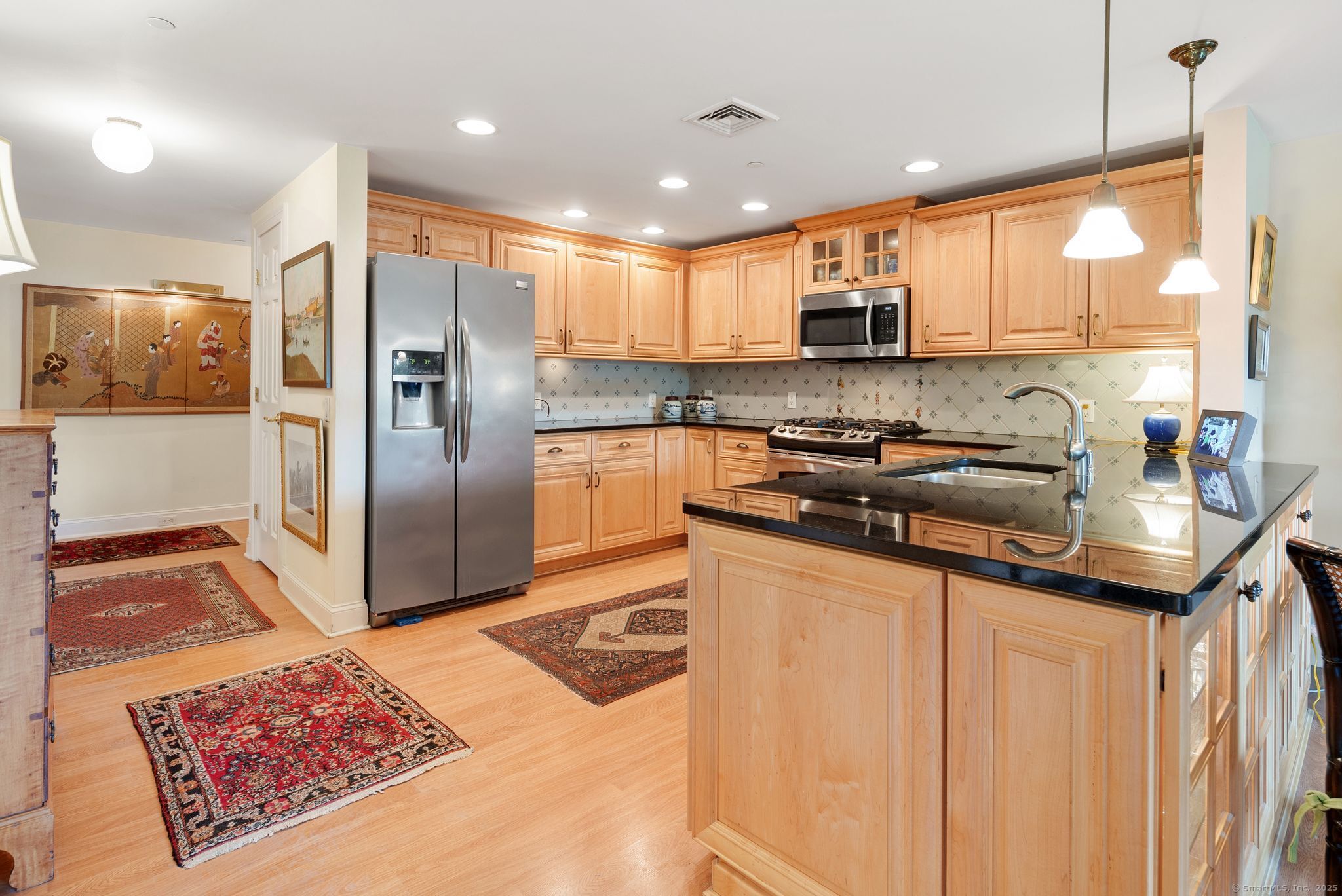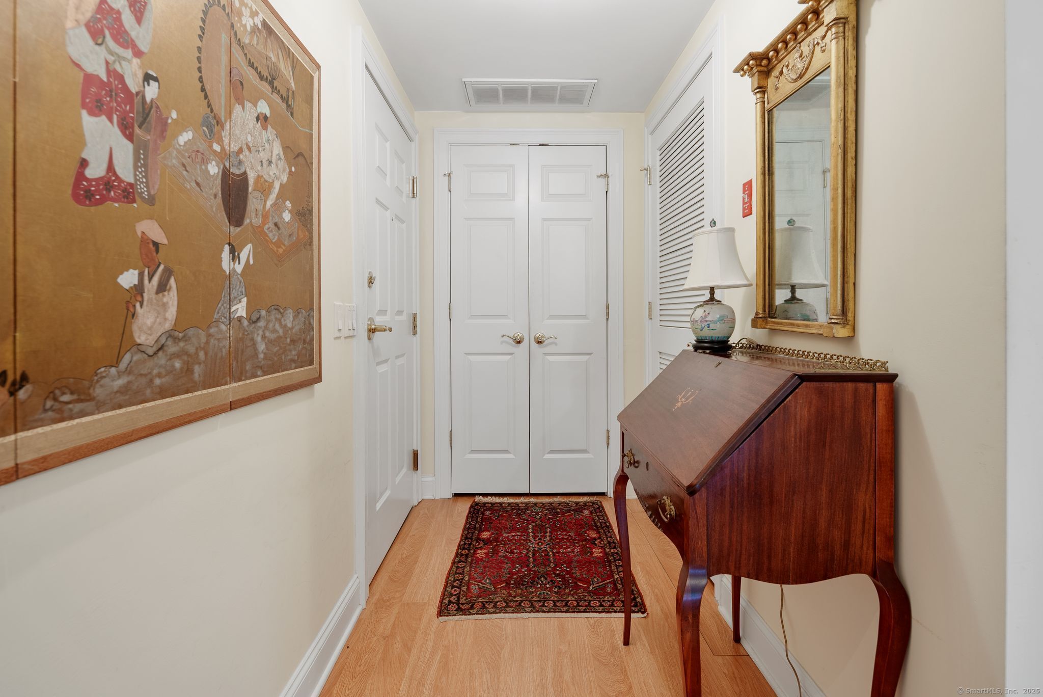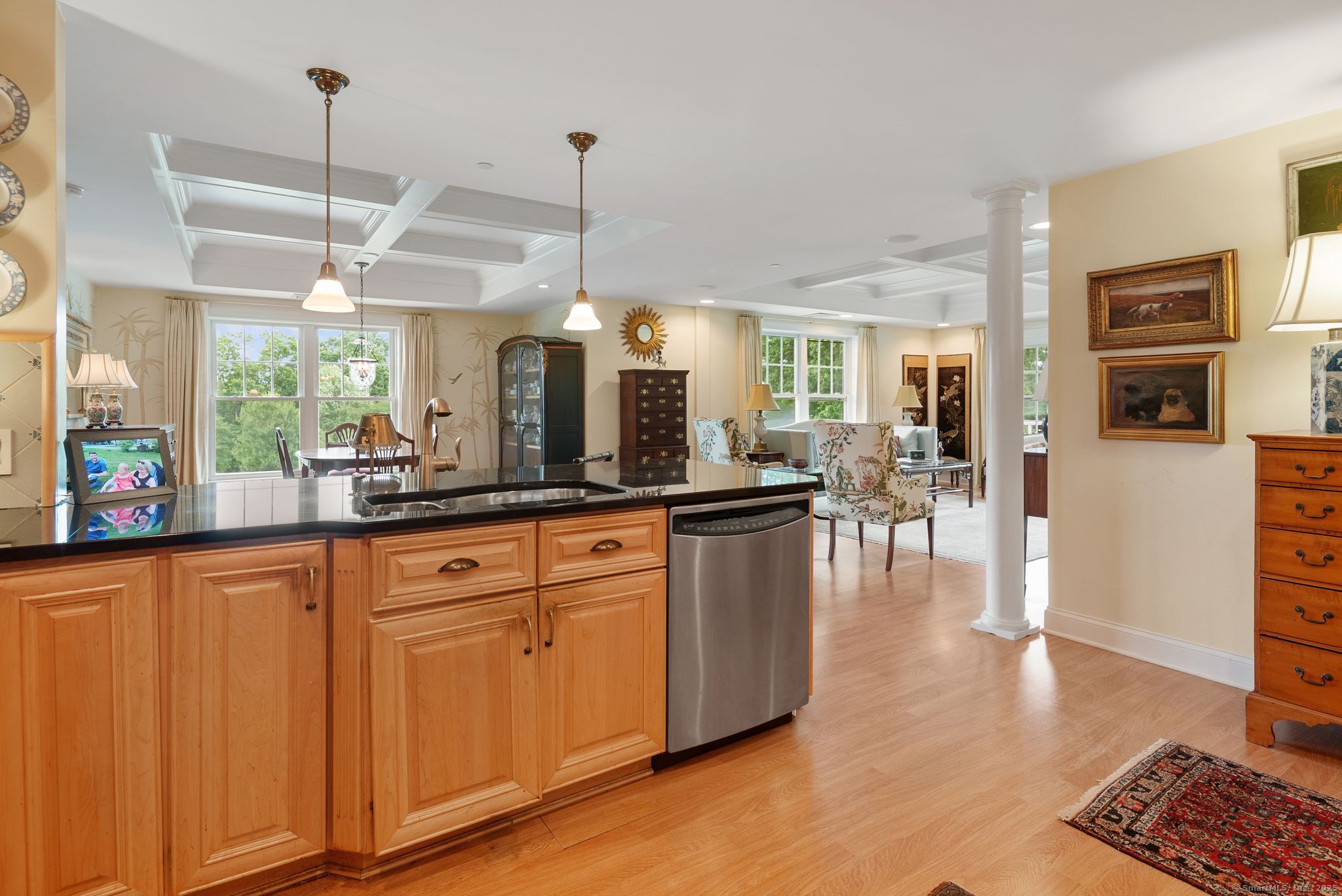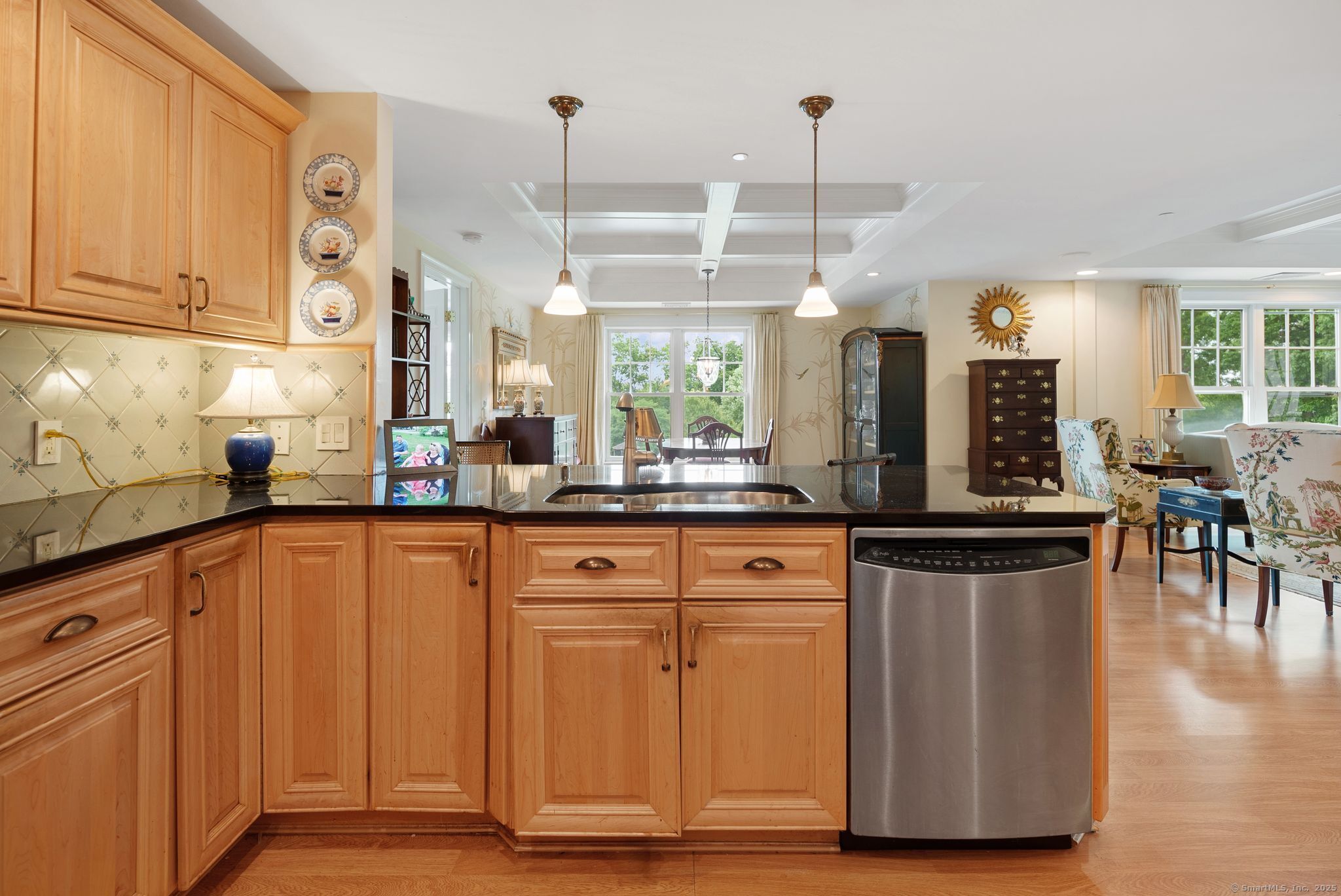 Rarely available at Fernwood Estates! This spacious and unique 3rd floor corner unit offers a sought-after layout with approx 1,600 square feet of thoughtfully designed living space. The 2 spacious bedrooms are smartly separated for maximum privacy. An open concept design features an expansive living and dining area seamlessly connected to a well-appointed kitchen - perfect for entertaining or relaxing. Natural light pours in from the many windows and doors, creating a bright and inviting atmosphere throughout. The kitchen is a standout with ample cabinetry and generous counter space, ideal for the culinary enthusiast. The primary suite boasts a private full bath and stunning views while the second bedroom is currently enjoyed as a library/den, complete with attractive built-ins an ideal spot for your favorite book collection, home office, or cozy retreat. Step outside onto your private balcony and enjoy fresh air along with picturesque views of the Heublein Tower and the complex's front gazebo-an amenity that sets this unit apart. Additional highlights include gas heat, central air, central vacuum, two assigned parking spaces conveniently located under the building and a dedicated storage unit. This is one of the most desirable layouts in the complex, offering comfort, space, and style in a well-maintained 55+ community. Additional features include a shared rear patio with BBQ area, a community room ideal for gatherings, a fitness room and a close proximity to Elizabeth Park