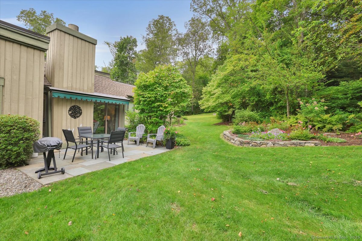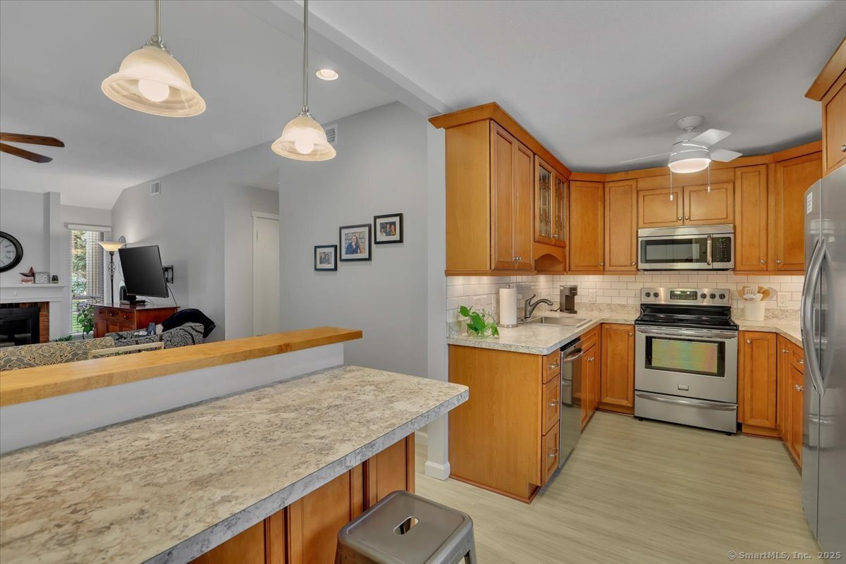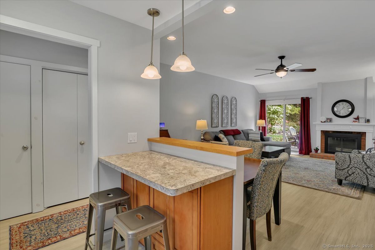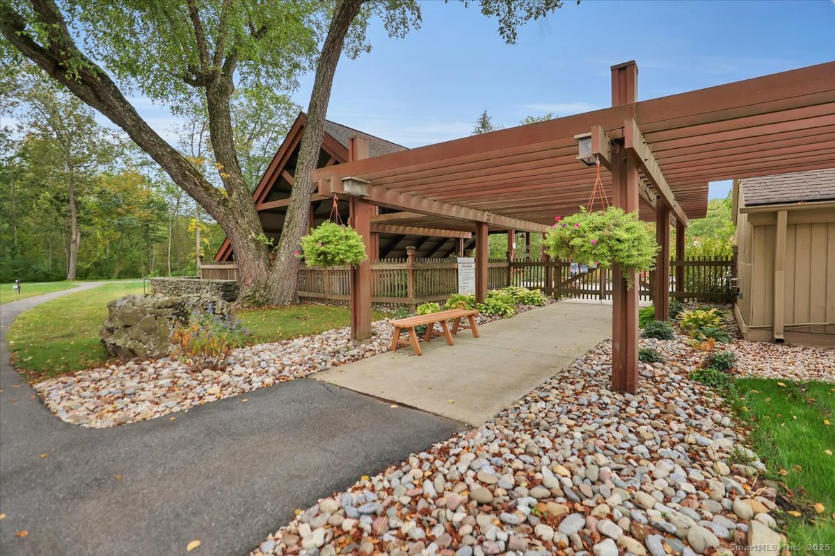 Desirable Winthrop Model Unit located in the Hill Top section of Heritage Village! A short walk to unit D & the 1st garage makes this unit worth a look! With an updated custom kitchen & plenty of storage, under cabinet lighting, breakfast bar with storage & SS appliances. A spacious living room with a Fplc, laminate flooring & a newer slider that opens to the patio. This beautiful patio has already been extended & has a convenient remote awning. Just off the patio you will see the stunning garden area! There are 2 generous sized bedrooms & a full bath. The primary bedroom offers a private full bath & a cozy window seat. These units will be painted next week & the parking area & roofs have already been done!