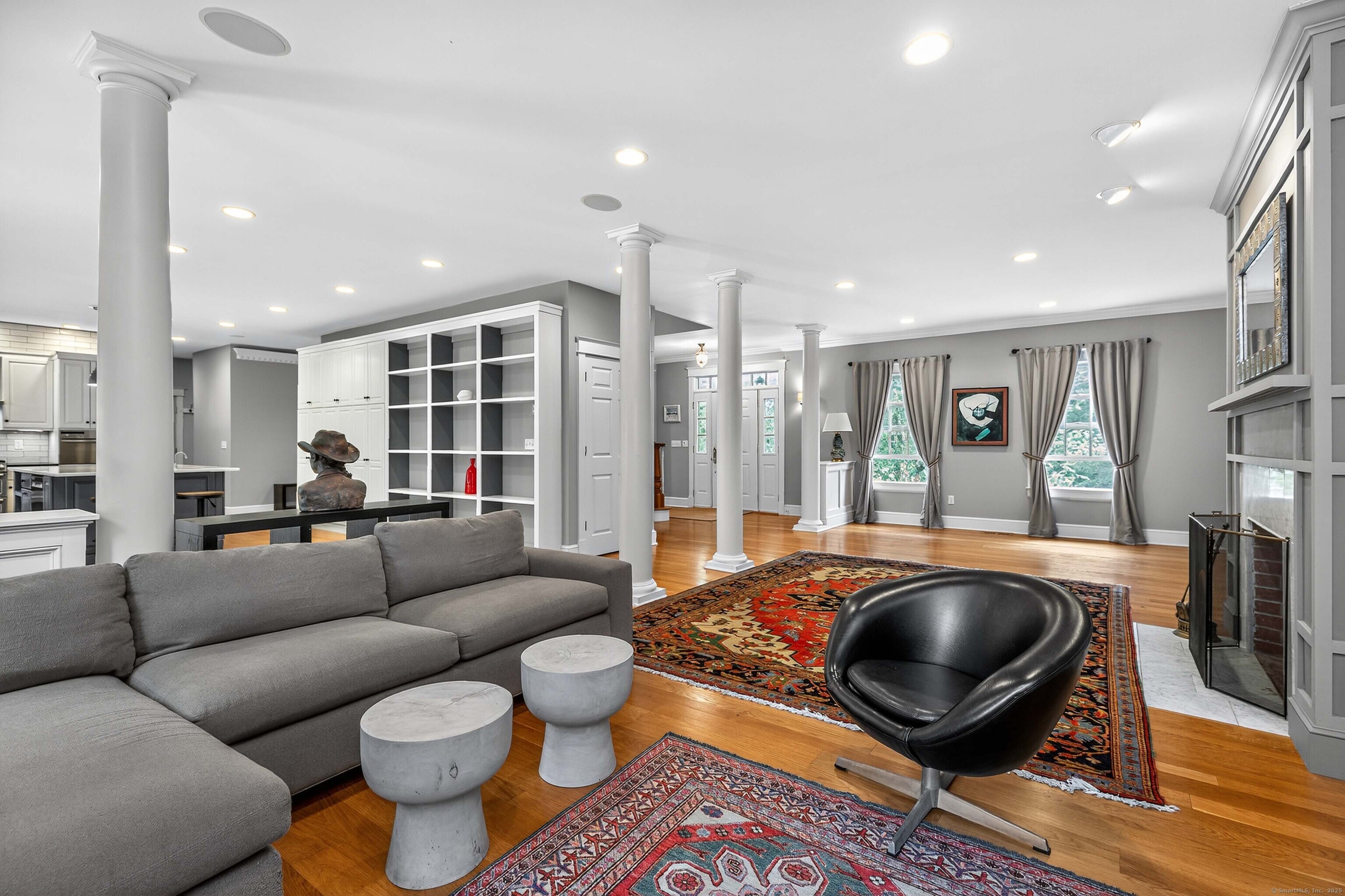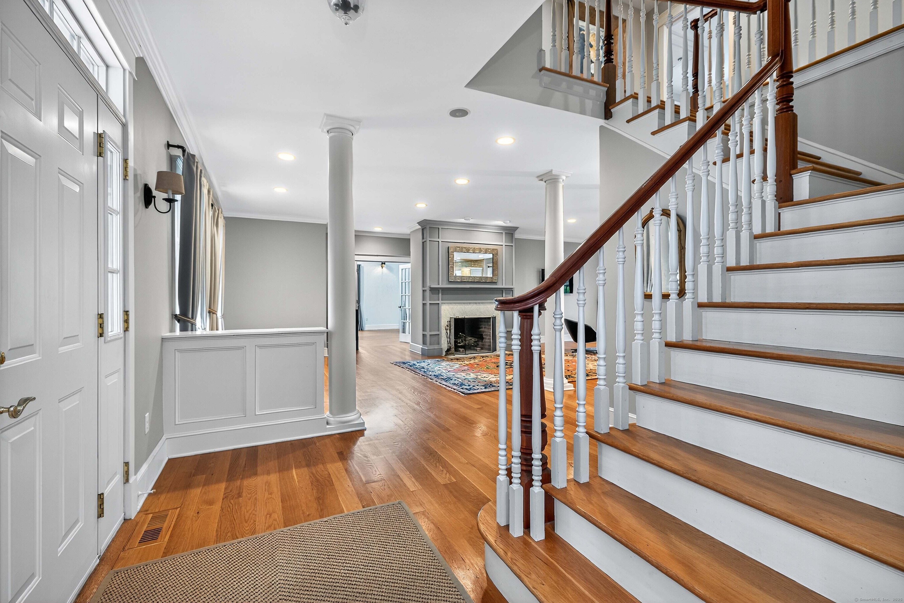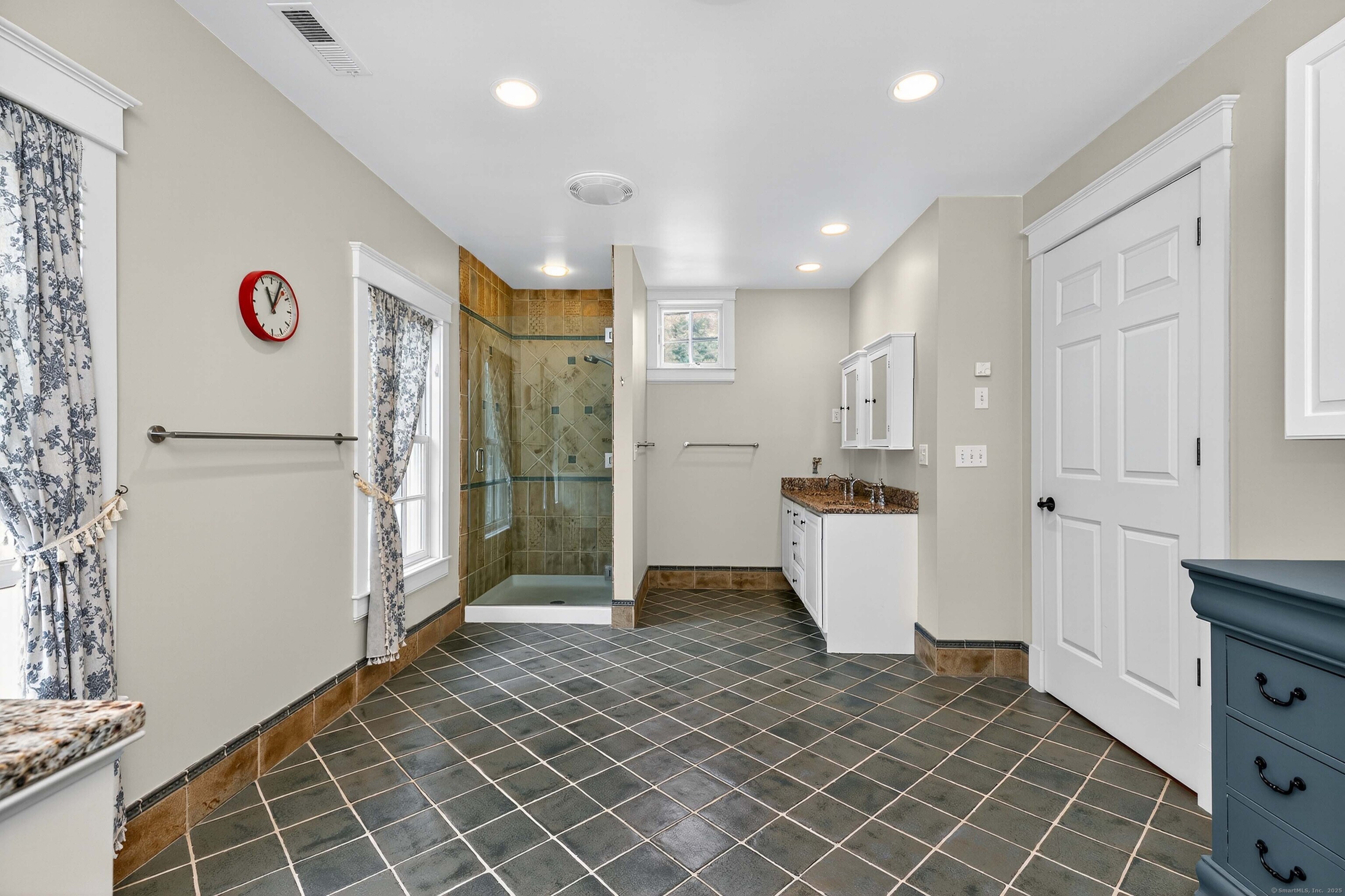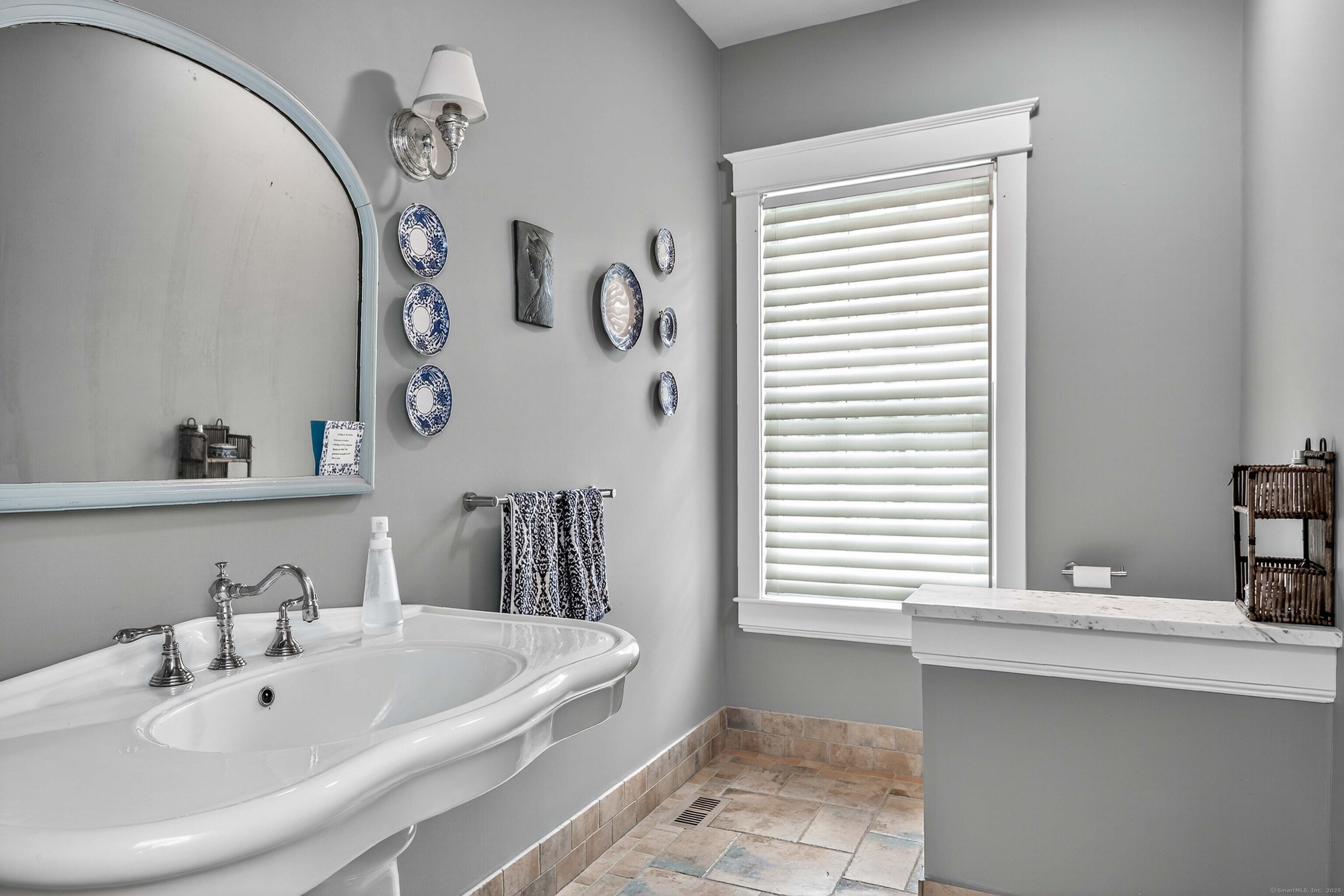 In the heart of historic Litchfield CT, this 2004 colonial sits on a private 1-acre flag lot a short walk to the Green. 4,065sqft with an open, light-filled layout, 9ft ceilings, and wide-plank white oak floors. The great room with fireplace connects to the 2023 kitchen with granite counters, GE Cafe appliances, a Viking wine fridge, and a Miele steam oven. A library with a 16.5ft cathedral ceiling has radiant heat. A powder room with brick courtyard tile, a laundry with granite-effect tile and large sink, and a mudroom with a half bath complete the main level. Upstairs, the primary suite has a tray ceiling, Italian-tiled bath with radiant heat, and plumbing for a spa tub. 2 additional en-suite bedrooms have custom-tiled baths (1 with spa tub). A 400sqft bonus room with window seats sits over the 3-car garage.The 1,600sqft walkout basement (8ft ceilings, historic windows) suits a gym, office, or apartment. Exterior features include a columned entry with granite steps, red brick walkways, 46 Woodwright windows with custom trim/shutters, a paved 24ft driveway with turnaround, and a 3-car garage with 10ft bays, workshop, and masonry floor. A private deck, hot tub, landscaped gardens, evergreens, and fieldstone walls create a quiet in-town setting.Systems: 4-zone geothermal on the 1st floor; oil furnace with AC upstairs; rubberized basement walls; 20-gpm well; city sewer; 240V outlets; insulated attic;Recent updates: GAF roof (Oct 2024), , fresh Benjamin Moore exterior paint.