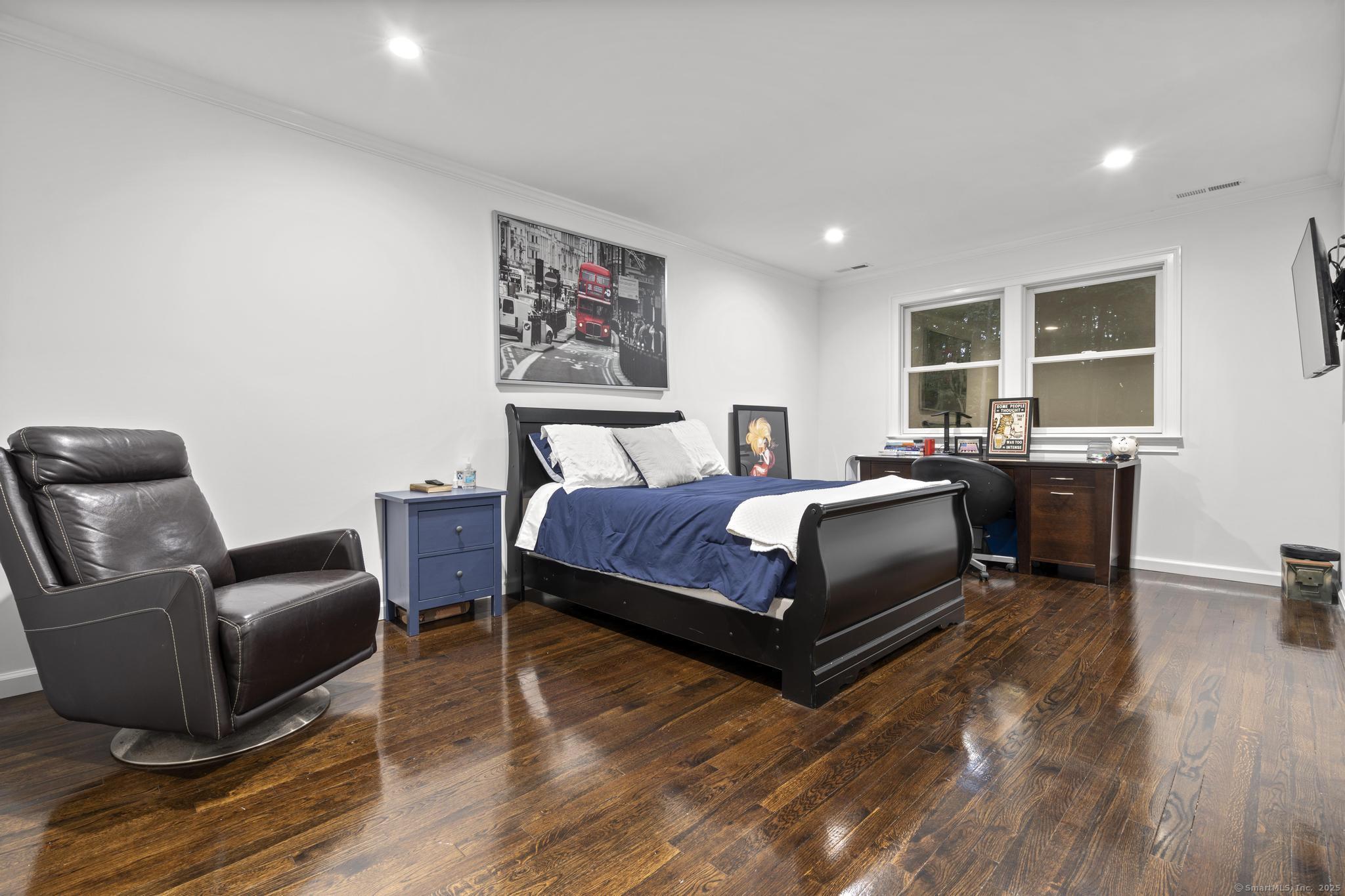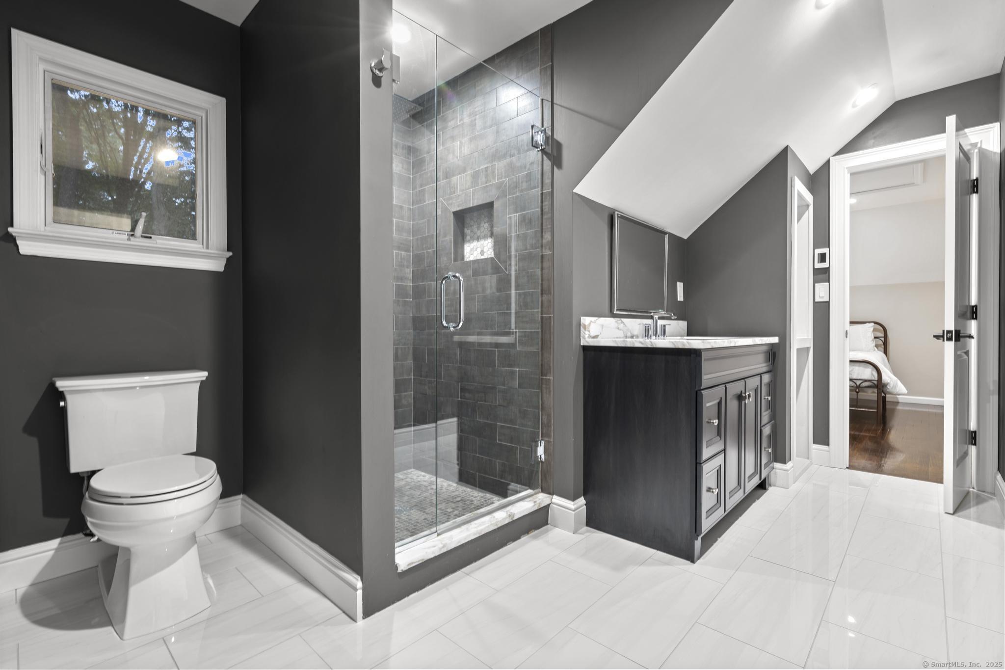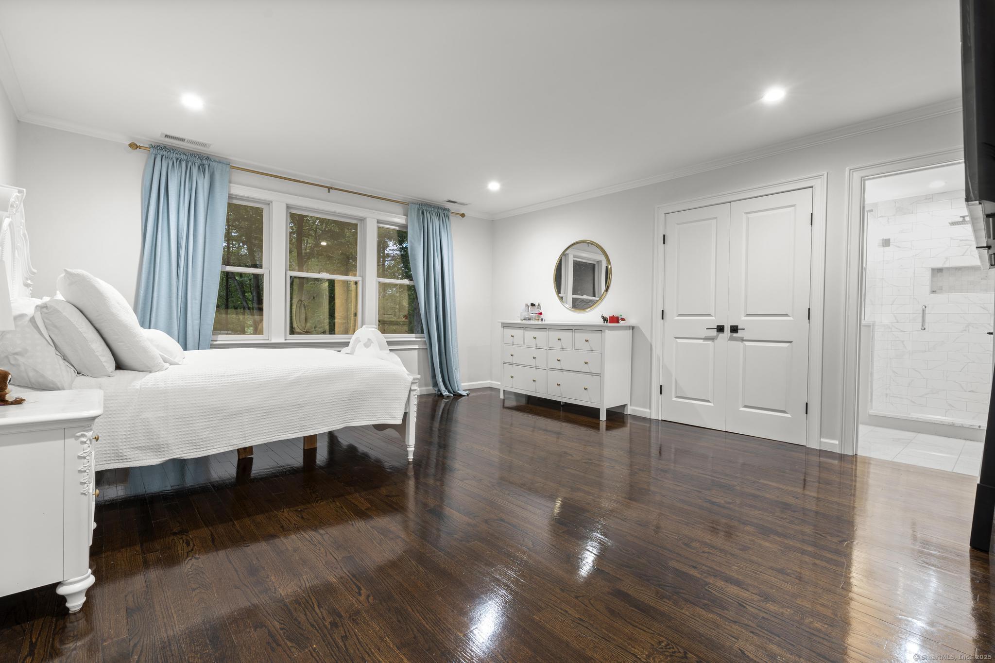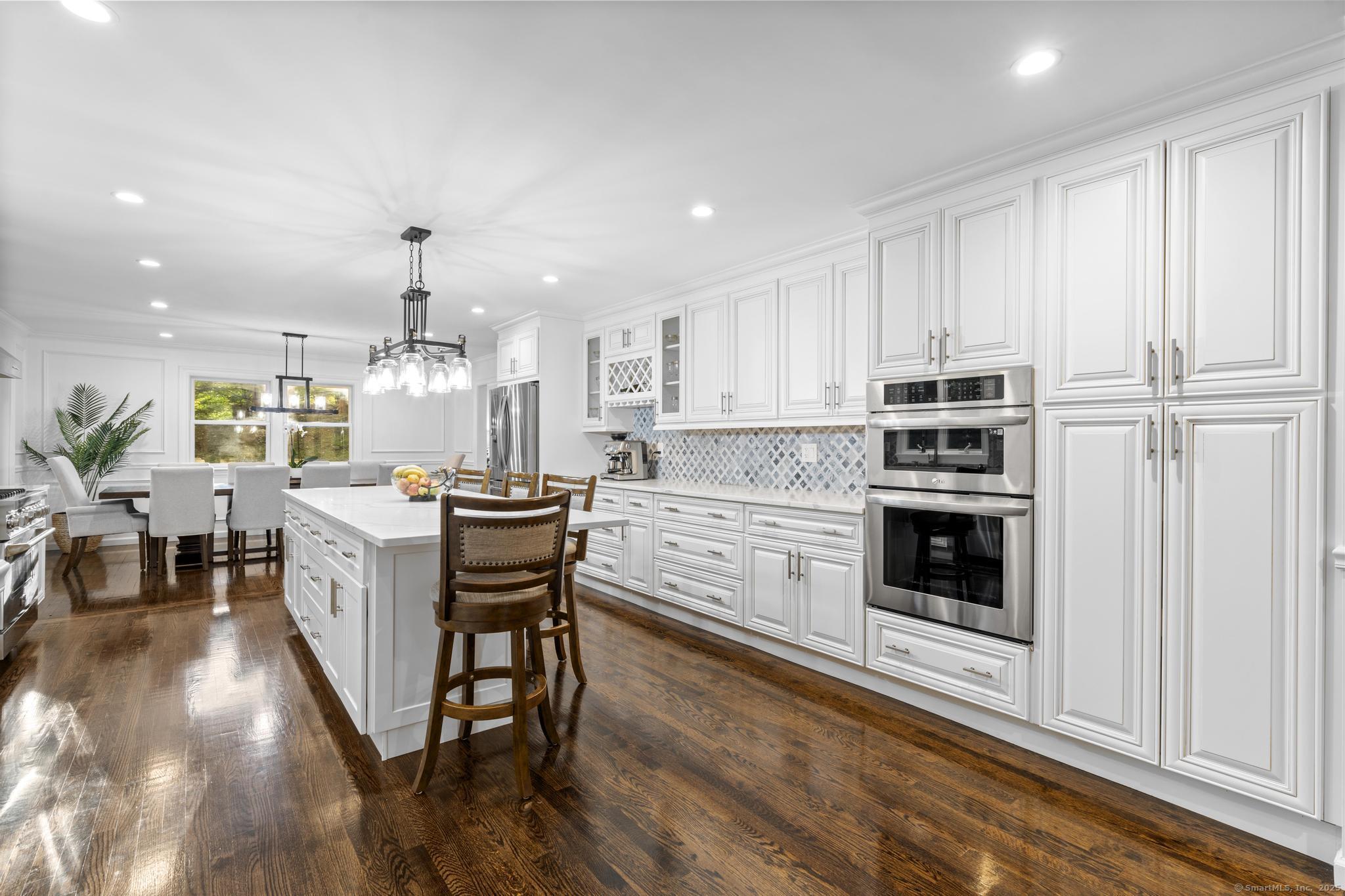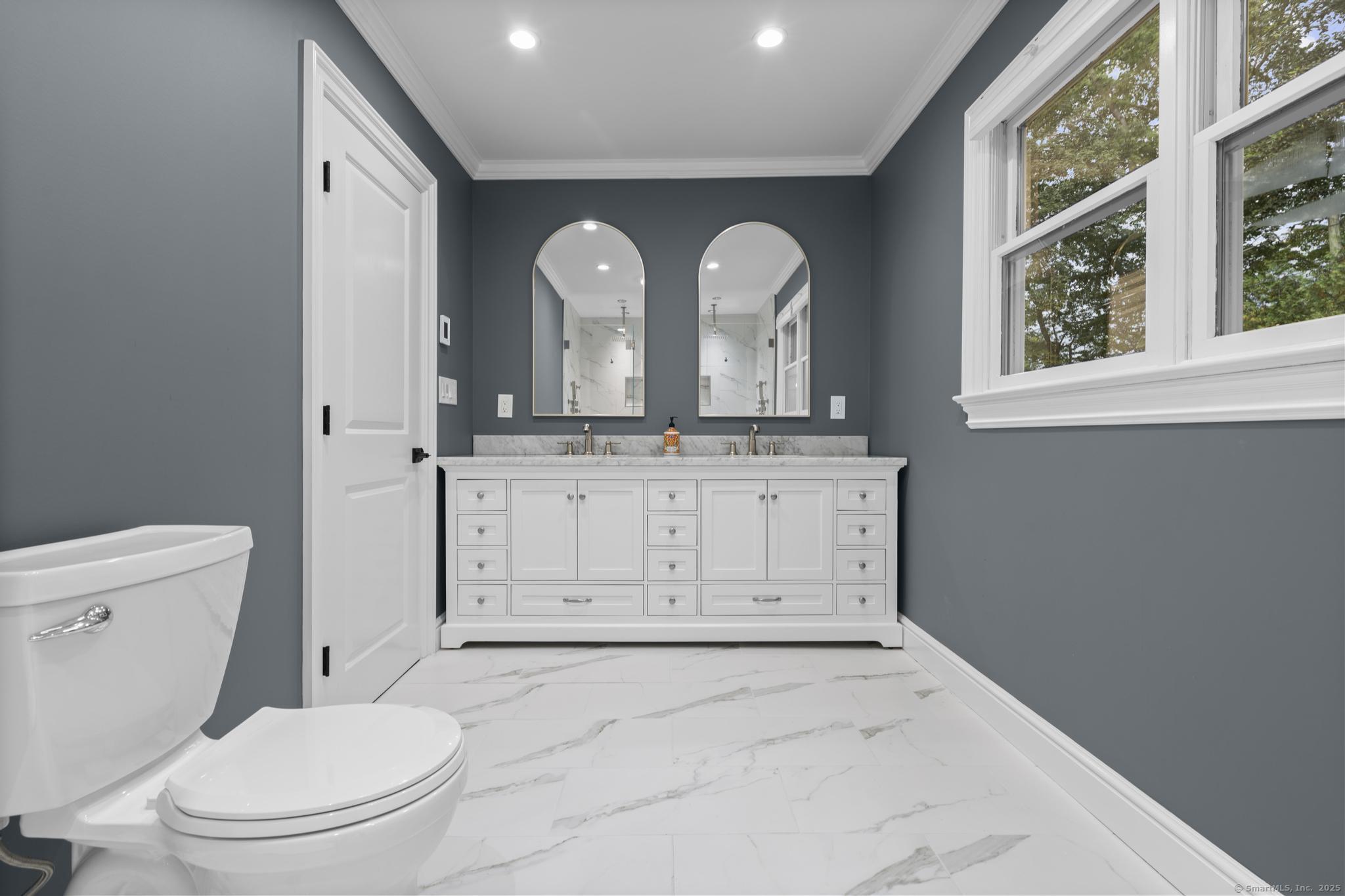 Welcome to this exceptional 5-bedroom, 5.5-bathroom residence in Stamford's highly coveted Westover neighborhood, thoughtfully and completely renovated to offer the perfect blend of modern luxury and timeless elegance. Nestled on a private, manicured lot, the property features beautifully lit stone columns, walls and a granite walkway and landing that set the tone for this spacious family retreat. Inside, you're greeted by a dramatic curved staircase with detailed millwork, leading to a large formal living room, dining room and a stunning open-concept kitchen featuring a 9-foot quartz island, 6-burner gas stove, pantry and top-tier appliances. The kitchen flows seamlessly into a warm and inviting family room with a wood-burning fireplace and sliders to the outside, followed by a mudroom and full bathroom. Unique to this home is the generous first-floor primary suite, complete with walk-in closet, a spa-inspired bathroom featuring radiant heated floors, dual vanities and an oversized shower. A large home office with custom built-ins and half bathroom complete the main level. Upstairs, you'll find four spacious ensuite bedrooms, as well as a media room with soaring cathedral ceilings and a private balcony overlooking the pool. The recently finished basement includes a fully equipped home gym, expansive recreation area and a custom laundry room with built-in counter and laundry sink. The interior has been freshly painted with custom millwork.