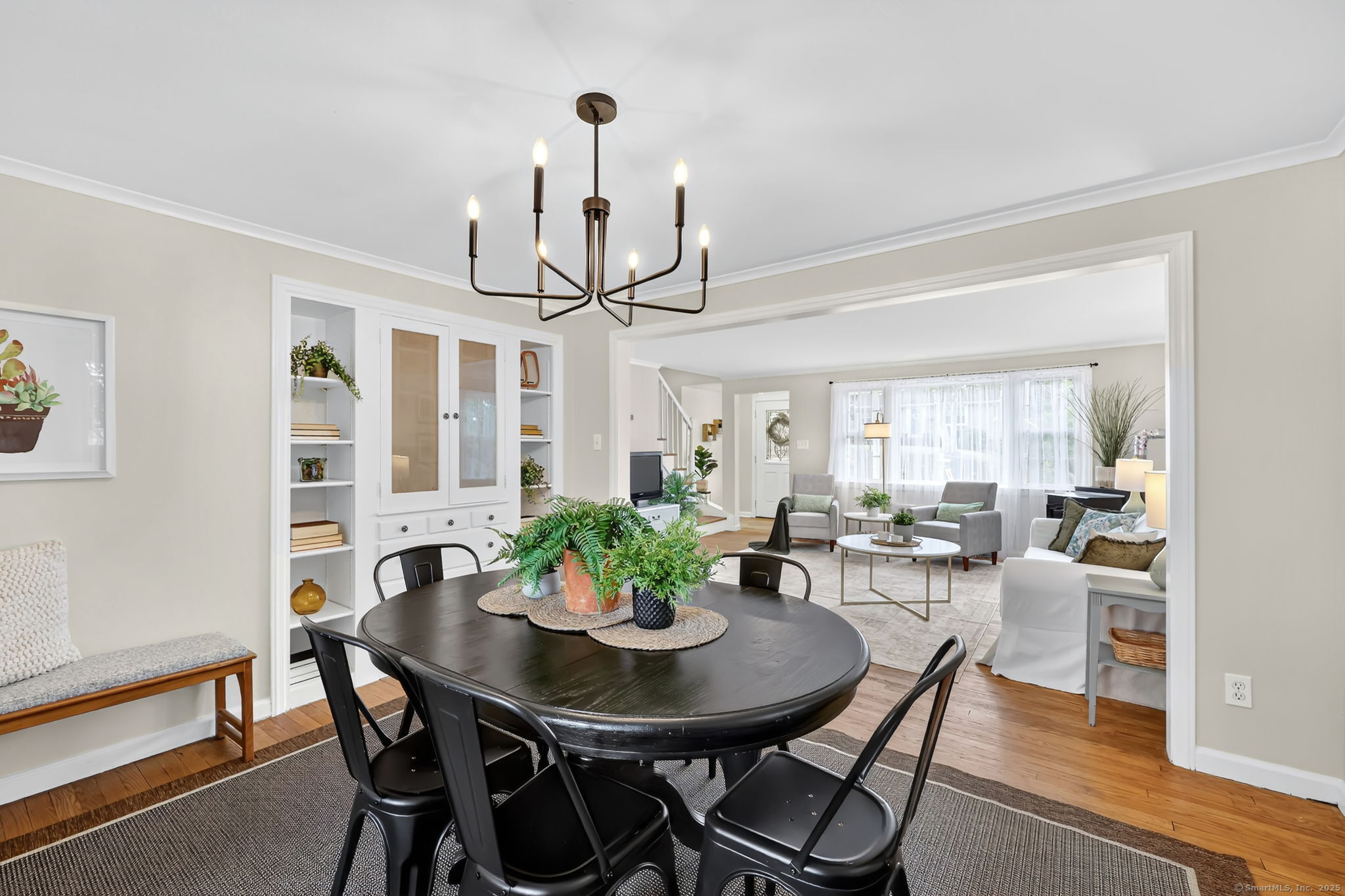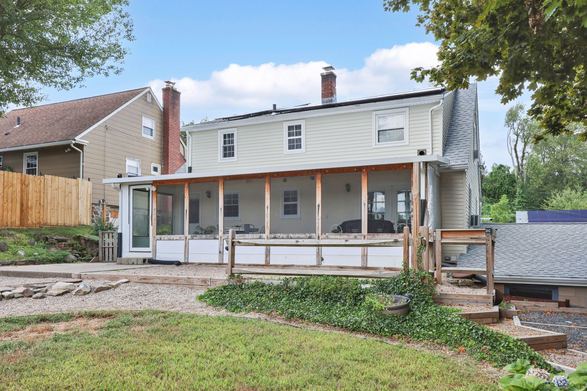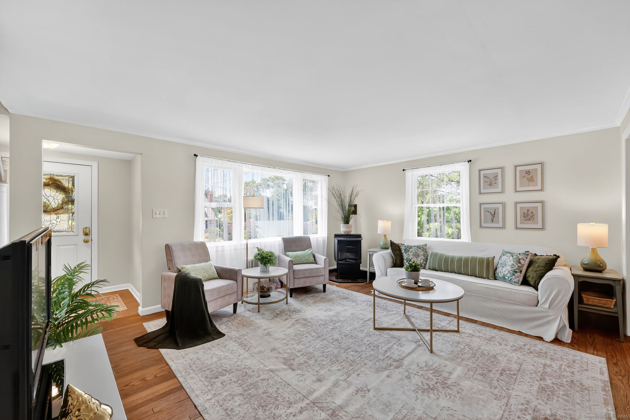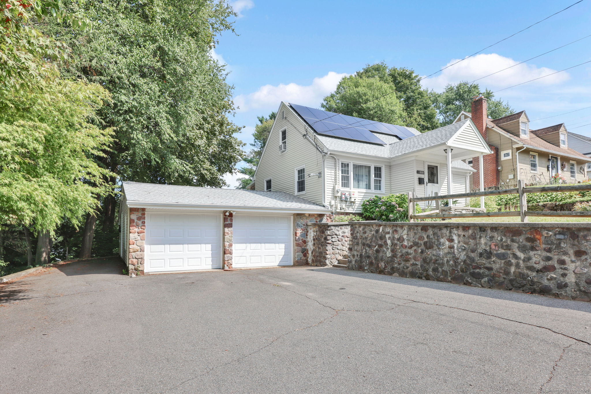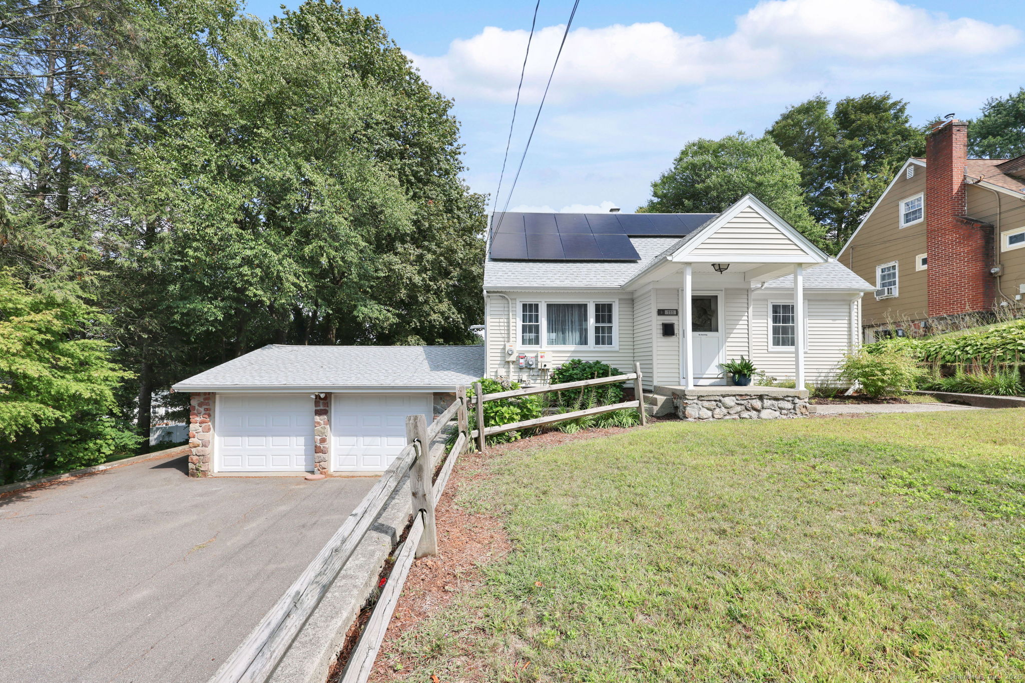Welcome home to this beautifully maintained 3-bedroom, 2-bath Cape in a sought-after Bristol neighborhood! The sun-filled living room greets you with warmth and charm, flowing seamlessly into the dining room for everyday meals or memorable gatherings. Built-ins throughout add character and function. French doors lead to a cheerful sunroom, perfect for morning coffee, reading, or evening conversation. The updated kitchen offers wood cabinetry, stainless steel appliances, and ample storage. A convenient first-floor bedroom and full bath complete the main level. Upstairs you'll find two spacious bedrooms and another stylishly updated bath. Step outside to your private, fenced backyard oasis with a patio, mature trees, and room for gardening, play, or summer entertaining. The attached garage with basement entry provides storage and workshop potential. Energy-saving solar panels, gleaming hardwood floors, fresh paint, and vinyl windows make this home move-in ready!