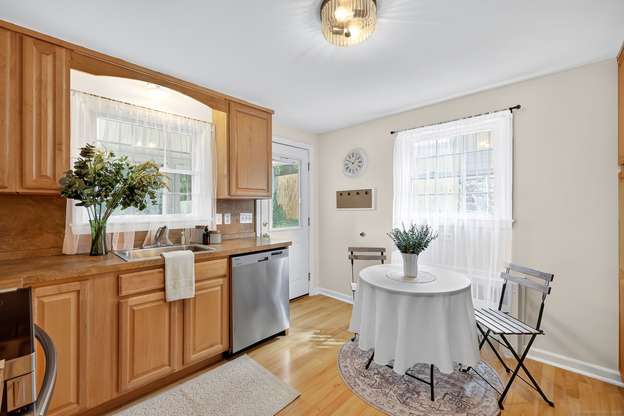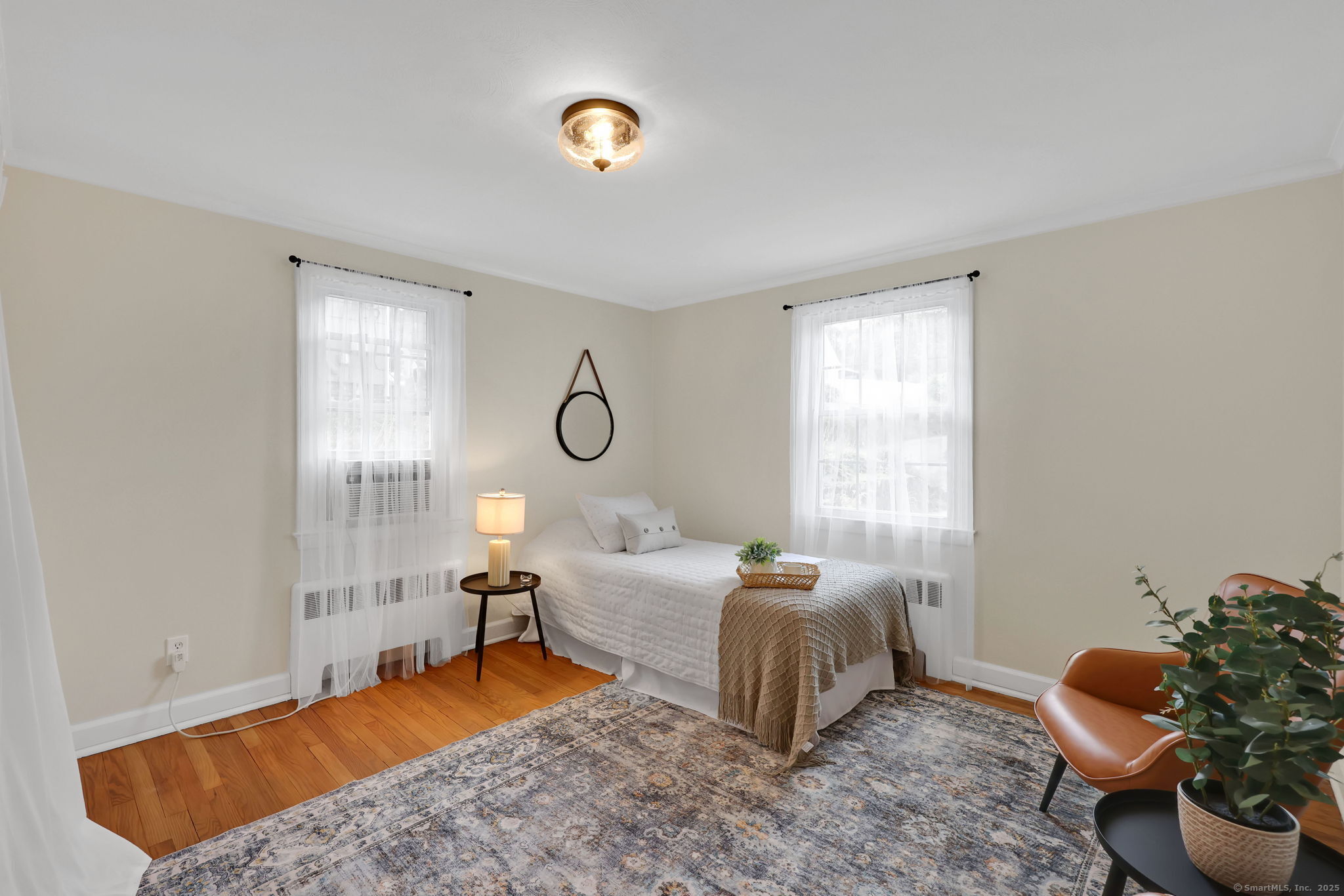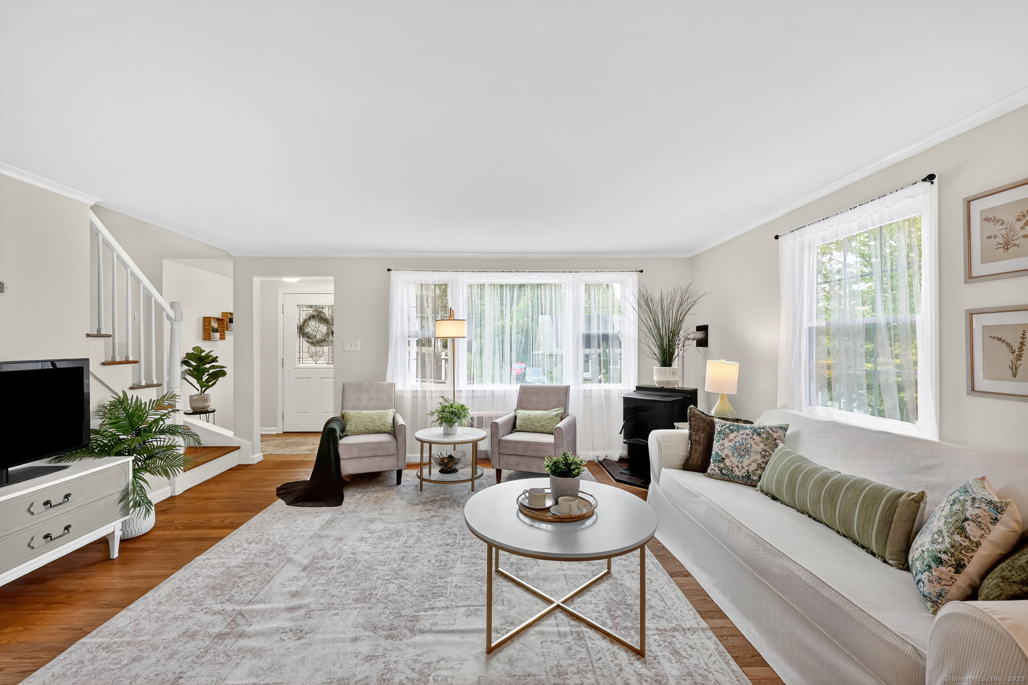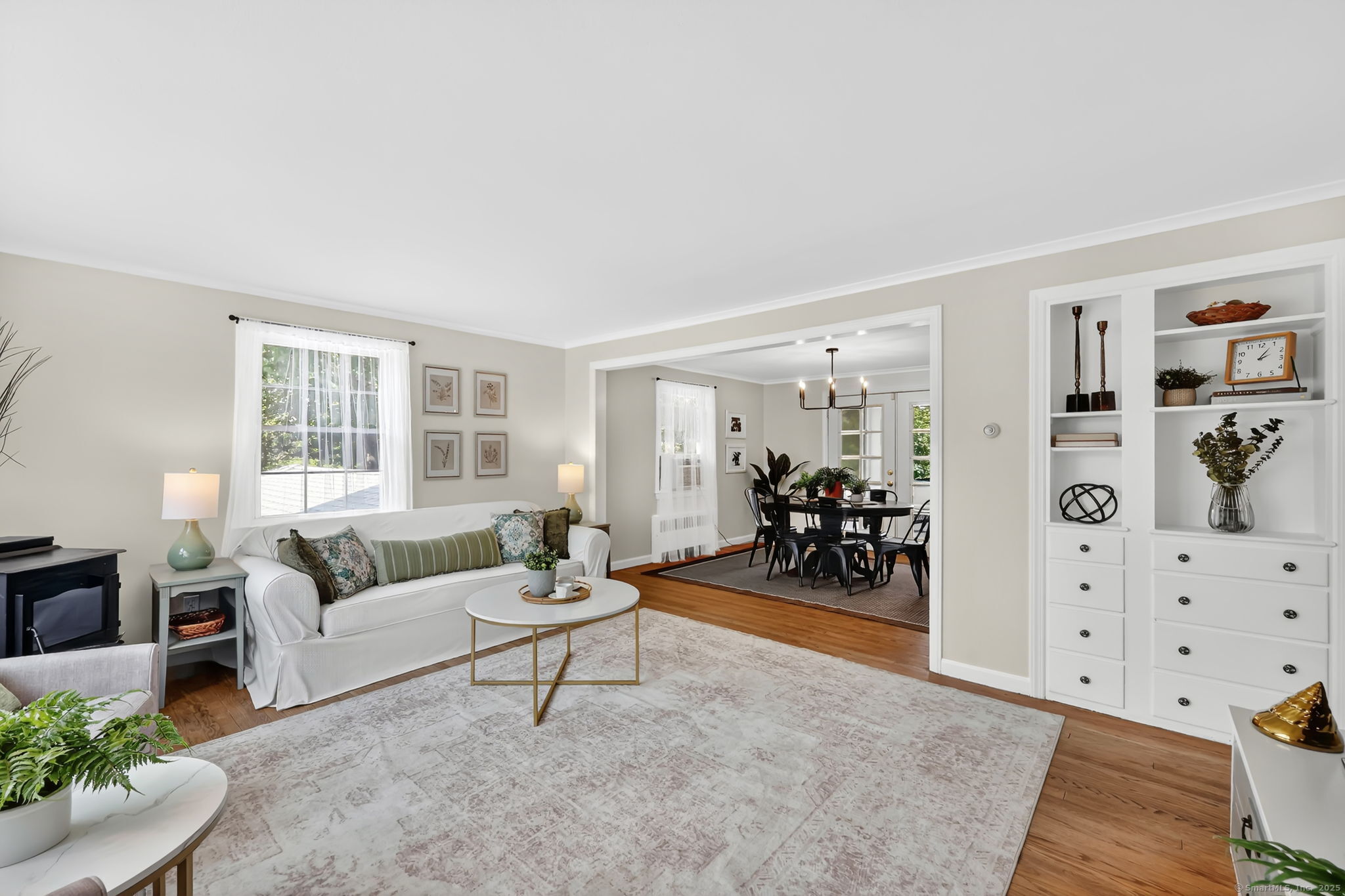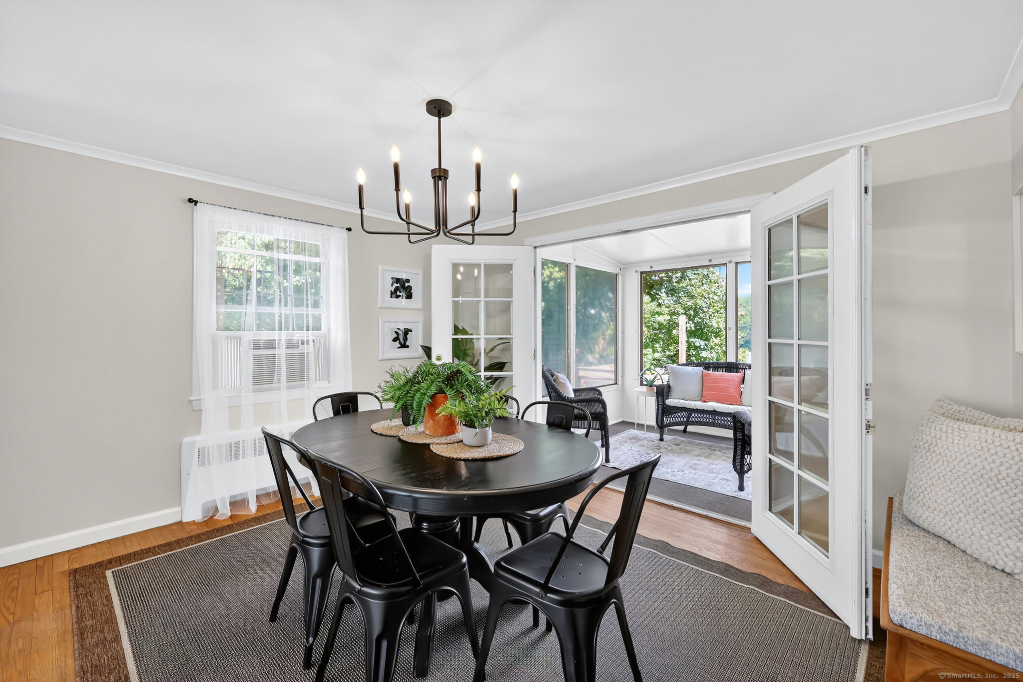 Welcome home to this beautifully maintained 3-bedroom, 2-bath Cape in a sought-after Bristol neighborhood! The sun-filled living room greets you with warmth and charm, flowing seamlessly into the dining room for everyday meals or memorable gatherings. Built-ins throughout add character and function. French doors lead to a cheerful sunroom, perfect for morning coffee, reading, or evening conversation. The updated kitchen offers wood cabinetry, stainless steel appliances, and ample storage. A convenient first-floor bedroom and full bath complete the main level. Upstairs you'll find two spacious bedrooms and another stylishly updated bath. Step outside to your private, fenced backyard oasis with a patio, mature trees, and room for gardening, play, or summer entertaining. The attached garage with basement entry provides storage and workshop potential. Energy-saving solar panels, gleaming hardwood floors, fresh paint, and vinyl windows make this home move-in ready!