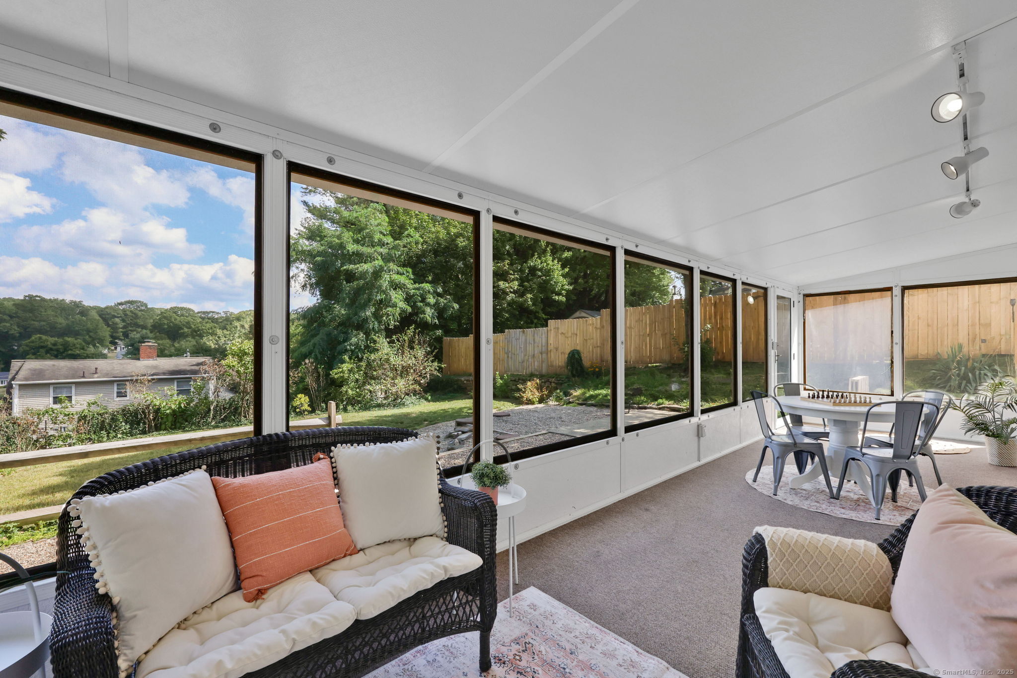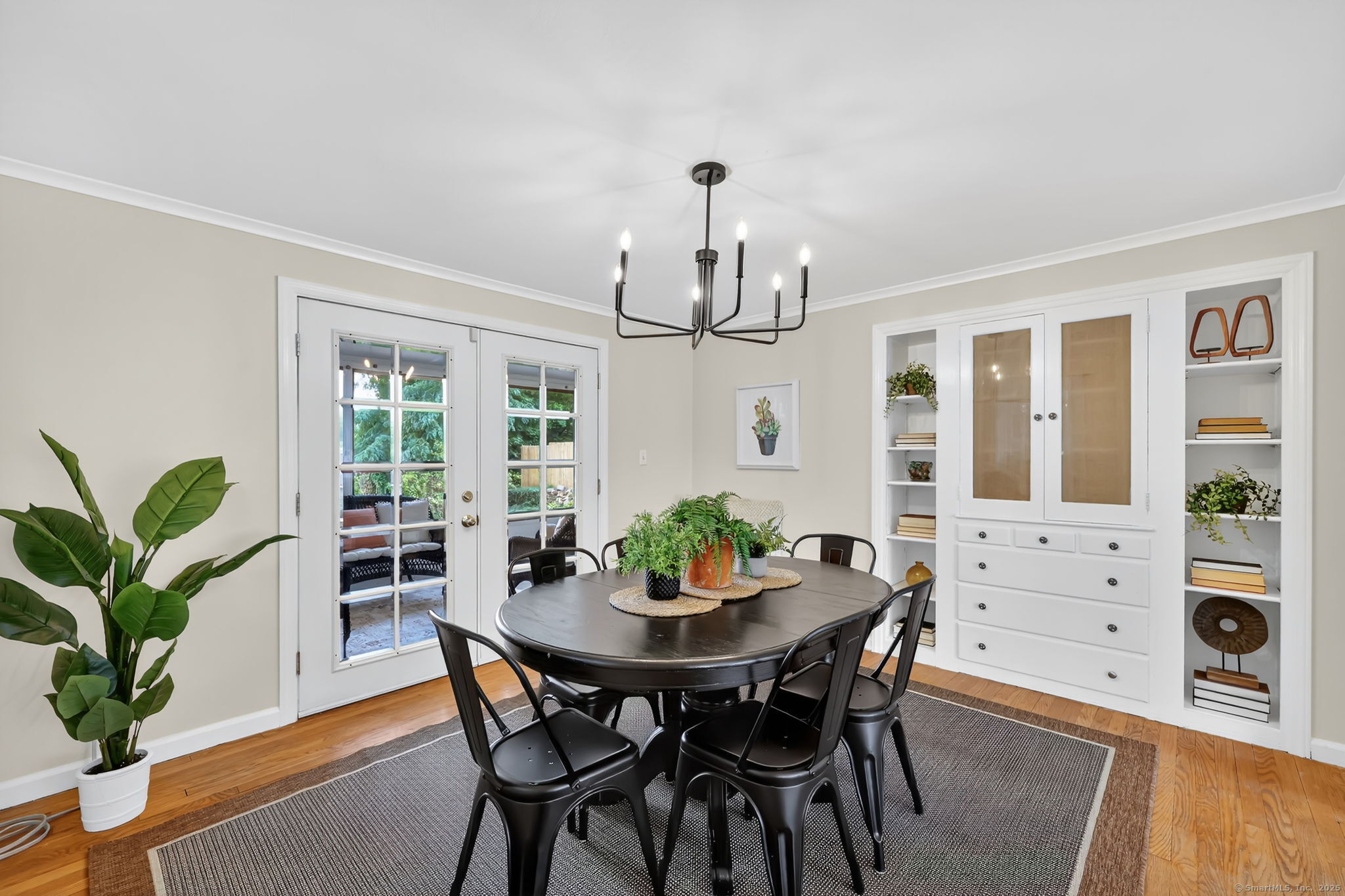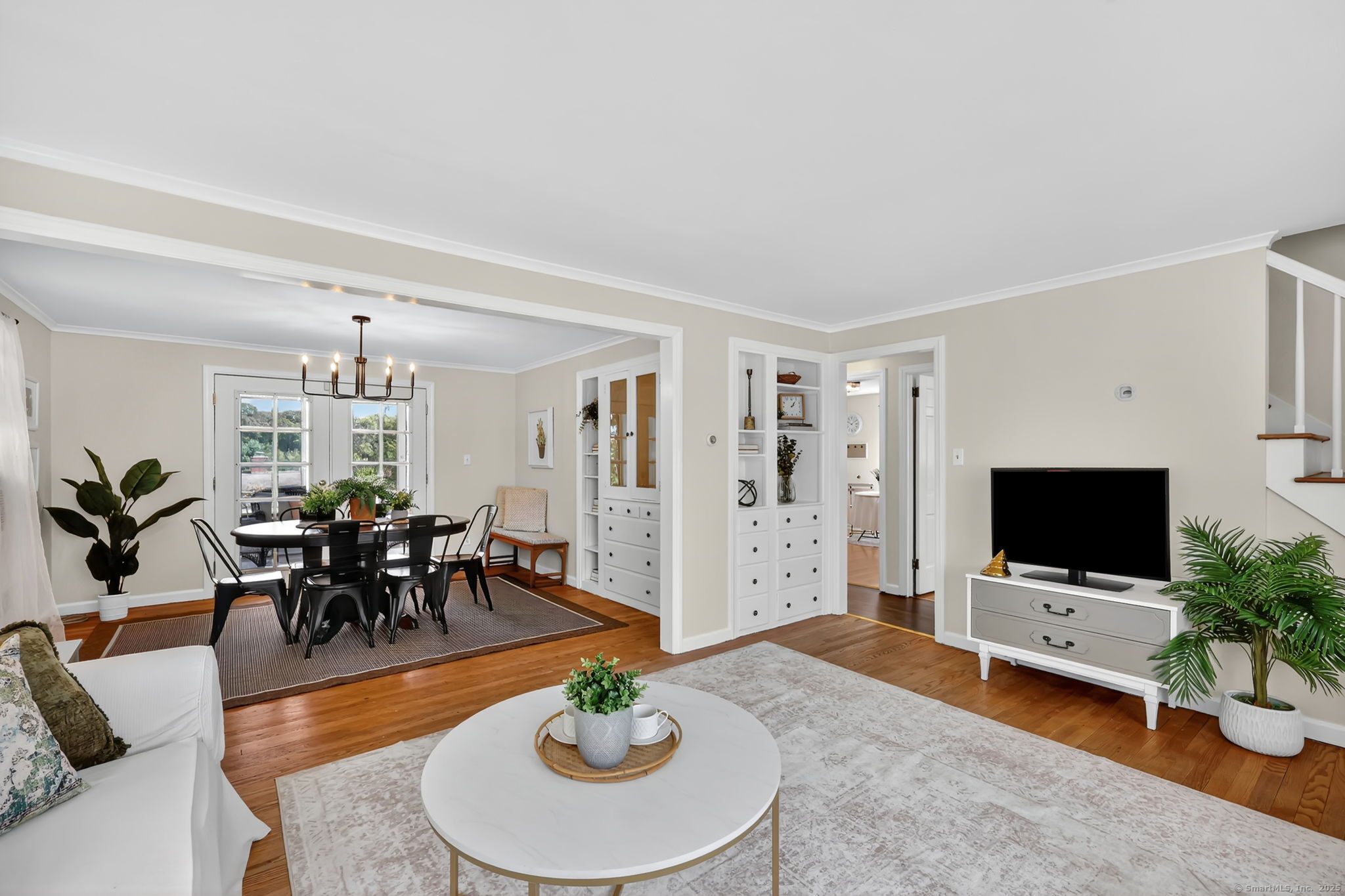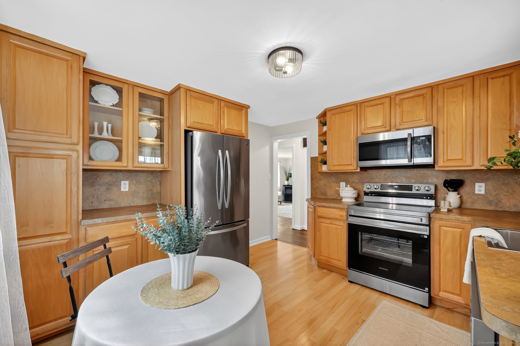 Welcome home to this beautifully maintained 3-bedroom, 2-bath Cape in a sought-after Bristol neighborhood! The sun-filled living room greets you with warmth and charm, flowing seamlessly into the dining room for everyday meals or memorable gatherings. Built-ins throughout add character and function. French doors lead to a cheerful sunroom, perfect for morning coffee, reading, or evening conversation. The updated kitchen offers wood cabinetry, stainless steel appliances, and ample storage. A convenient first-floor bedroom and full bath complete the main level. Upstairs you'll find two spacious bedrooms and another stylishly updated bath. Step outside to your private, fenced backyard oasis with a patio, mature trees, and room for gardening, play, or summer entertaining. The attached garage with basement entry provides storage and workshop potential. Energy-saving solar panels, gleaming hardwood floors, fresh paint, and vinyl windows make this home move-in ready!
