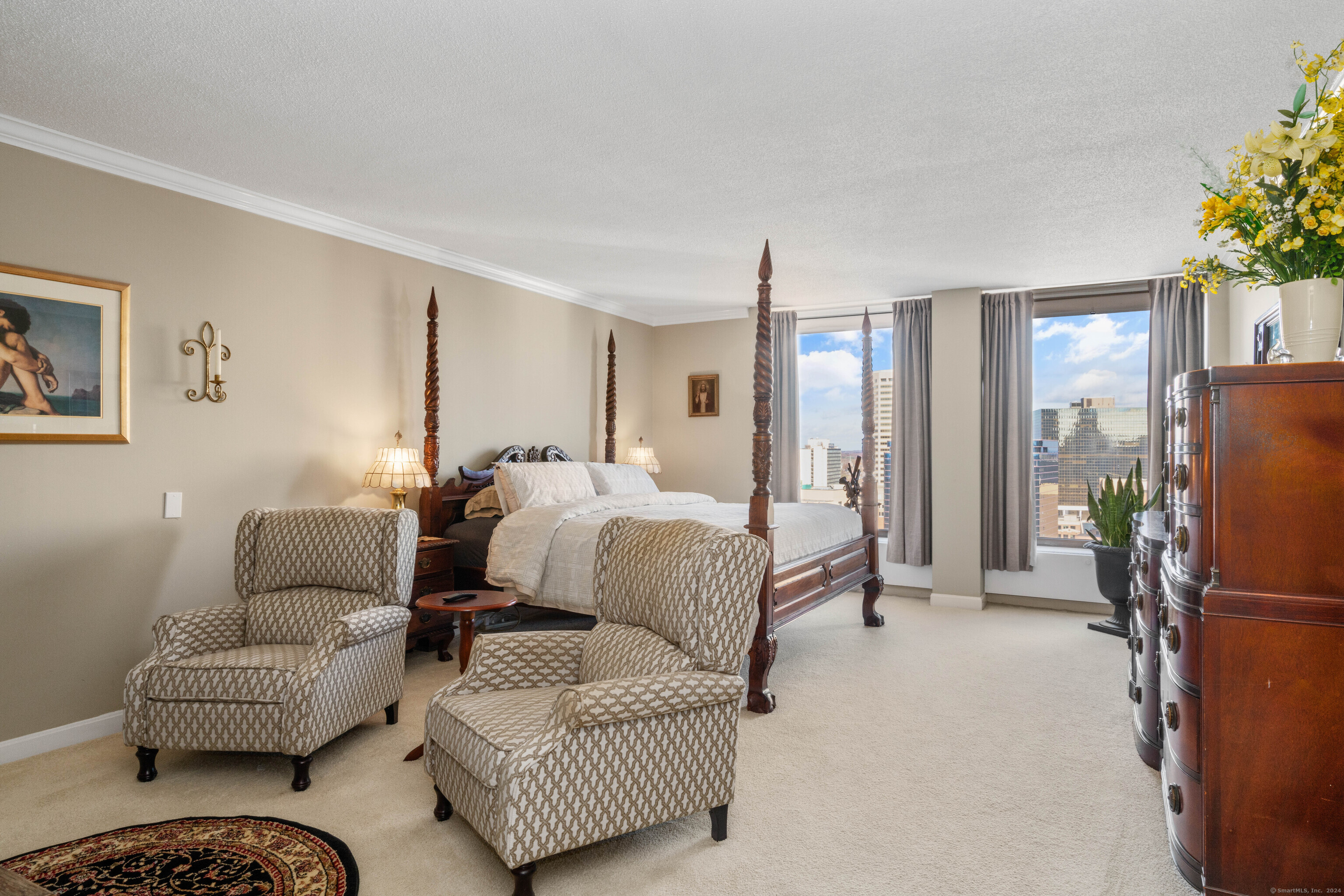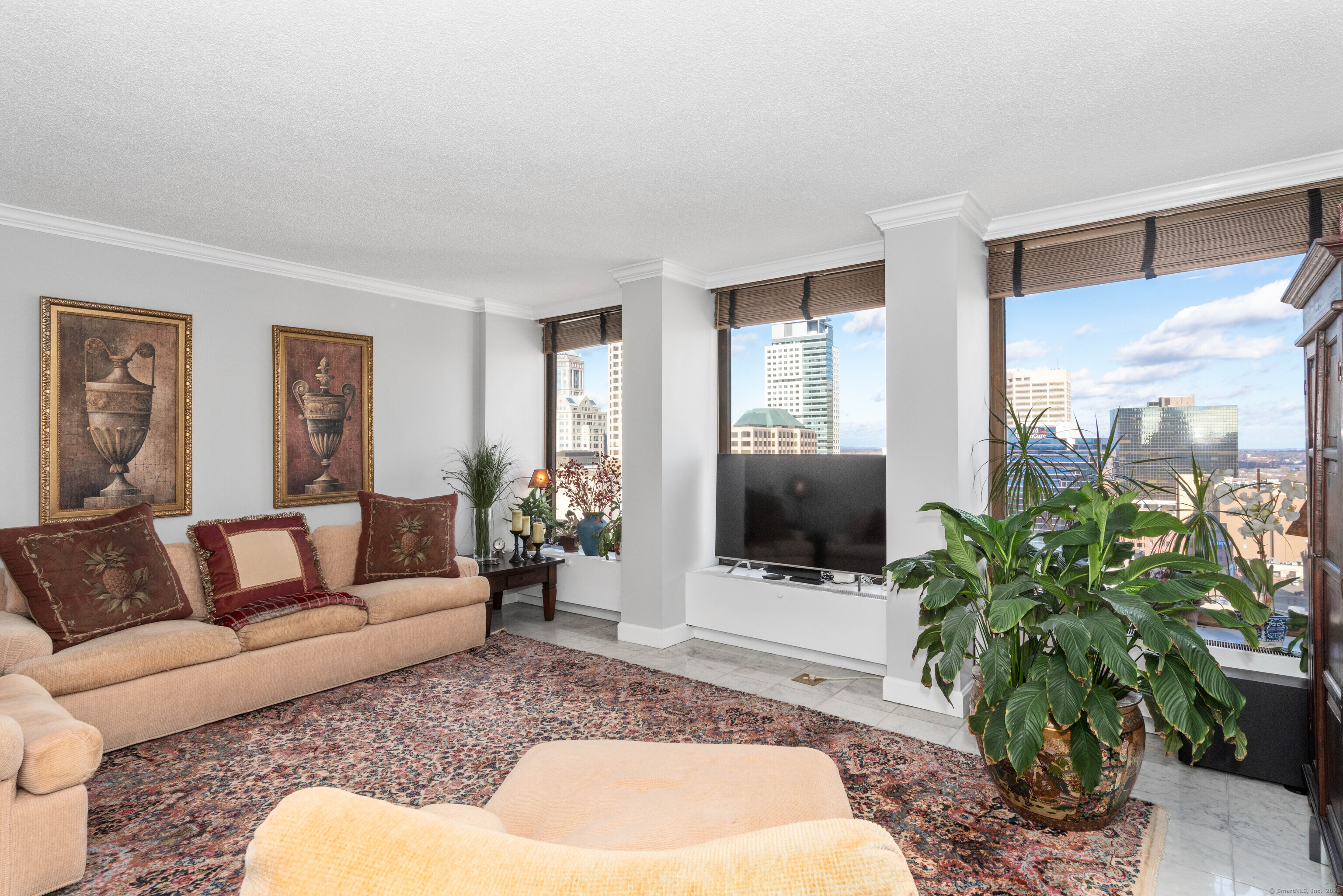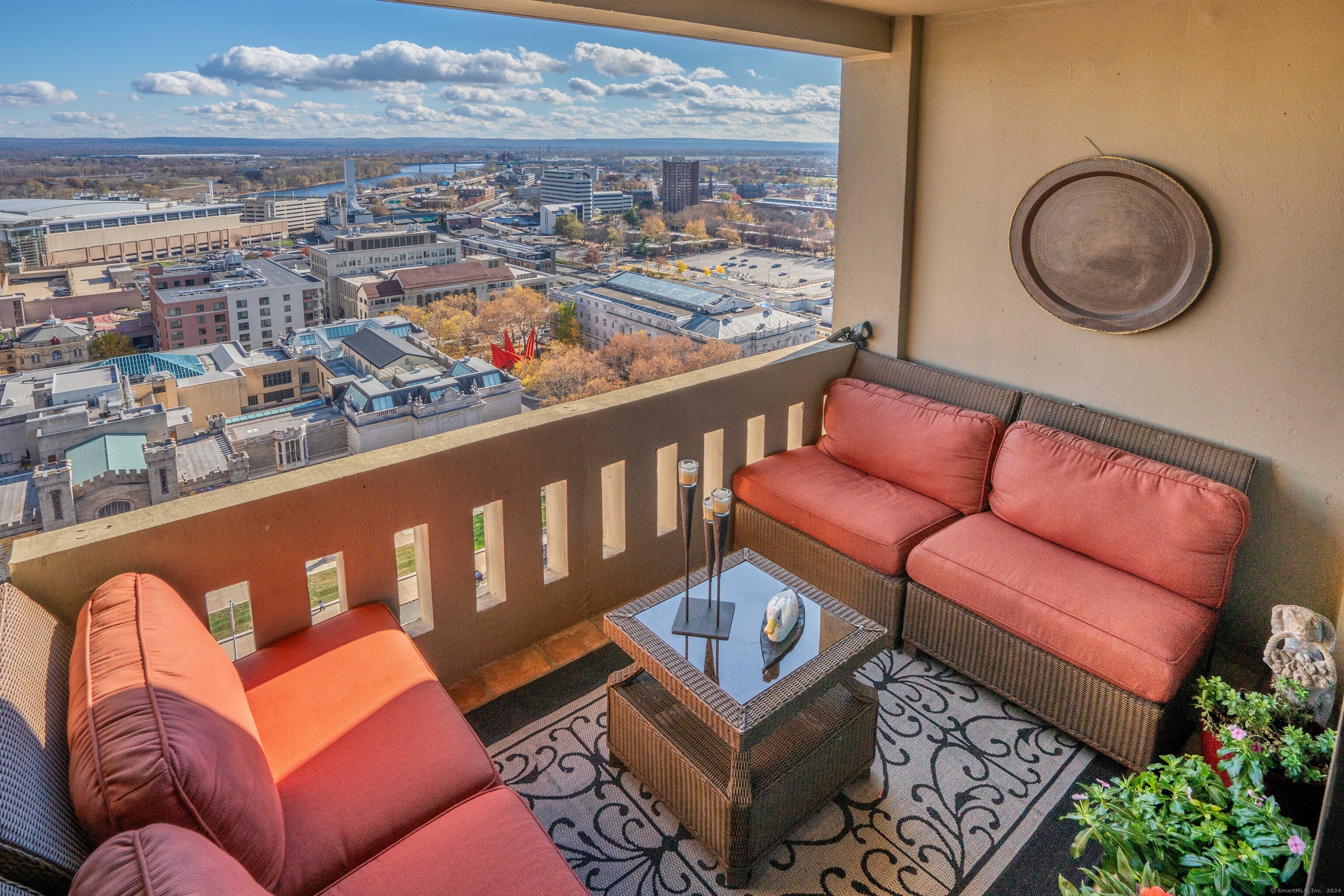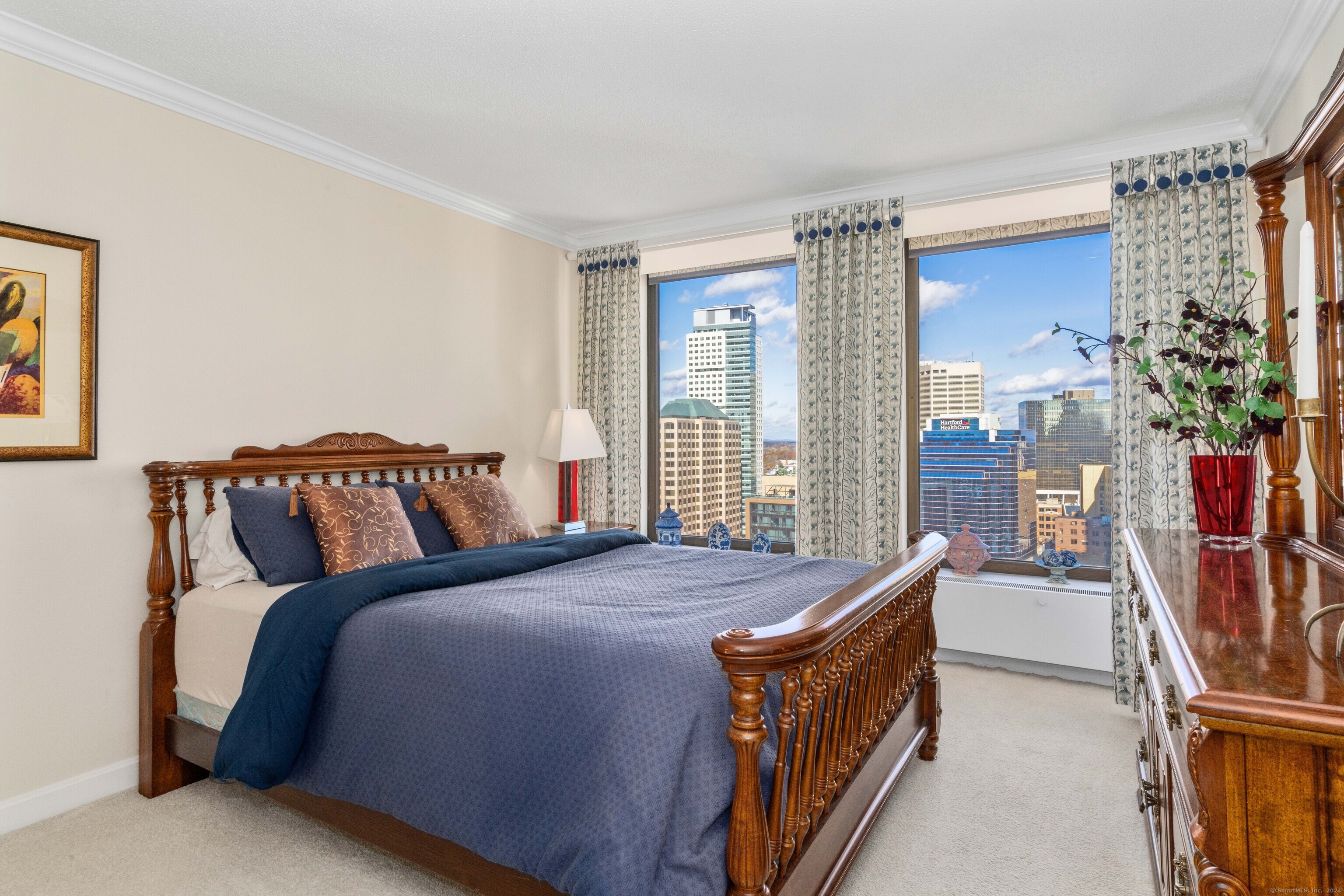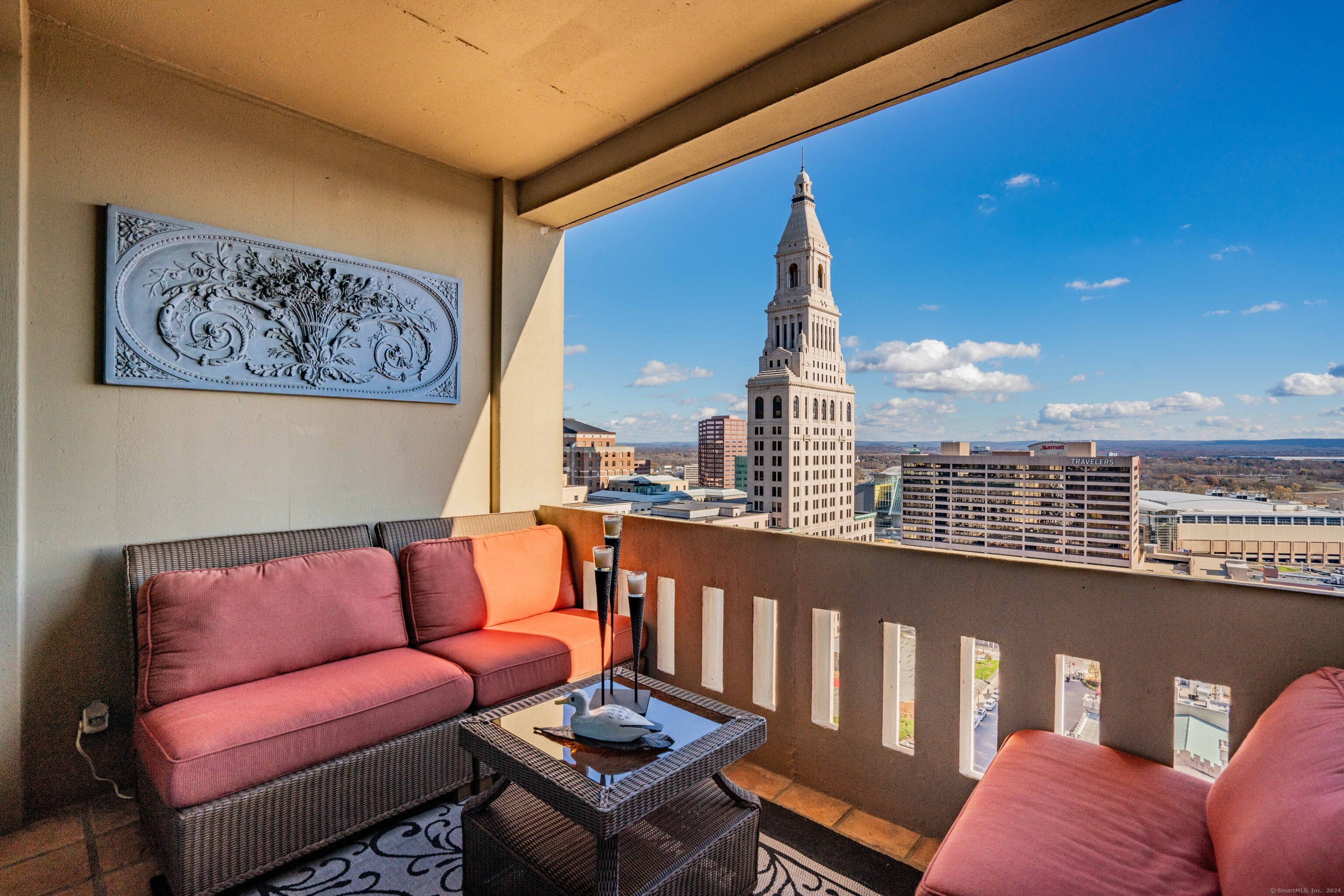 Experience the pinnacle of downtown living in this stunning 24th-floor condo at the renowned Bushnell Tower, designed by architect I.M. Pei. Enjoy breathtaking views of downtown Hartford and the Connecticut River from expansive windows that flood the open floor plan with natural light. The spacious living room, featuring a full wall of windows, seamlessly flows into the dining area, creating an inviting space for relaxation and entertainment. Step out onto your private balcony overlooking the Wadsworth Atheneum and Traveler's Tower-a perfect spot to enjoy your morning coffee or unwind in the evening. The kitchen impresses with custom cabinetry, granite countertops, and a built-in bar with a wine refrigerator. French doors from the living room open to a cozy den with built-ins, ideal for a home office or media room, can also be used as third bedroom. The generous primary suite features a luxurious retreat with a private bath, marble steam shower, in-unit washer/dryer, and a spacious walk-in closet. A second bedroom and an additional full bath with double sinks complete the layout. This condo also has four-zone heating, a convenient two-car tandem garage (#143), a storage unit, and 24-hour concierge service. Enjoy Bushnell Park, wonderful restaurants and several theaters. Make this exceptional property your home and embrace urban luxury at its finest.