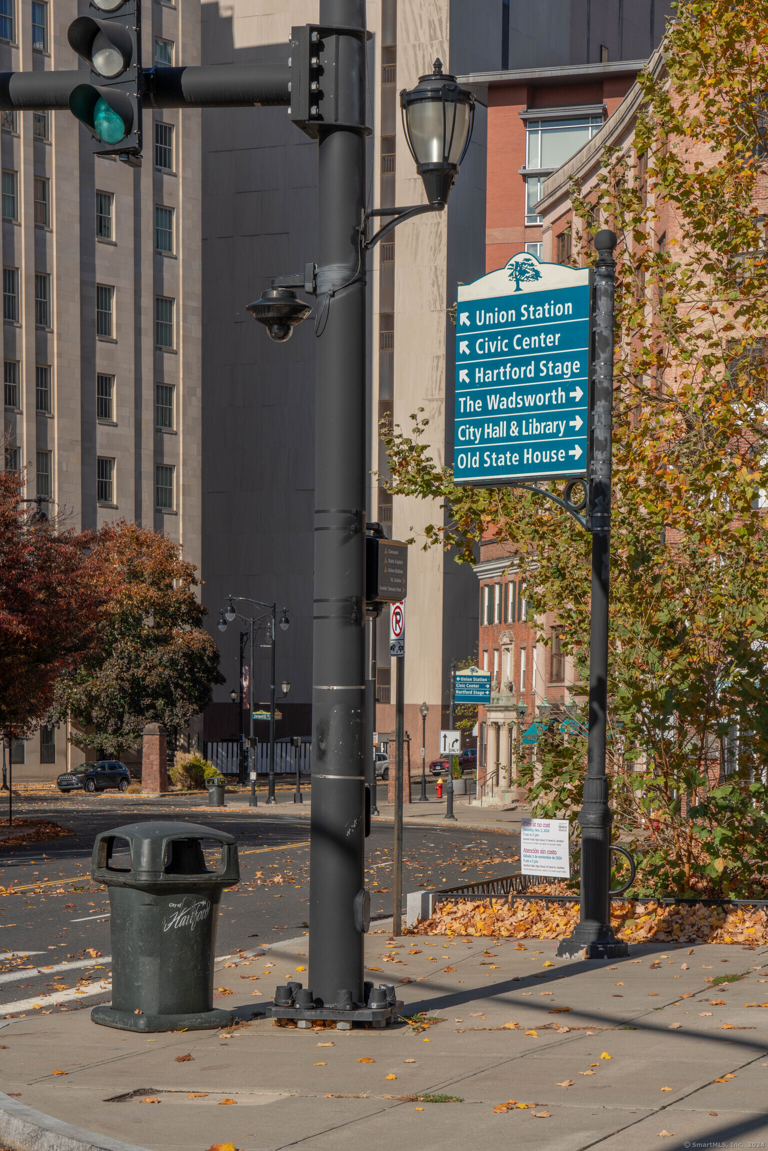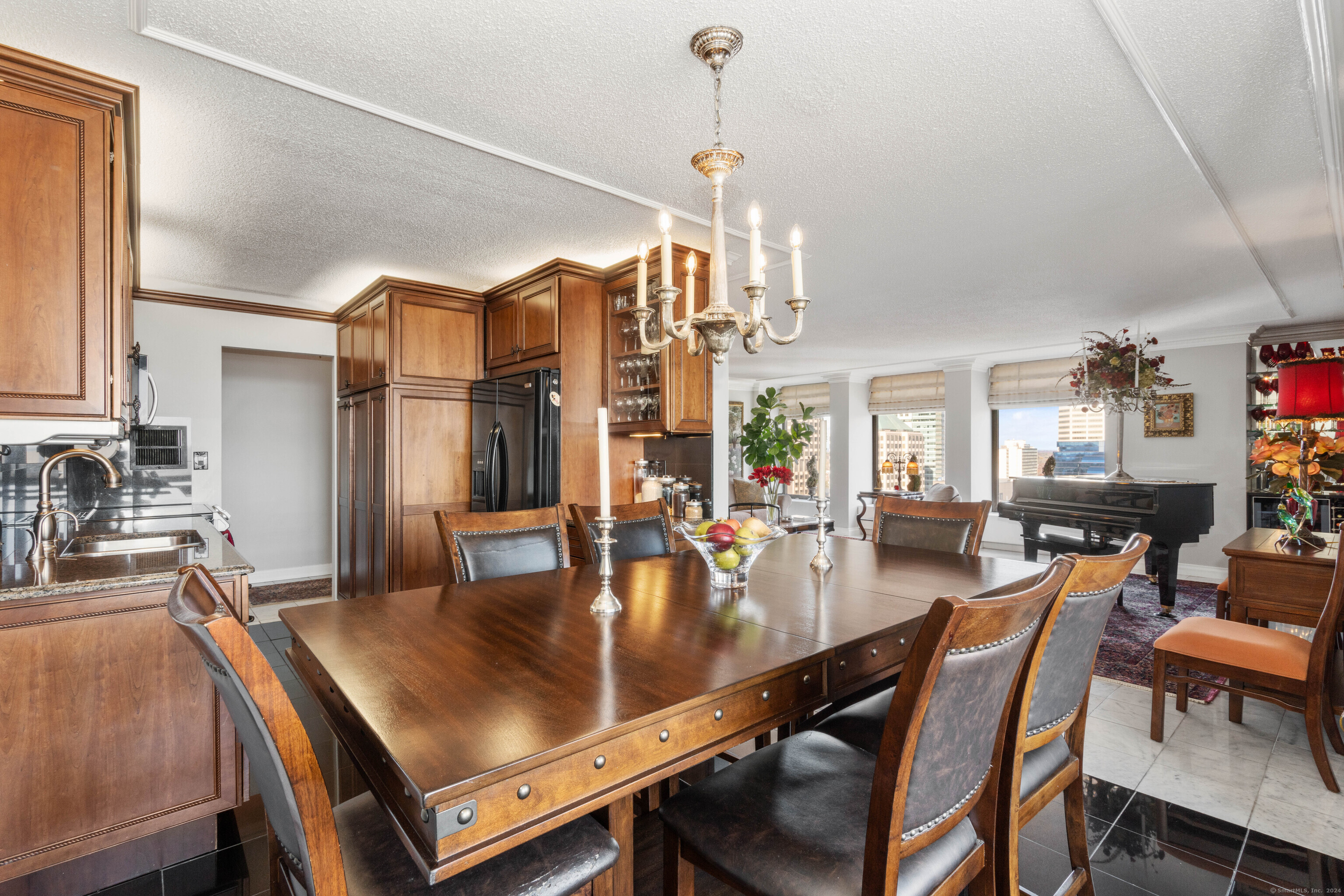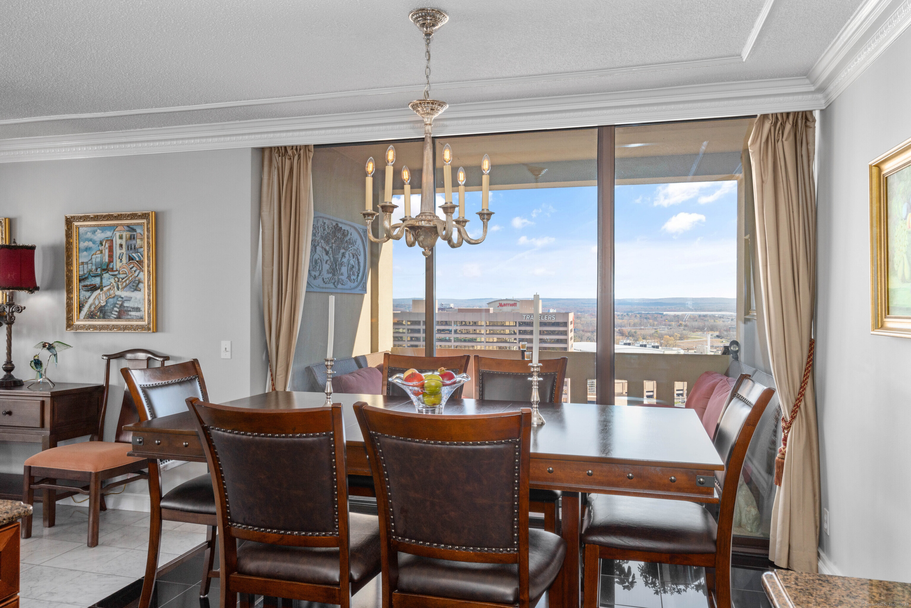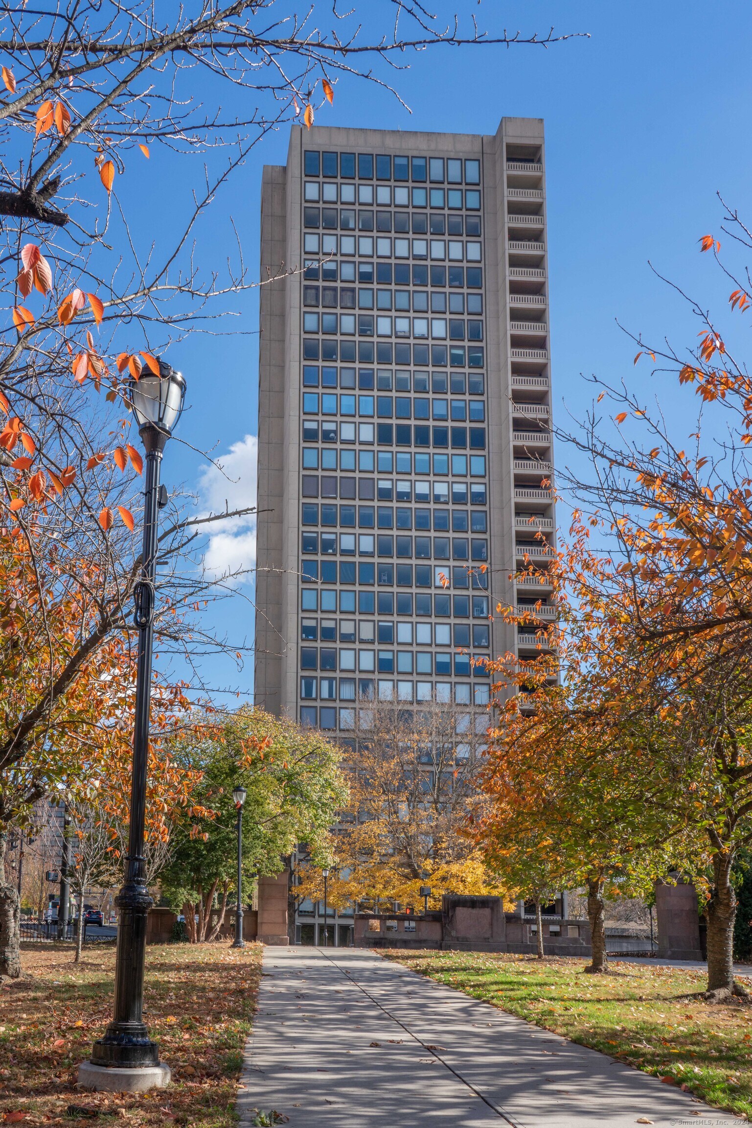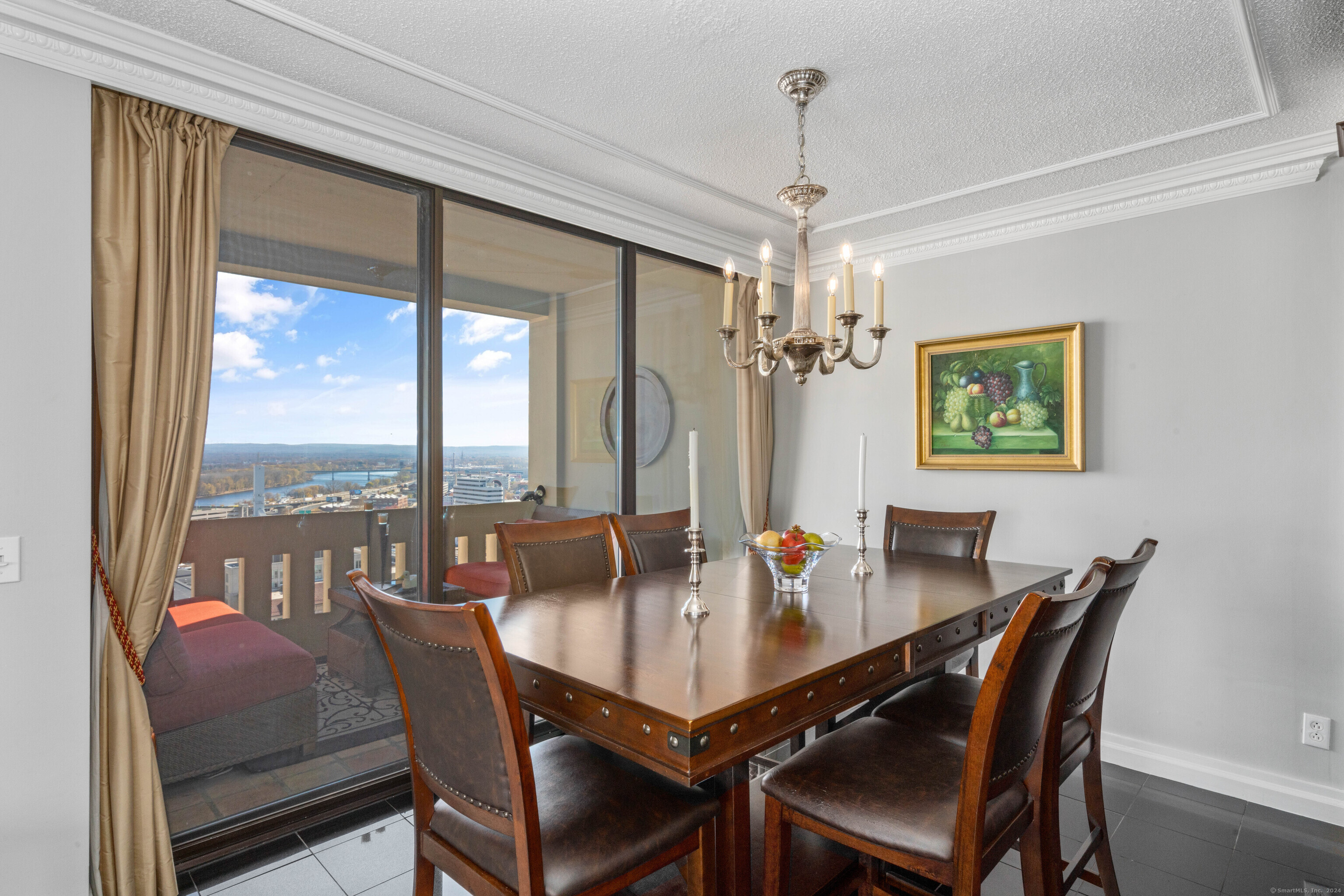 Experience the pinnacle of downtown living in this stunning 24th-floor condo at the renowned Bushnell Tower, designed by architect I.M. Pei. Enjoy breathtaking views of downtown Hartford and the Connecticut River from expansive windows that flood the open floor plan with natural light. The spacious living room, featuring a full wall of windows, seamlessly flows into the dining area, creating an inviting space for relaxation and entertainment. Step out onto your private balcony overlooking the Wadsworth Atheneum and Traveler's Tower-a perfect spot to enjoy your morning coffee or unwind in the evening. The kitchen impresses with custom cabinetry, granite countertops, and a built-in bar with a wine refrigerator. French doors from the living room open to a cozy den with built-ins, ideal for a home office or media room, can also be used as third bedroom. The generous primary suite features a luxurious retreat with a private bath, marble steam shower, in-unit washer/dryer, and a spacious walk-in closet. A second bedroom and an additional full bath with double sinks complete the layout. This condo also has four-zone heating, a convenient two-car tandem garage (#143), a storage unit, and 24-hour concierge service. Enjoy Bushnell Park, wonderful restaurants and several theaters. Make this exceptional property your home and embrace urban luxury at its finest.