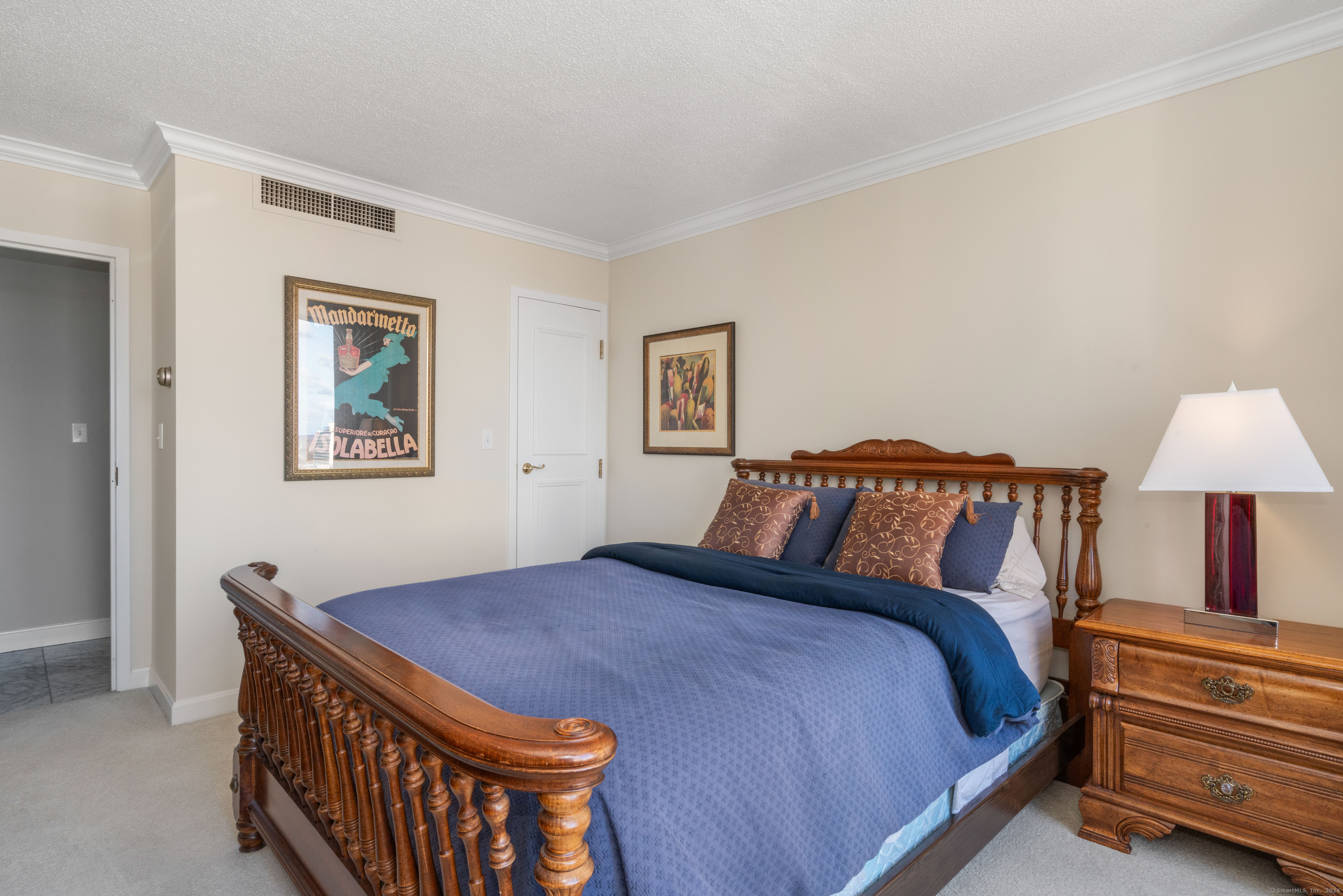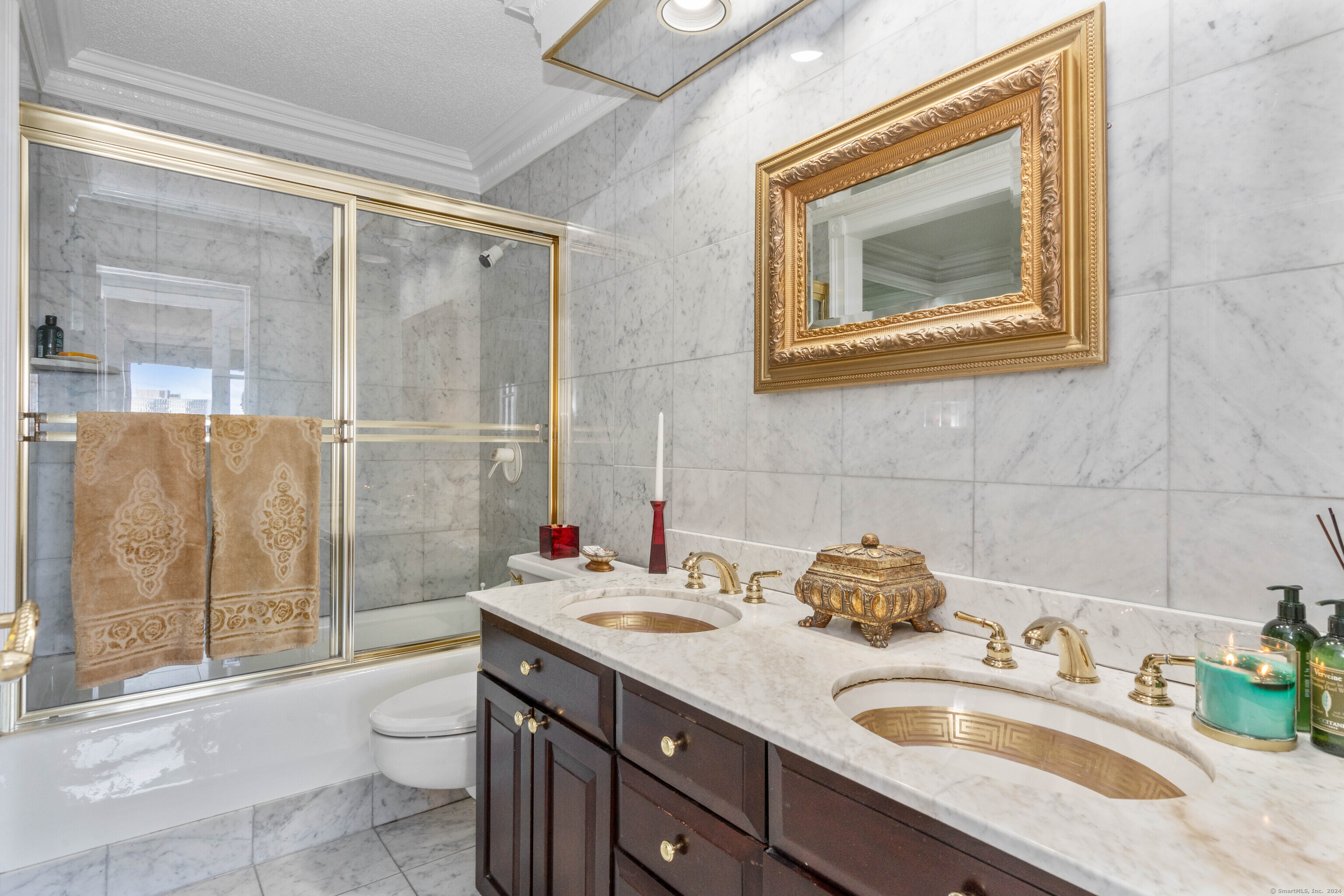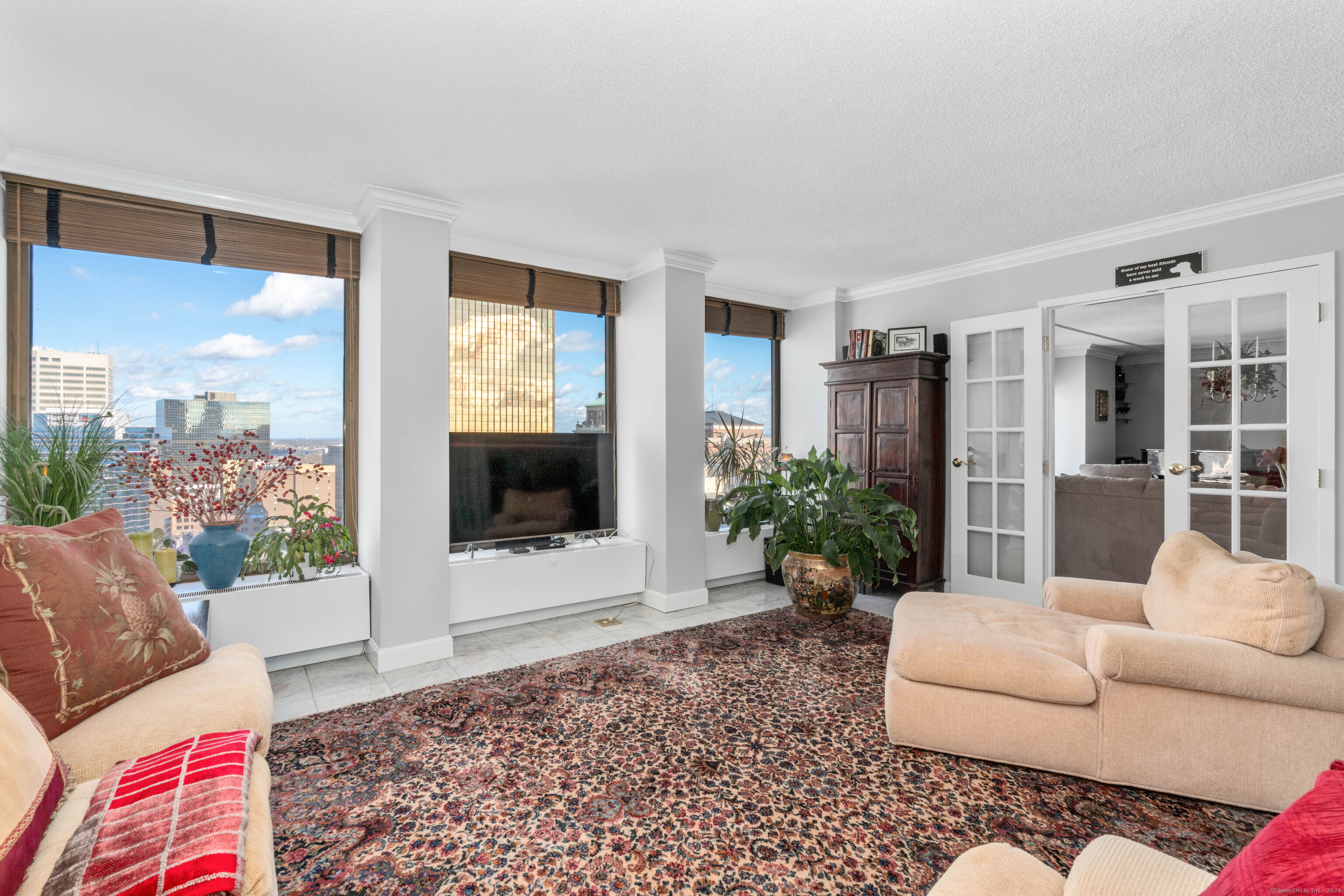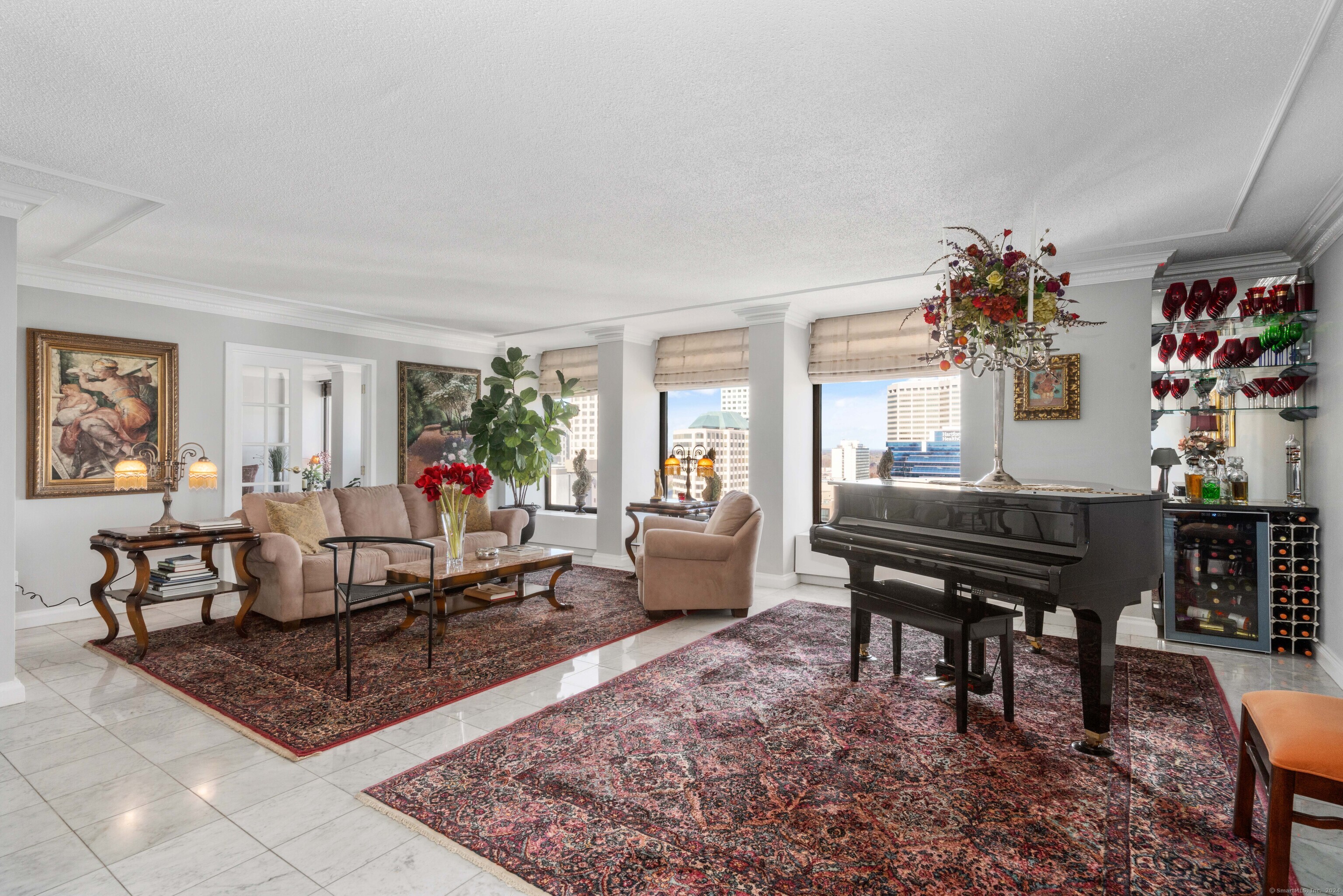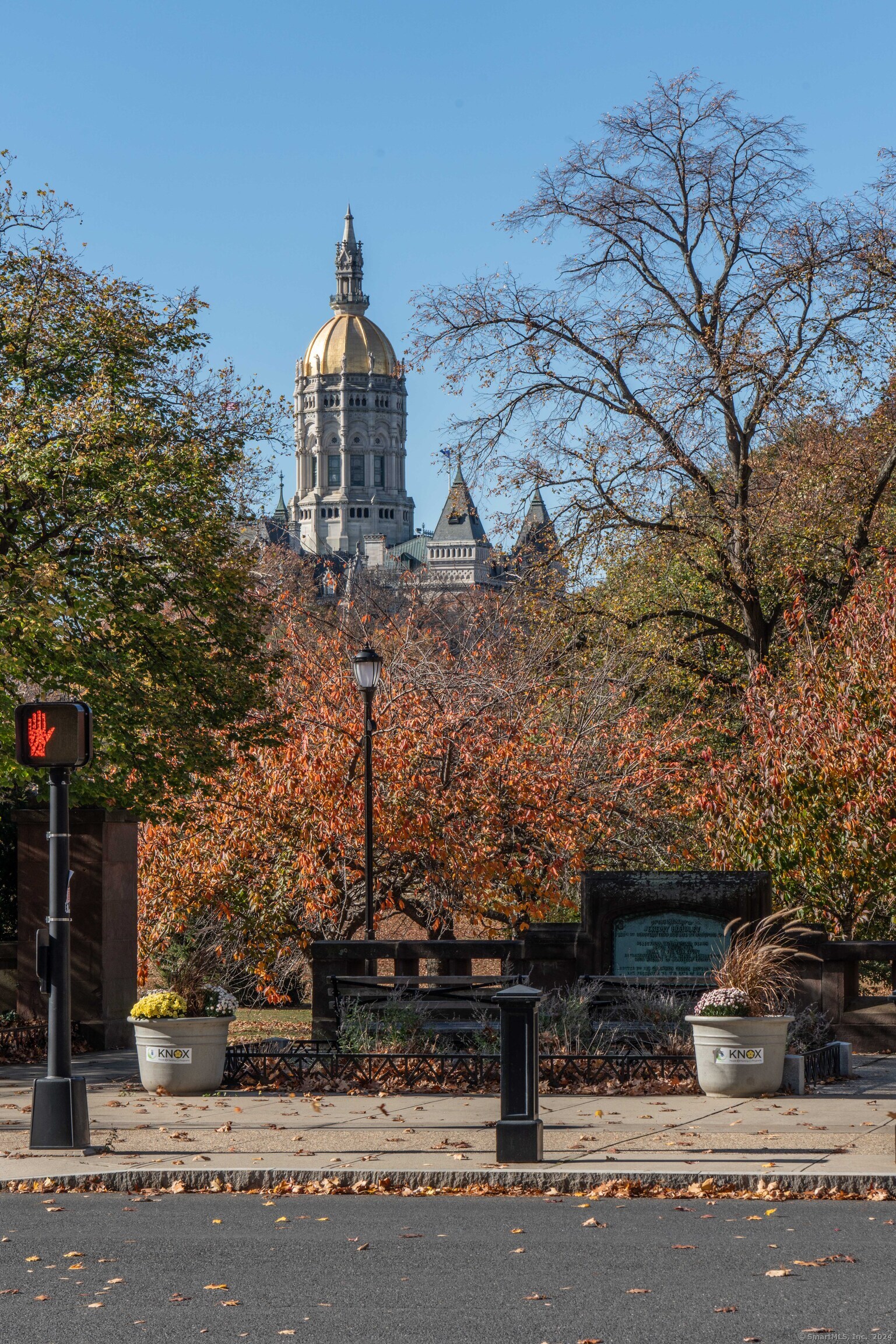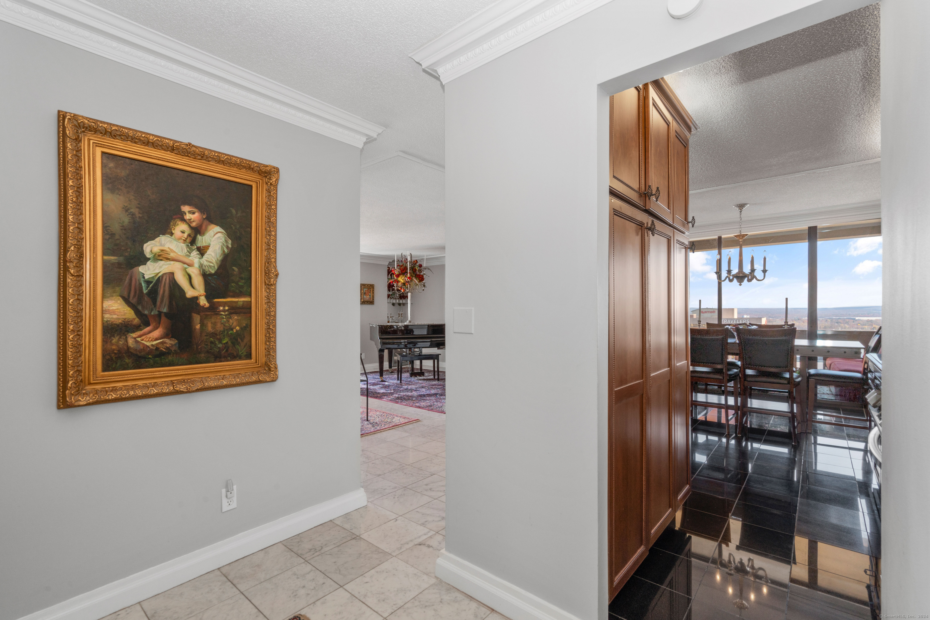 Experience the pinnacle of downtown living in this stunning 24th-floor condo at the renowned Bushnell Tower, designed by architect I.M. Pei. Enjoy breathtaking views of downtown Hartford and the Connecticut River from expansive windows that flood the open floor plan with natural light. The spacious living room, featuring a full wall of windows, seamlessly flows into the dining area, creating an inviting space for relaxation and entertainment. Step out onto your private balcony overlooking the Wadsworth Atheneum and Traveler's Tower-a perfect spot to enjoy your morning coffee or unwind in the evening. The kitchen impresses with custom cabinetry, granite countertops, and a built-in bar with a wine refrigerator. French doors from the living room open to a cozy den with built-ins, ideal for a home office or media room, can also be used as third bedroom. The generous primary suite features a luxurious retreat with a private bath, marble steam shower, in-unit washer/dryer, and a spacious walk-in closet. A second bedroom and an additional full bath with double sinks complete the layout. This condo also has four-zone heating, a convenient two-car tandem garage (#143), a storage unit, and 24-hour concierge service. Enjoy Bushnell Park, wonderful restaurants and several theaters. Make this exceptional property your home and embrace urban luxury at its finest.
