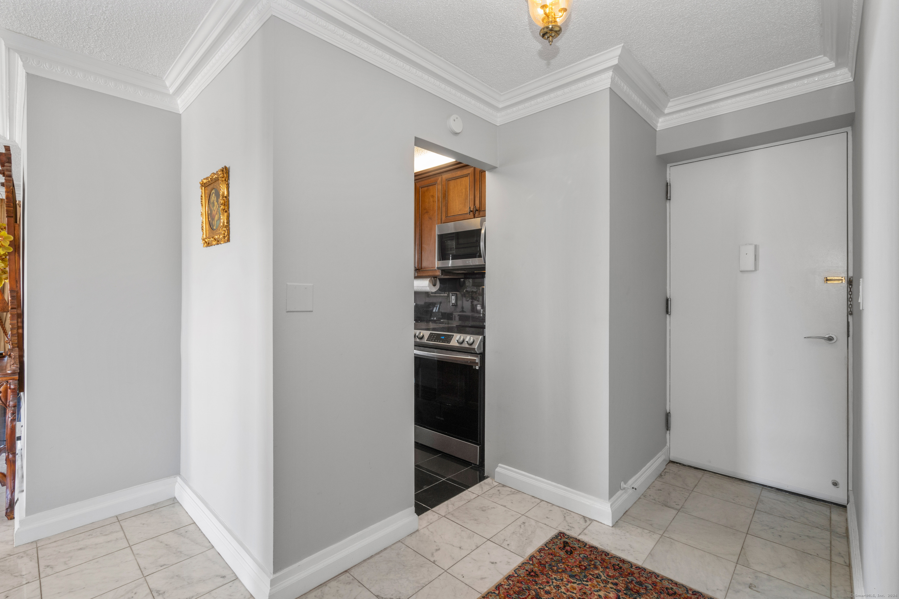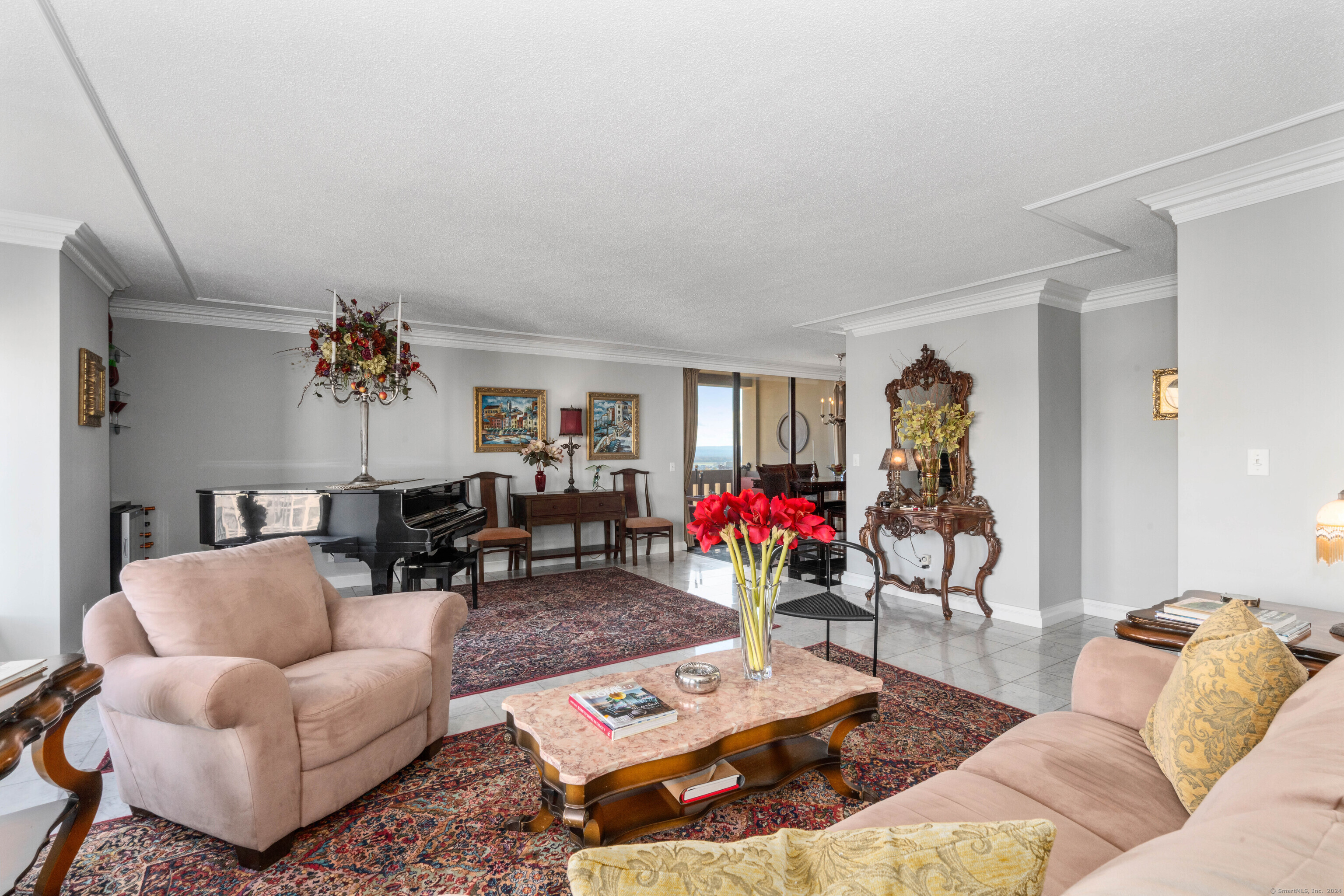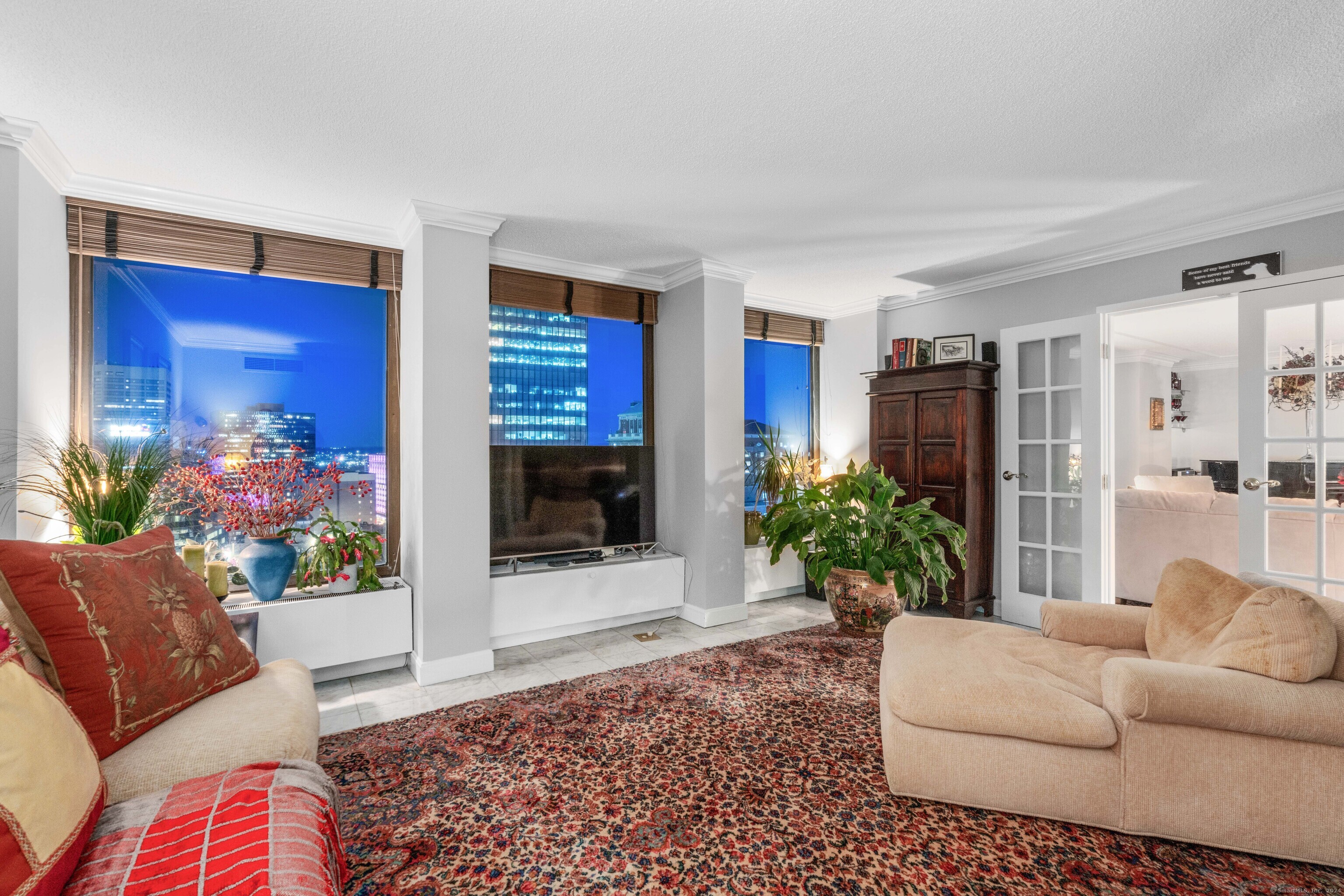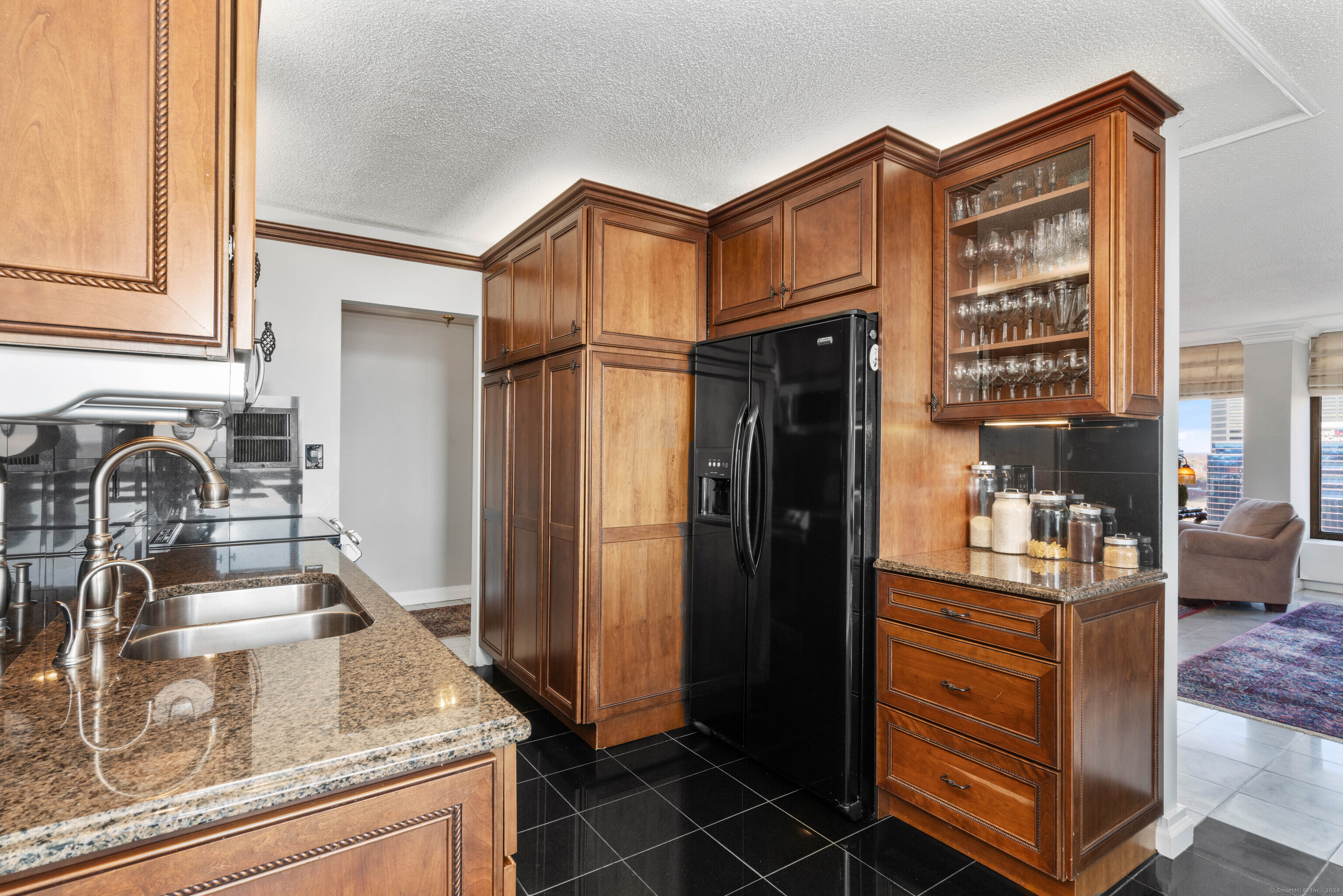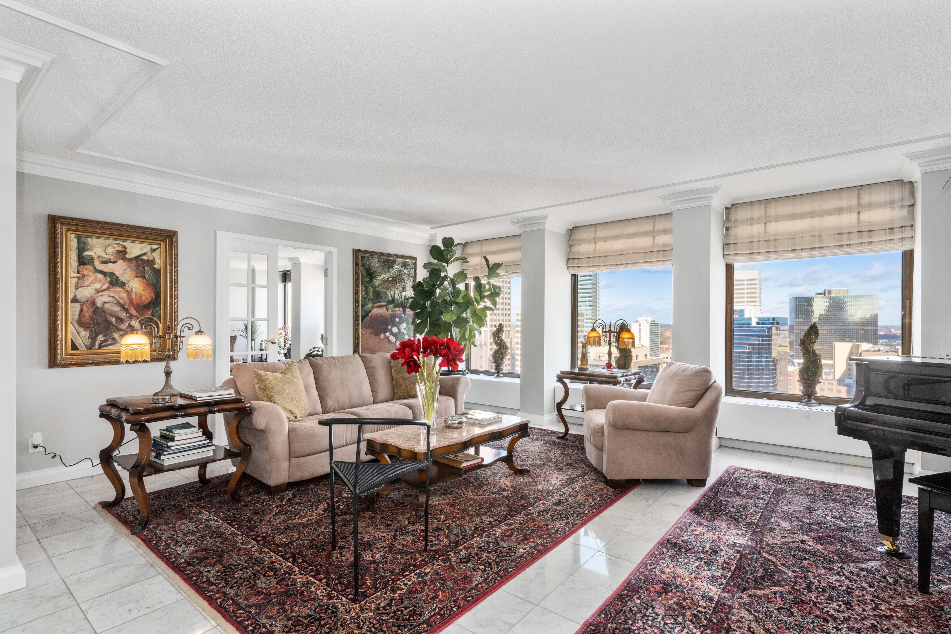 Experience the pinnacle of downtown living in this stunning 24th-floor condo at the renowned Bushnell Tower, designed by architect I.M. Pei. Enjoy breathtaking views of downtown Hartford and the Connecticut River from expansive windows that flood the open floor plan with natural light. The spacious living room, featuring a full wall of windows, seamlessly flows into the dining area, creating an inviting space for relaxation and entertainment. Step out onto your private balcony overlooking the Wadsworth Atheneum and Traveler's Tower-a perfect spot to enjoy your morning coffee or unwind in the evening. The kitchen impresses with custom cabinetry, granite countertops, and a built-in bar with a wine refrigerator. French doors from the living room open to a cozy den with built-ins, ideal for a home office or media room, can also be used as third bedroom. The generous primary suite features a luxurious retreat with a private bath, marble steam shower, in-unit washer/dryer, and a spacious walk-in closet. A second bedroom and an additional full bath with double sinks complete the layout. This condo also has four-zone heating, a convenient two-car tandem garage (#143), a storage unit, and 24-hour concierge service. Enjoy Bushnell Park, wonderful restaurants and several theaters. Make this exceptional property your home and embrace urban luxury at its finest.