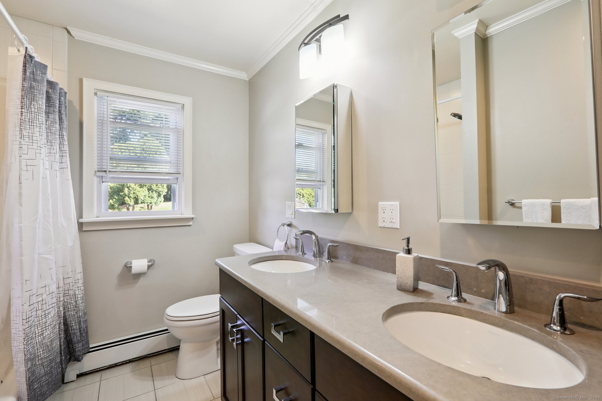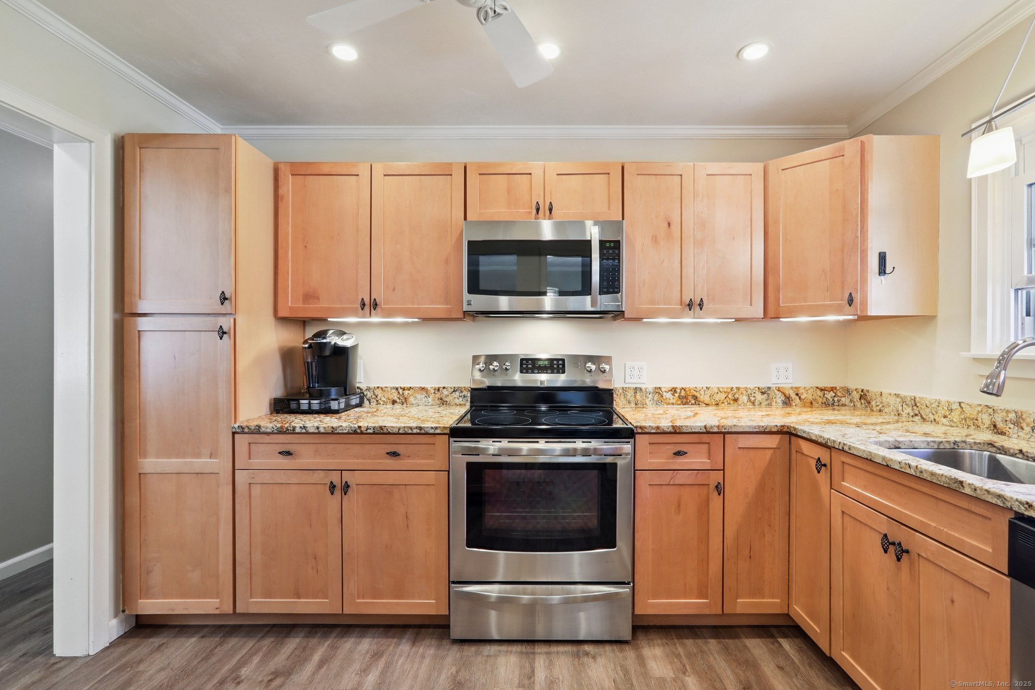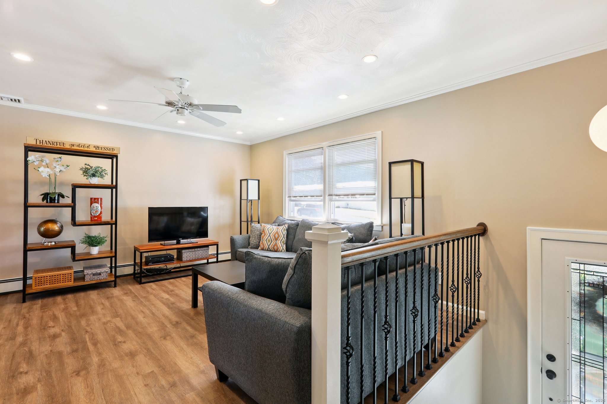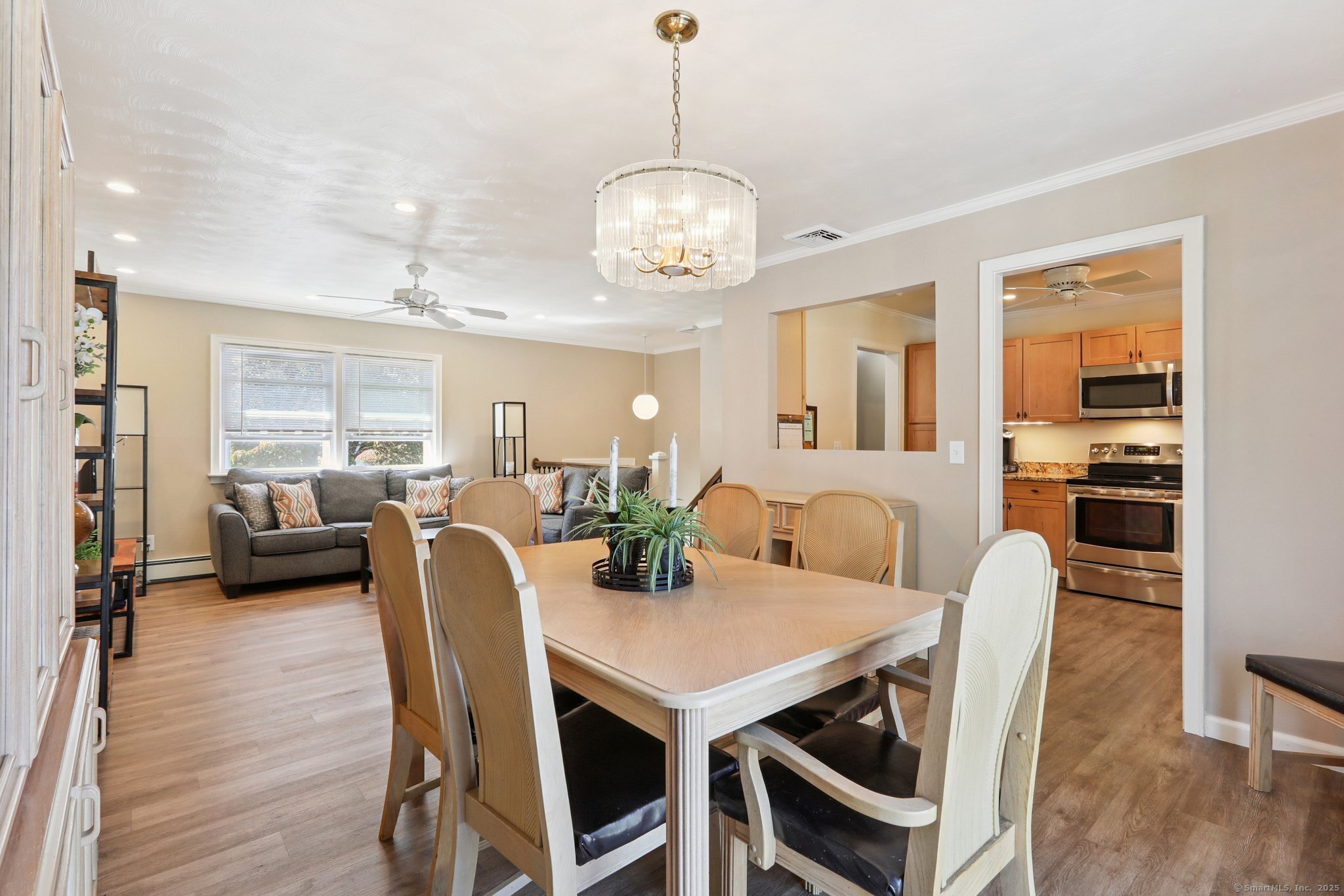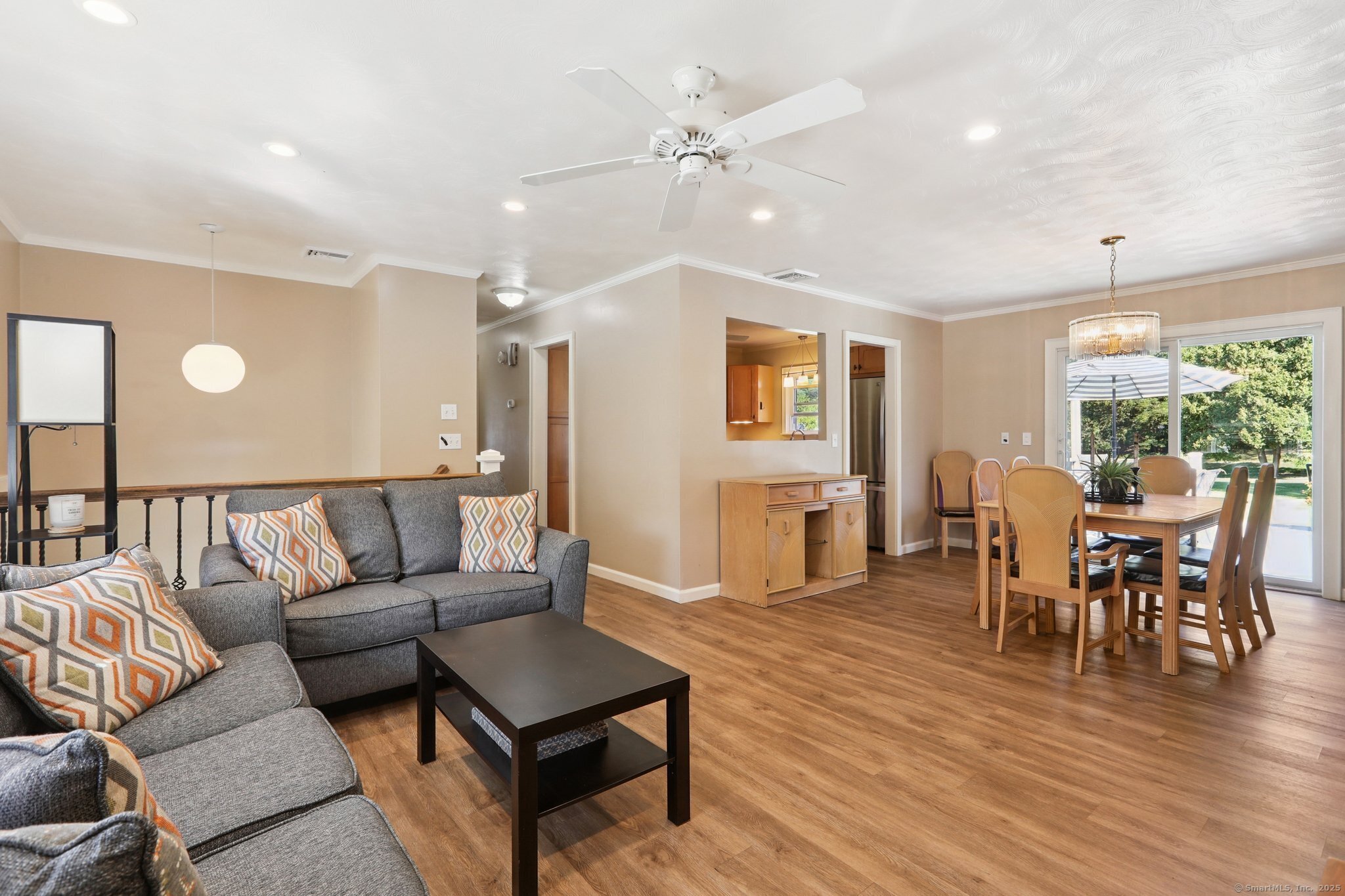 Welcome to this impeccable, remodeled raised ranch set in a beautiful neighborhood on a level, park-like lot. Surrounded by lush perennials, bluestone walkways, and a spacious Trex deck, this home offers both curb appeal and a private backyard oasis perfect for entertaining and everyday enjoyment. The interior features a remodeled kitchen with granite countertops, SS appliances, bar height counter/eating space, new flooring, warm maple cabinetry. The kitchen, living room and dining area all flow seamlessly, and the dining room has glass slider access to large, maintenance free deck and gorgeous backyard. The main level provides 3 spacious bedrooms, all with ceiling fans, fresh paint and luxury vinyl plank flooring. The main level full bath boasts a large double sink vanity with quartz top, shower/tub combo with pretty tile, new lighting and double mirrored medicine cabinets - excellent bath storage. A new set of pull down stairs provides easy access to the unfinished attic space, which provides additional storage.