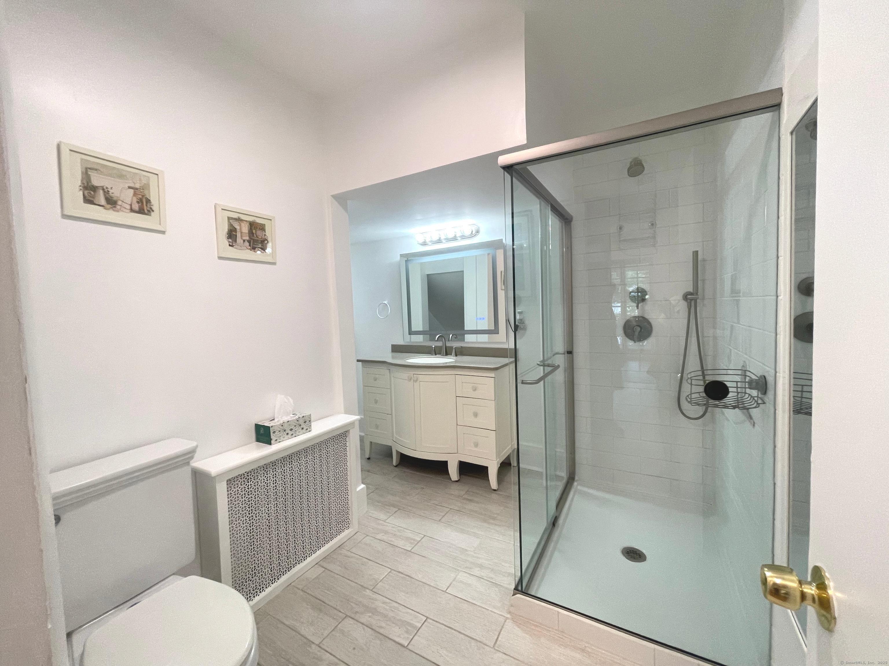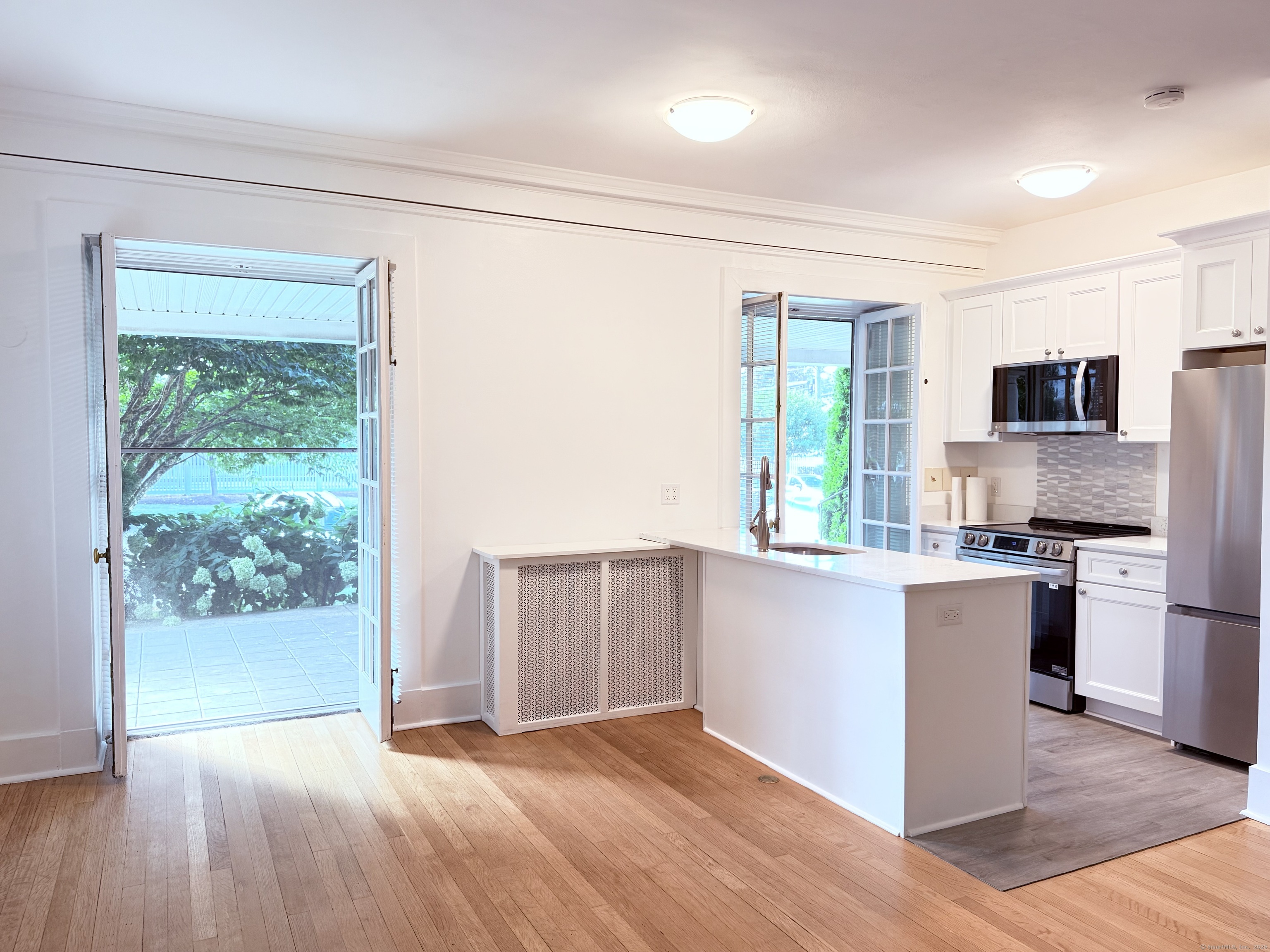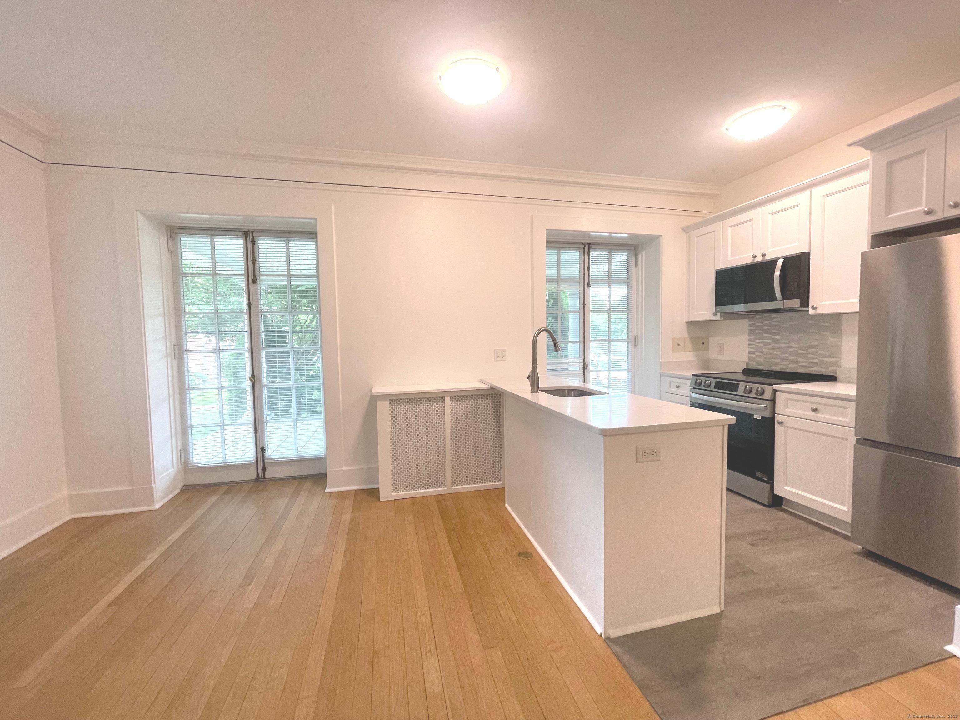 Charming 1-Bedroom in Sought-After Courtland East. Move right in to this bright and beautifully updated first-floor unit! Enjoy an open floor plan with a new kitchen and island, spacious living/dining area, and a working fireplace that adds cozy charm. Features include hardwood floors, new windows, and French doors leading to a front porch with building entrance. The large bedroom offers plenty of closet space, and the remodeled bathroom features a glass-enclosed shower and extra storage. Located in the desirable Courtland East community, surrounded by park-like grounds, with reserved parking, ample guest parking, and heat and hot water included in the common charges. No rental restrictions and one pet per unit accepted. Convenient location-great for commuters! Don't miss this move-in-ready gem!