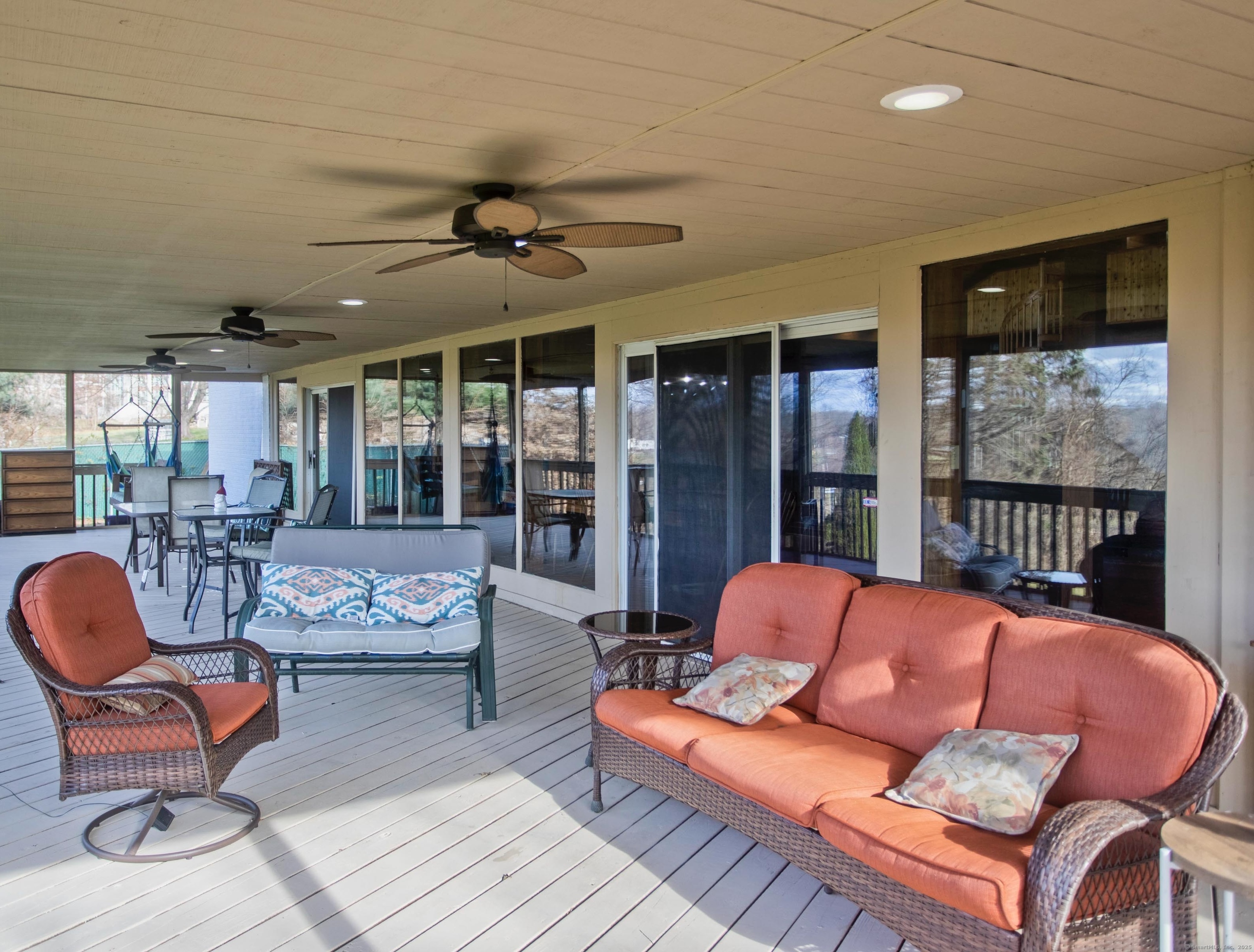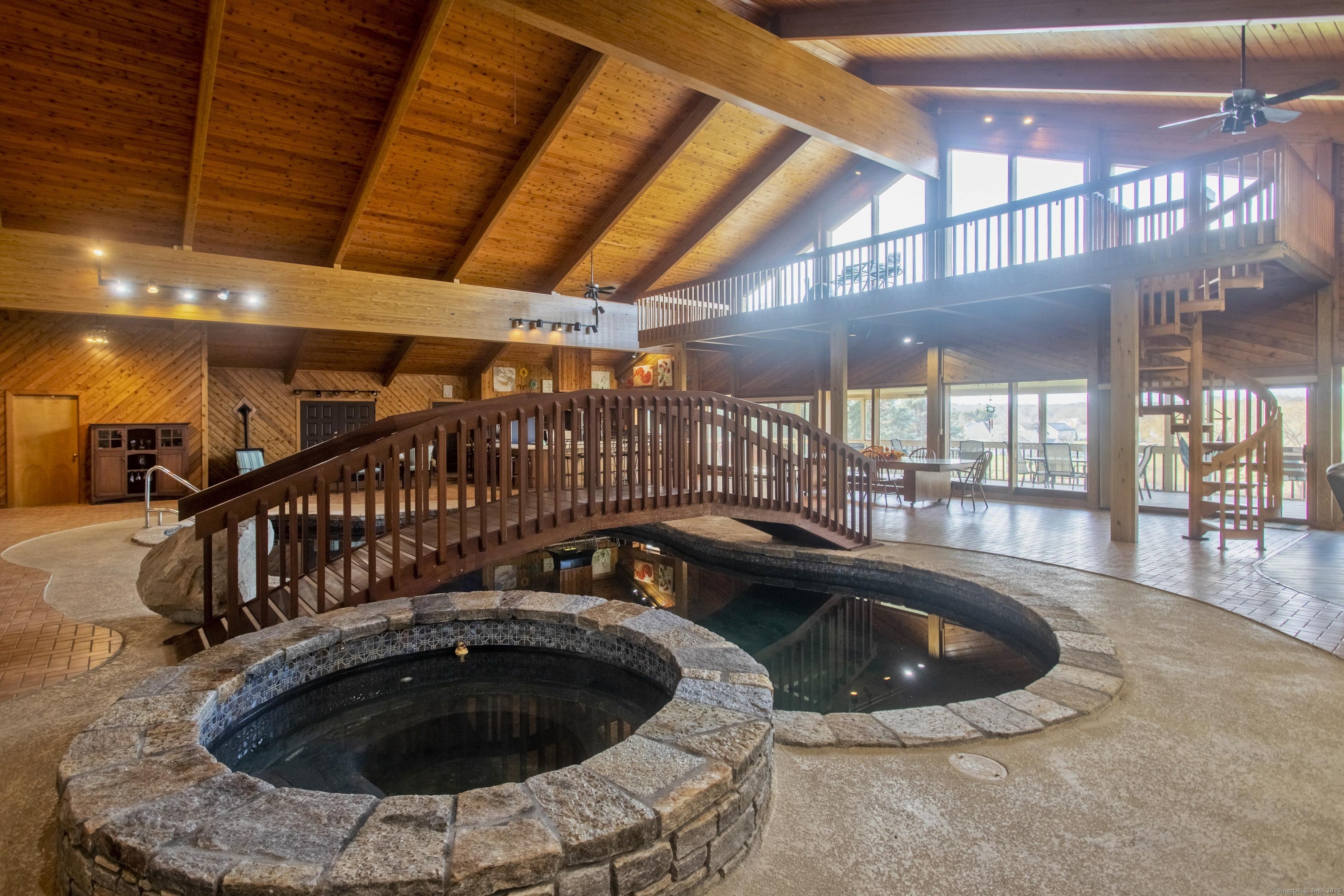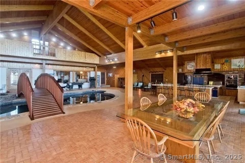 Welcome to your own indoor resort-7,705sqft of luxury living on 2.67 acres with water views, a heated indoor pool, and room to entertain year-round. This one-of-a-kind ranch includes a spacious main house and attached massive pool house, combining comfort, space, and style in a peaceful corner-lot setting. Main Home Highlights: * 3 spacious bedrooms including a large primary suite with tiled walk-in shower * Sunken living room with floor-to-ceiling stone fireplace * Eat-in kitchen with striking glass backsplash * Additional office/bedroom with private entrance, full bath, and adjacent laundry-perfect for guests or in-laws. * Attached 2-car garage and additional heated 1-car garage. Indoor Pool House Features: * Heated gunite pool + large spa in a light-filled lounge area * Second full kitchen with L-shaped island, oversized dining table, and indoor grill * Theater space, two lofts, and a unique bridge over the pool - perfect for photo shoots * Sliders open to a 770 sq ft screened rear deck with pond views and amazing western sky sunsets. Outdoor Amenities: * Brick paver patio for fireside evenings * Screened-in deck for morning coffee or outdoor dining * Fully fenced dog area * Quiet, private backyard with sloping lawn to the edge of an aerated pond. The layout offers flexibility for entertaining, multigenerational living, or creating a private retreat. All on a peaceful street, just minutes to I-91 with easy access to Hartford or Springfield. Agents are owners.