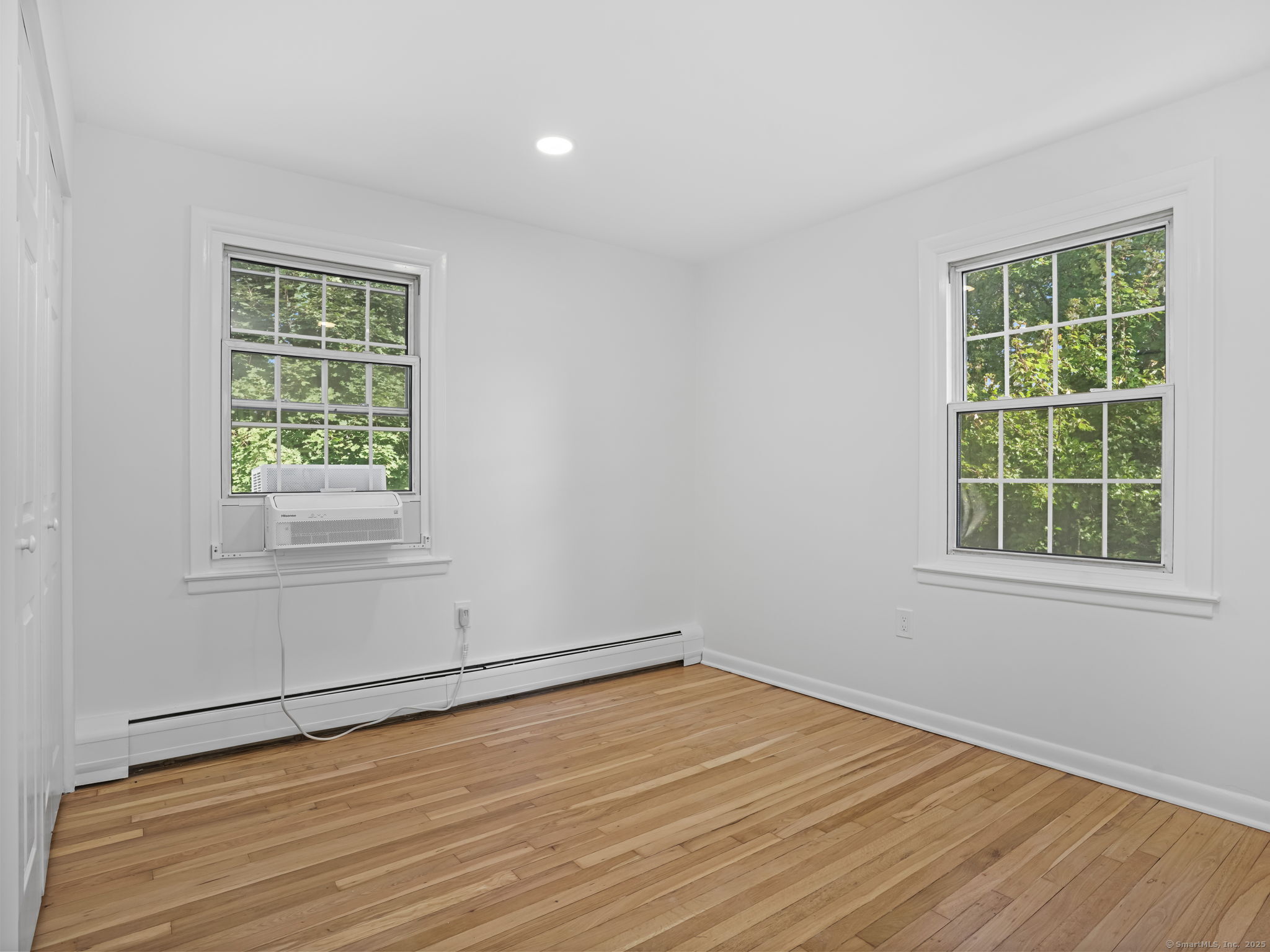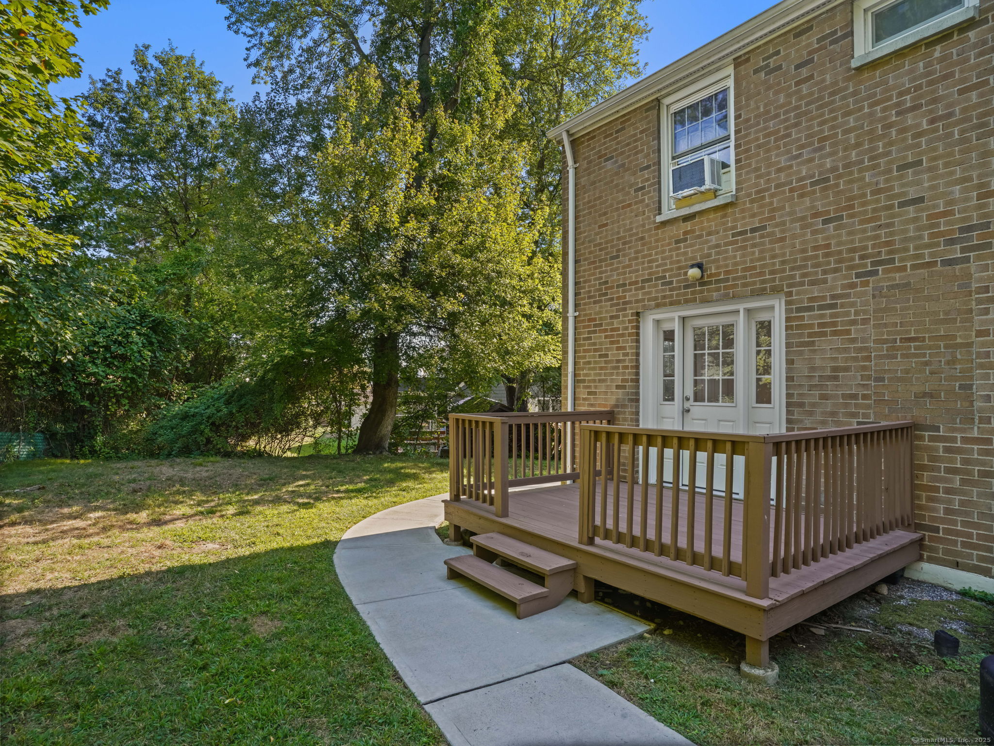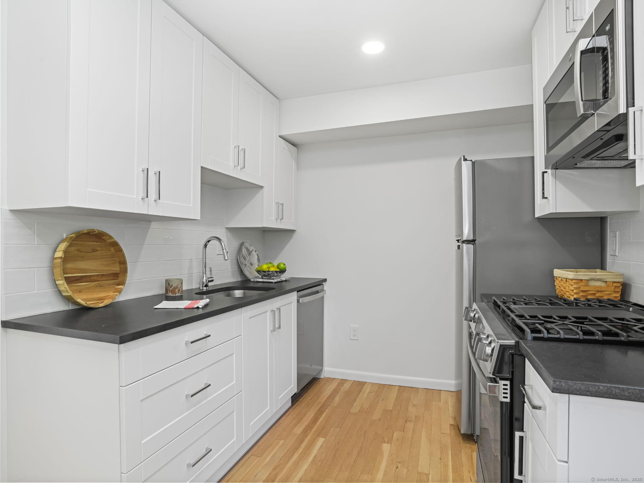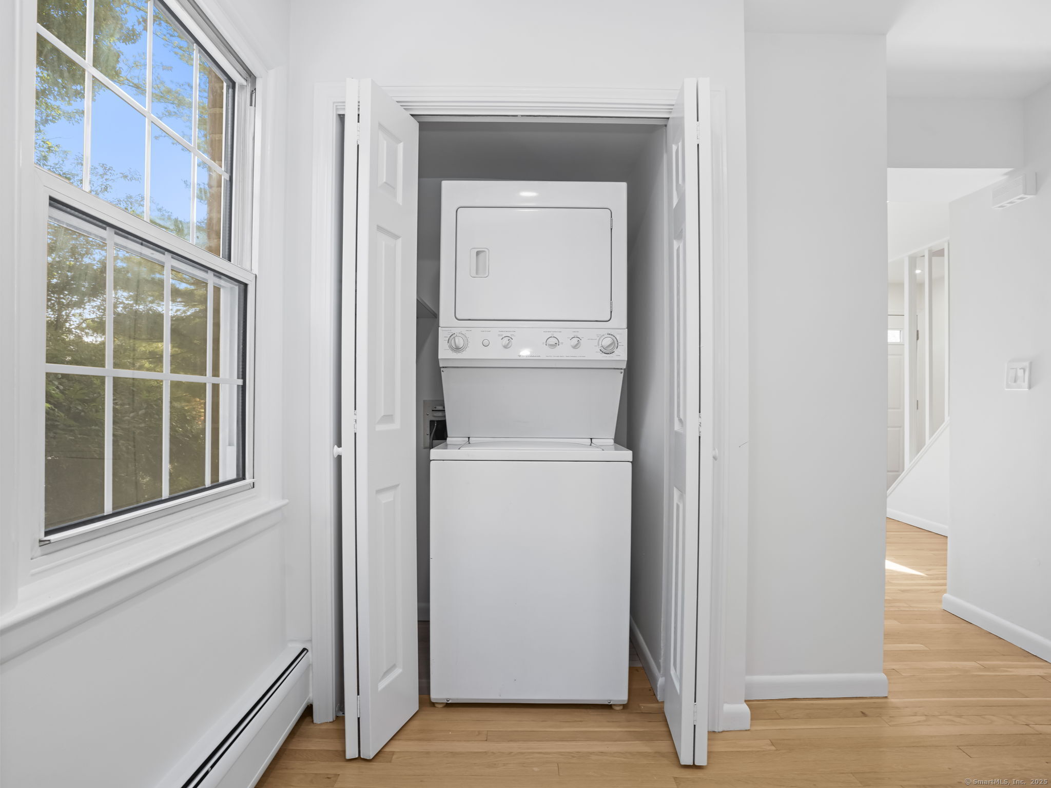 Beautifully renovated with refinished hardwood floors and recessed lighting throughout, this sun-filled end-unit townhouse blends comfort with a fresh, modern feel. The main level showcases a stunning brand-new kitchen with crisp white cabinetry, stainless steel appliances, granite countertops, and a subway tile backsplash. The adjoining breakfast nook opens to a private deck and backyard, creating an ideal spot for both everyday living and entertaining. A chic powder room with penny tile flooring, a laundry closet with washer/dryer, and two convenient storage closets add thoughtful functionality. Upstairs, two spacious bedrooms share an elegantly redesigned full bath with penny tile flooring and a striking walk-in shower framed by sliding glass doors. A hallway linen closet adds extra storage, while brand-new air conditioners ensure comfort year-round. The home also includes one assigned parking space (#58), additional guest parking, and a storage area in the neighboring building's basement. Rent covers heat, hot water, sewer, trash pickup, and grounds maintenance. Ideally located near shopping, schools, parks, the train station, and major commuting routes, this home offers the perfect blend of privacy, style, and convenience.