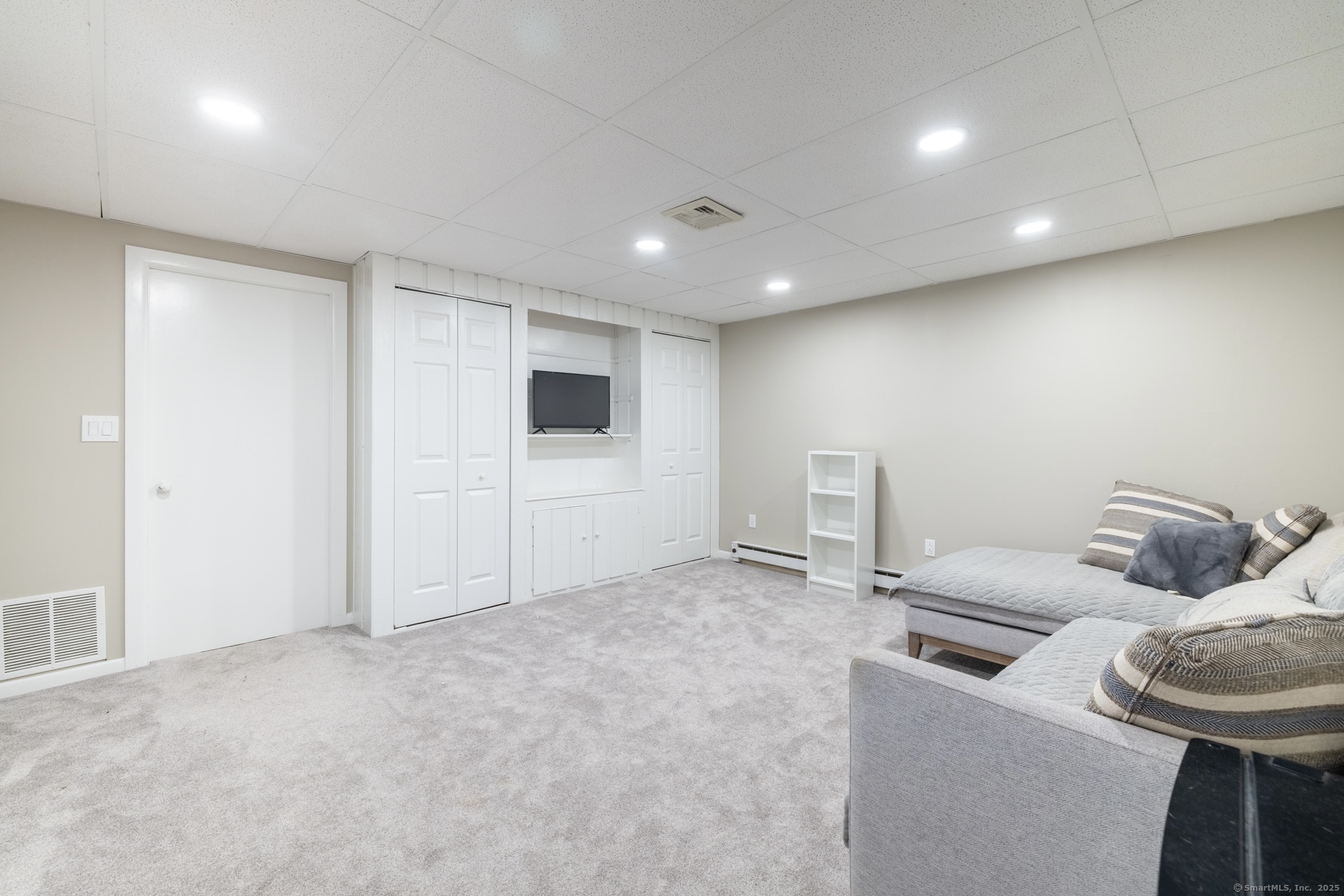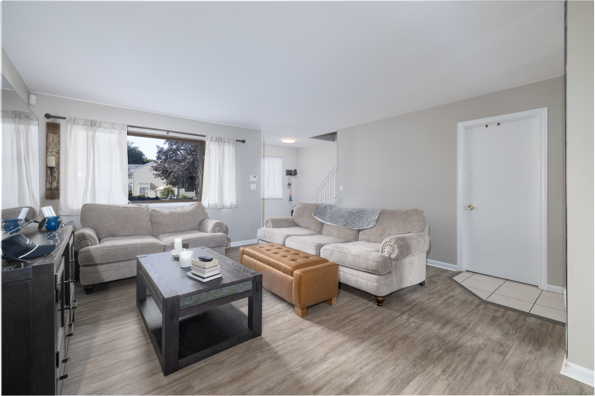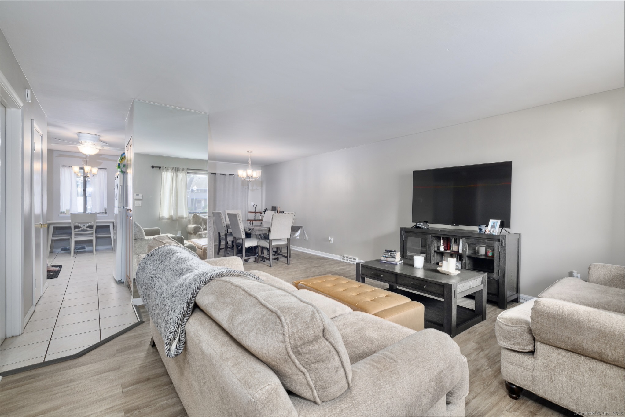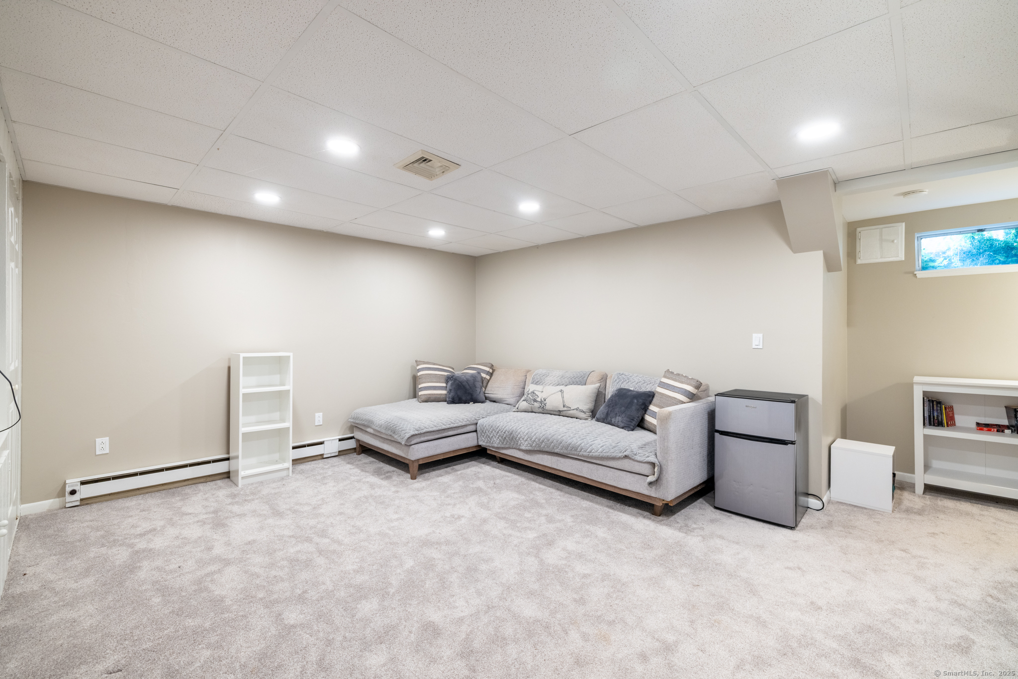 This beautifully updated, light-filled home designed for comfort and style. Recently painted, tiled, and carpeted throughout to create an inviting, move-in-ready space for its next lucky resident. From the moment you enter, you'll be greeted by soft grey flooring and a full-wall mirror that bounces natural light into the entryway. The kitchen is bright and functional, featuring a cozy dining nook, a pantry closet, ceiling fan, and all major appliances-including refrigerator, stove, microwave, dishwasher, and disposal. A cream-striae tile backsplash adds a touch of elegance. The open-concept living and dining area is filled with natural light from the patio sliders, making it the perfect spot to relax or entertain. Upstairs, you'll find two generously sized bedrooms with plush carpeting and exceptional closet space, including an oversized hallway closet. The primary suite offers a private bathroom with a new vanity and stall shower, while the main full bathroom features fresh paint, new tiling, and a tub/shower combination.The finished basement is a hidden gem-complete with recessed lighting, wall-to-wall carpet, a bar with secret storage, and a dedicated laundry area with washer, dryer, and built-in closets. Enjoy the beautifully landscaped grounds, a recently renovated pool house, and a stunning pool you'll love all summer. Conveniently located near the Merritt Parkway and area amenities, this home offers the perfect blend of serenity and accessibility.