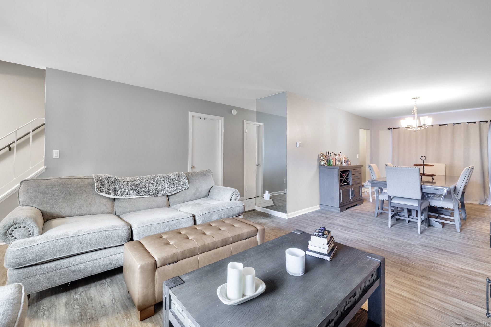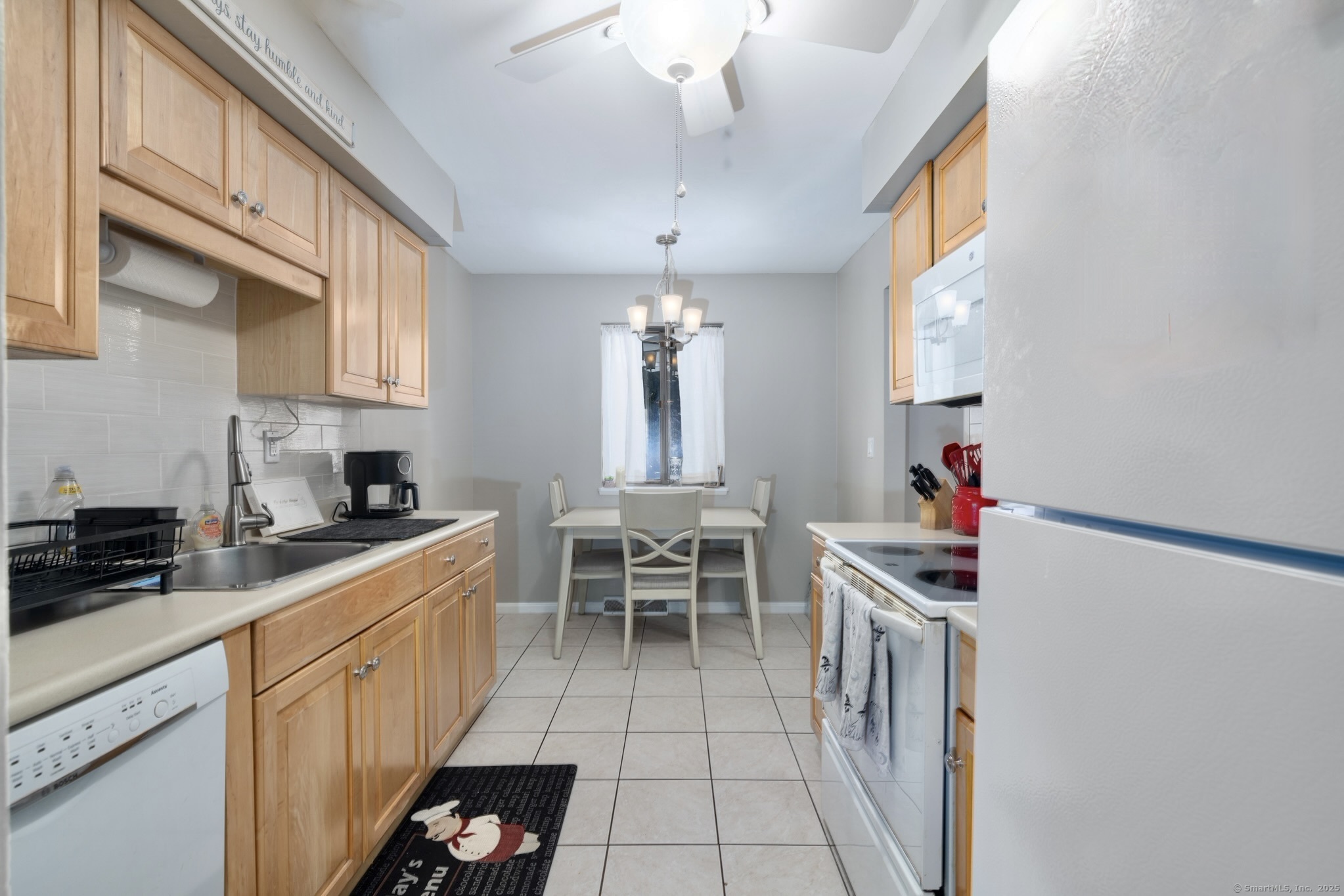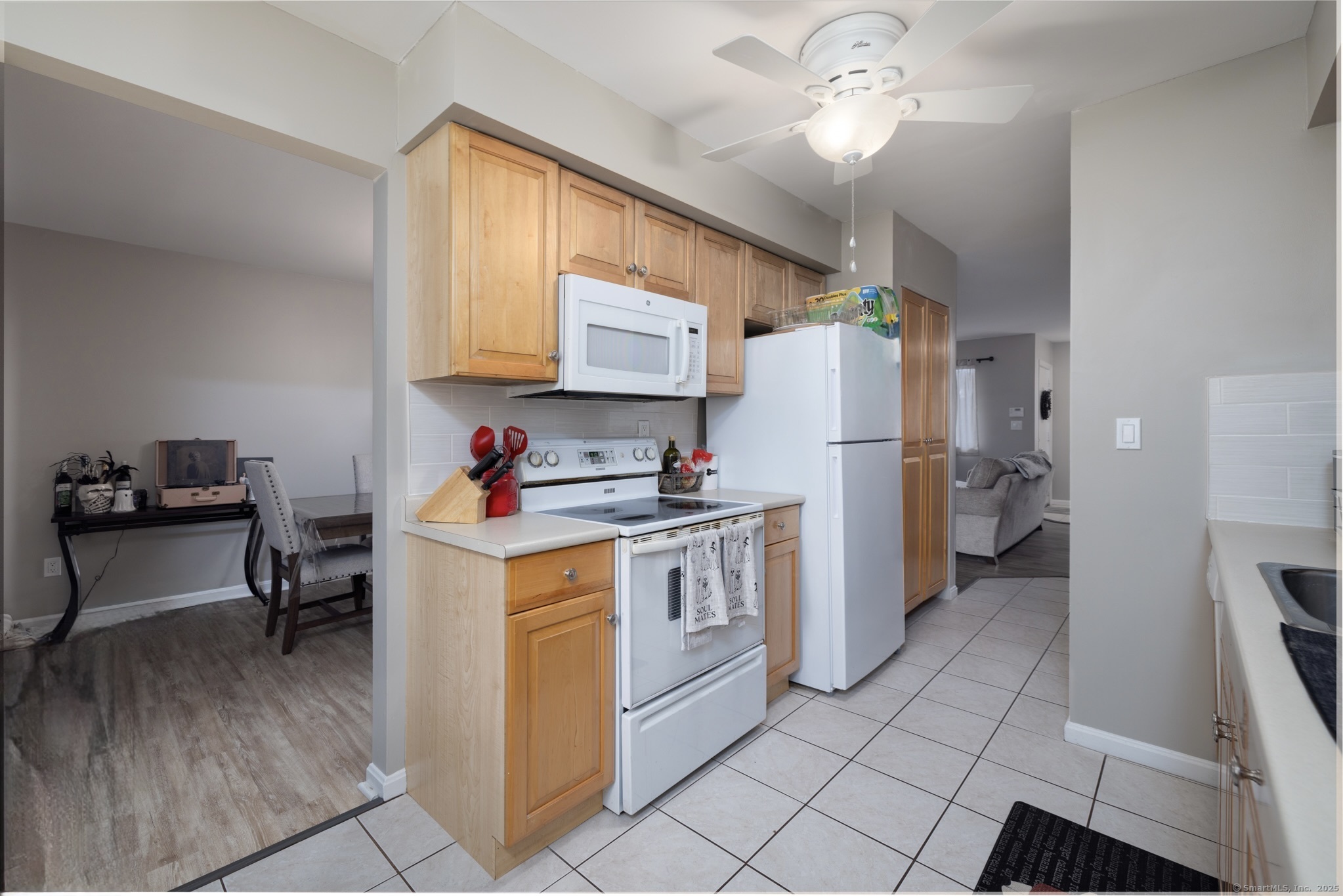 This beautifully updated, light-filled home designed for comfort and style. Recently painted, tiled, and carpeted throughout to create an inviting, move-in-ready space for its next lucky resident. From the moment you enter, you'll be greeted by soft grey flooring and a full-wall mirror that bounces natural light into the entryway. The kitchen is bright and functional, featuring a cozy dining nook, a pantry closet, ceiling fan, and all major appliances-including refrigerator, stove, microwave, dishwasher, and disposal. A cream-striae tile backsplash adds a touch of elegance. The open-concept living and dining area is filled with natural light from the patio sliders, making it the perfect spot to relax or entertain. Upstairs, you'll find two generously sized bedrooms with plush carpeting and exceptional closet space, including an oversized hallway closet. The primary suite offers a private bathroom with a new vanity and stall shower, while the main full bathroom features fresh paint, new tiling, and a tub/shower combination.The finished basement is a hidden gem-complete with recessed lighting, wall-to-wall carpet, a bar with secret storage, and a dedicated laundry area with washer, dryer, and built-in closets. Enjoy the beautifully landscaped grounds, a recently renovated pool house, and a stunning pool you'll love all summer. Conveniently located near the Merritt Parkway and area amenities, this home offers the perfect blend of serenity and accessibility.